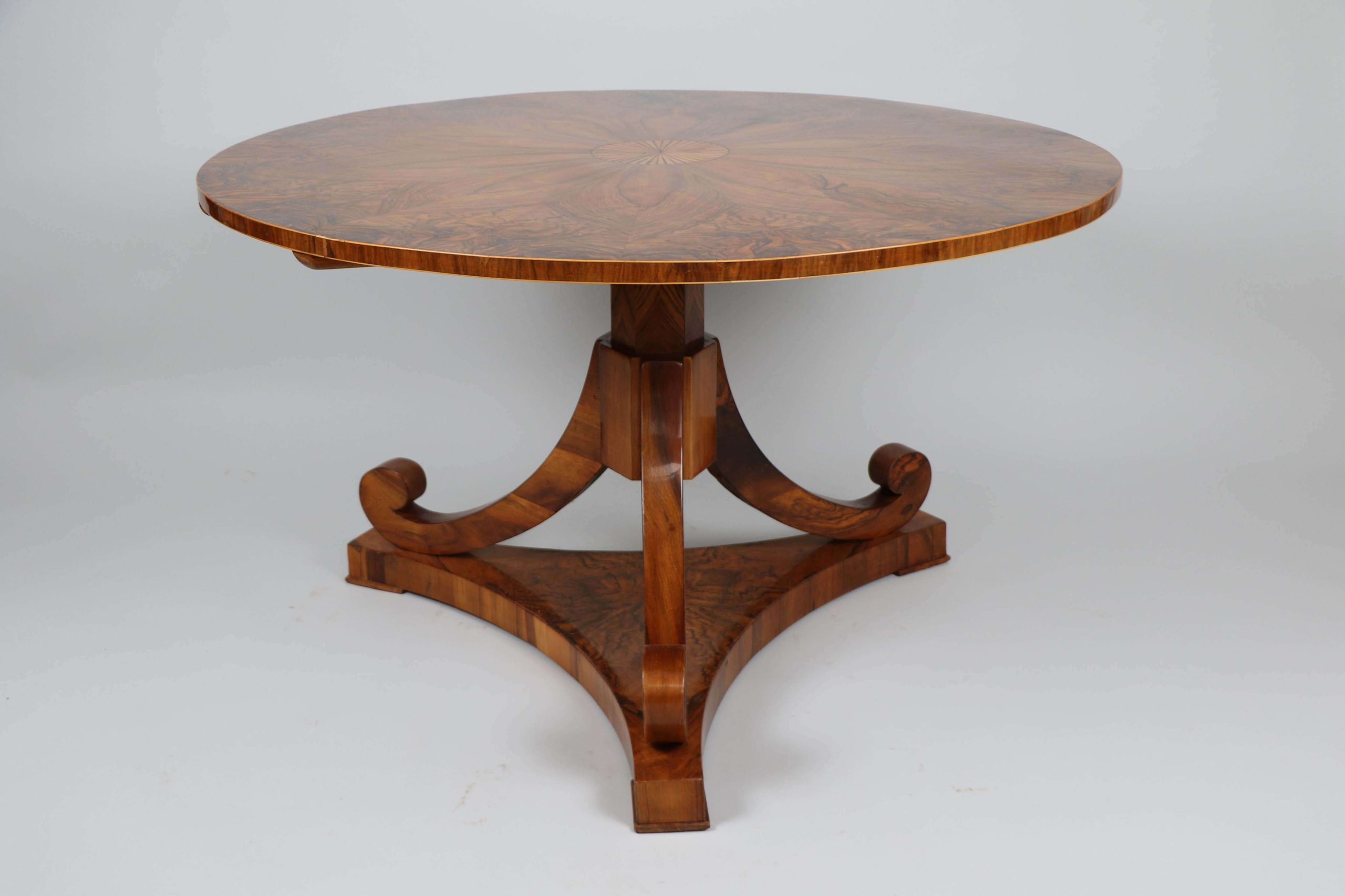 The 19th Century Fine Biedermeier Walnut Set of Six Chairs & Table, attributed to Josef Danhauser and crafted in Vienna circa 1825, features a round table measuring 119.38 cm in diameter and 77.47 cm high, sold as a set of seven. This museum-quality ensemble showcases sophisticated proportions and refined design with highly figured walnut veneer in a deep amber patina, blending elegance with comfort. The table’s tilt-top includes a precisely crafted marquetry rosette, while the chairs offer ergonomic seating, making it a timeless addition to any dining room, classic or modern.