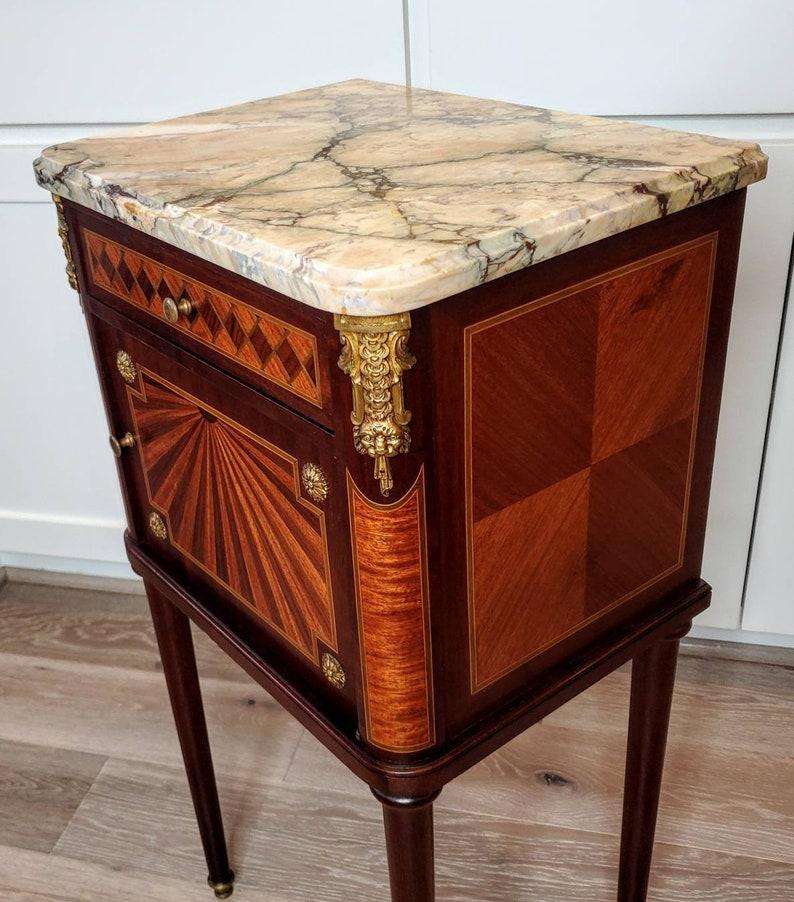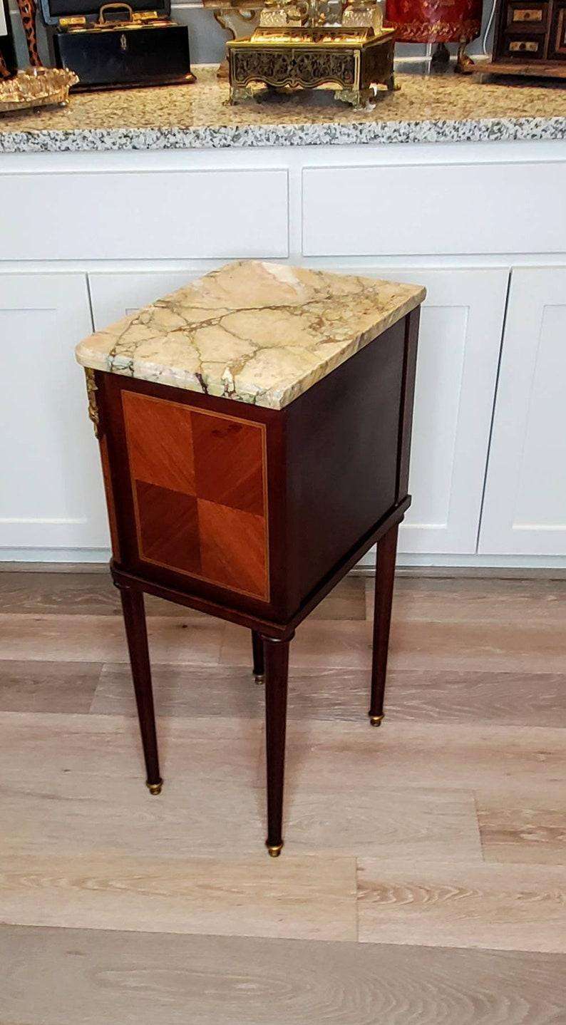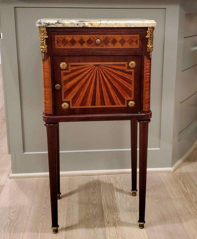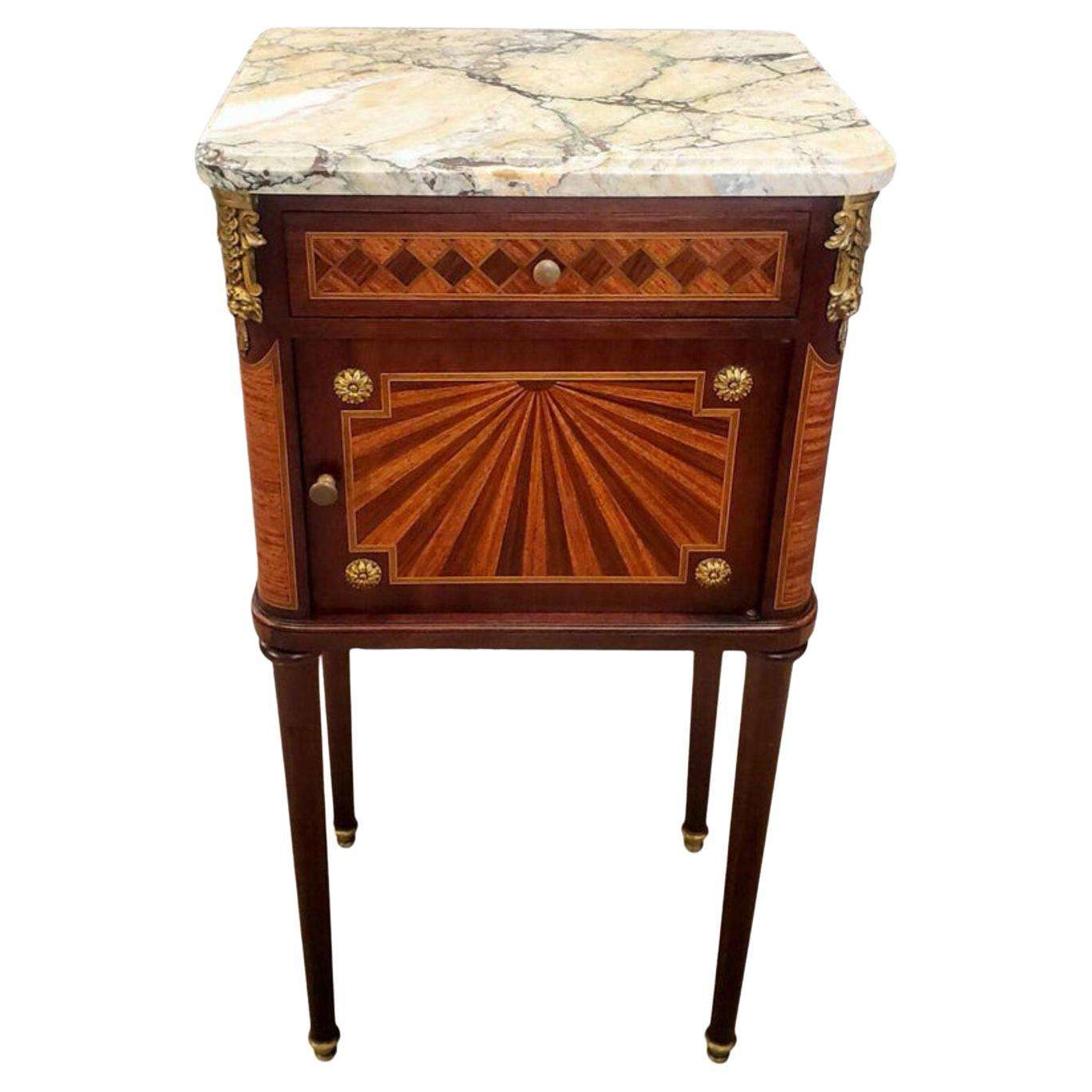 The 19th Century French Louis XVI Bedside Cabinet, hand-crafted by Grohé Frères in Paris during the third quarter of the 19th century, measures 40.64 cm wide, 31.75 cm deep, and 78.74 cm high, showcasing exquisite Neoclassical design. Signed with Grohé foundry marks, this rare mahogany piece features a parquetry drawer, starburst marquetry door concealing a marble-lined chamber, ornate gilt bronze ormolu mounts, and a grey-white marbled granite top, all supported by four tapered legs with brass peg feet. Its luxurious craftsmanship makes it an ideal nightstand or end table, blending functionality with elegance for a bedroom or living space.
