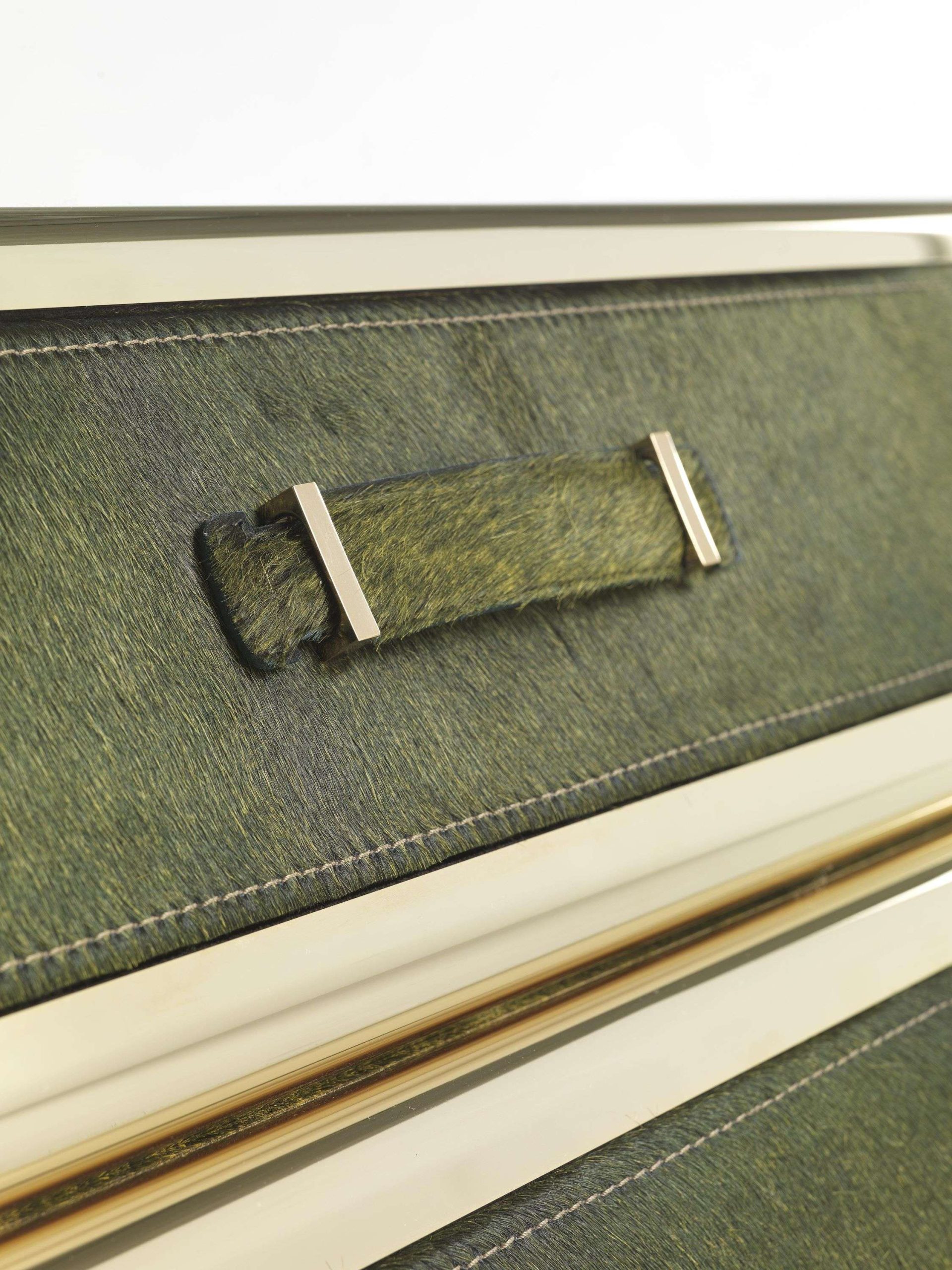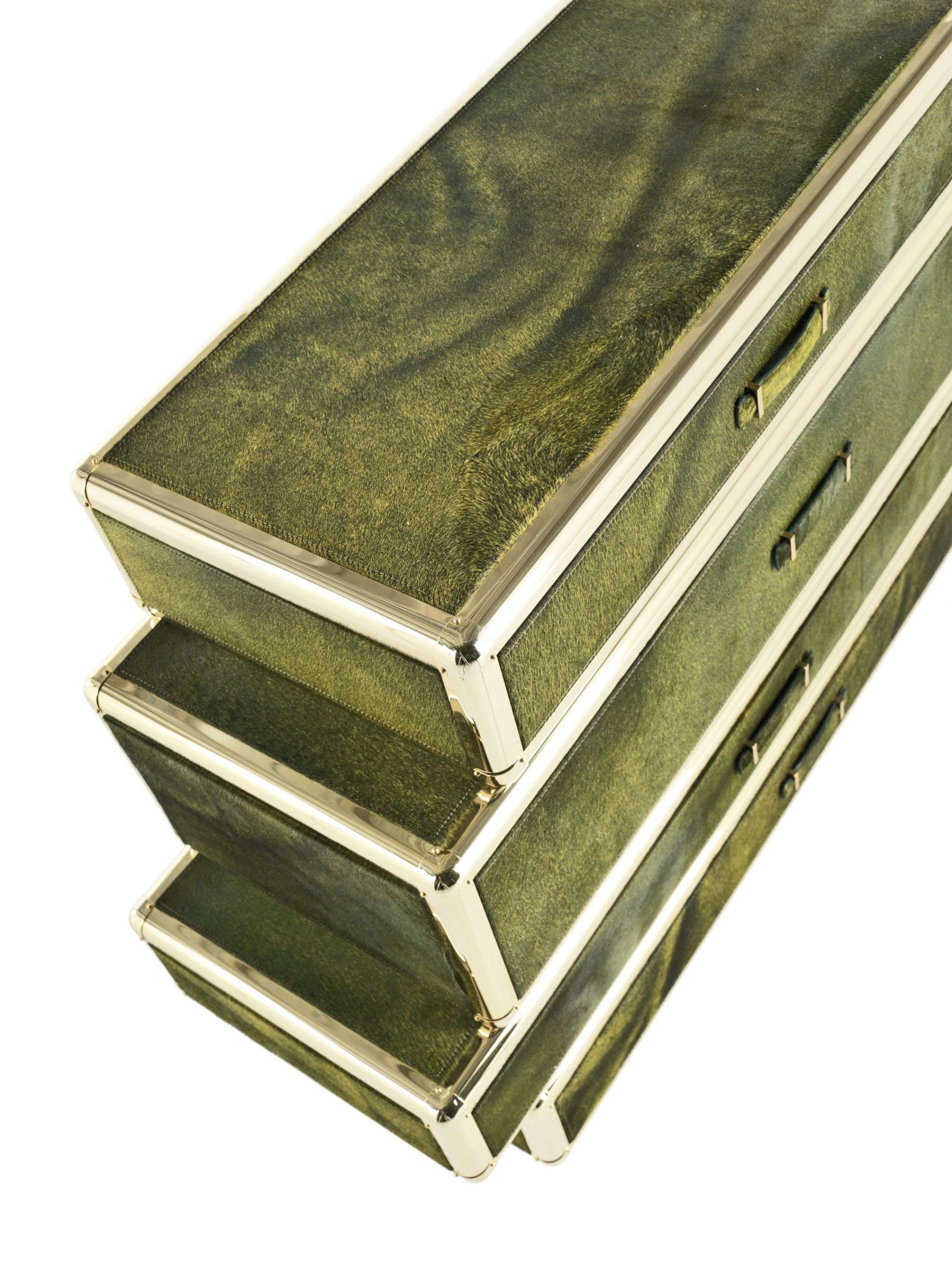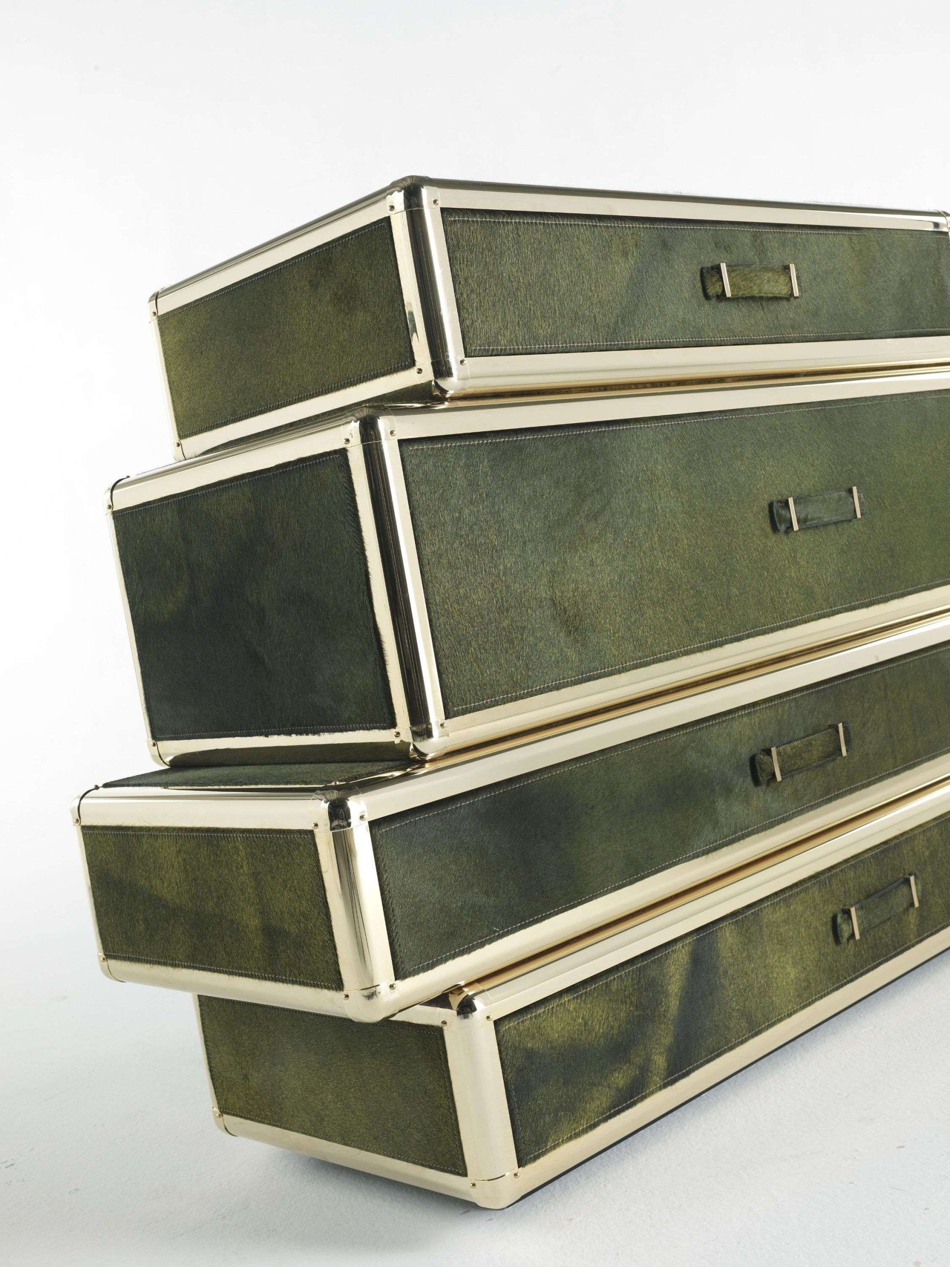 The 21st Century Fly Case Chest of Drawers by Roberto Cavalli Home Interiors, crafted in Italy in 2024, measures 151 cm wide, 50 cm deep, and 104 cm high, embodying a modern design inspired by protective “air boxes” for fragile equipment transport. This piece, part of the Fly Case line, features a multi-layer wood structure upholstered in Cavallino COL. P275 green leather, with a gold-finished metal frame and a microfiber-lined interior, offering a luxurious storage solution for a bedroom or living space. The combination of size variations and finishes creates a striking, contemporary aesthetic, perfect for adding sophistication and functionality.