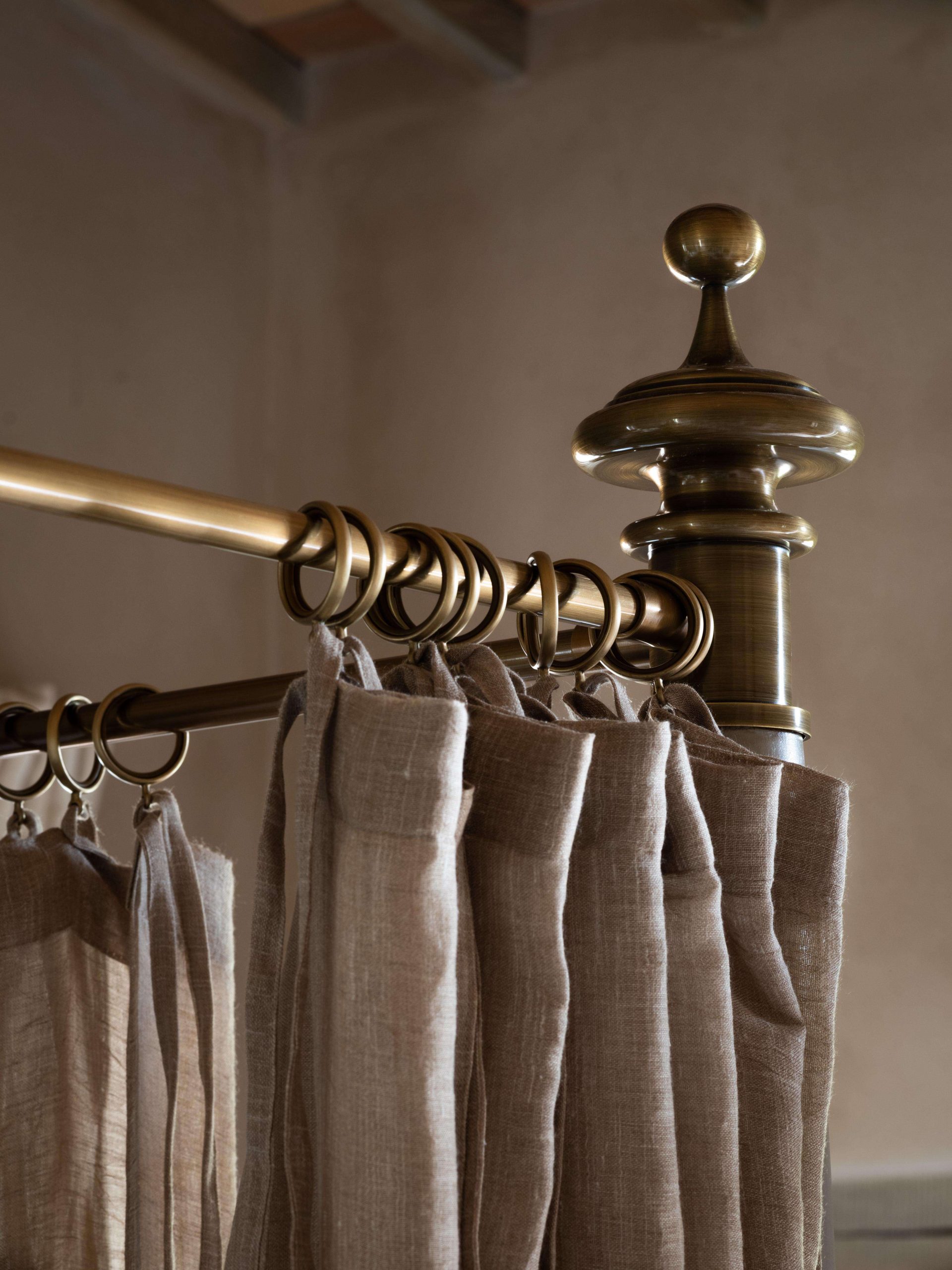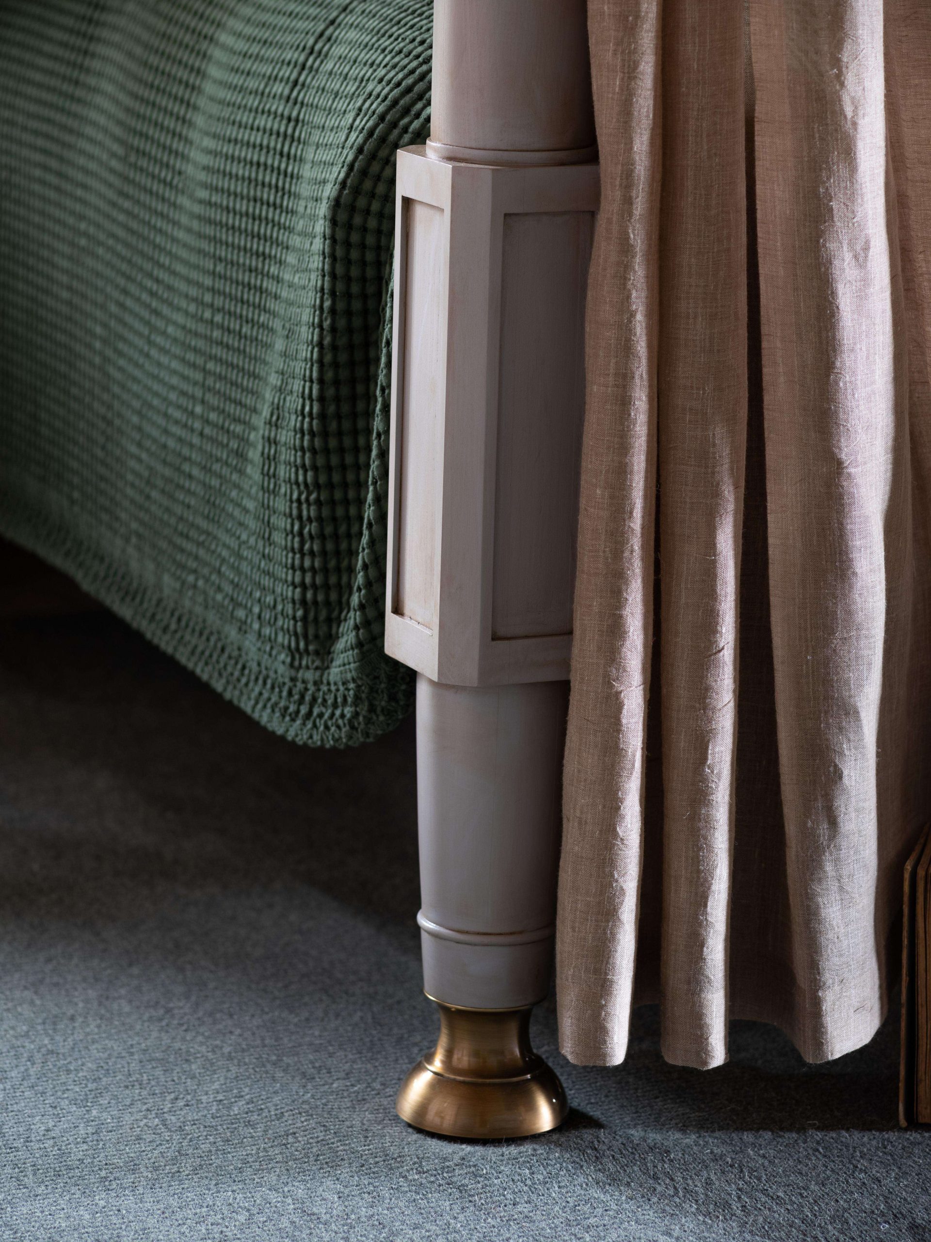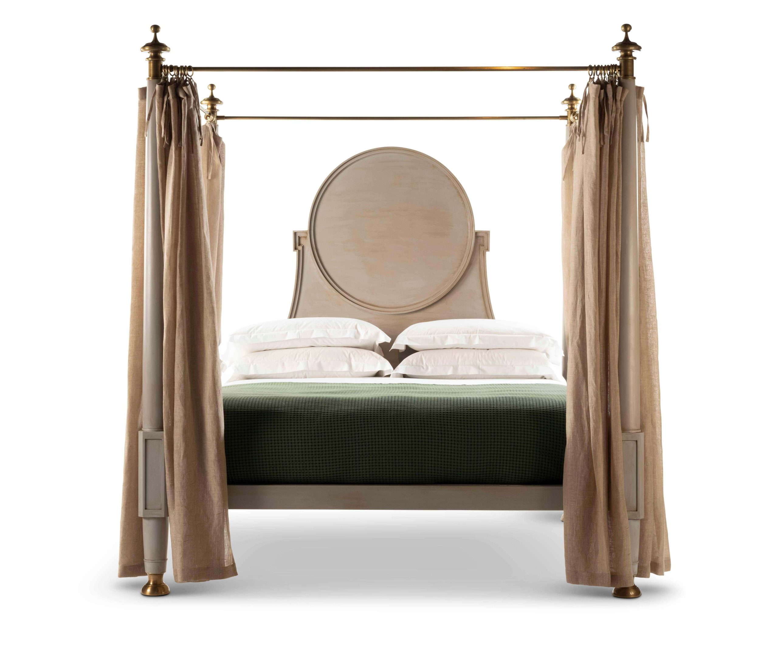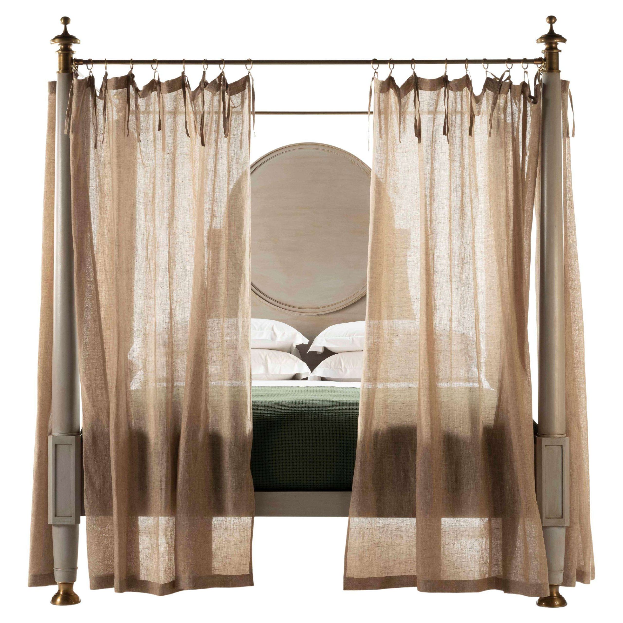 The King’s Bed, a majestic four-poster design, features a distinct baroque headboard crafted from grisaille oak with intricate posts adorned with brass-plated Oriental-inspired finials at the top and bottom. Handmade in Italy by artisans, this bed exudes a stately presence, perfect for enhancing any master bedroom.
