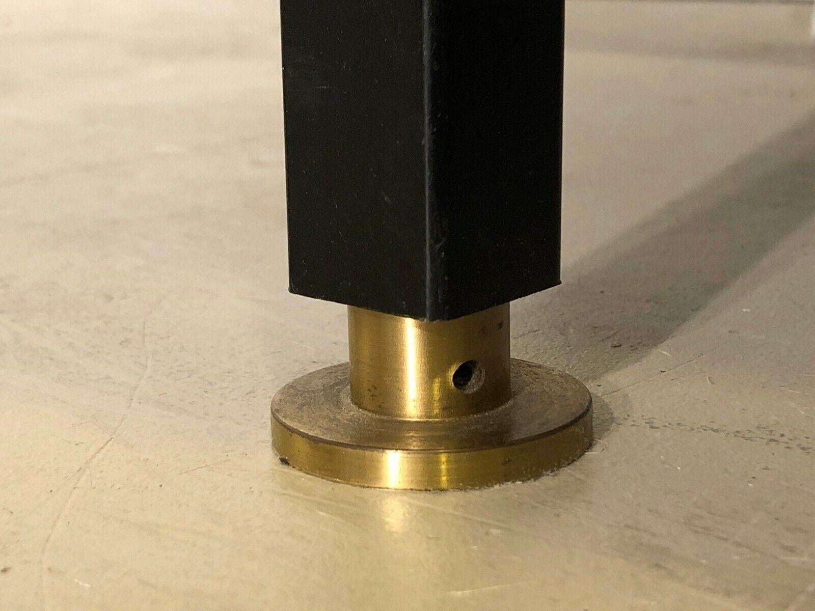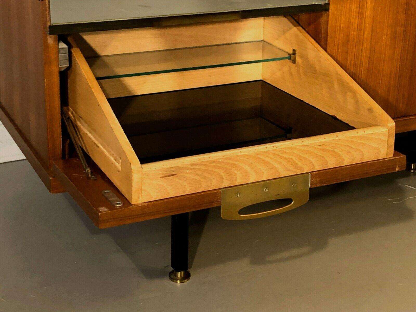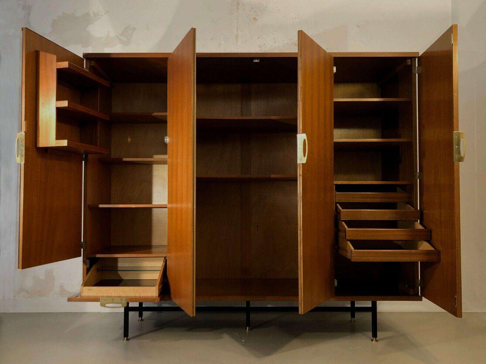The Large “RECONSTRUCTION” Wardrobe by Joseph-André Motte, produced by Charron in France in 1950, measures 200 cm wide, 51 cm deep, and 170 cm high, embodying a mid-century modern design with a rational storage system. This wardrobe features four doors, one with a mirror creating a striking asymmetry, set on a wood veneer structure with five adjustable bronze and black lacquered metal feet, including a central one. It includes various storage options like drawers and shelves, with notable details such as a black glass-plated shoe drawer and perfectly functioning opening systems, ideal for organizing clothing and accessories in a bedroom.