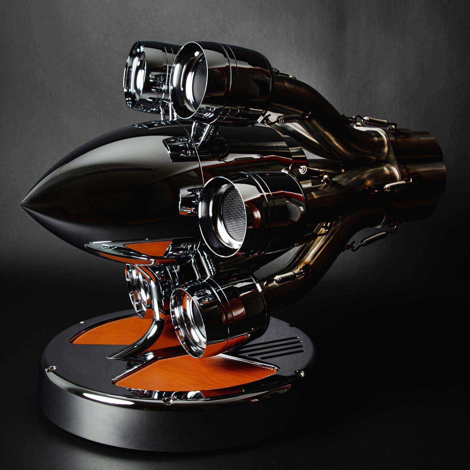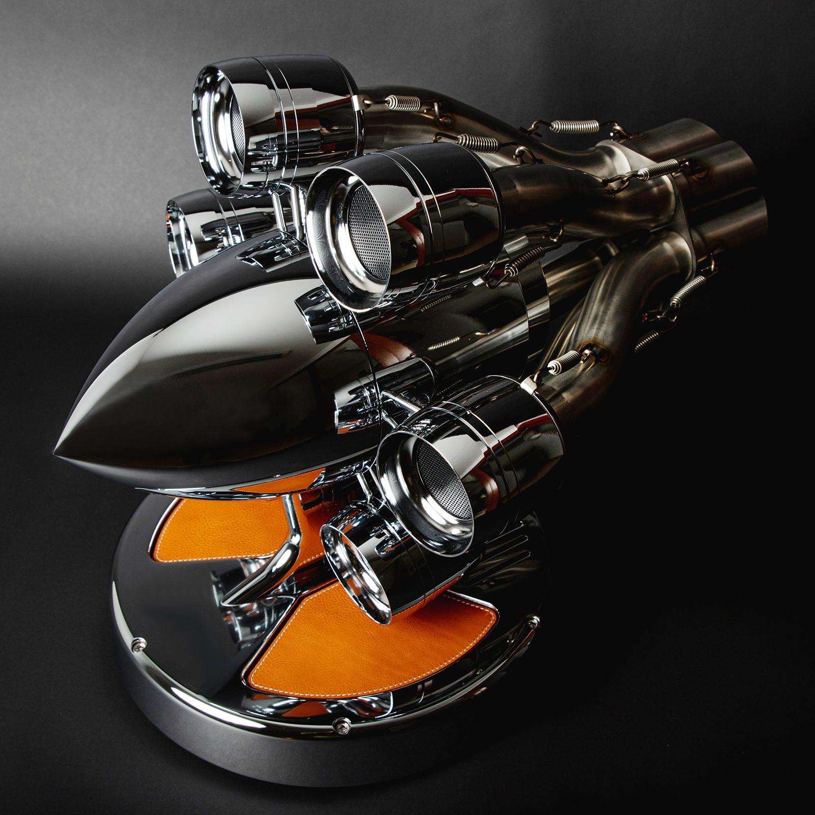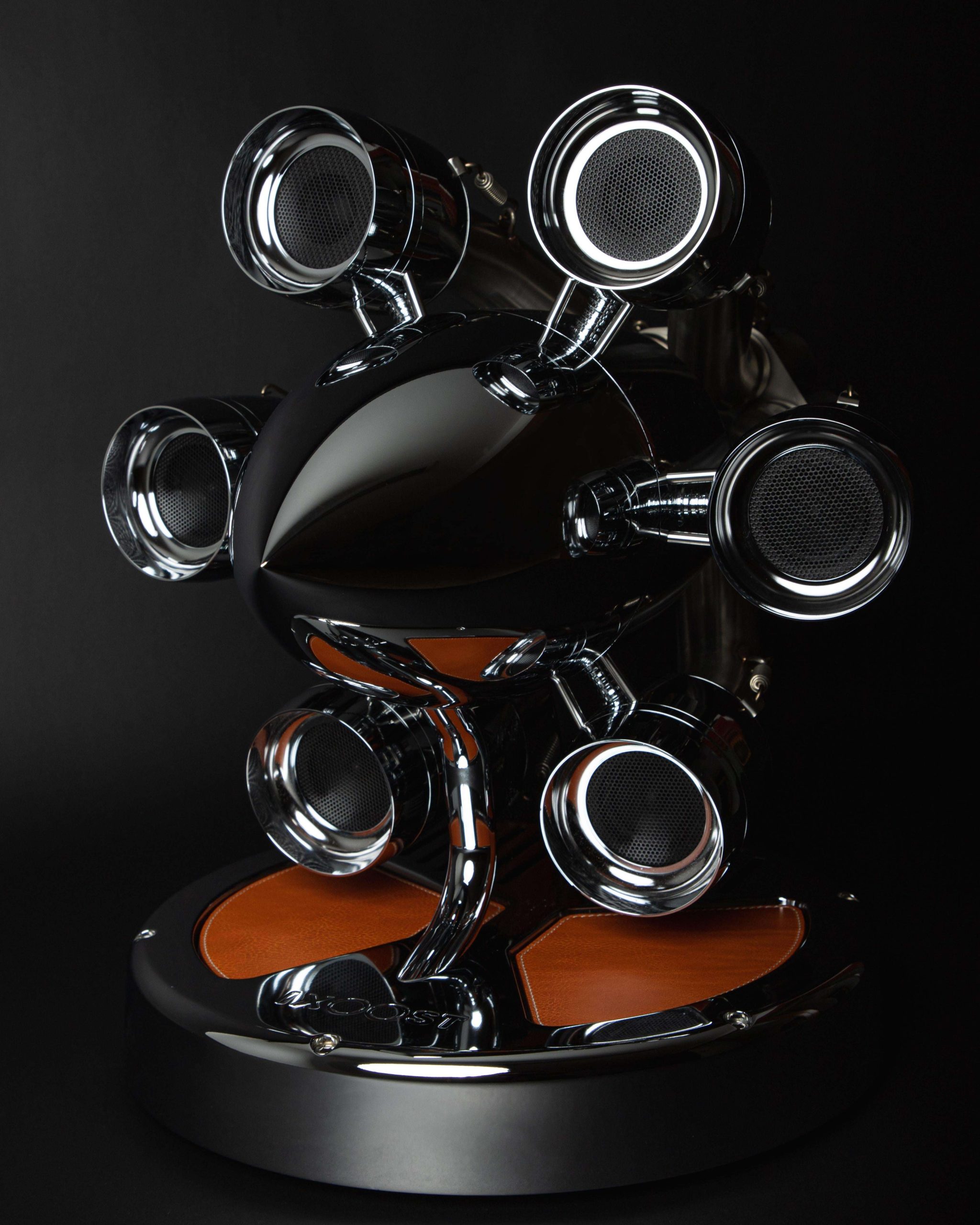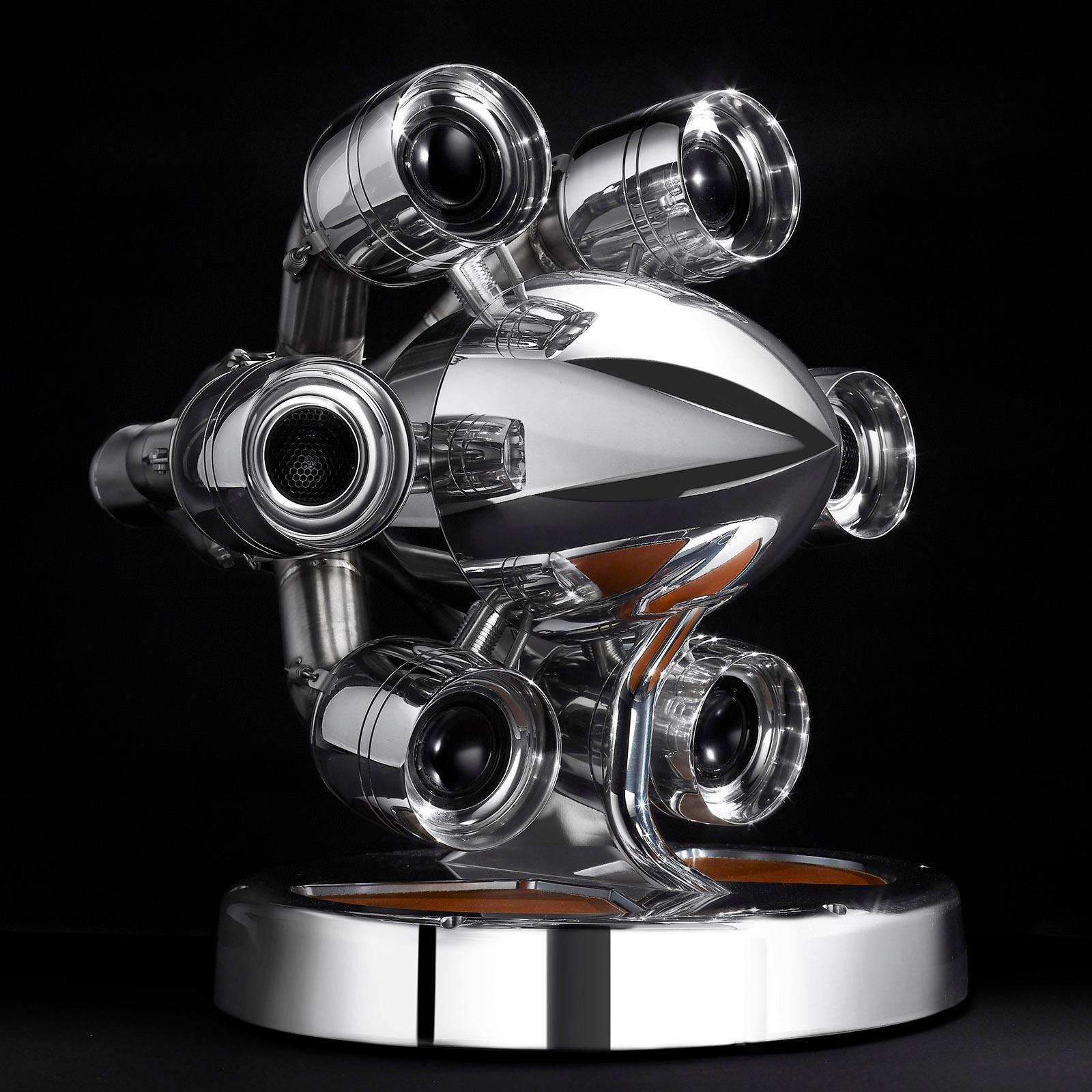 The Aircraft Engine Chrome Speaker draws inspiration from early 20th-century radial aircraft engines, featuring a sleek aluminum alloy structure with chrome details. This hand-crafted piece combines vintage aesthetics with modern audio technology, delivering exceptional sound quality.