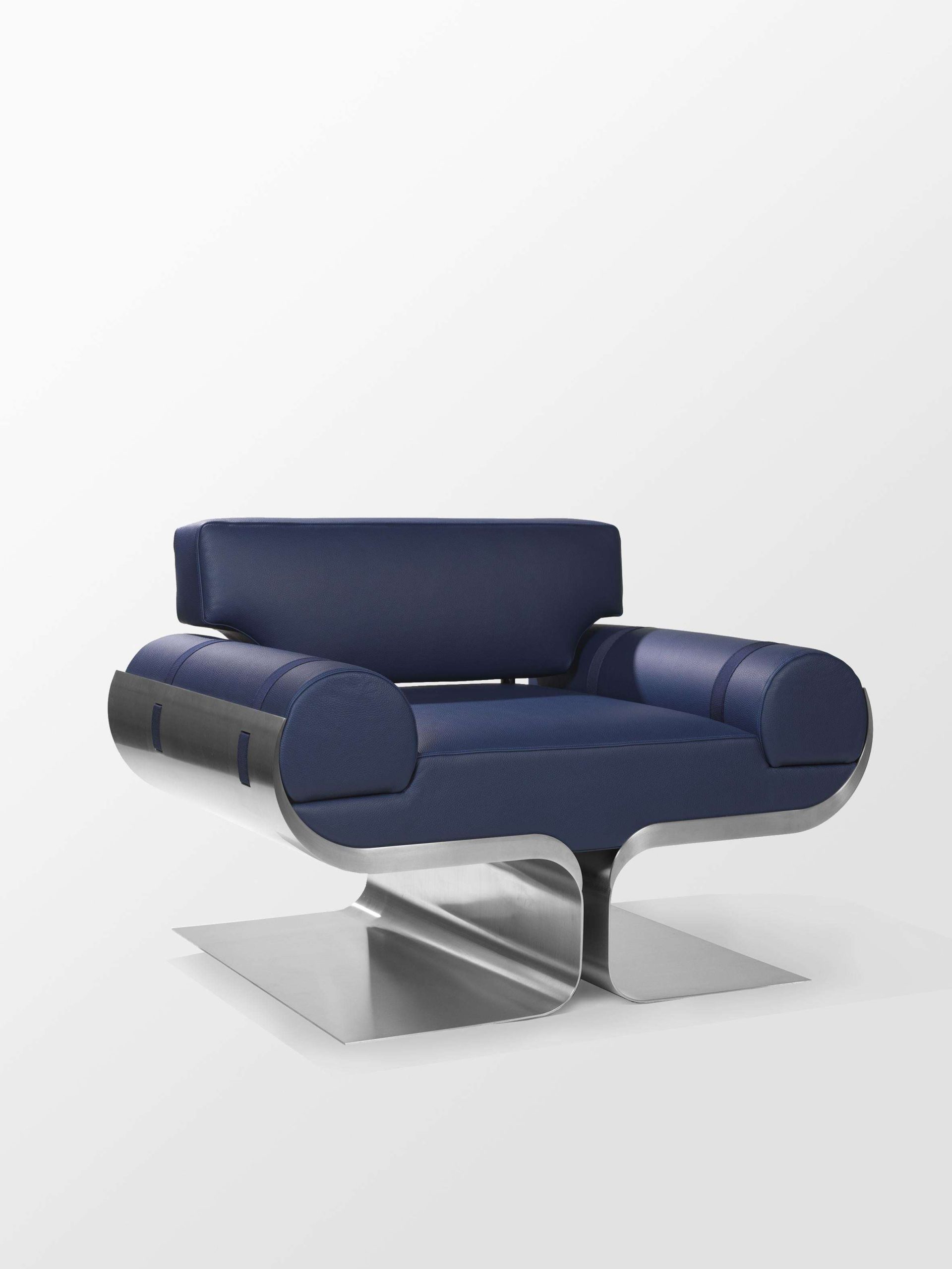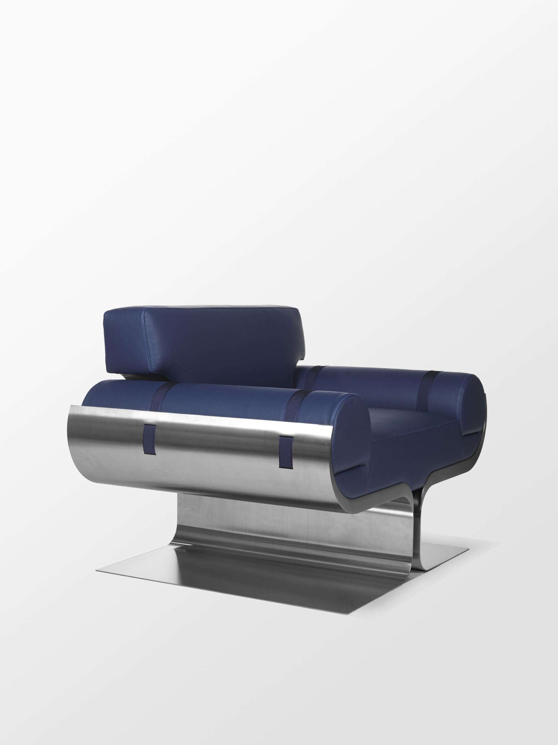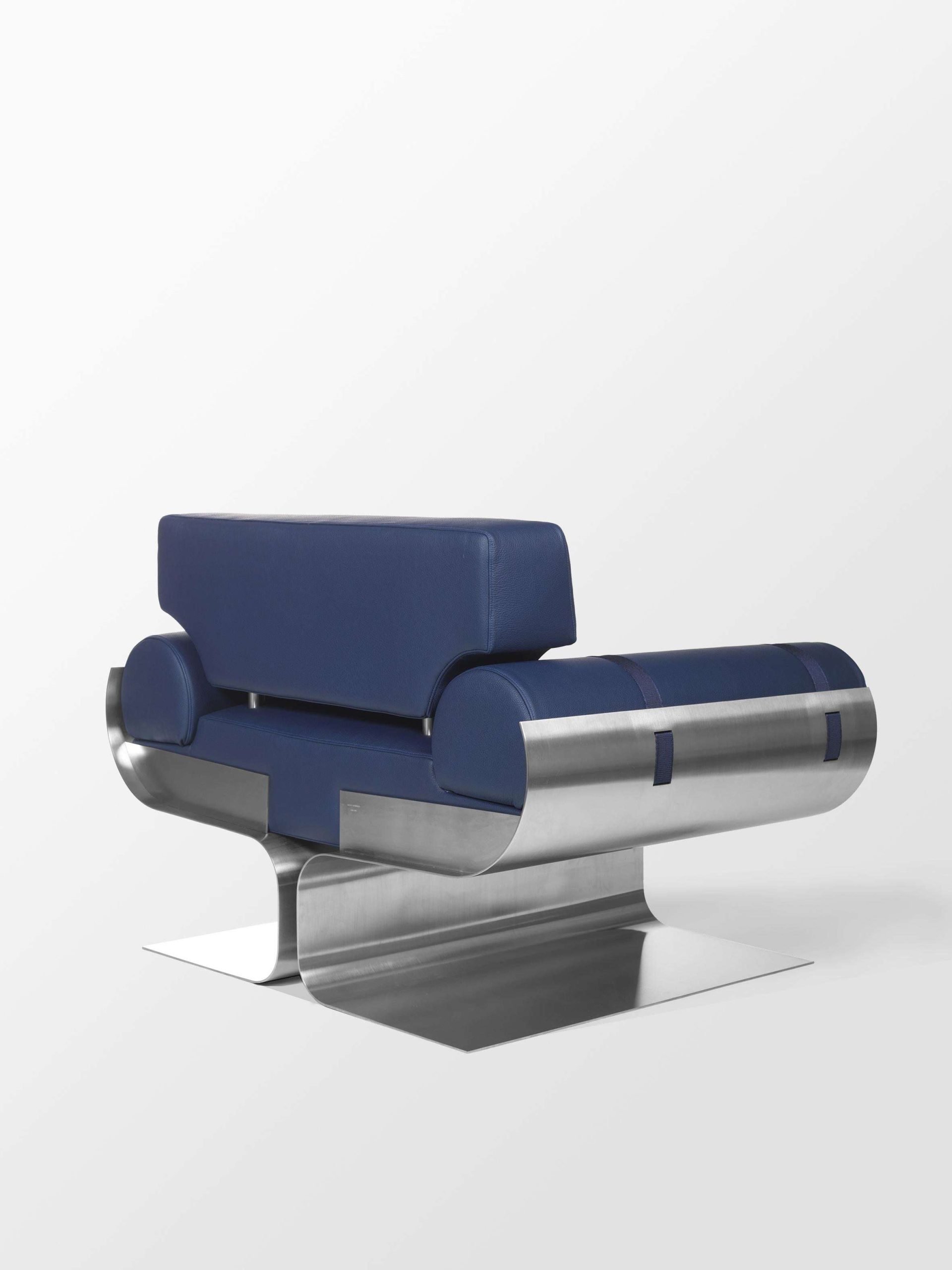 The Arès Armchair by ROCHE & FRÈRES, a numbered piece with a certificate of authenticity, measures 110 cm wide, 83 cm deep, and 76 cm high. Crafted in Portugal in 2024 as part of the Ice Memory Collection, this post-modern design features a brushed stainless steel frame inspired by armor, paired with full-grain bull leather upholstery, evoking the warrior spirit of the Greek god of war, Arès. The raw aesthetic is softened by delicate curves, achieving a balance between strength and elegance, making it a striking addition to any contemporary interior.