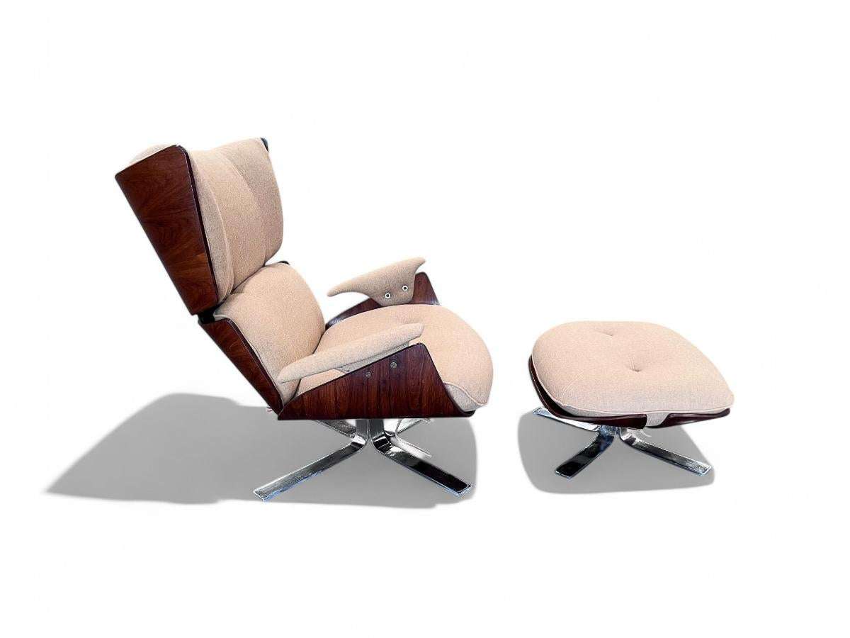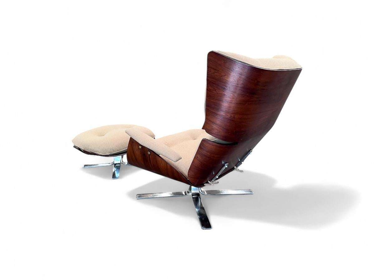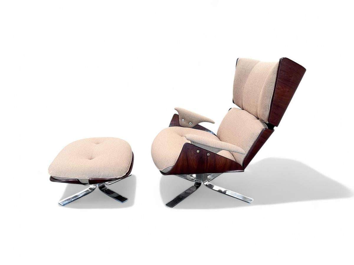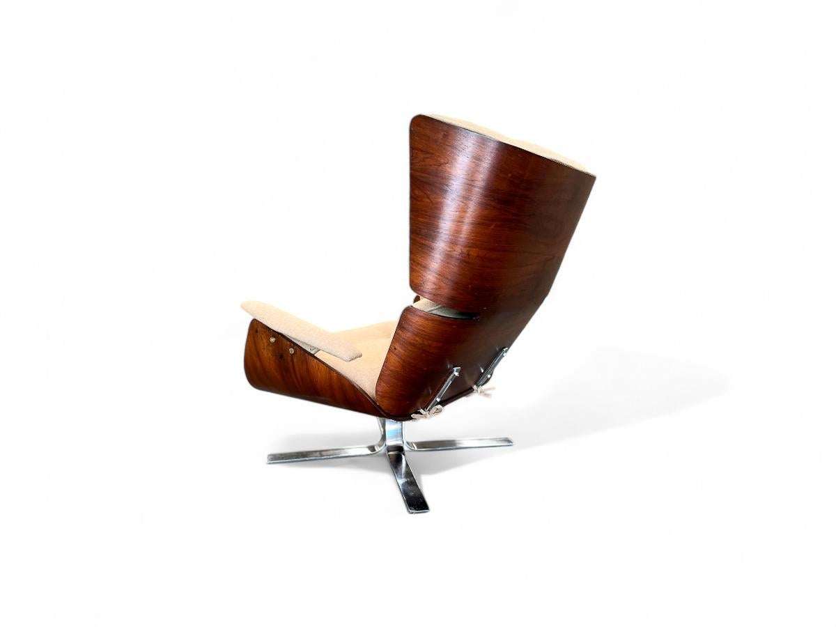The Brazilian Modern “Paulistana” Armchair with Ottoman, designed by Jorge Zalszupin in 1959 and manufactured by L’Atelier in Brazil, measures 76.97 cm wide, 81.28 cm deep, and 98.05 cm high. This mid-century modern icon features molded Brazilian rosewood (Jacaranda) outer shells, a chrome-plated metal base, and wool upholstery, reflecting Zalszupin’s innovative use of plywood after his European travels in the early 1960s. Named after the citizens of São Paulo, known as “paulistanos,” the chair showcases a light, organic structure with a sleek silhouette, offering exceptional comfort and a touch of Brazilian sophistication to any interior space.