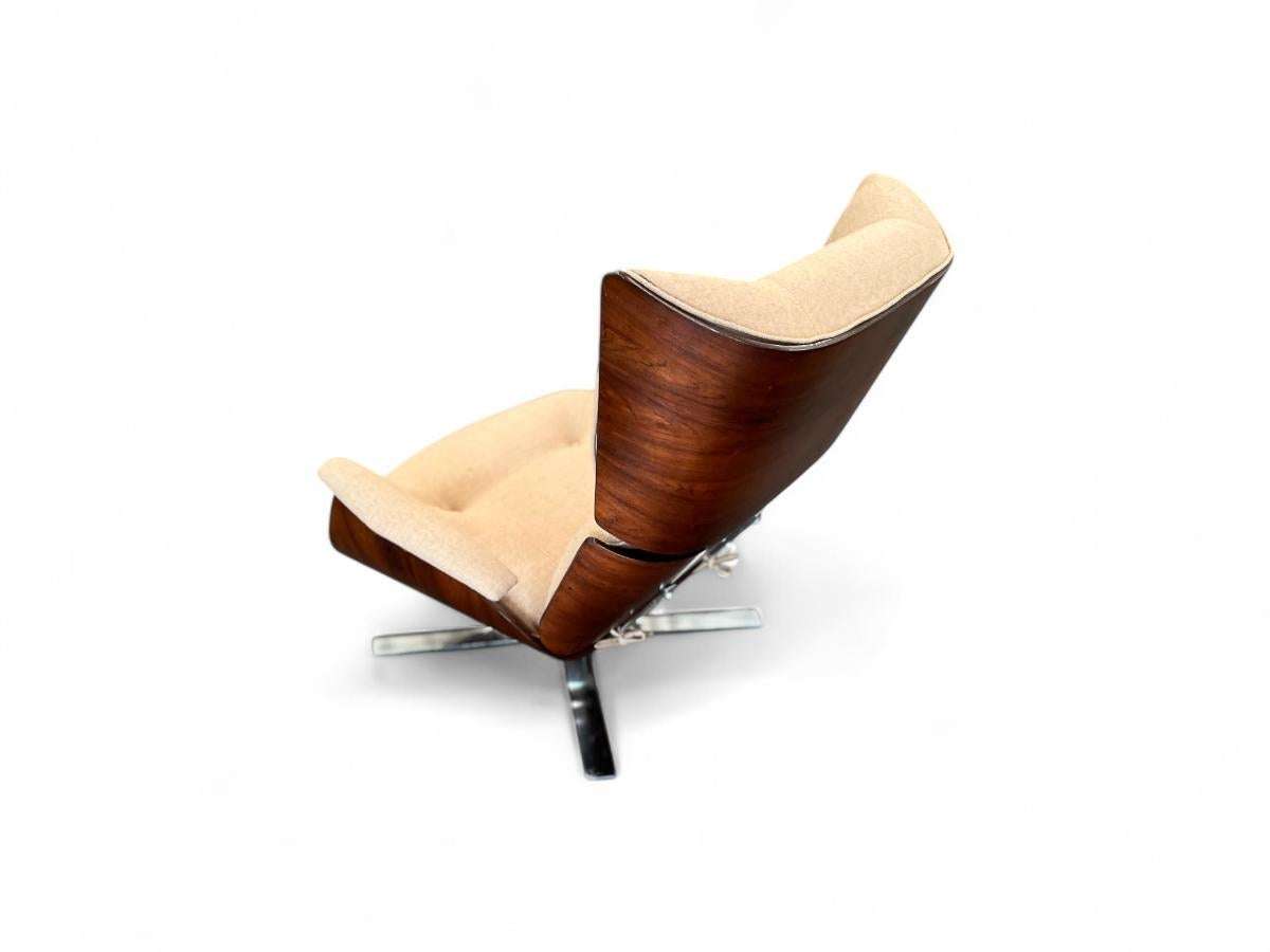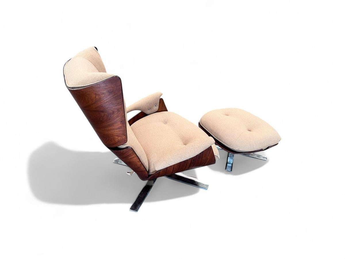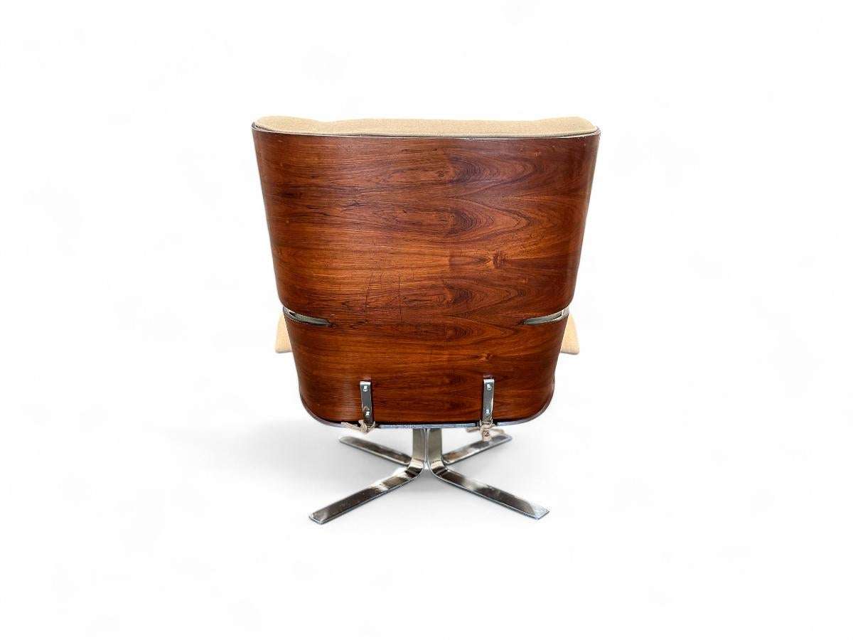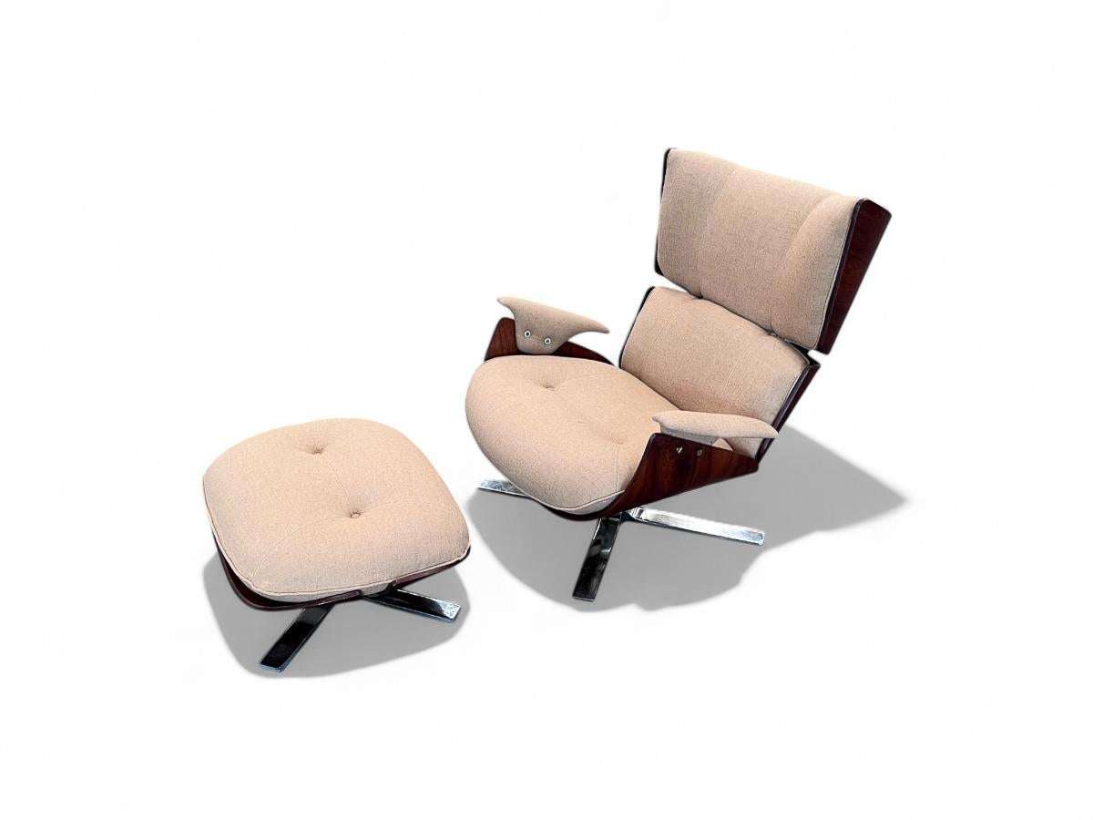 The Brazilian Modern “Paulistana” Armchair with Ottoman, designed by Jorge Zalszupin in 1959 and manufactured by L’Atelier in Brazil, measures 76.97 cm wide, 81.28 cm deep, and 98.05 cm high. This mid-century modern icon features molded Brazilian rosewood (Jacaranda) outer shells, a chrome-plated metal base, and wool upholstery, reflecting Zalszupin’s innovative use of plywood after his European travels in the early 1960s. Named after the citizens of São Paulo, known as “paulistanos,” the chair showcases a light, organic structure with a sleek silhouette, offering exceptional comfort and a touch of Brazilian sophistication to any interior space.
