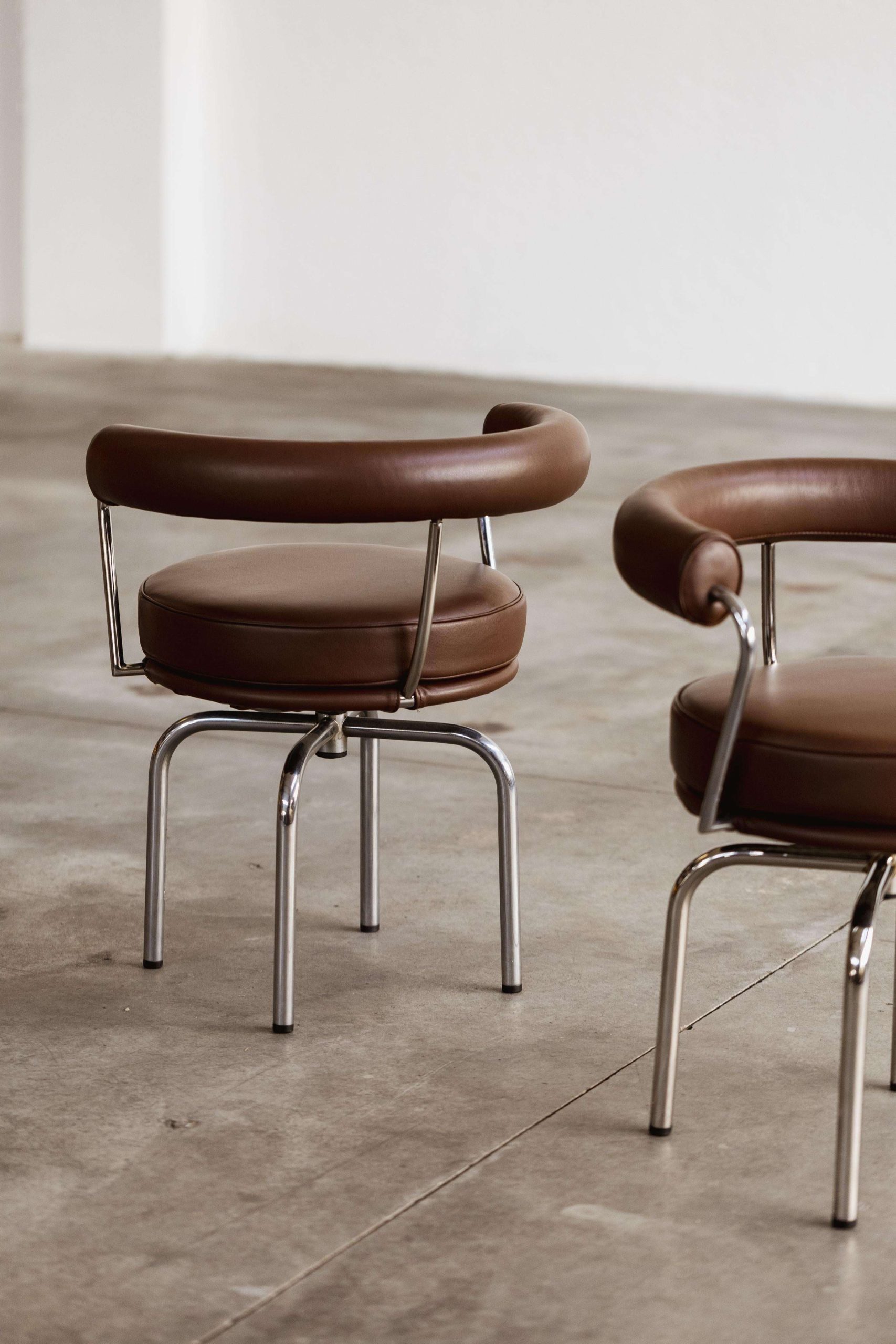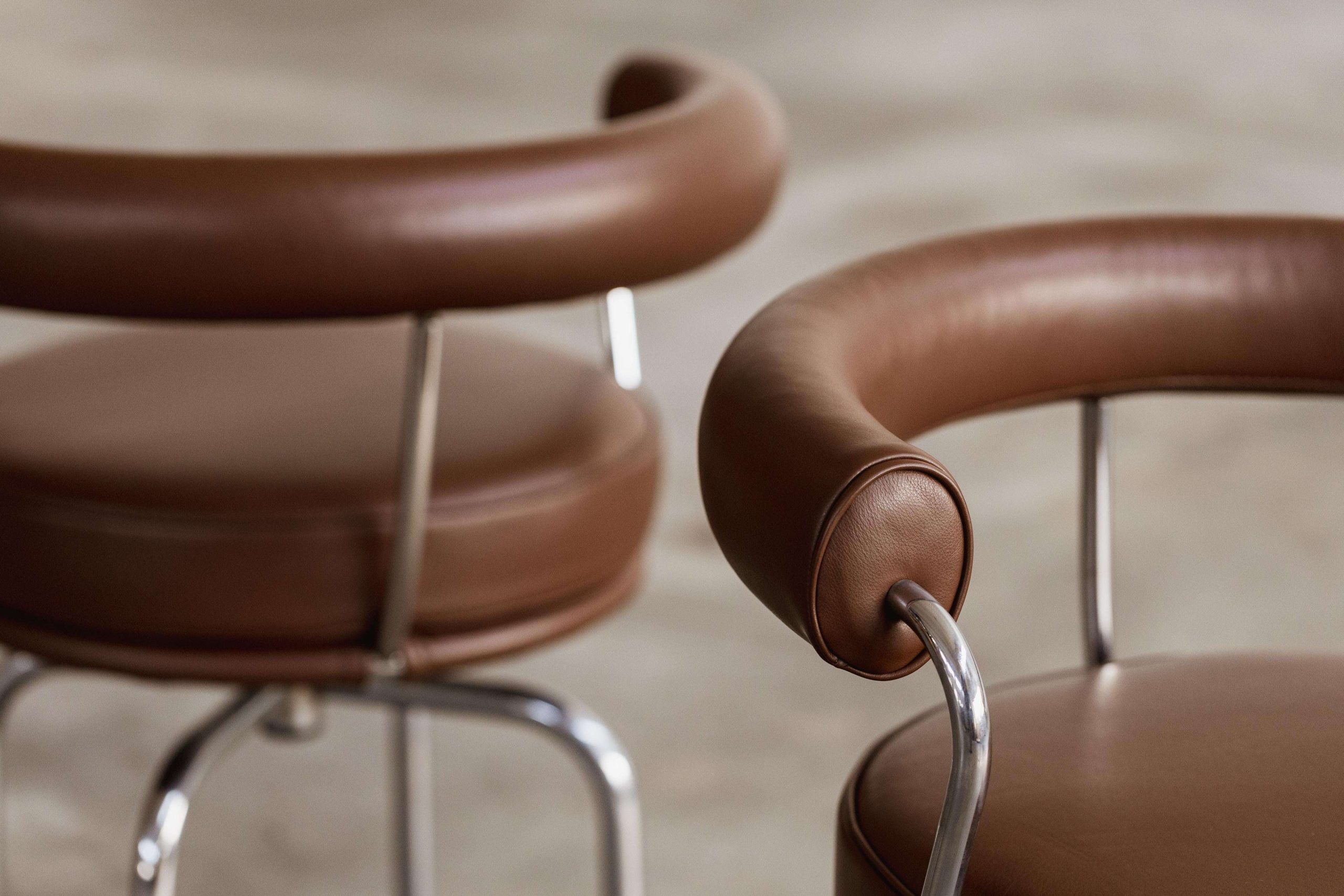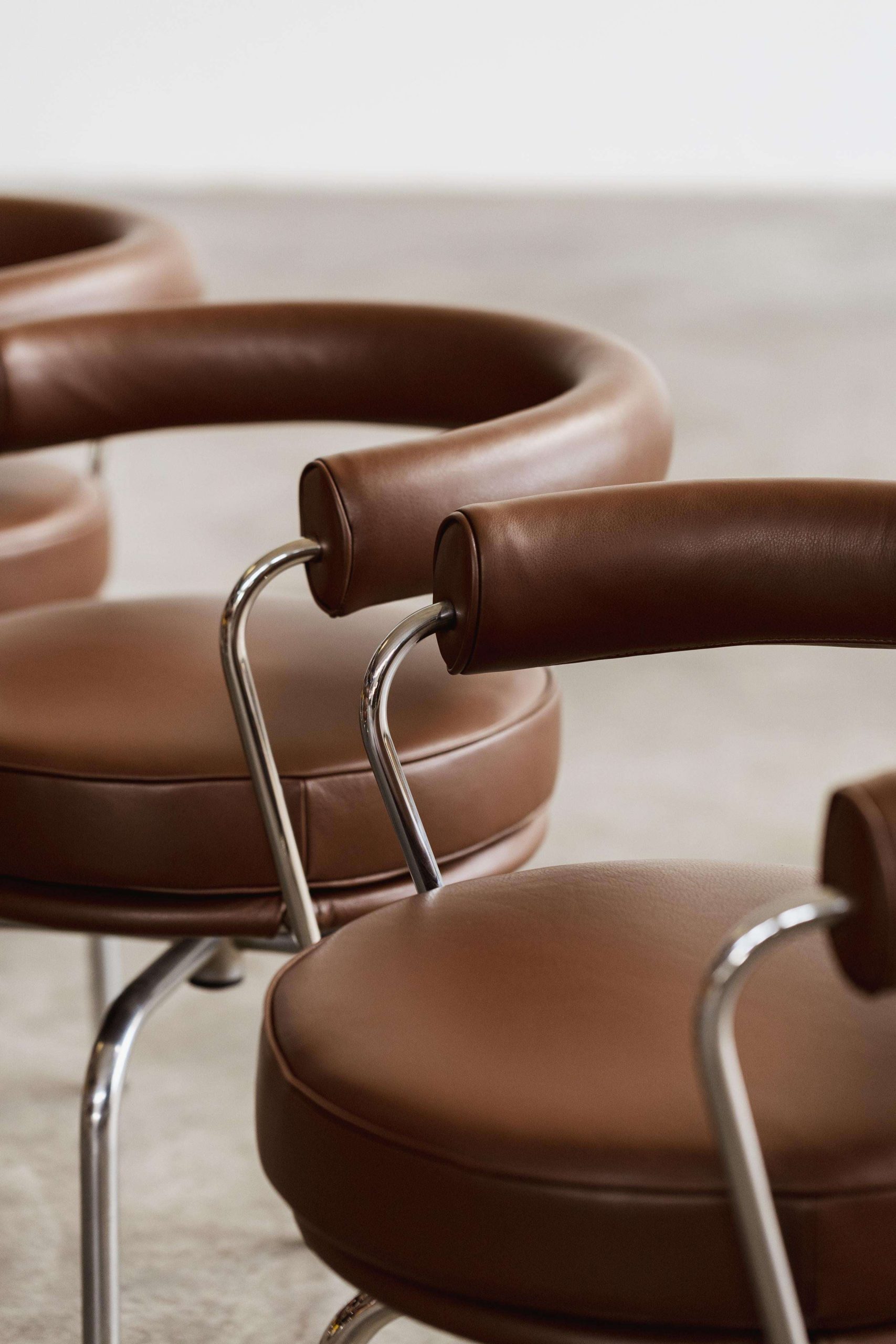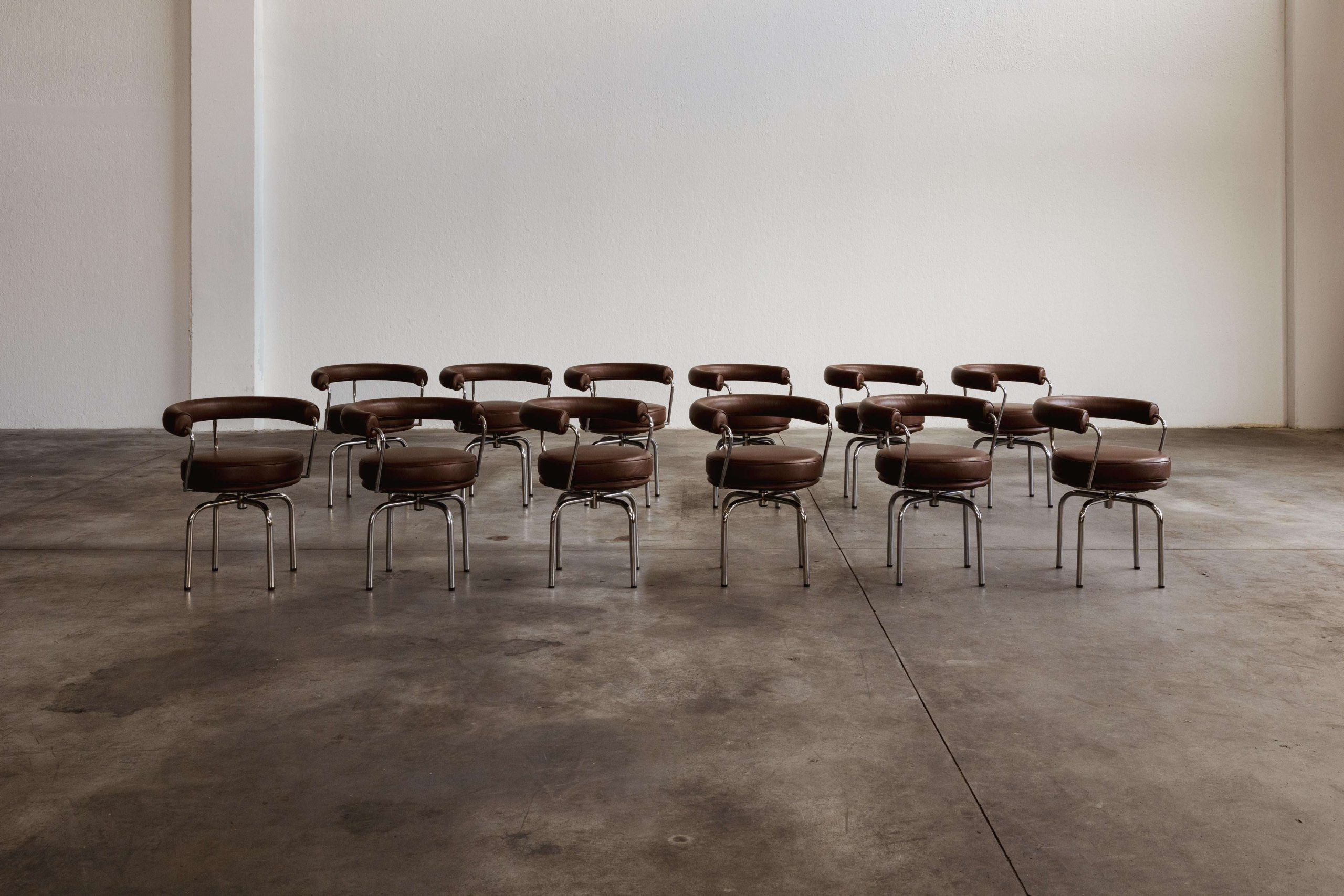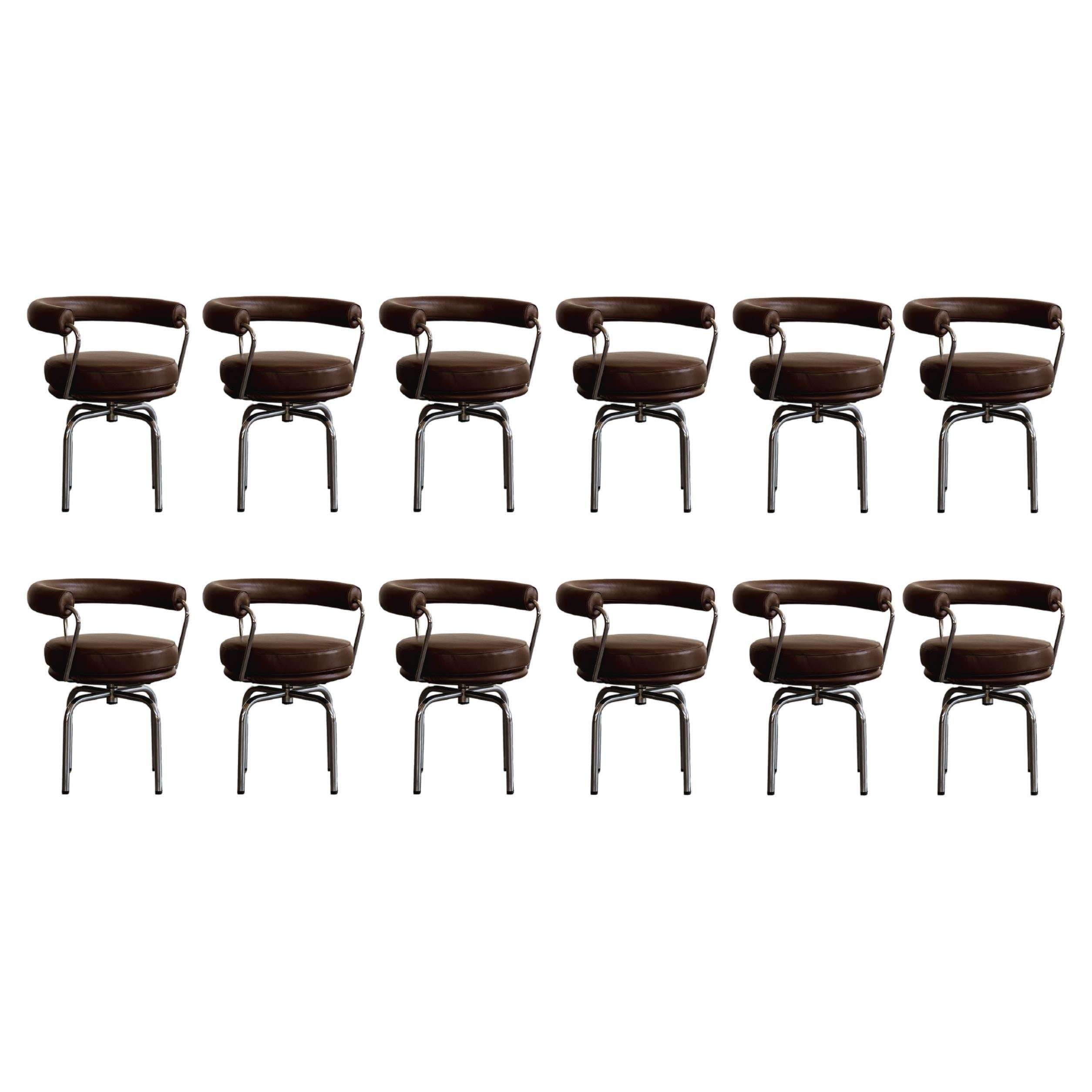 The Charlotte Perriand “LC7” Dining Chairs, designed in 1927 and manufactured by Cassina in the 1980s, come as a set of 12, each measuring 60 cm wide, 47 cm deep, and 52 cm high with a seat height of 50 cm. Featuring a chromed four-leg steel structure, these mid-century modern icons are reupholstered in prime champagne leather with expanded polyurethane and padded polyester filling for comfort.