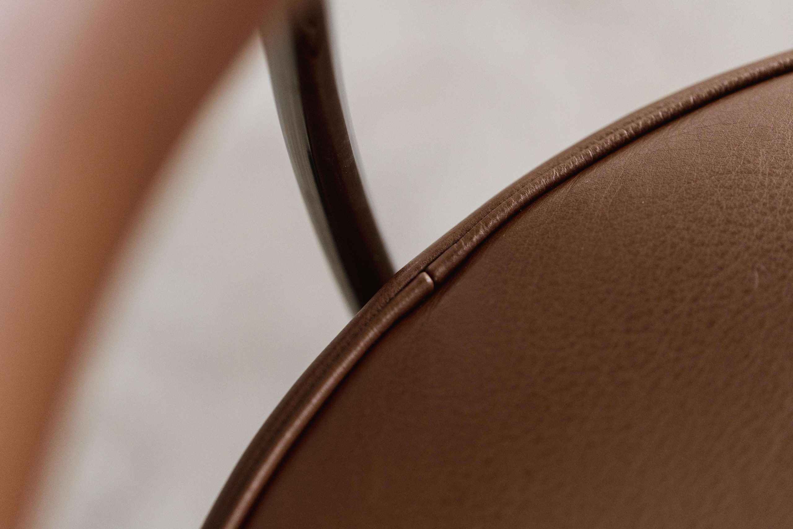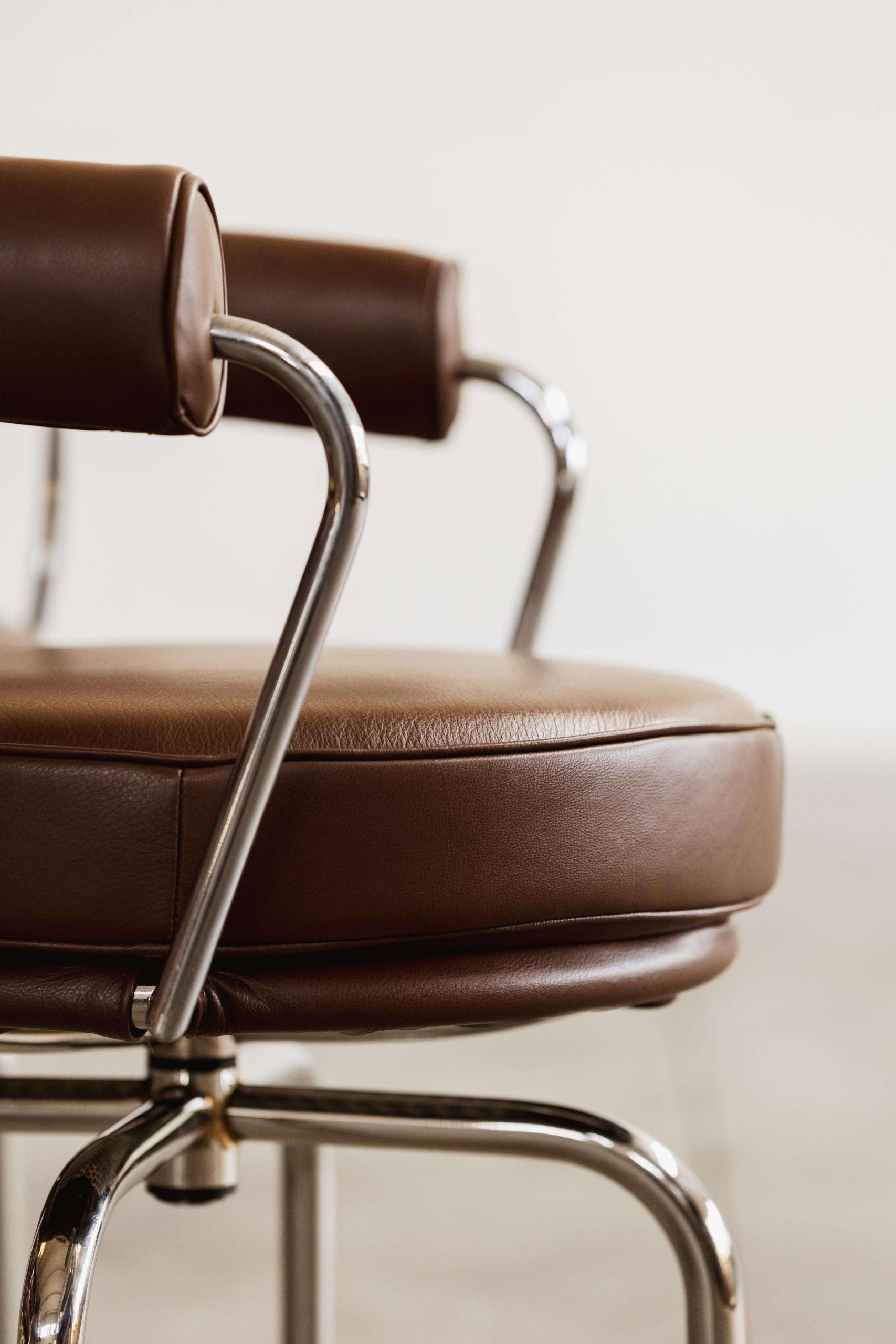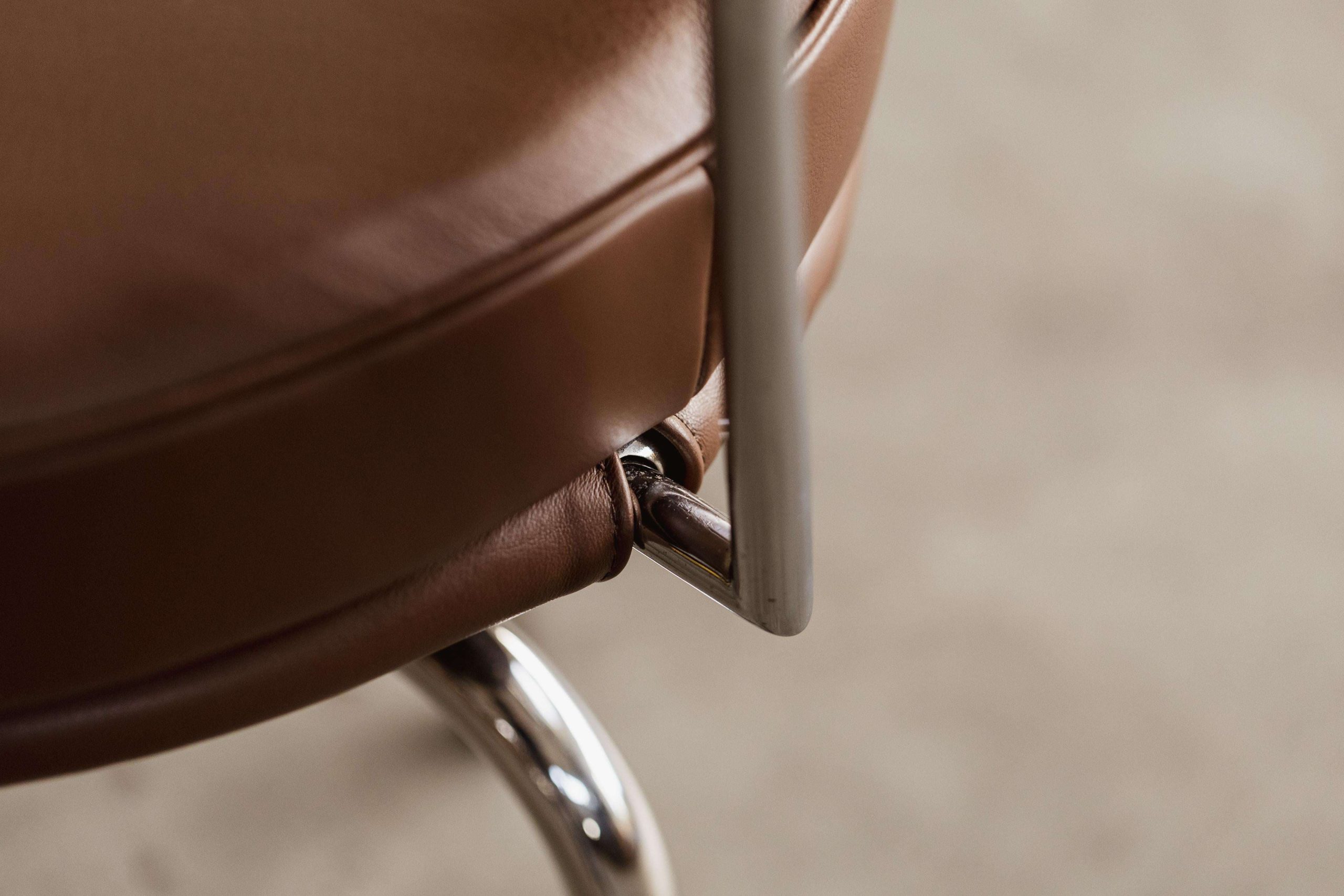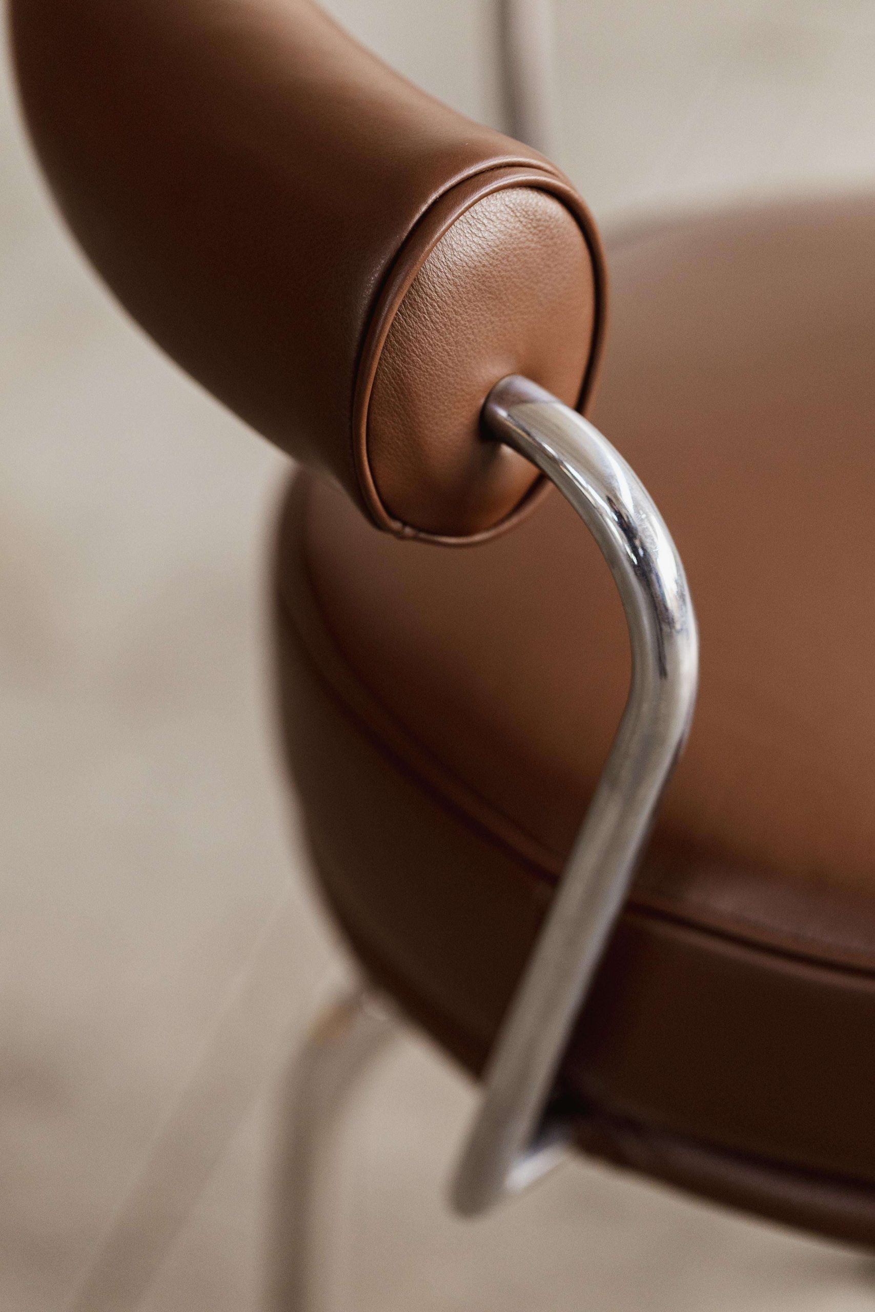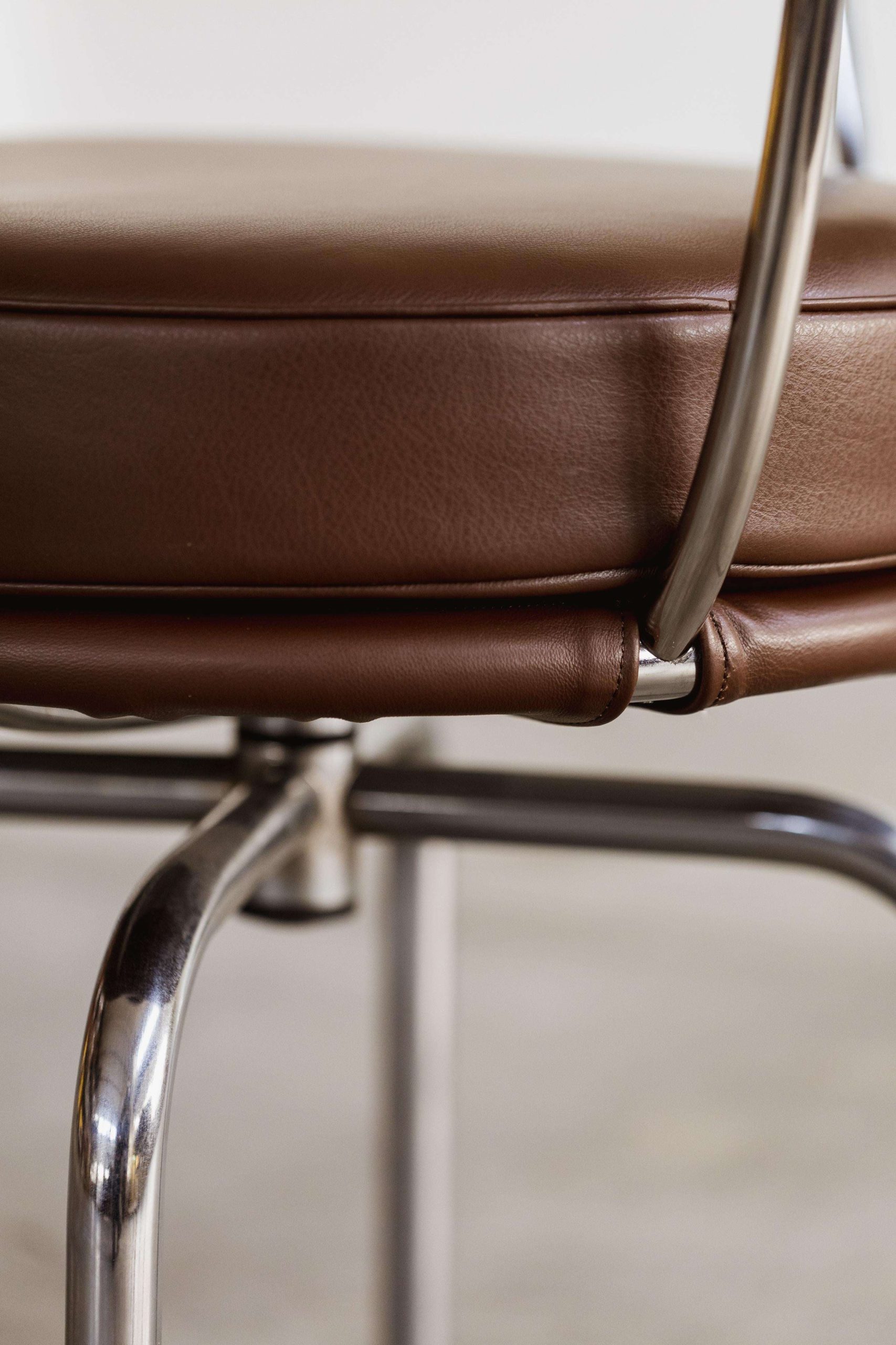 The Charlotte Perriand “LC7” Dining Chairs, designed in 1927 and manufactured by Cassina in the 1980s, come as a set of 12, each measuring 60 cm wide, 47 cm deep, and 52 cm high with a seat height of 50 cm. Featuring a chromed four-leg steel structure, these mid-century modern icons are reupholstered in prime champagne leather with expanded polyurethane and padded polyester filling for comfort.