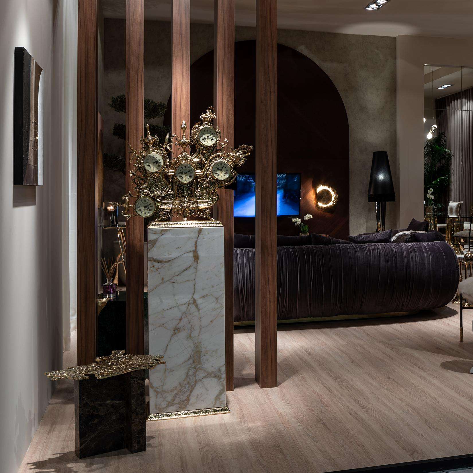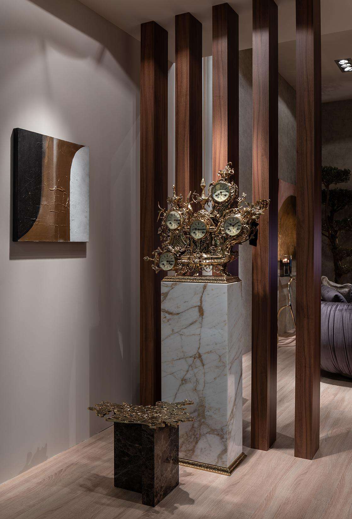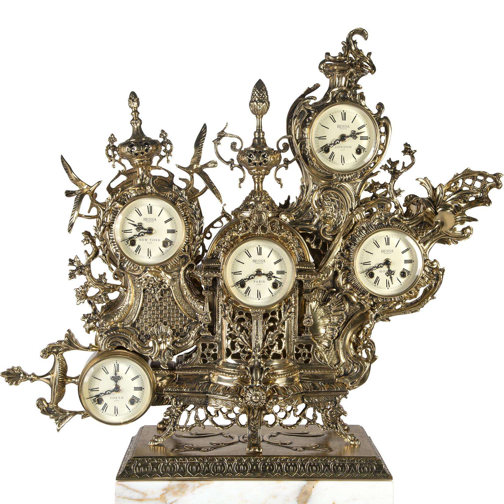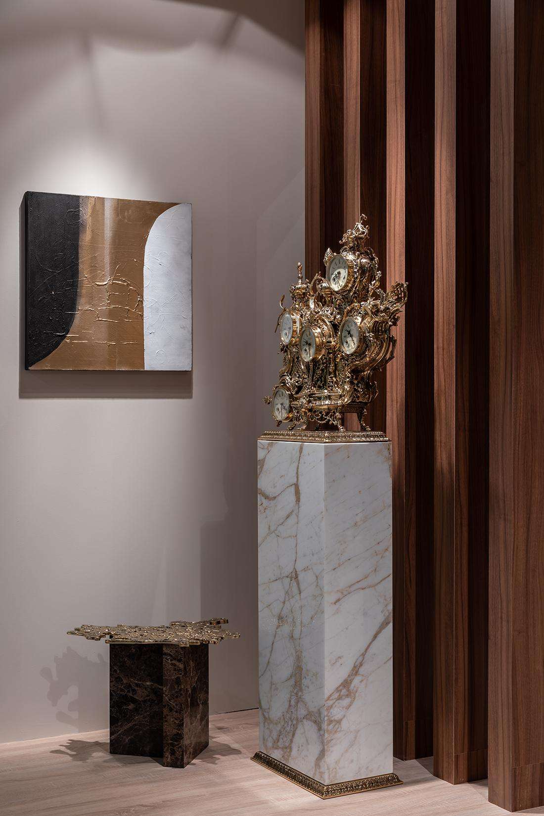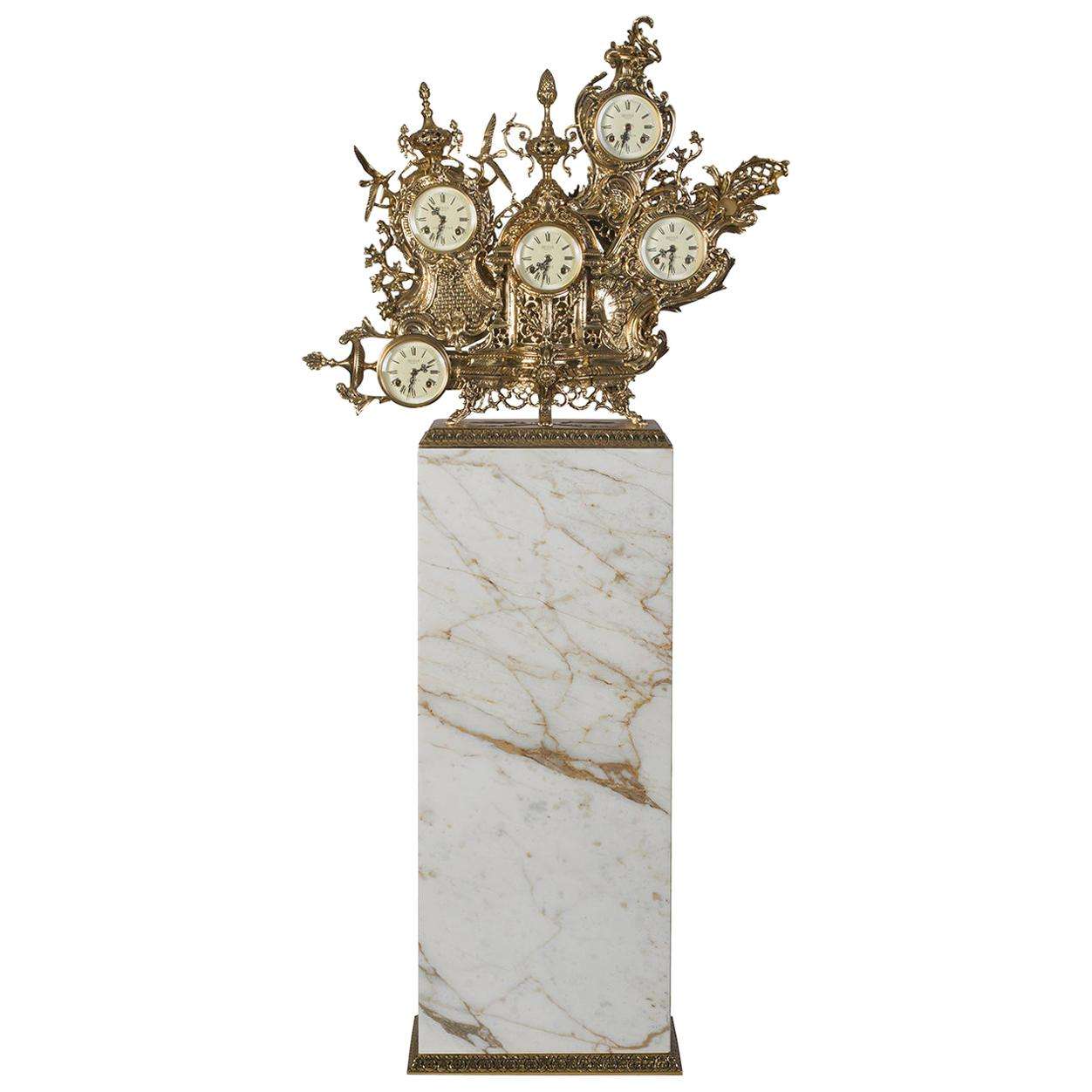 Crafted with polished Calacatta Oro marble, hand-polished brass with a patinated background, and finished with a brass anti-stain varnish, the clock features a brass gear train mechanism and extra-clear glass. Its design showcases five watches, each representing a major capital of fashion and design—New York, London, Paris, Moscow, and Tokyo—symbolizing a global connection through shared memories.