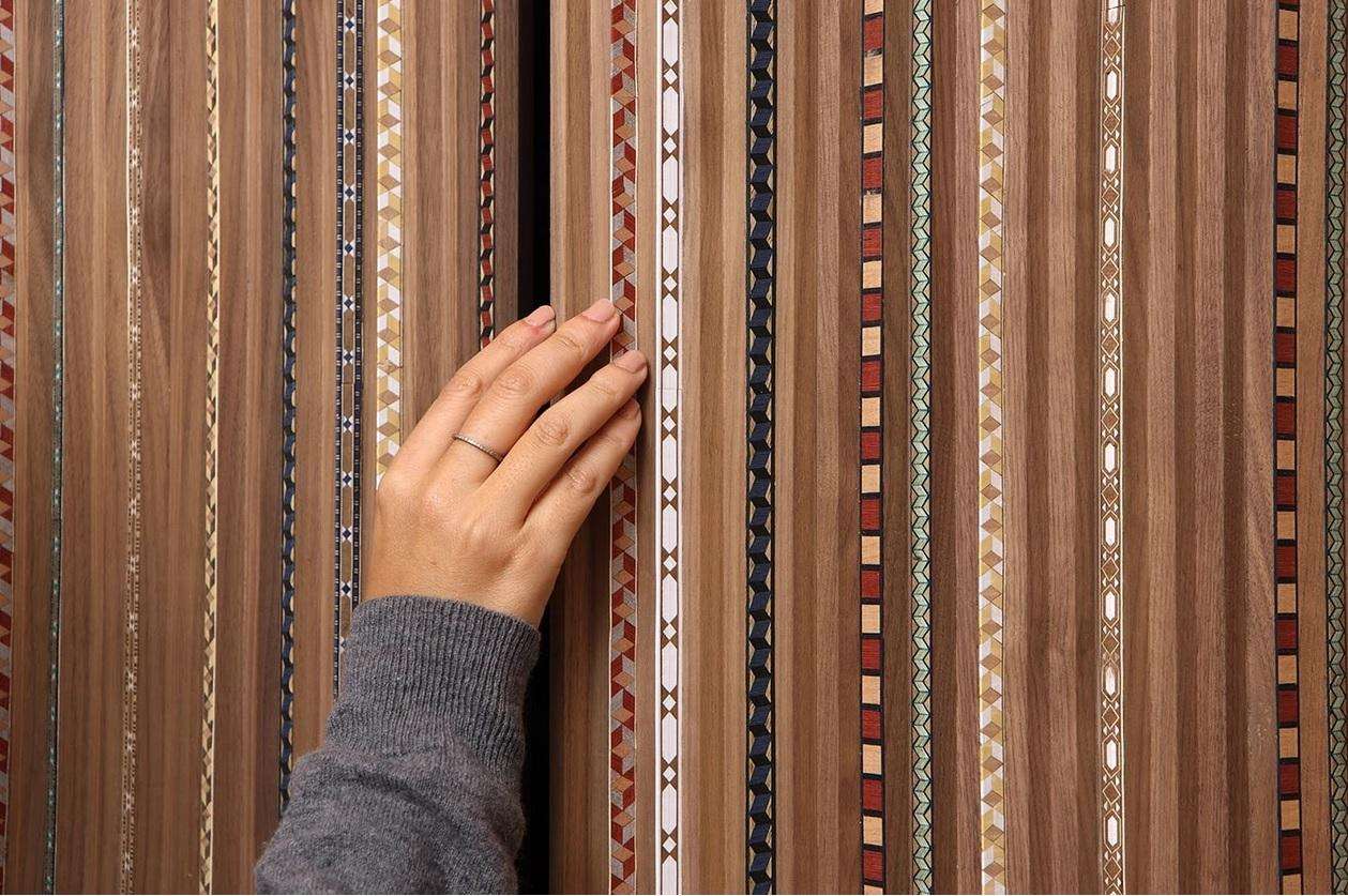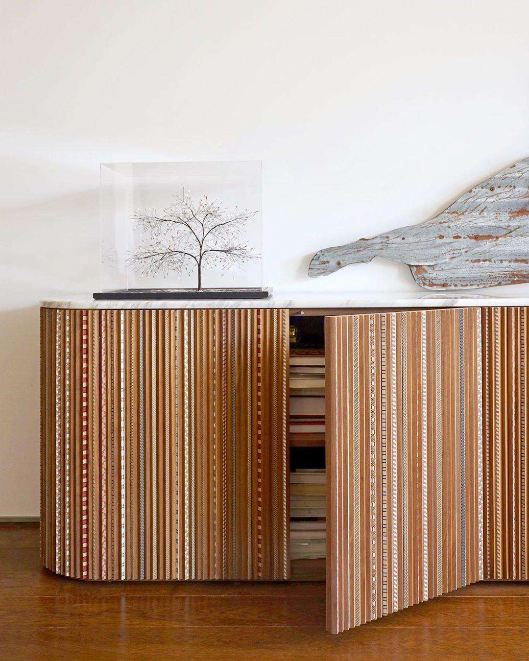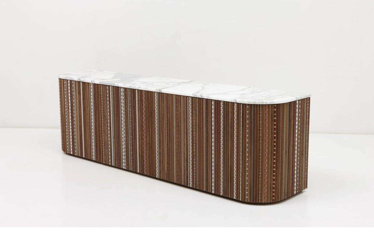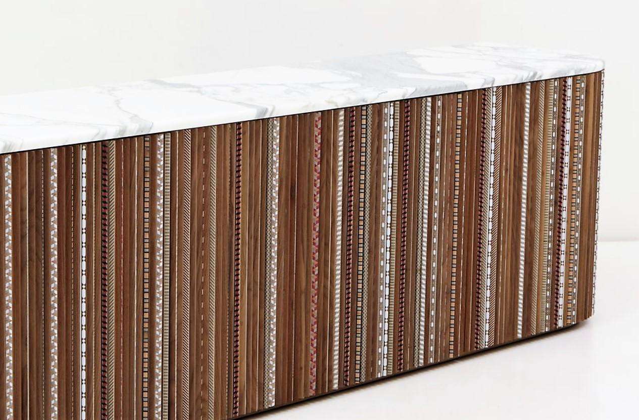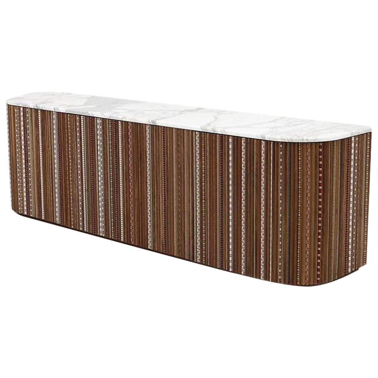 The Contemporary Sideboard in American Walnut with Calacatta Marble Top by Nada Debs, crafted in Lebanon in 2022, measures 200 cm wide, 45 cm deep, and 60 cm high, embodying a modern design with playful elegance. Featuring pleated wood doors with hand-inlaid marquetry in various colors and patterns, this piece is topped with Calacatta marble for weight and contrast, offering a fresh take on traditional craftsmanship. Ideal for a living room or dining area, it blends functionality with sophisticated artistry.