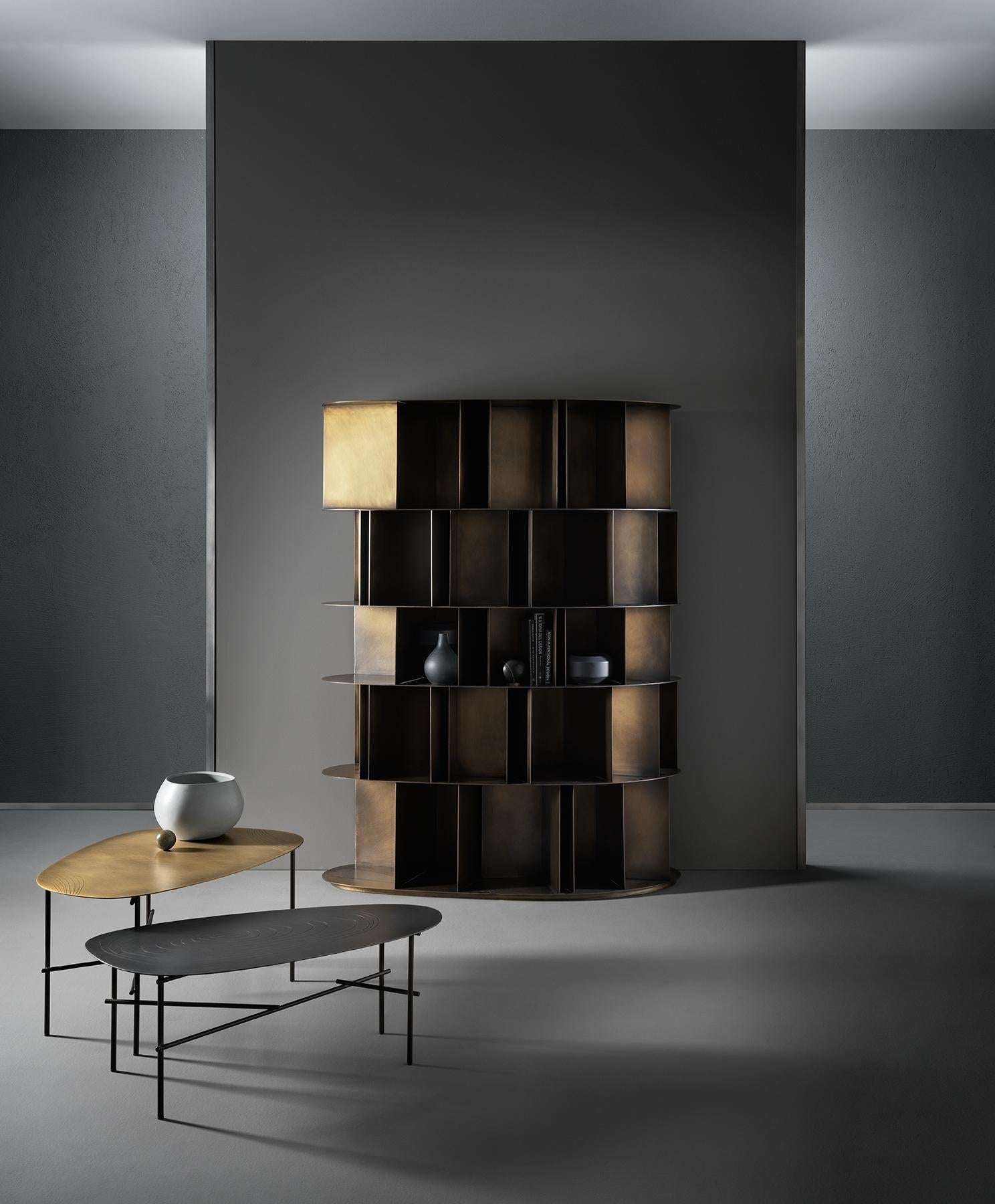 The DeCastelli Existence Wall Five-Tier Bookcase, designed by Michele De Lucchi and crafted in Italy in 2024, measures 123 cm wide, 41 cm deep, and 166 cm high, embodying a modern design that reimagines traditional shelving. Made from DeLabré G3 brass, this wall-mounted piece features an overlapping of small, varied boxes, creating a totem-like structure where no form repeats twice, reflecting the unique experiences of one’s life. As De Lucchi notes, it challenges the conventional straight, vertical bookcase, offering a space to store not just books but also keepsakes and artefacts, blending functionality with artistic expression in a single, dynamic composition.