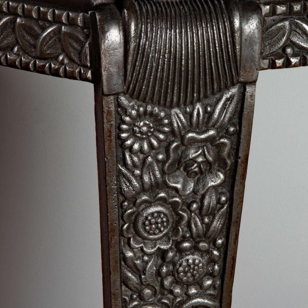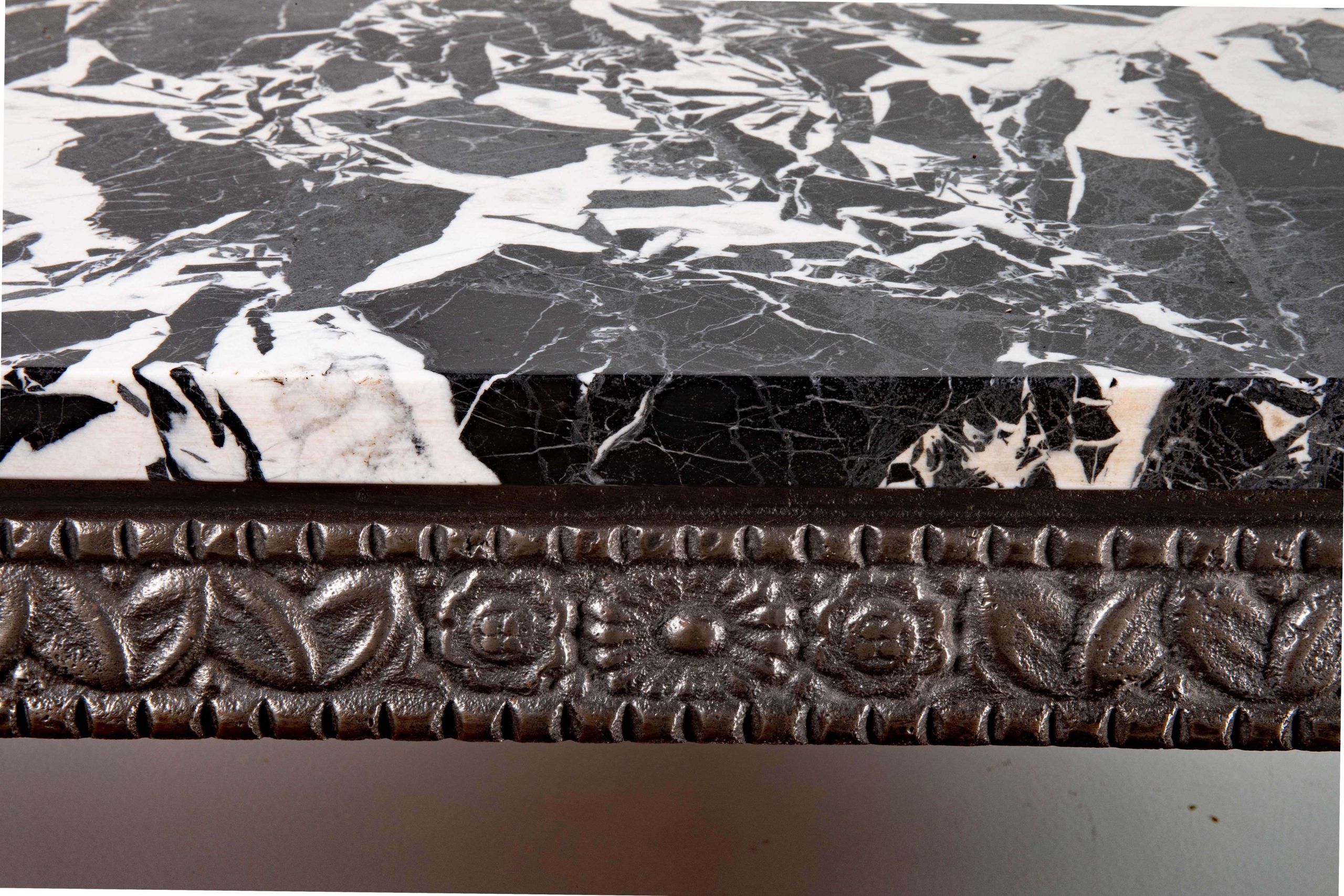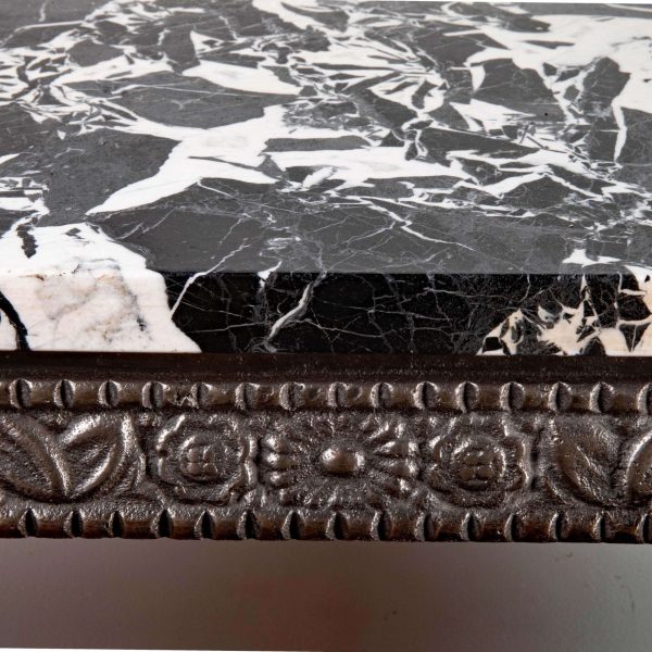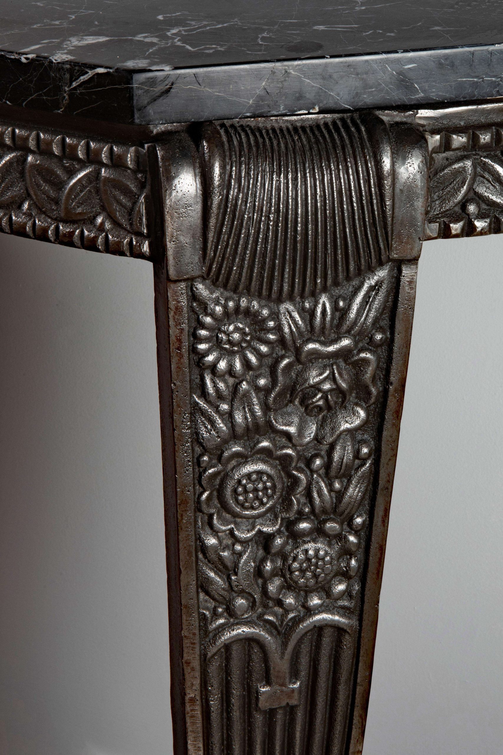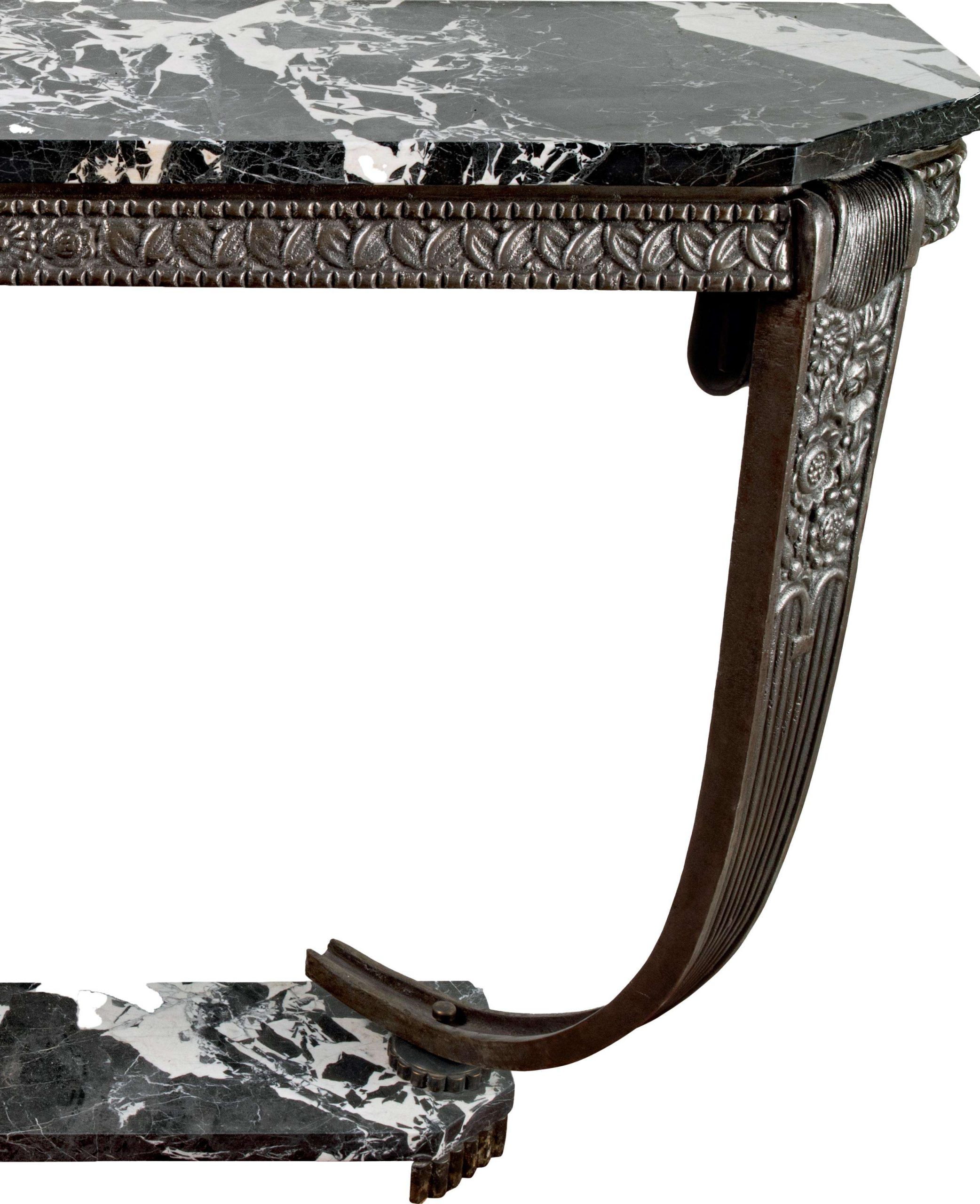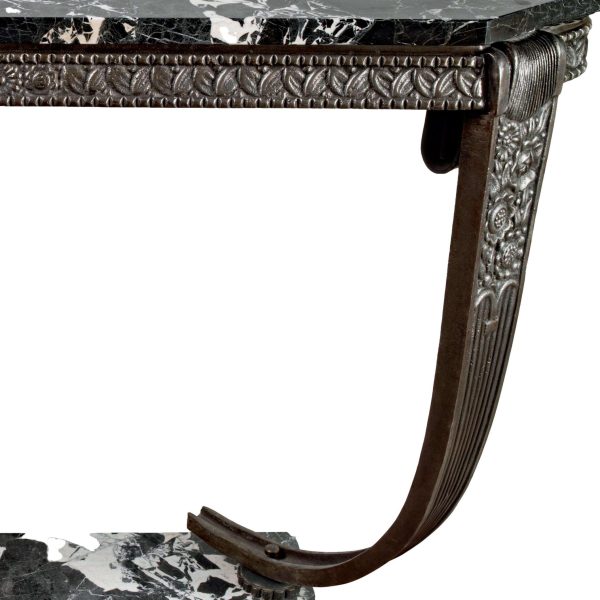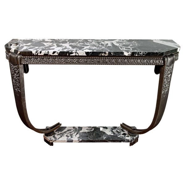 The Edgar Brandt Art Deco Console Altesse Model, crafted in France starting in 1927, measures 139 cm wide, 42 cm deep, and 95 cm high, embodying the elegance of the Art Deco period with masterful ironworking. This piece features a sculpted floral decor on cast iron, accented with incised lines and a black & white Grand Antique marble top, showcasing Brandt’s commitment to hand-finished texture and individuality. A standout from the 1925 Exposition, it serves as a striking accent for a hallway, living room, or office, blending functionality with artistic heritage.