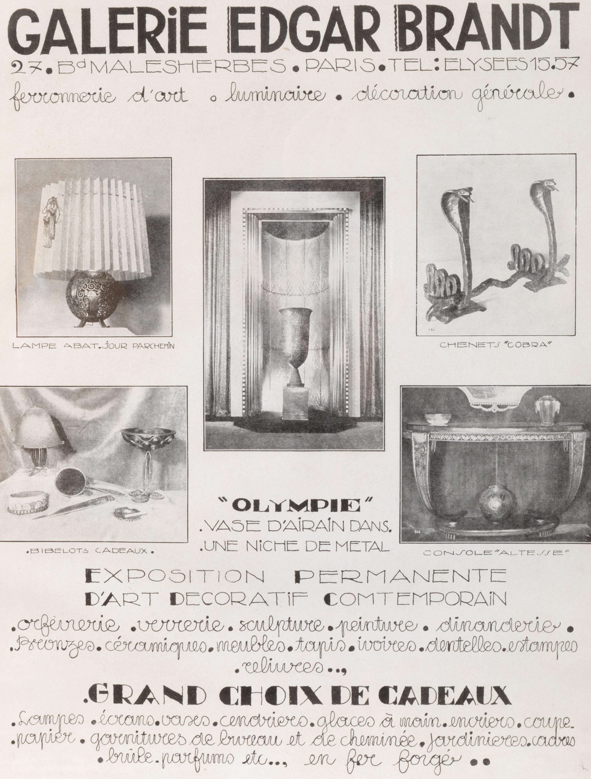 In good condition with minor wear, this console reflects Brandt’s legacy as a leading 20th-century metalworker, trained in Paris and celebrated for his organic forms and geometric designs. Ideal for Art Deco or modern interiors, it offers a durable surface for decor, enhancing the space with its luxurious craftsmanship, perfect for collectors seeking a rare piece tied to the 1925 exhibition and Brandt’s influential career.
