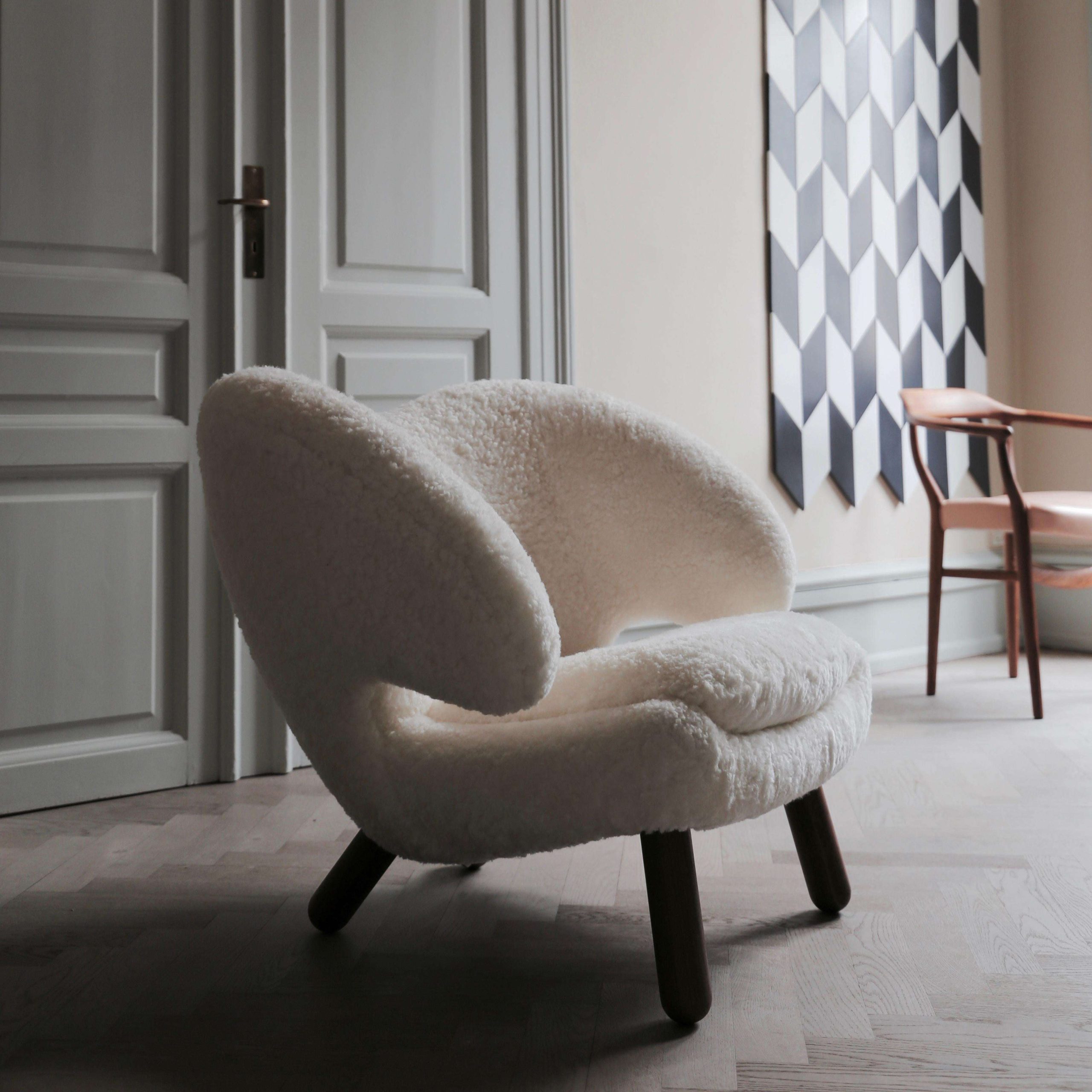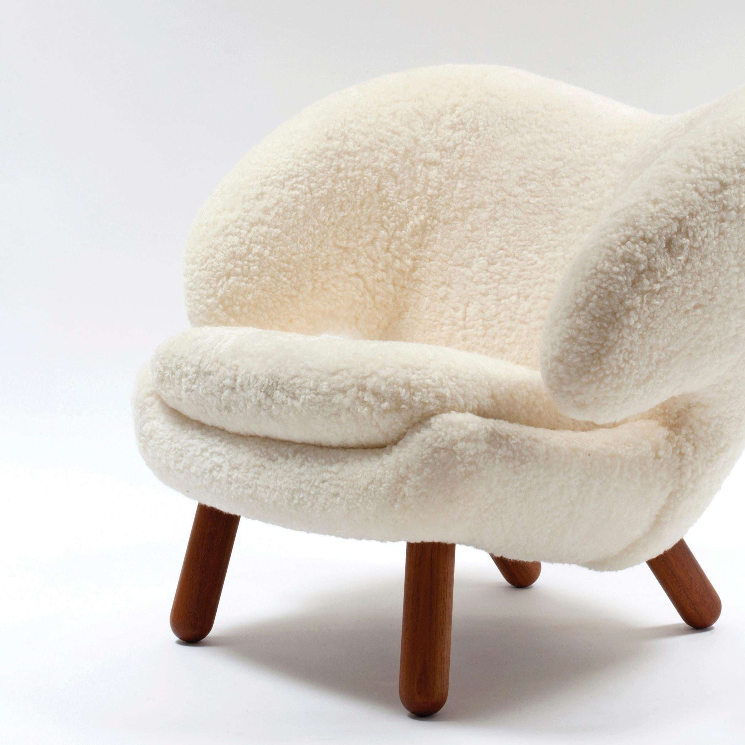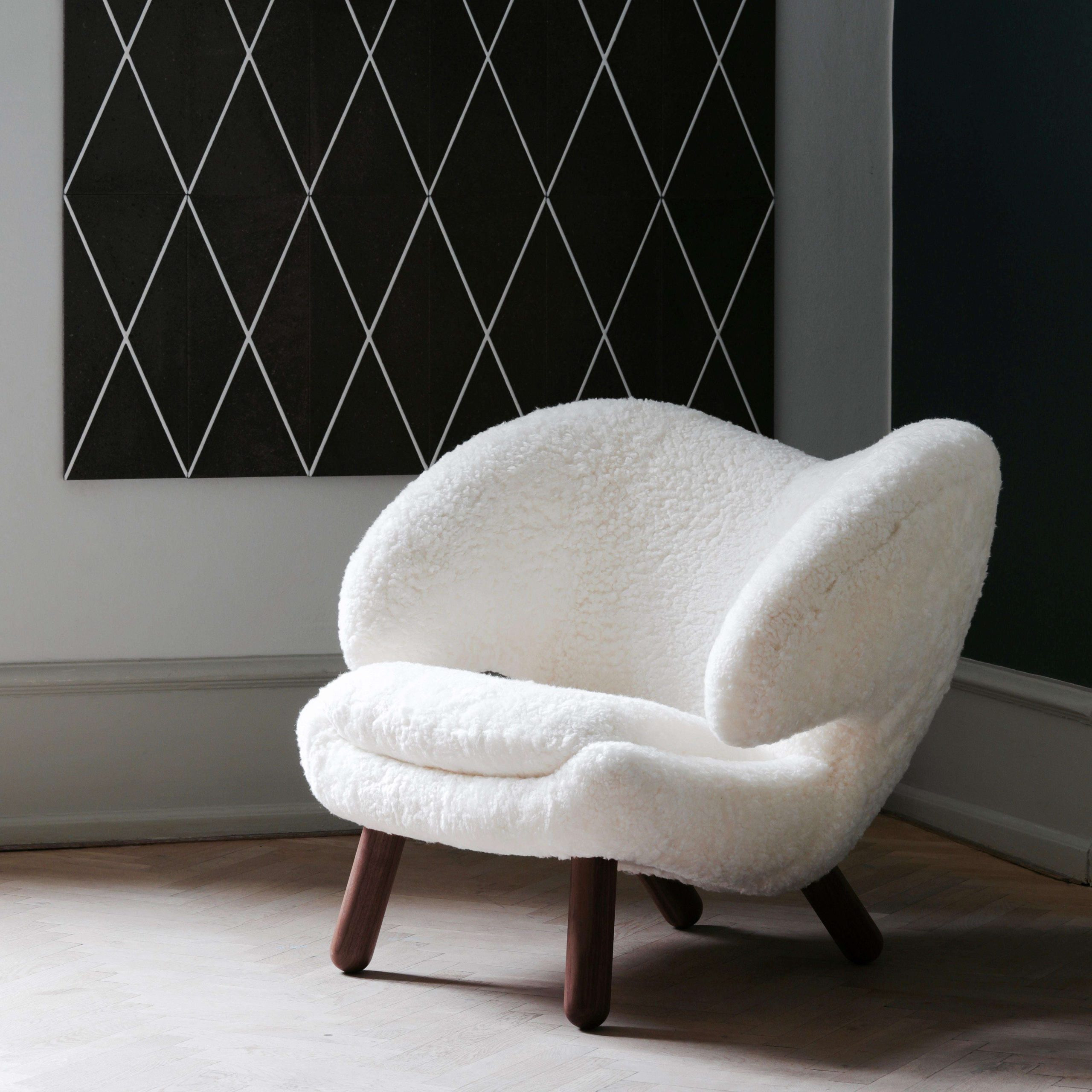The Finn Juhl Pelican Chair, designed in 1940 and relaunched by House of Finn Juhl in Denmark, measures 85 cm wide, 76 cm deep, and 68 cm high with a seat height of 37 cm. Crafted in 2024, this modern icon features a walnut frame and Skandilock sheep offwhite upholstery, offering a soft, organic shape that embraces the user like a friendly hug, with sturdy legs adding stability.