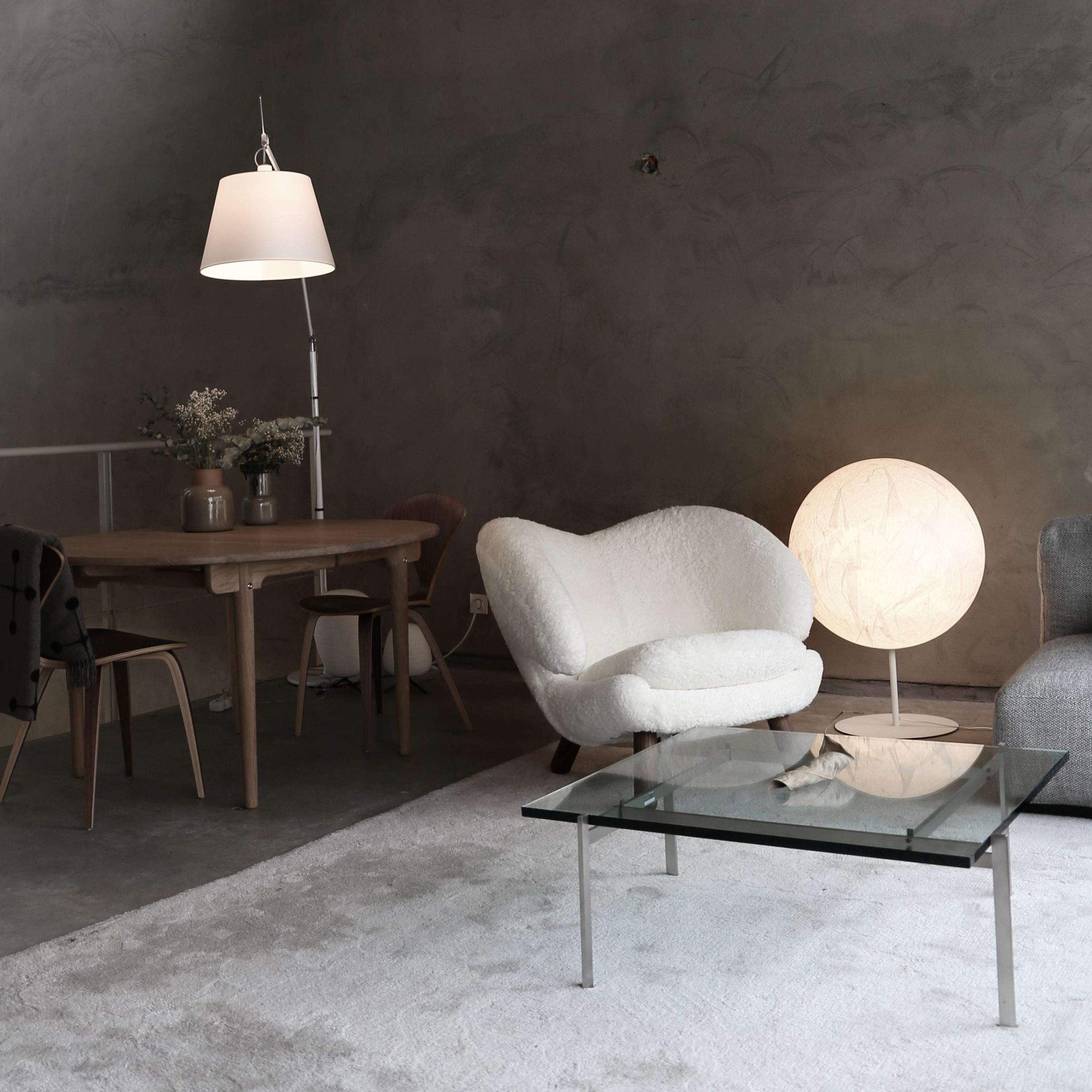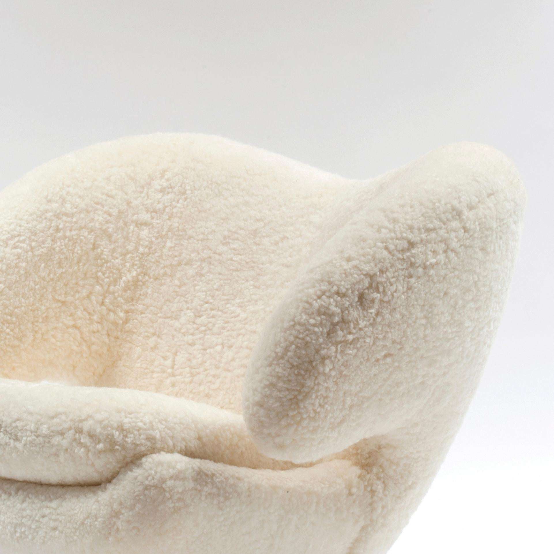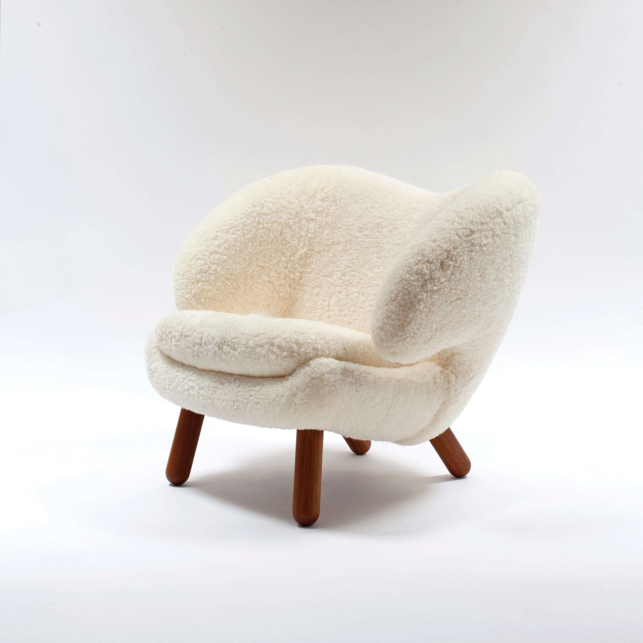 The Finn Juhl Pelican Chair, designed in 1940 and relaunched by House of Finn Juhl in Denmark, measures 85 cm wide, 76 cm deep, and 68 cm high with a seat height of 37 cm. Crafted in 2024, this modern icon features a walnut frame and Skandilock sheep offwhite upholstery, offering a soft, organic shape that embraces the user like a friendly hug, with sturdy legs adding stability.