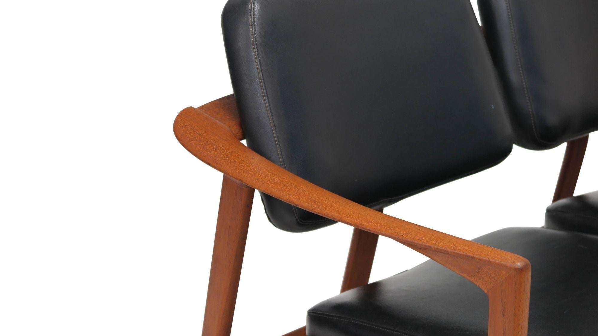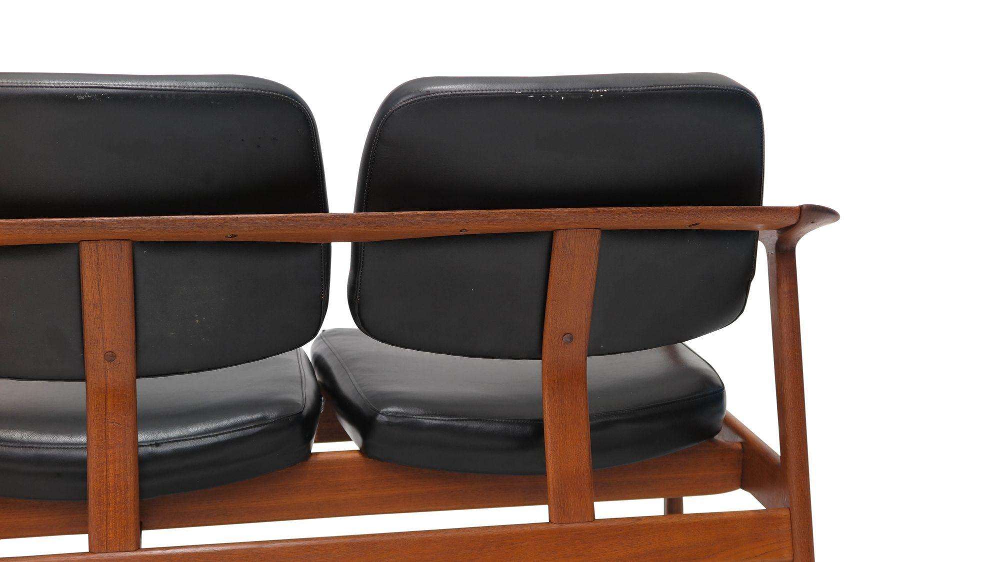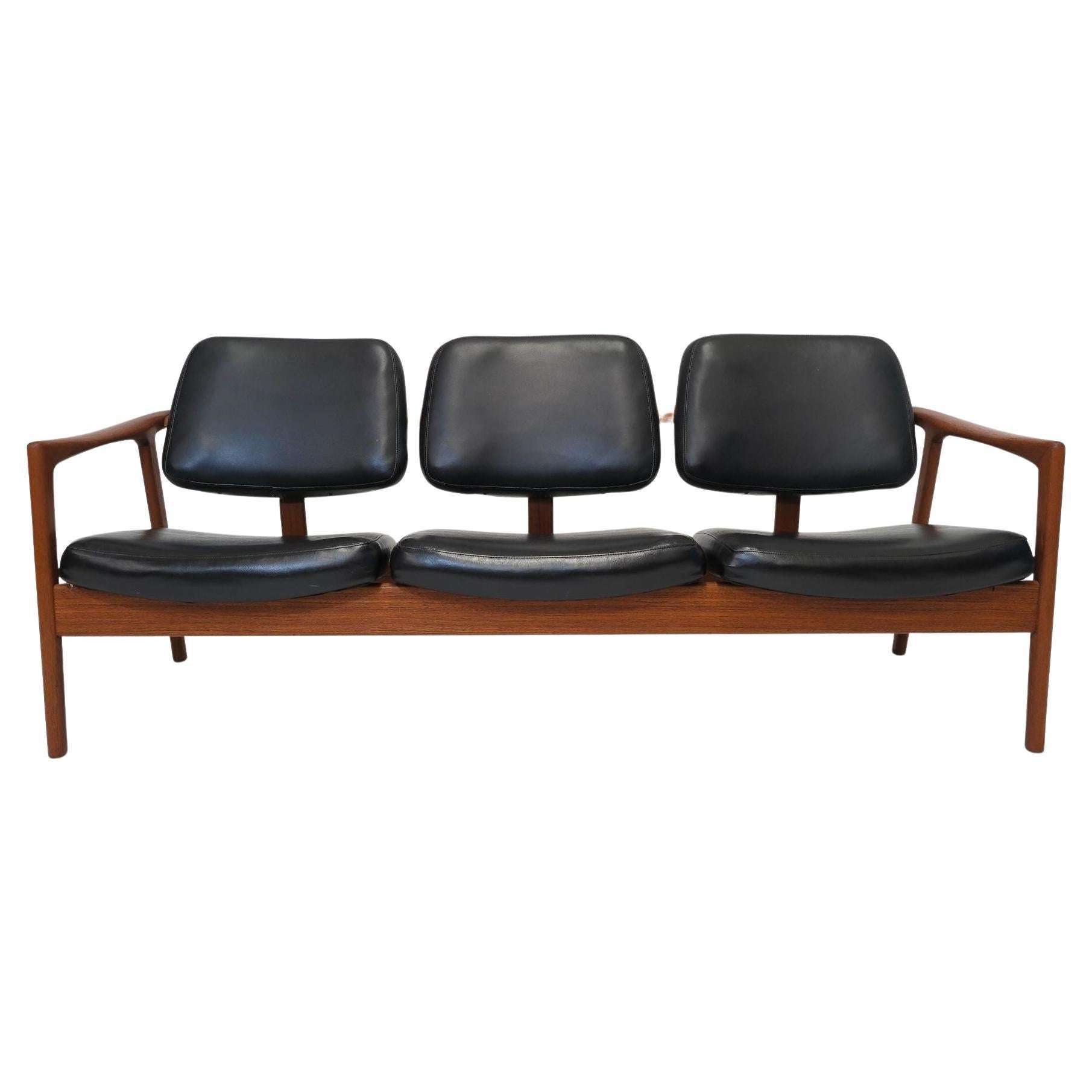 The Folke Ohlsson Ascot Teak Frame Sofa, designed in 1965 in Sweden, measures 185.42 cm wide, 69.85 cm deep, and 73.03 cm high with a seat height of 38.74 cm. Crafted with a sculpted teak frame and original black vinyl upholstered seats and backs, this rare model exemplifies Scandinavian modern design with its clean lines and functional elegance.