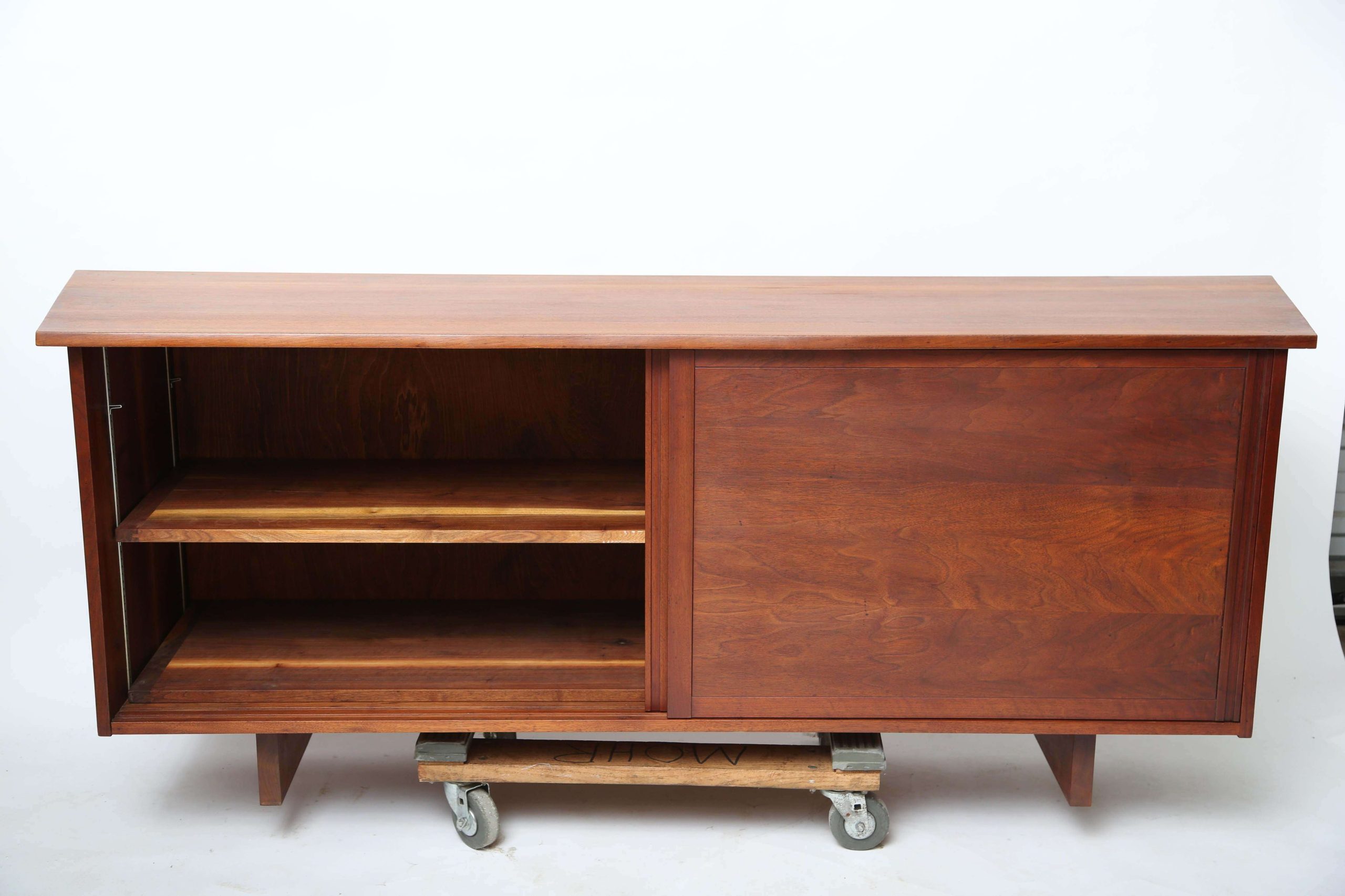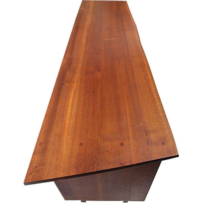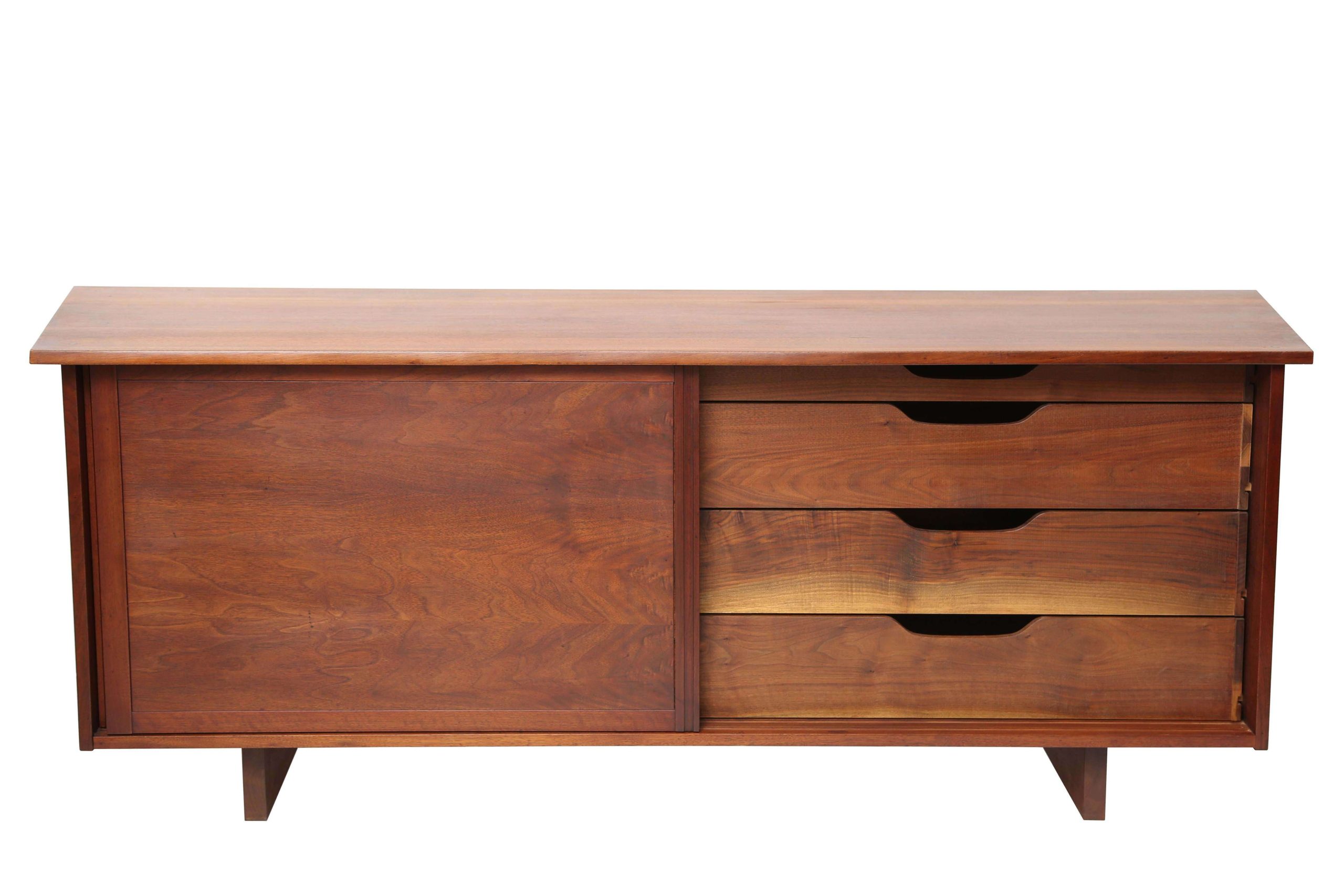 The Free Edge George Nakashima 2-Door Cabinet, crafted in North America in 1960, measures 213.36 cm wide, 52.07 cm deep, and 81.28 cm high, embodying Nakashima’s iconic blend of functionality and organic elegance. This early cabinet features unique sliding doors, revealing an open shelf on one side for displaying cherished items or books, and three spacious drawers on the other for organizing essentials. Constructed from walnut with a natural wood finish, its clean lines and meticulous craftsmanship reflect Nakashima’s commitment to showcasing the material’s inherent beauty, creating a timeless piece that enhances both traditional and modern interiors with its warm, organic aesthetic.