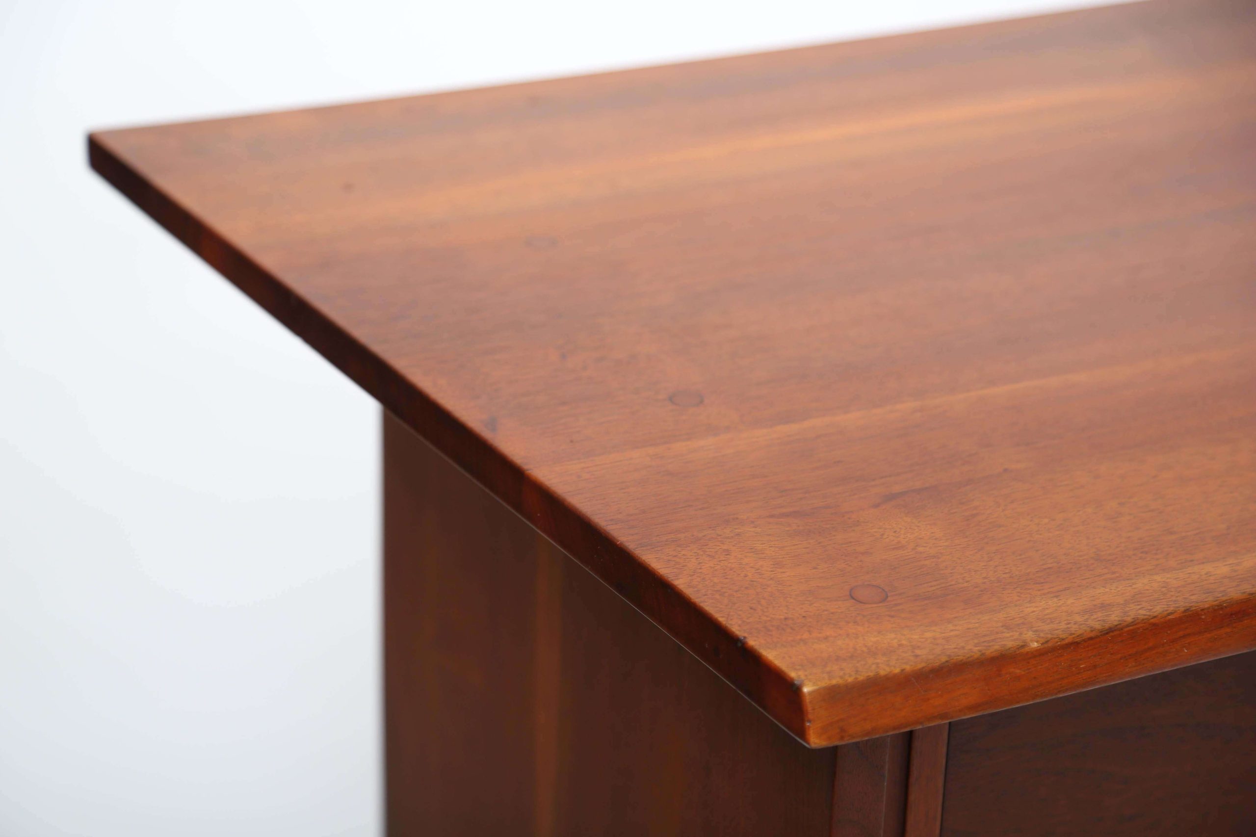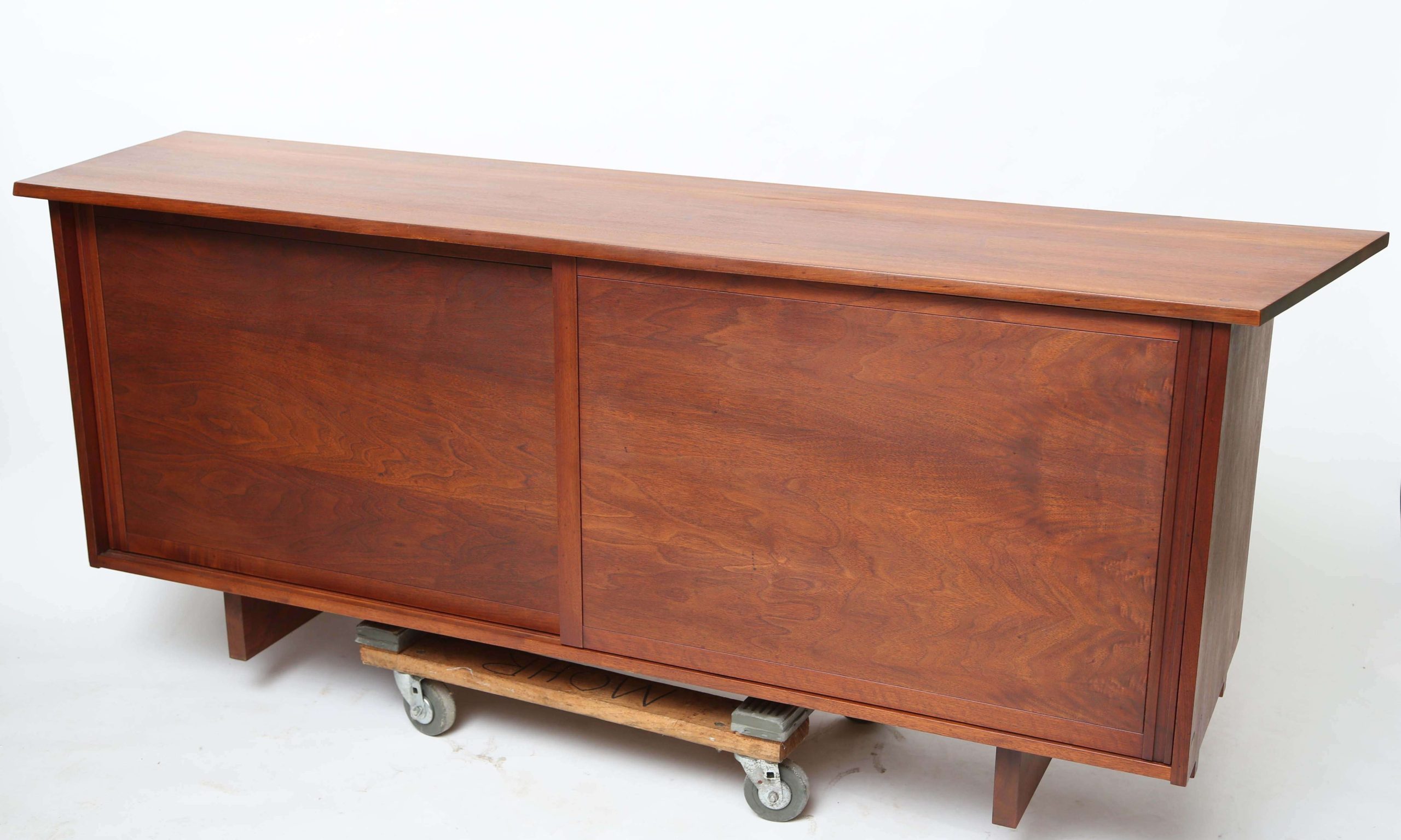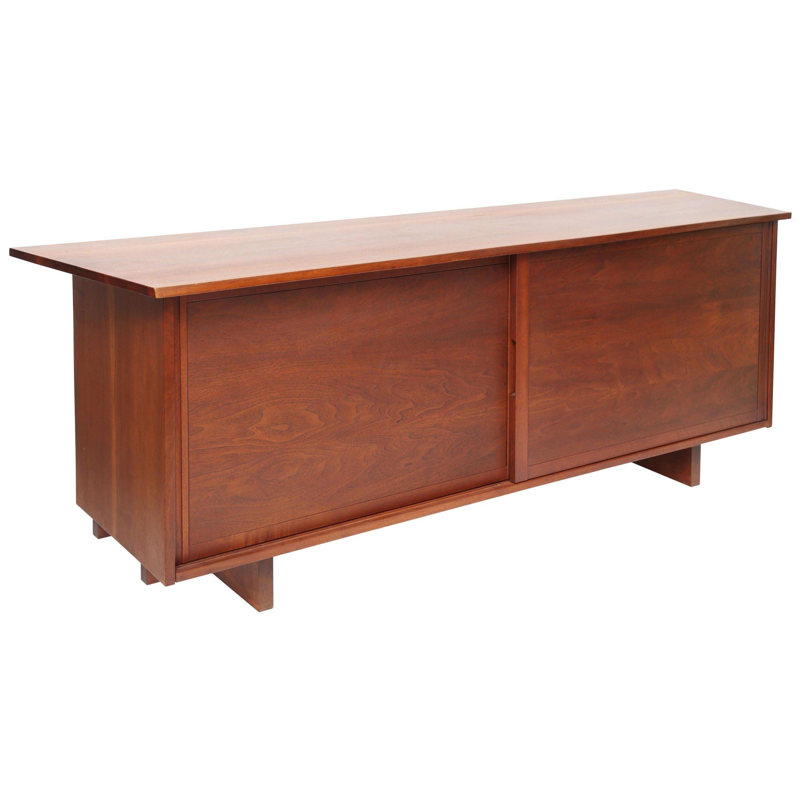 The Free Edge George Nakashima 2-Door Cabinet, crafted in North America in 1960, measures 213.36 cm wide, 52.07 cm deep, and 81.28 cm high, embodying Nakashima’s iconic blend of functionality and organic elegance. This early cabinet features unique sliding doors, revealing an open shelf on one side for displaying cherished items or books, and three spacious drawers on the other for organizing essentials. Constructed from walnut with a natural wood finish, its clean lines and meticulous craftsmanship reflect Nakashima’s commitment to showcasing the material’s inherent beauty, creating a timeless piece that enhances both traditional and modern interiors with its warm, organic aesthetic.