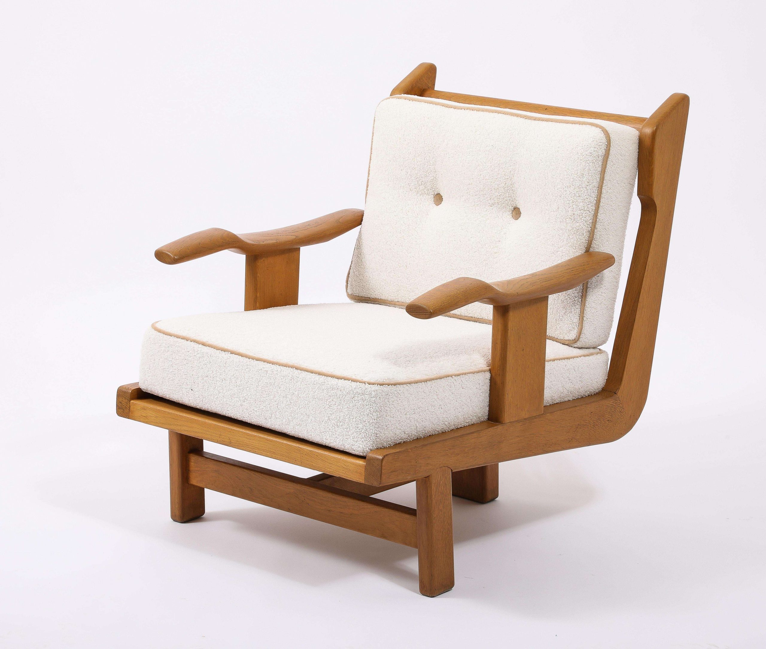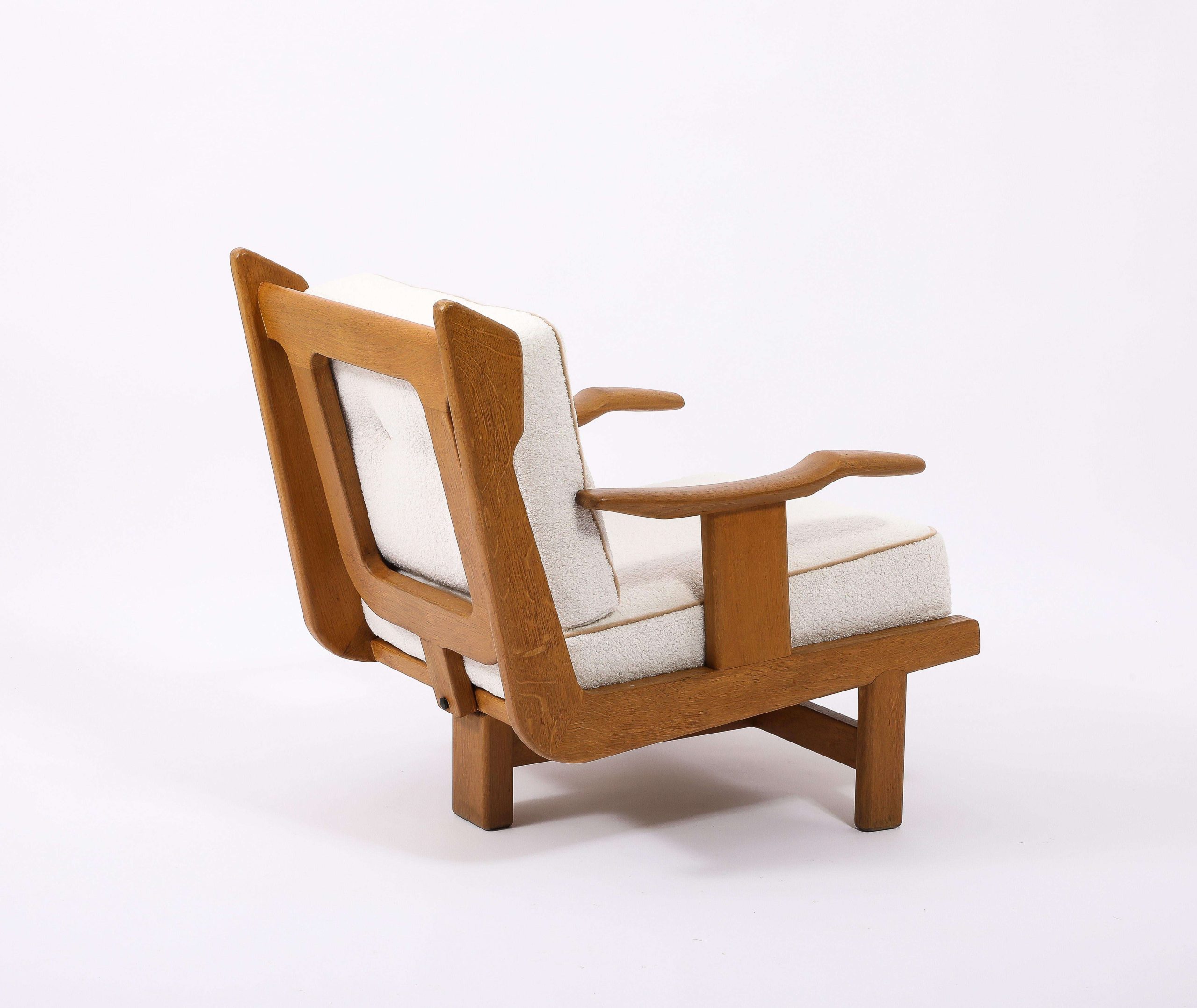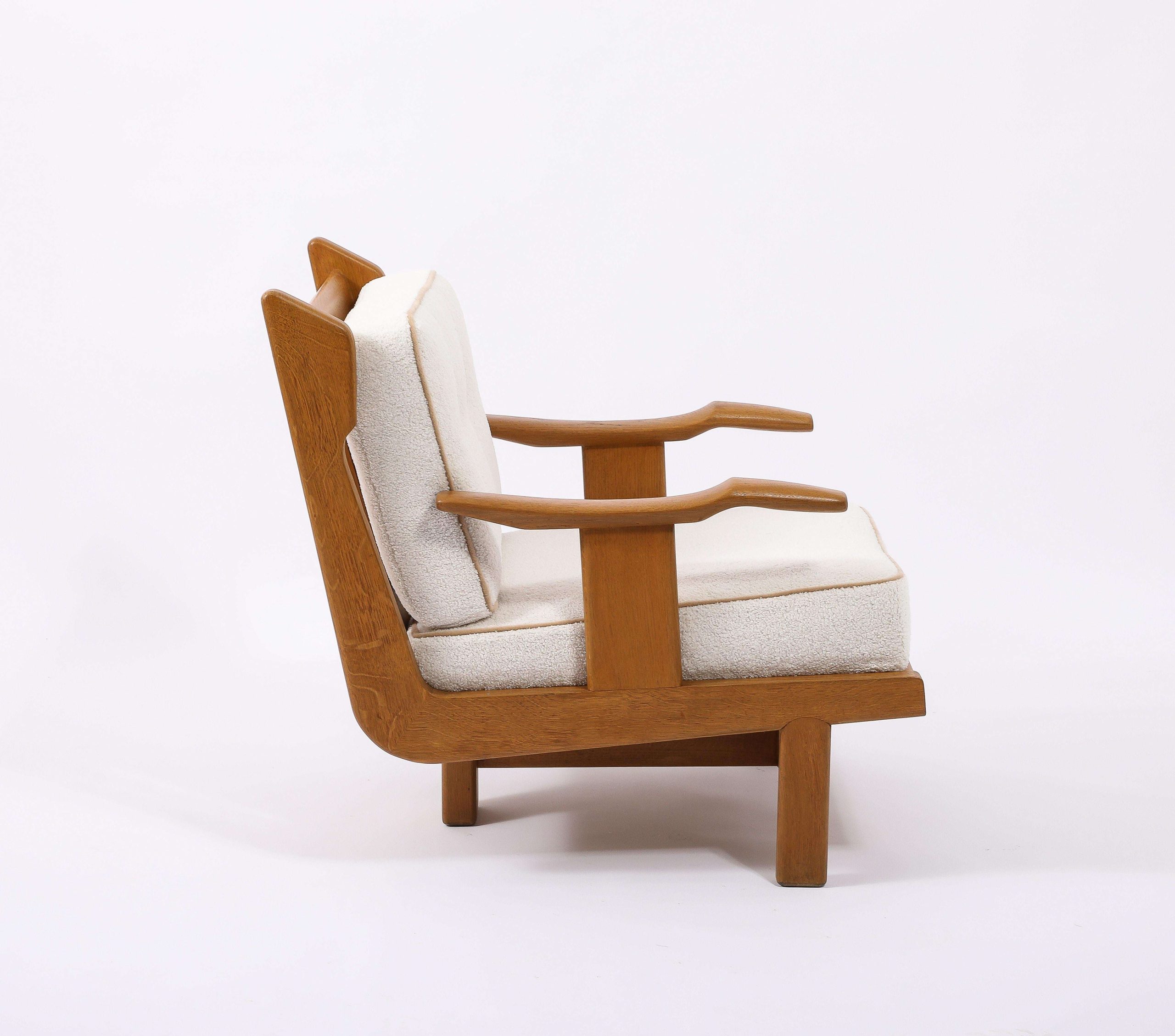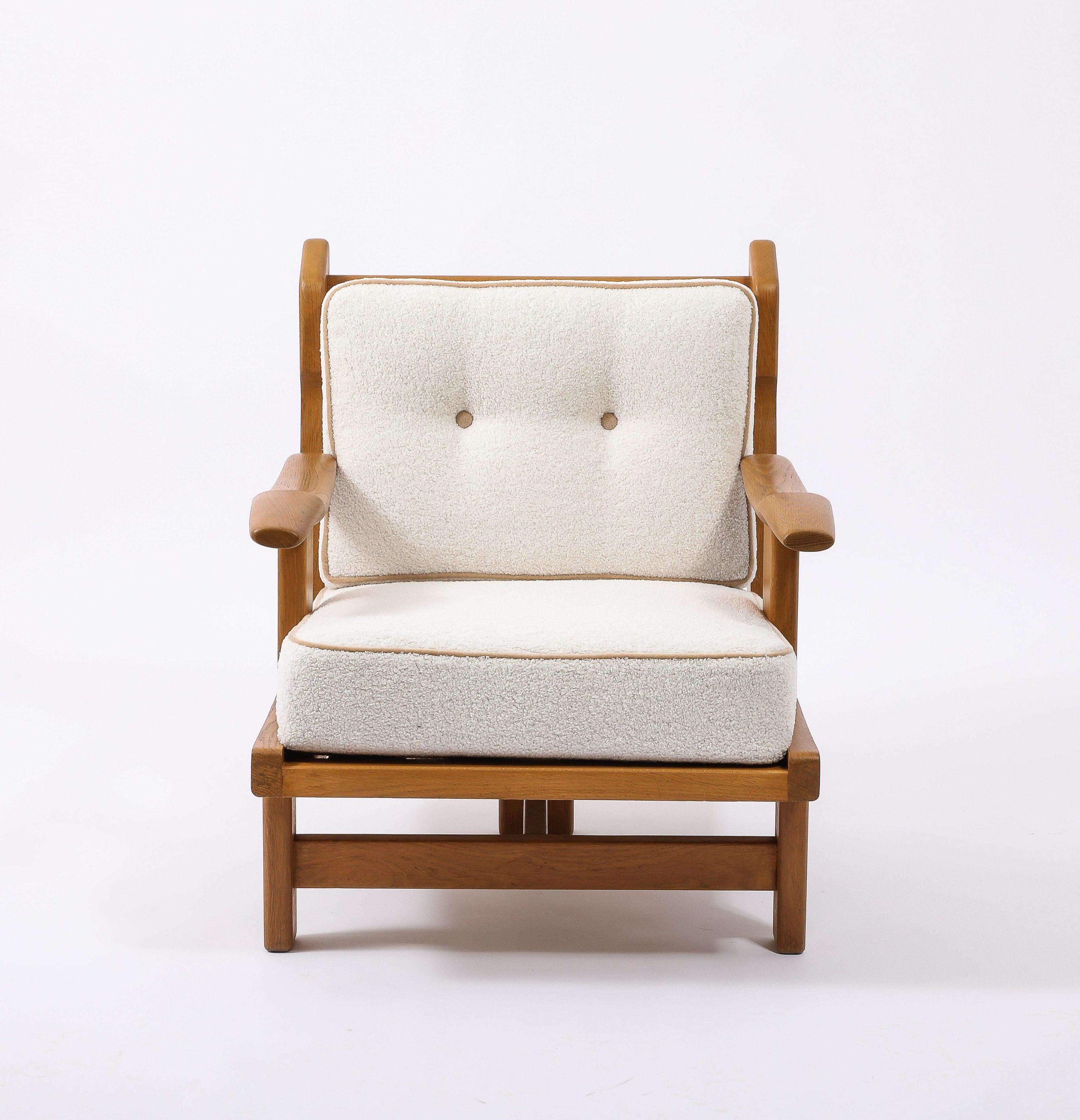 The rare Guillerme & Chambron T Chair, crafted in France in 1960, measures 78.74 cm wide, 81.28 cm deep, and 68.58 cm high with a seat height of 30.48 cm. This standout tripod oak armchair showcases a Brutalist design with separated arms, enhancing its refined silhouette and offering a perfect balance of elegance and comfort. Recently refinished to highlight the natural beauty of the oak, the chair has been reupholstered in luxurious Pierre Frey bouclé fabric, adding texture and warmth to its aesthetic. The contrasting piping and buttons serve as stylish accents, emphasizing the meticulous craftsmanship and attention to detail.