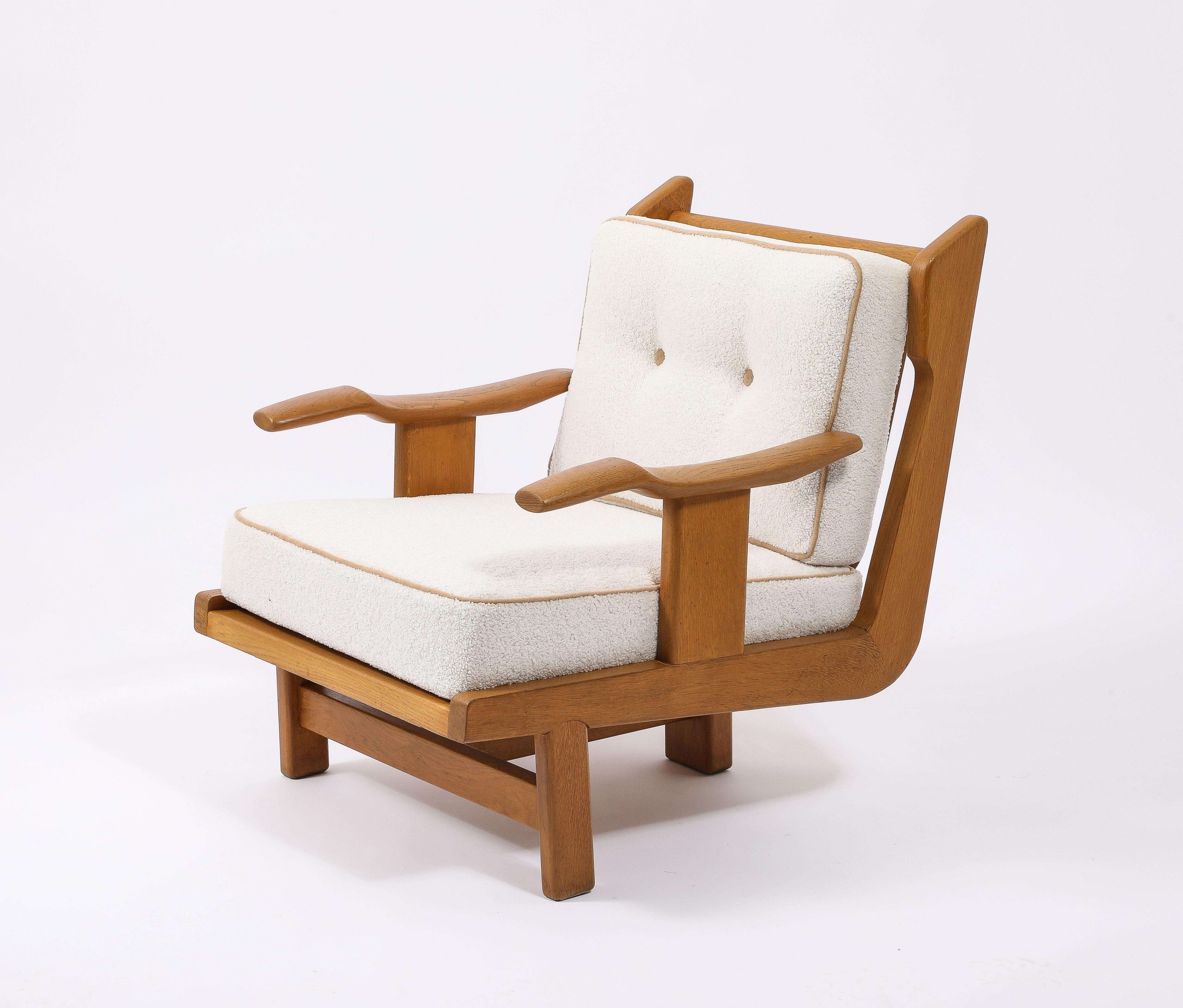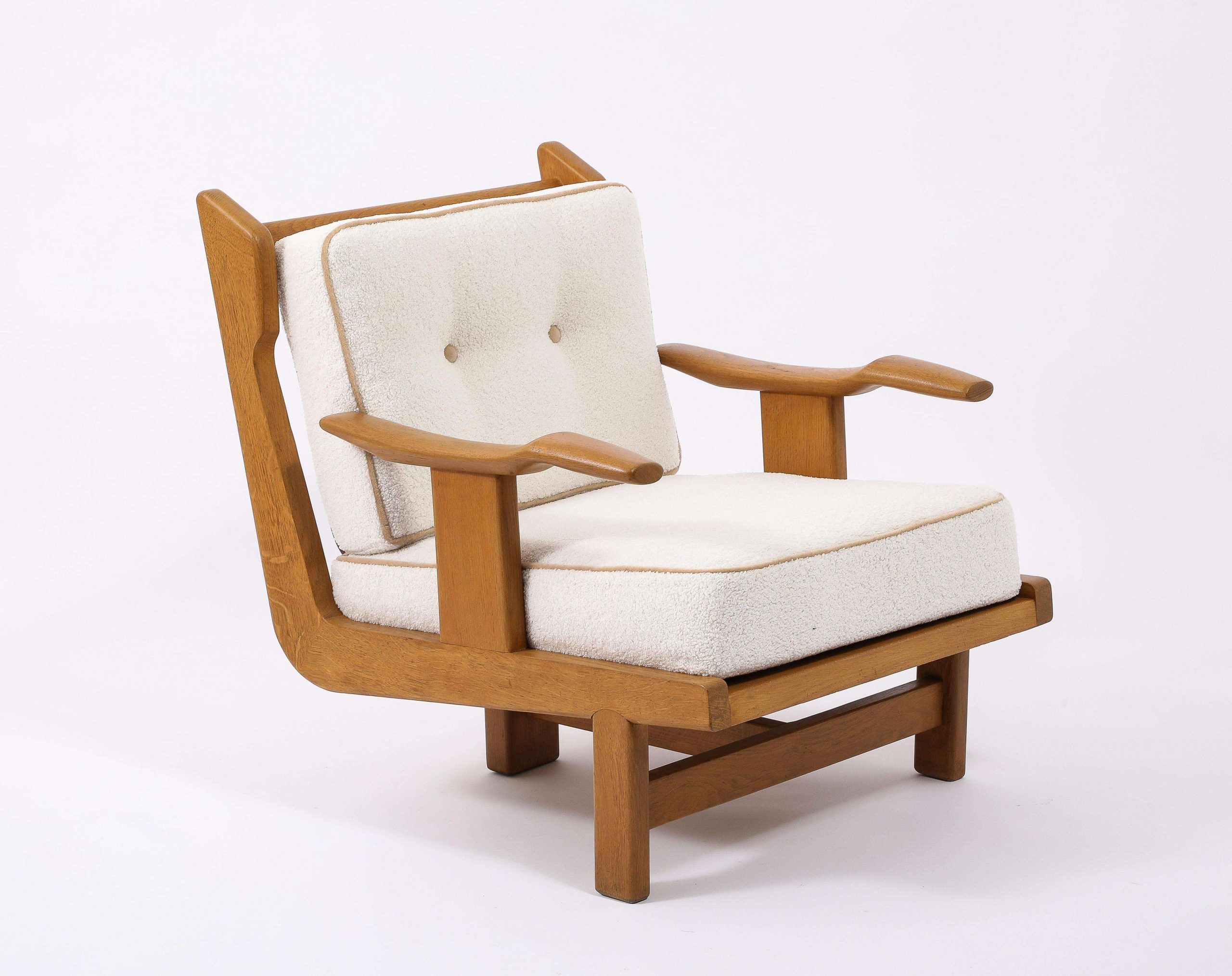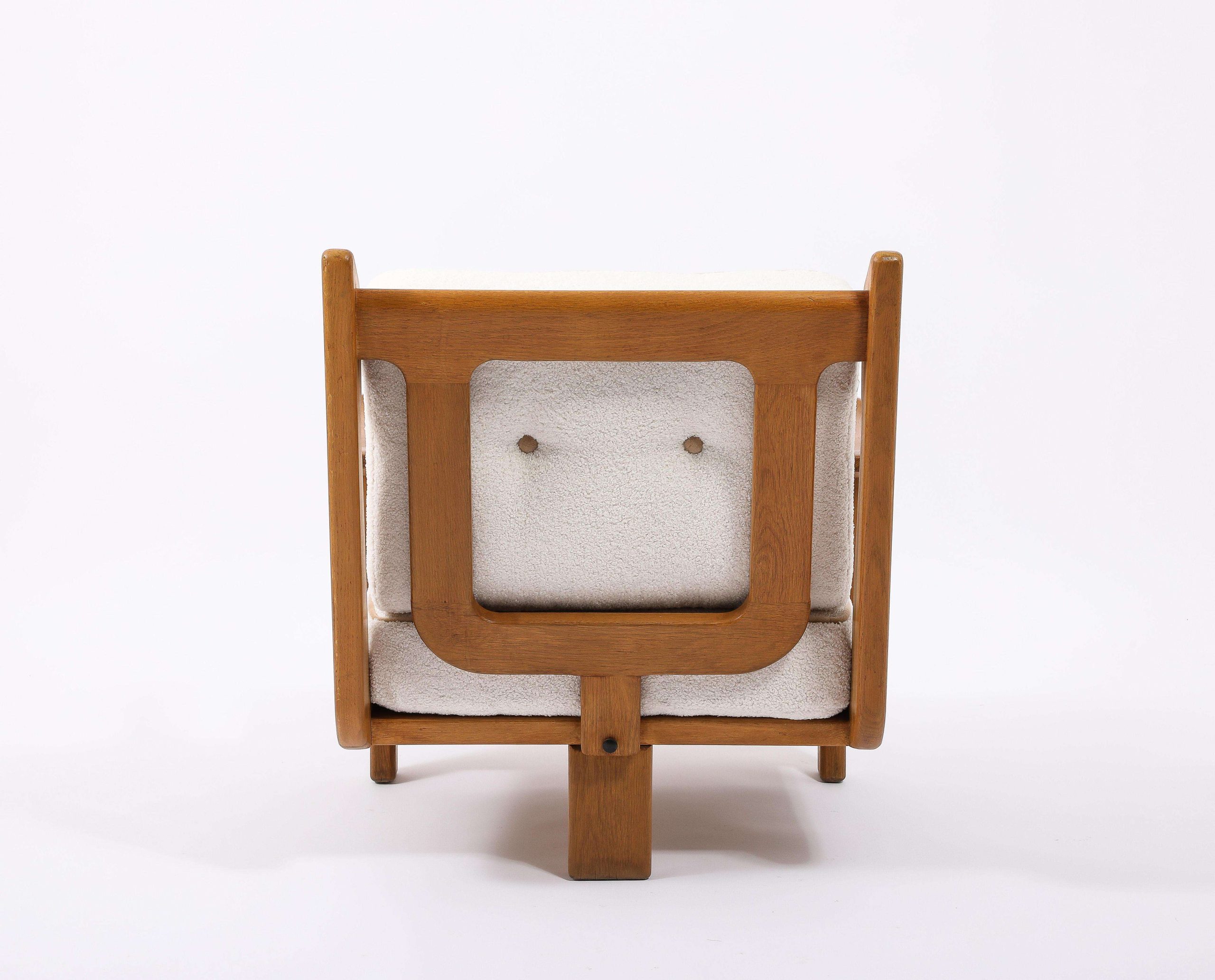 The rare Guillerme & Chambron T Chair, crafted in France in 1960, measures 78.74 cm wide, 81.28 cm deep, and 68.58 cm high with a seat height of 30.48 cm. This standout tripod oak armchair showcases a Brutalist design with separated arms, enhancing its refined silhouette and offering a perfect balance of elegance and comfort. Recently refinished to highlight the natural beauty of the oak, the chair has been reupholstered in luxurious Pierre Frey bouclé fabric, adding texture and warmth to its aesthetic. The contrasting piping and buttons serve as stylish accents, emphasizing the meticulous craftsmanship and attention to detail.