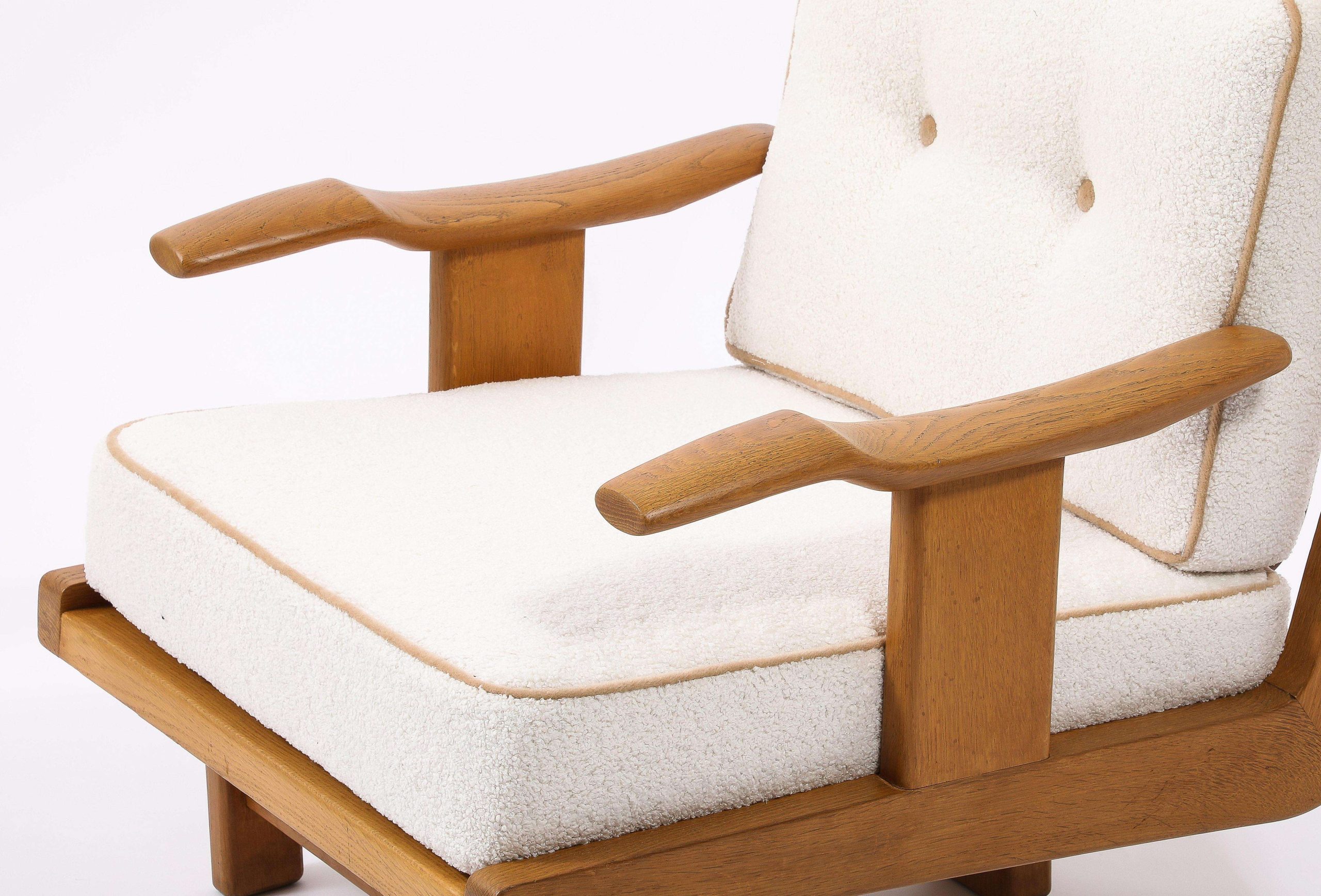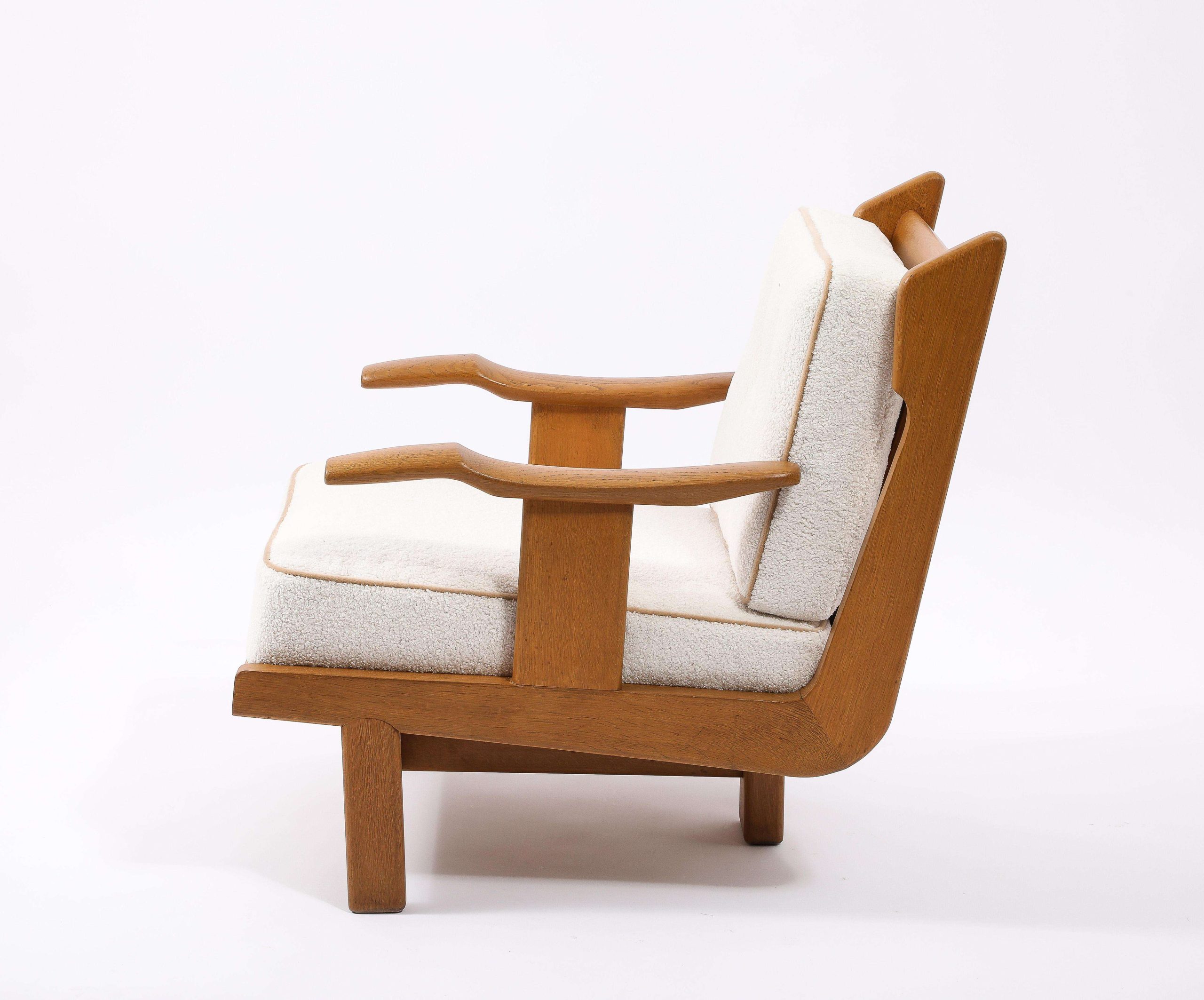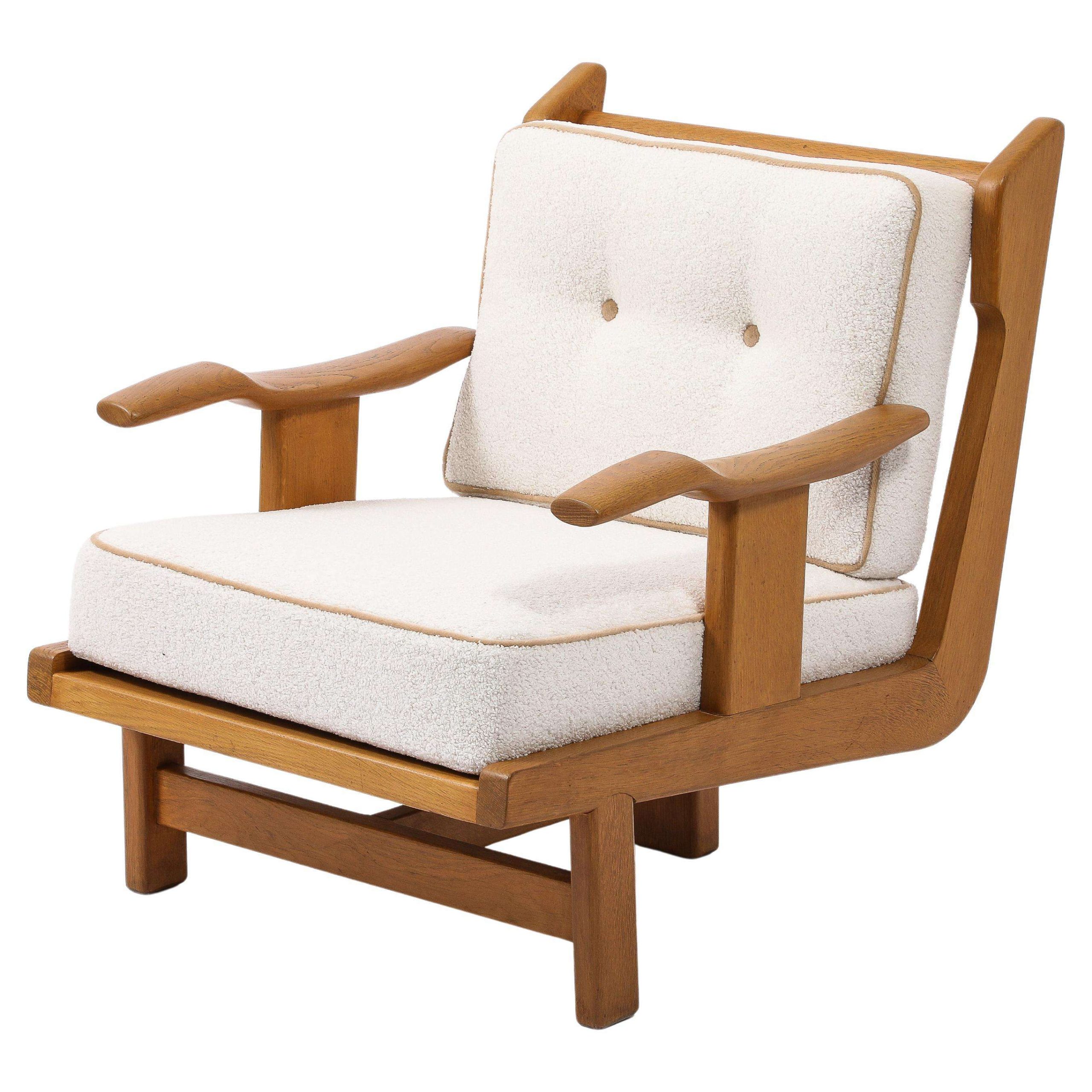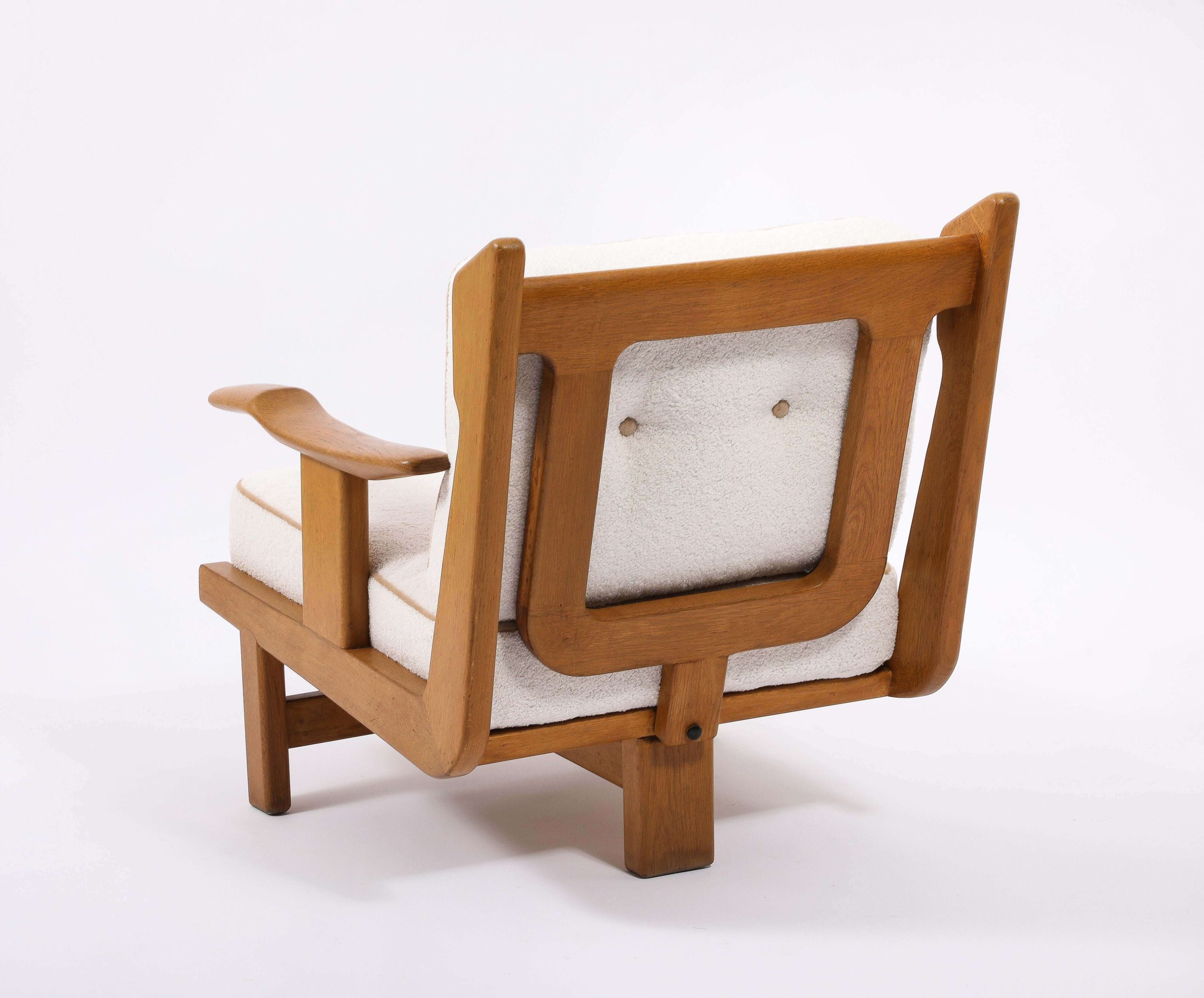 The rare Guillerme & Chambron T Chair, crafted in France in 1960, measures 78.74 cm wide, 81.28 cm deep, and 68.58 cm high with a seat height of 30.48 cm. This standout tripod oak armchair showcases a Brutalist design with separated arms, enhancing its refined silhouette and offering a perfect balance of elegance and comfort. Recently refinished to highlight the natural beauty of the oak, the chair has been reupholstered in luxurious Pierre Frey bouclé fabric, adding texture and warmth to its aesthetic. The contrasting piping and buttons serve as stylish accents, emphasizing the meticulous craftsmanship and attention to detail.