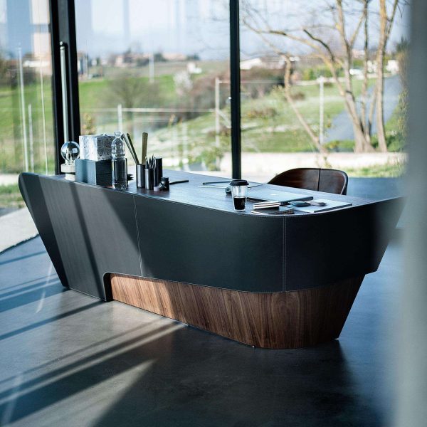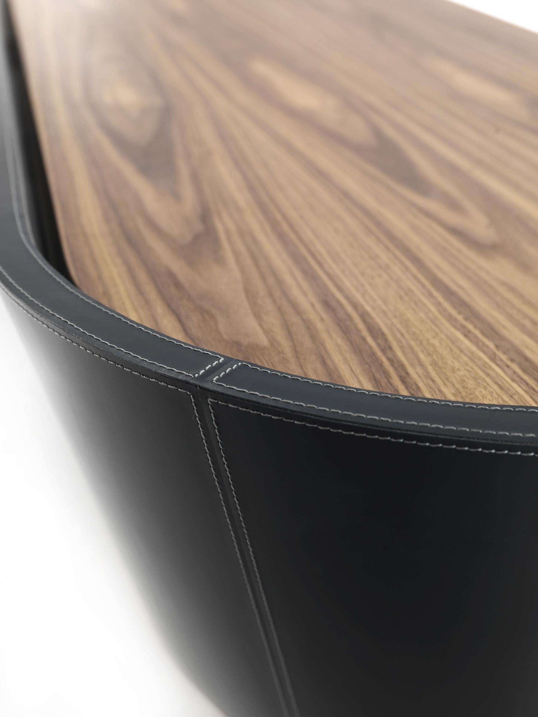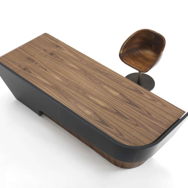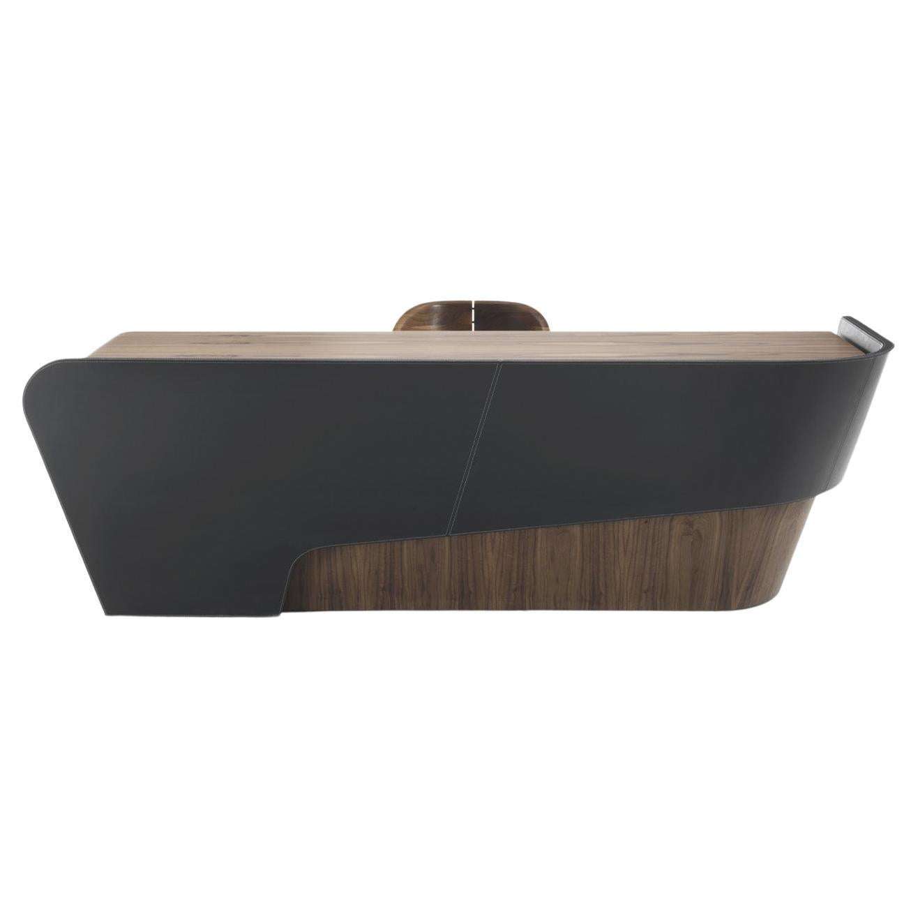 The Klip Wood & Leather Writing Desk by Karim Rashid, crafted in Italy in 2023, measures 244 cm wide, 91.2 cm deep, and 78 cm high, embodying a modern design with smooth, flowing lines. This desk features a curved veneered multilayer top and a front panel, optionally covered in leather, equipped with a practical chest of three dovetail-jointed drawers with lateral grooves for opening. Ideal for a workspace or study, it blends functionality with sleek artistry.