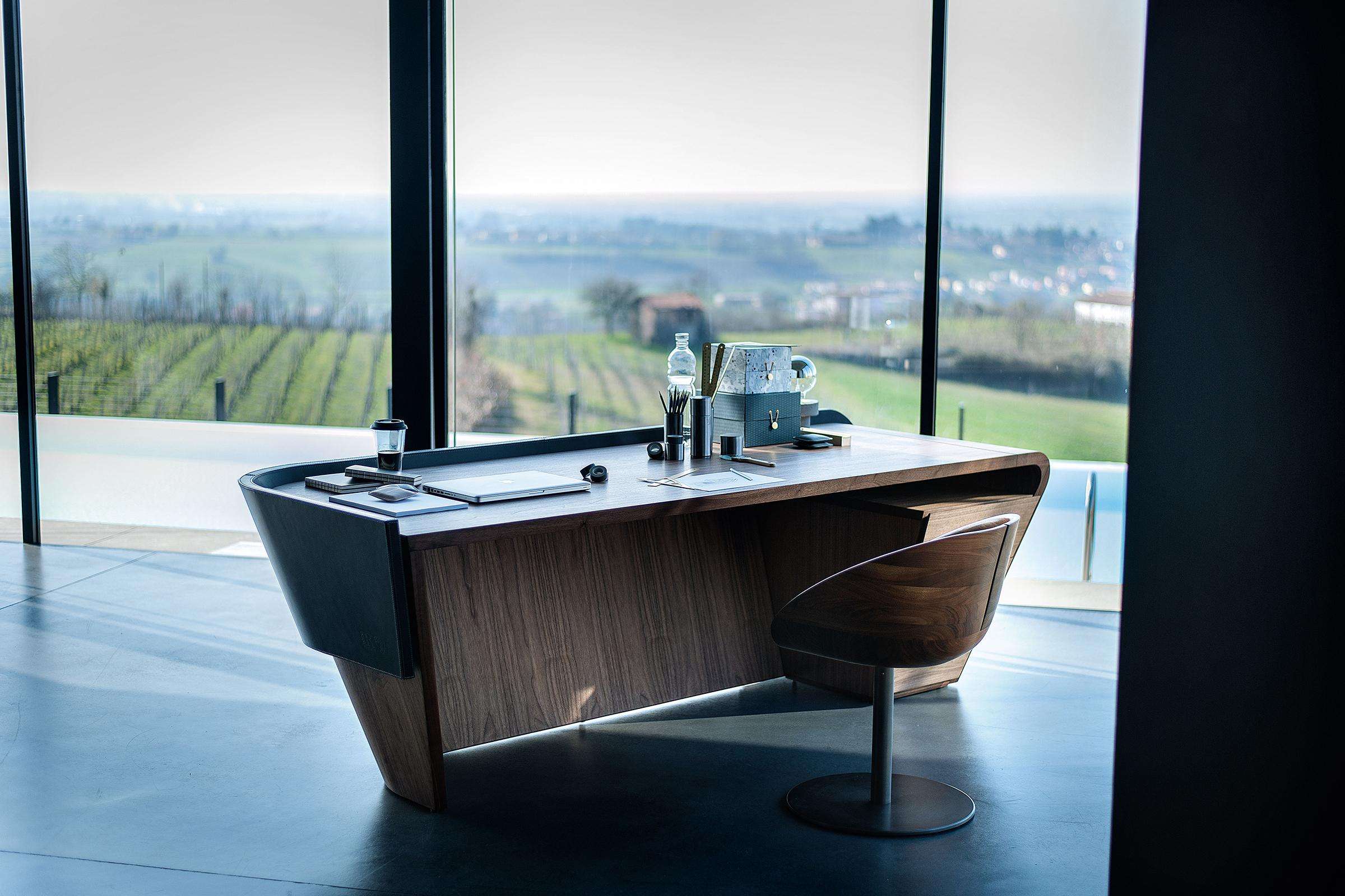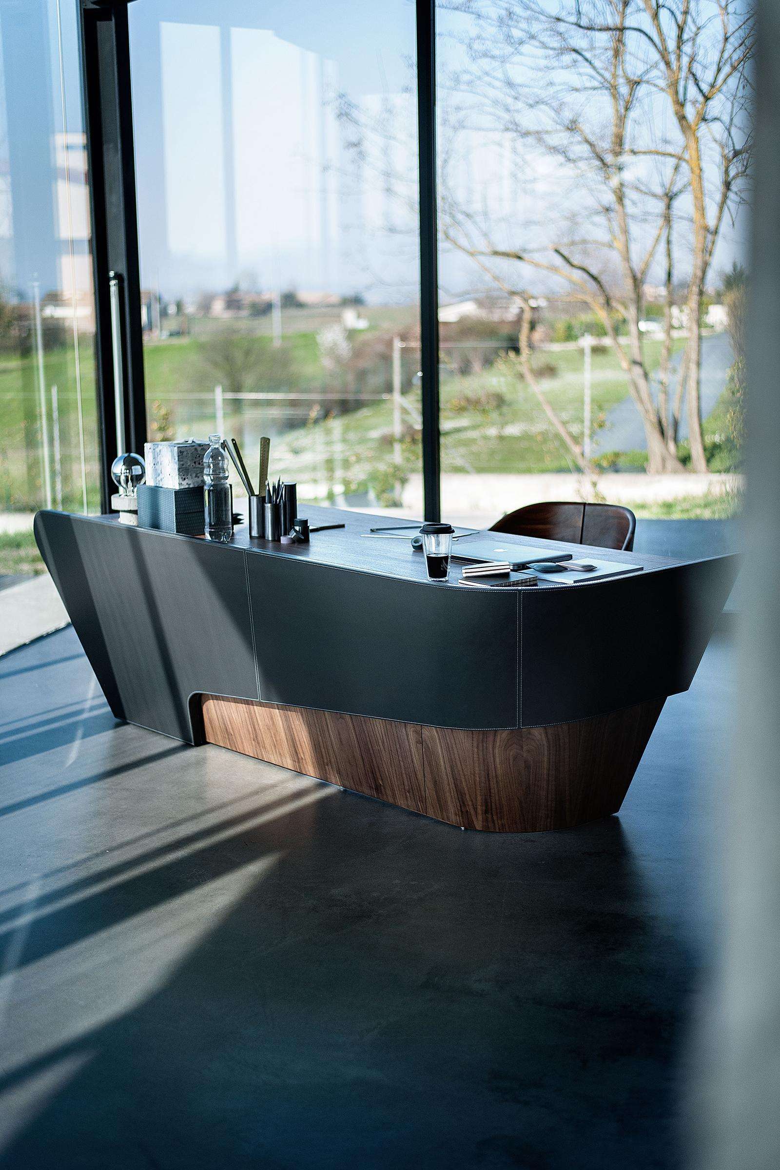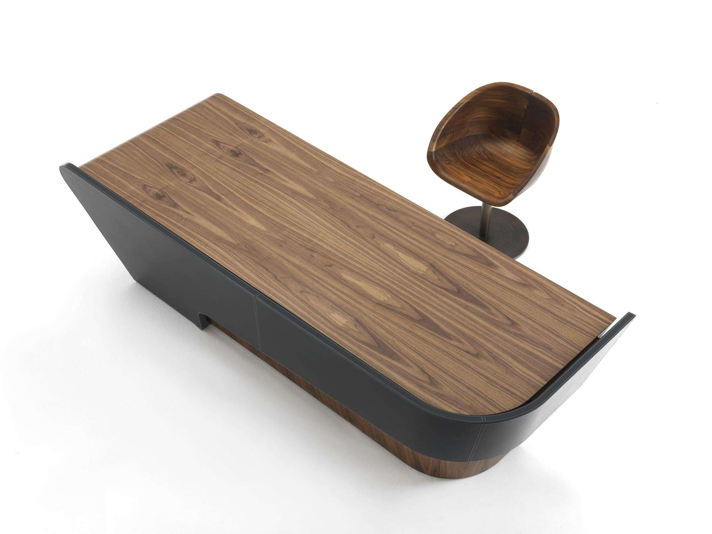 The Klip Wood & Leather Writing Desk by Karim Rashid, crafted in Italy in 2023, measures 244 cm wide, 91.2 cm deep, and 78 cm high, embodying a modern design with smooth, flowing lines. This desk features a curved veneered multilayer top and a front panel, optionally covered in leather, equipped with a practical chest of three dovetail-jointed drawers with lateral grooves for opening. Ideal for a workspace or study, it blends functionality with sleek artistry.