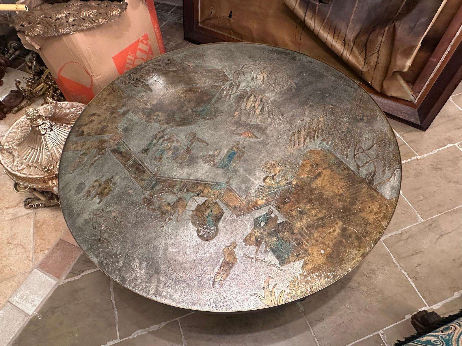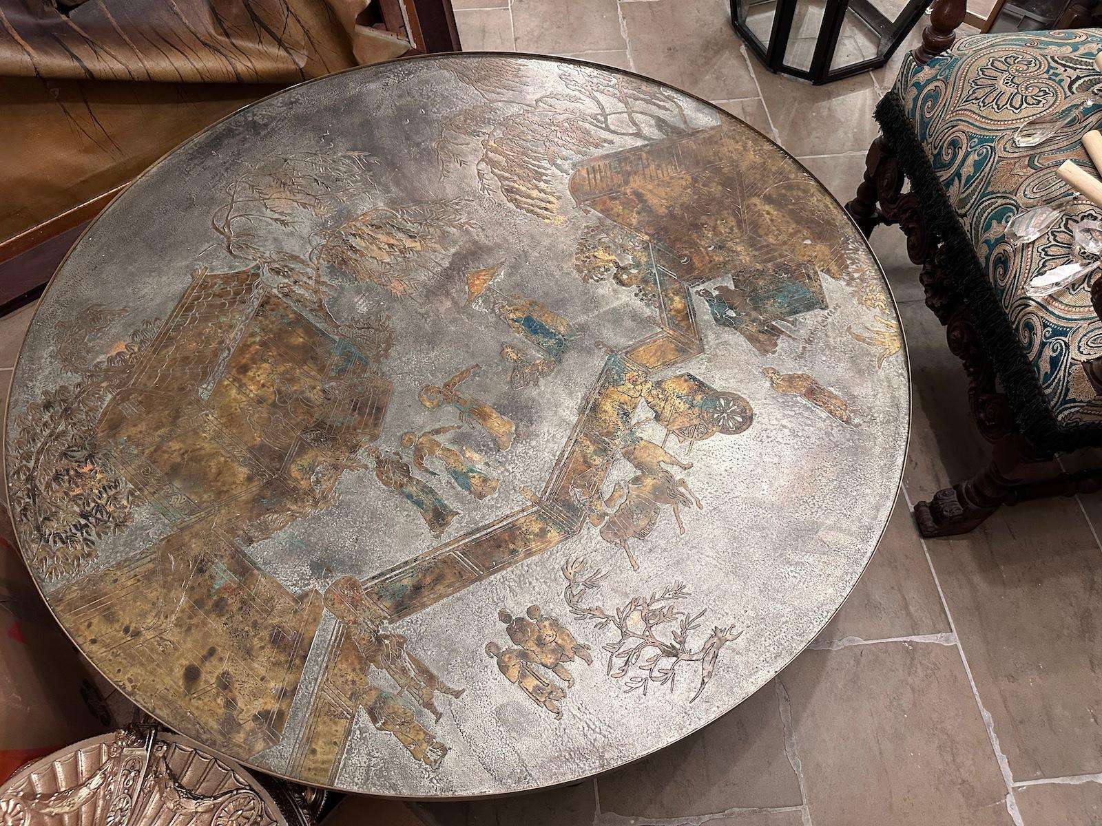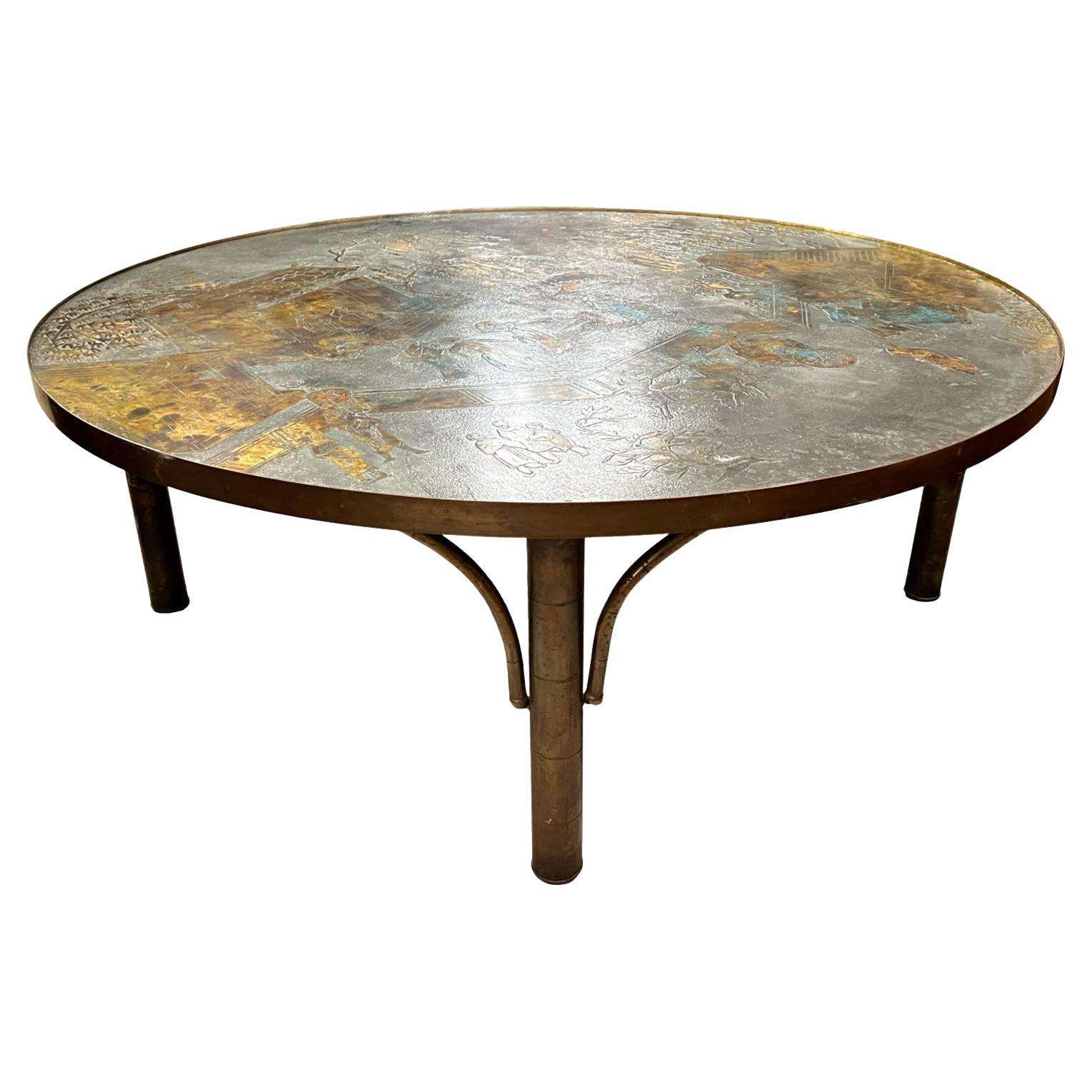 The Large Round Coffee Table by Philip and Kelvin LaVerne, crafted in the USA circa 1960s, measures 43.82 cm high with a 120.02 cm diameter, embodying American mid-century design with exceptional artistry. Featuring a unique blend of silver and patinated bronze with etched details, this table showcases natural material beauty and original patina, enhancing its vintage charm. Perfect as a centerpiece in a living room, its circular form encourages gathering, blending functionality with striking aesthetics for modern or traditional interiors.