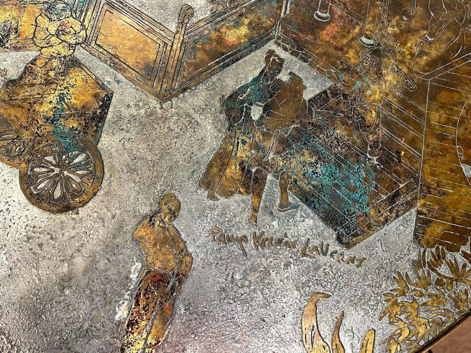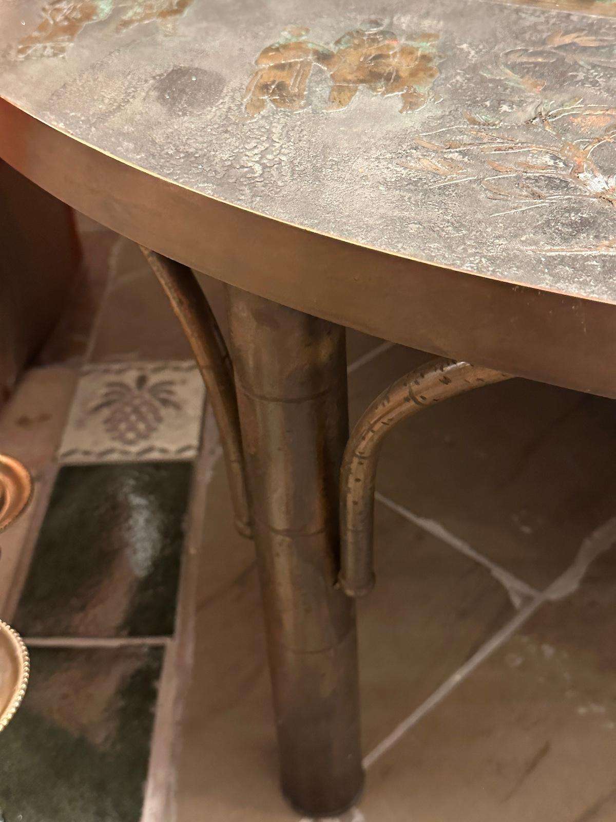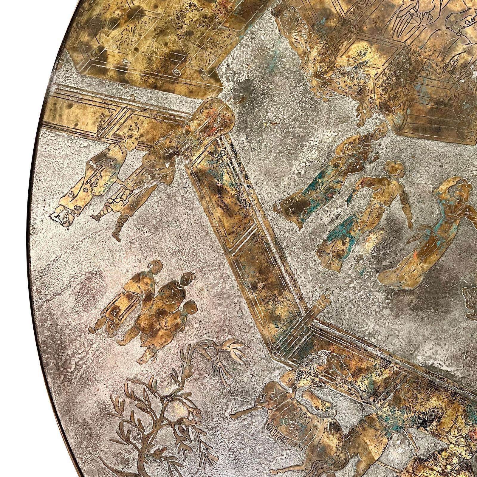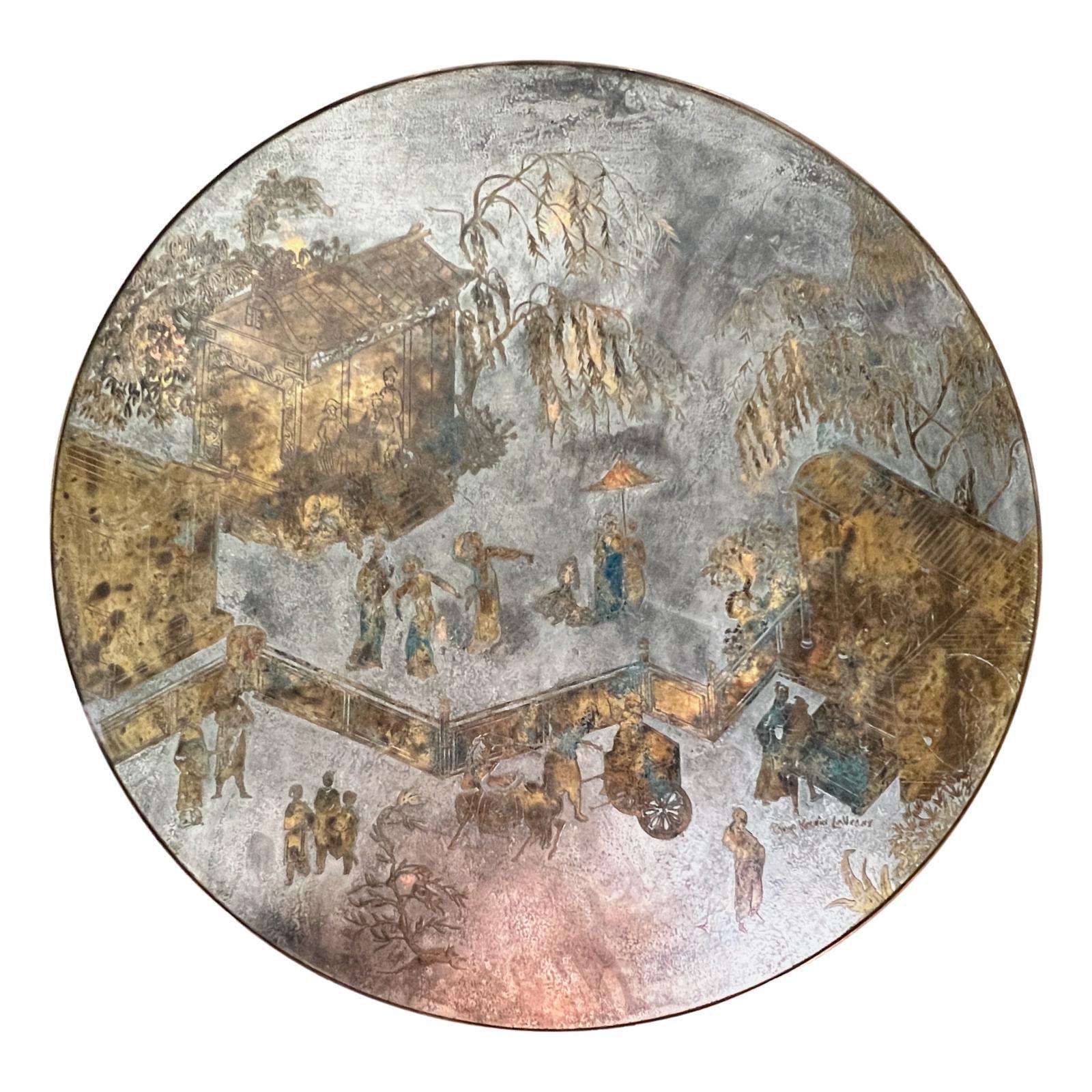 The Large Round Coffee Table by Philip and Kelvin LaVerne, crafted in the USA circa 1960s, measures 43.82 cm high with a 120.02 cm diameter, embodying American mid-century design with exceptional artistry. Featuring a unique blend of silver and patinated bronze with etched details, this table showcases natural material beauty and original patina, enhancing its vintage charm. Perfect as a centerpiece in a living room, its circular form encourages gathering, blending functionality with striking aesthetics for modern or traditional interiors.