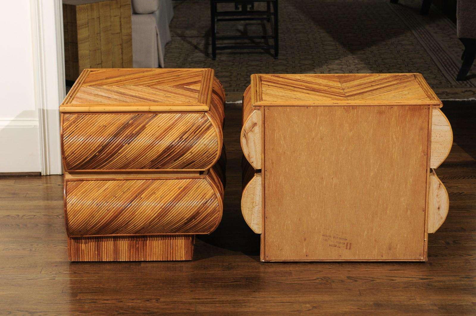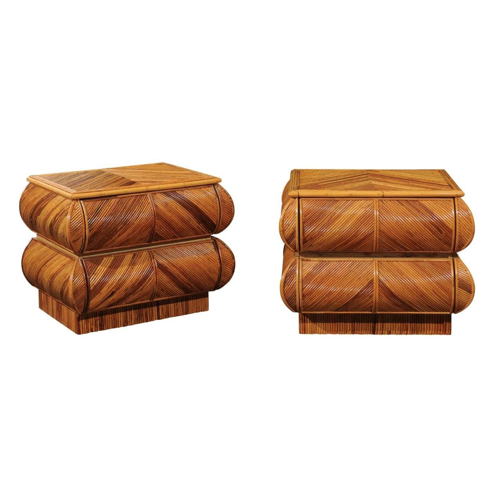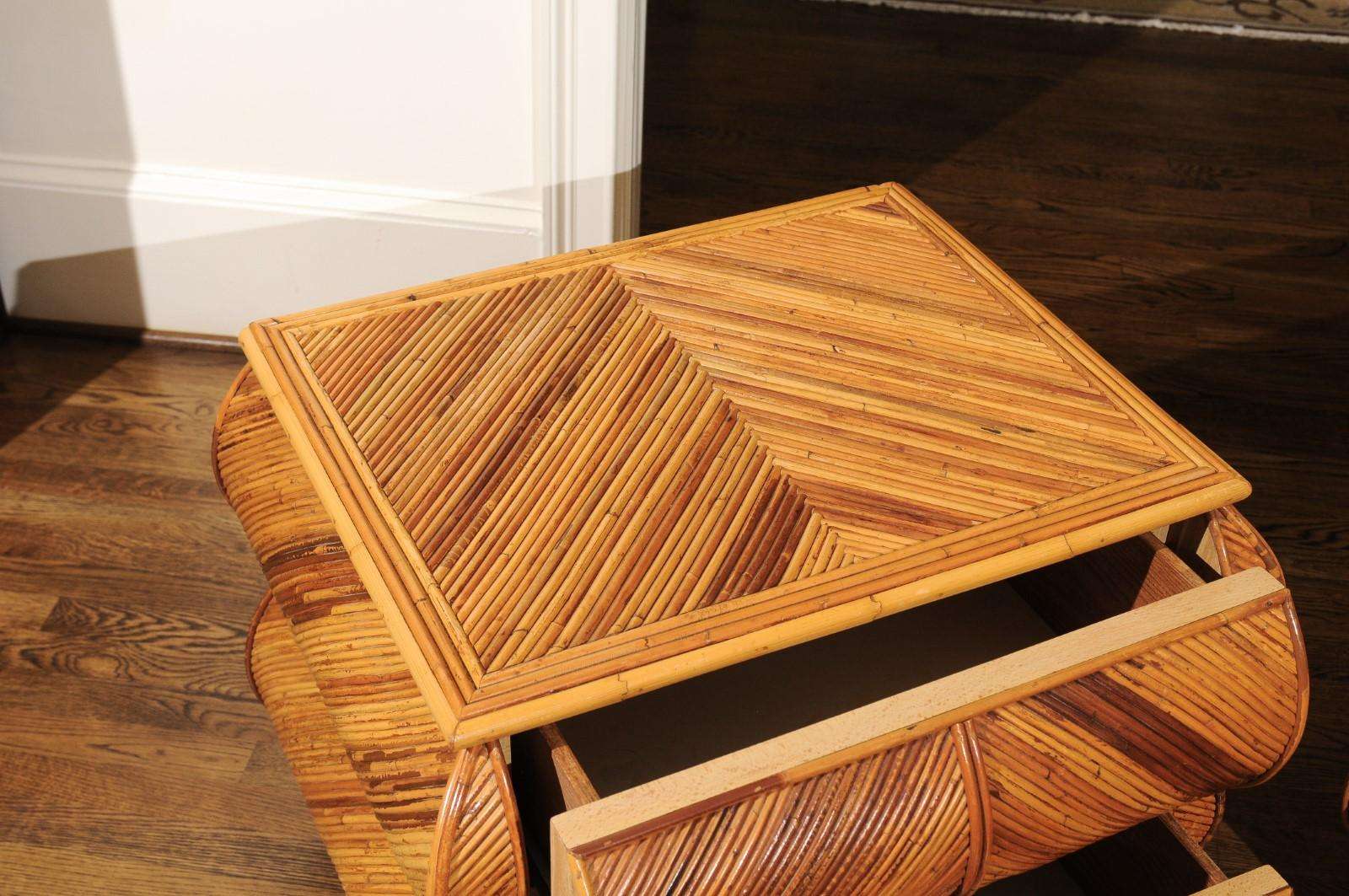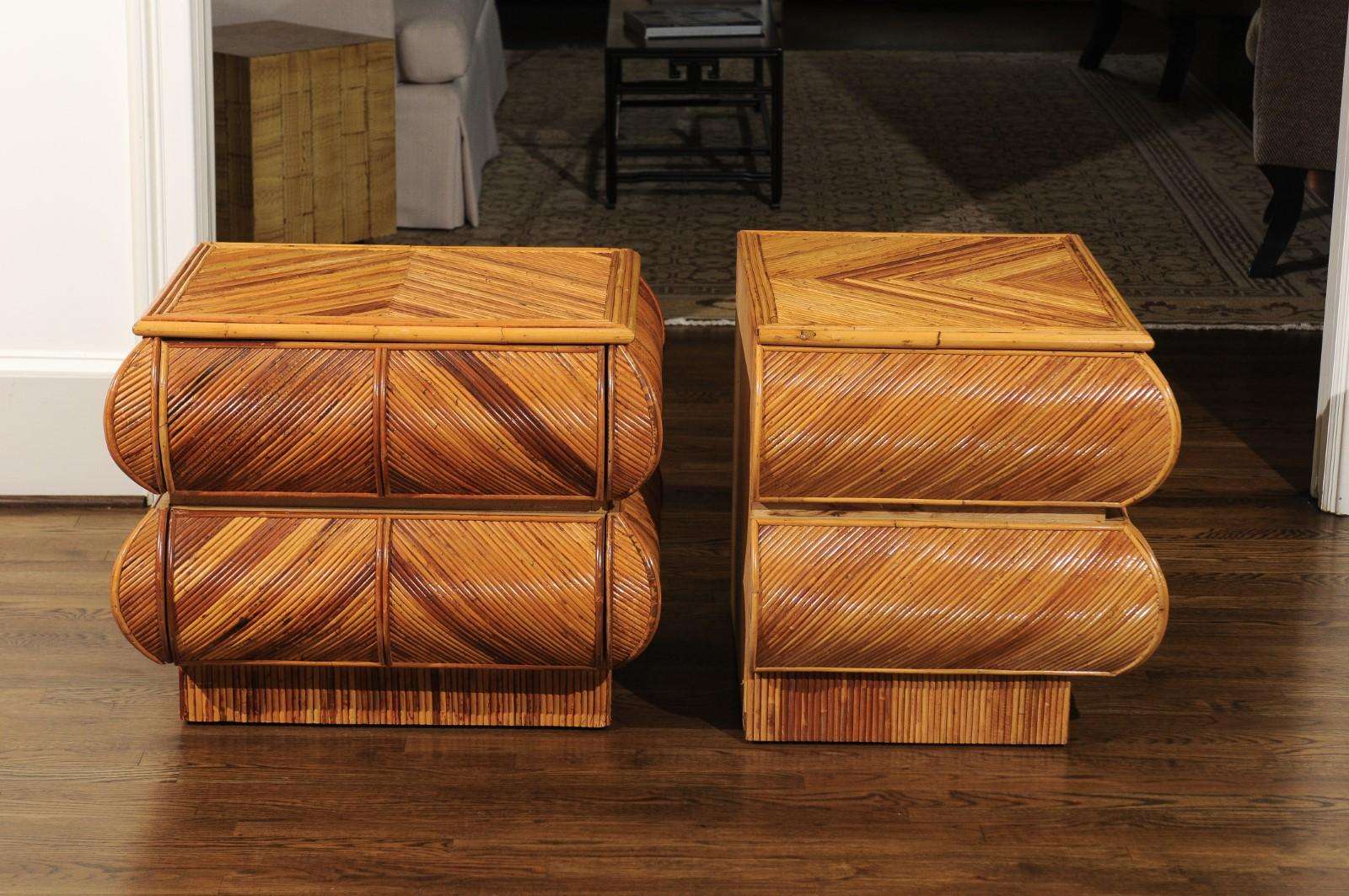 The Magnificent Pair of Bullnose Small Chests, custom-commissioned circa 1980, measures 69.85 cm wide, 53.34 cm deep, and 57.15 cm high each, with tops at 19.5 inches wide by 25 inches deep, embodying an organic modern design. Sold as a set of two, these chests feature stout hardwood construction veneered in diagonally applied reed bamboo, with exquisite bullnose detailing on drawer fronts and case sides, showcasing exceptional craftsmanship. The radiant texture and warmth of the bamboo, paired with a professionally re-lacquered finish, highlight a wonderful range of color and patina, making them ideal as nightstands or accent pieces in a bedroom or living space.