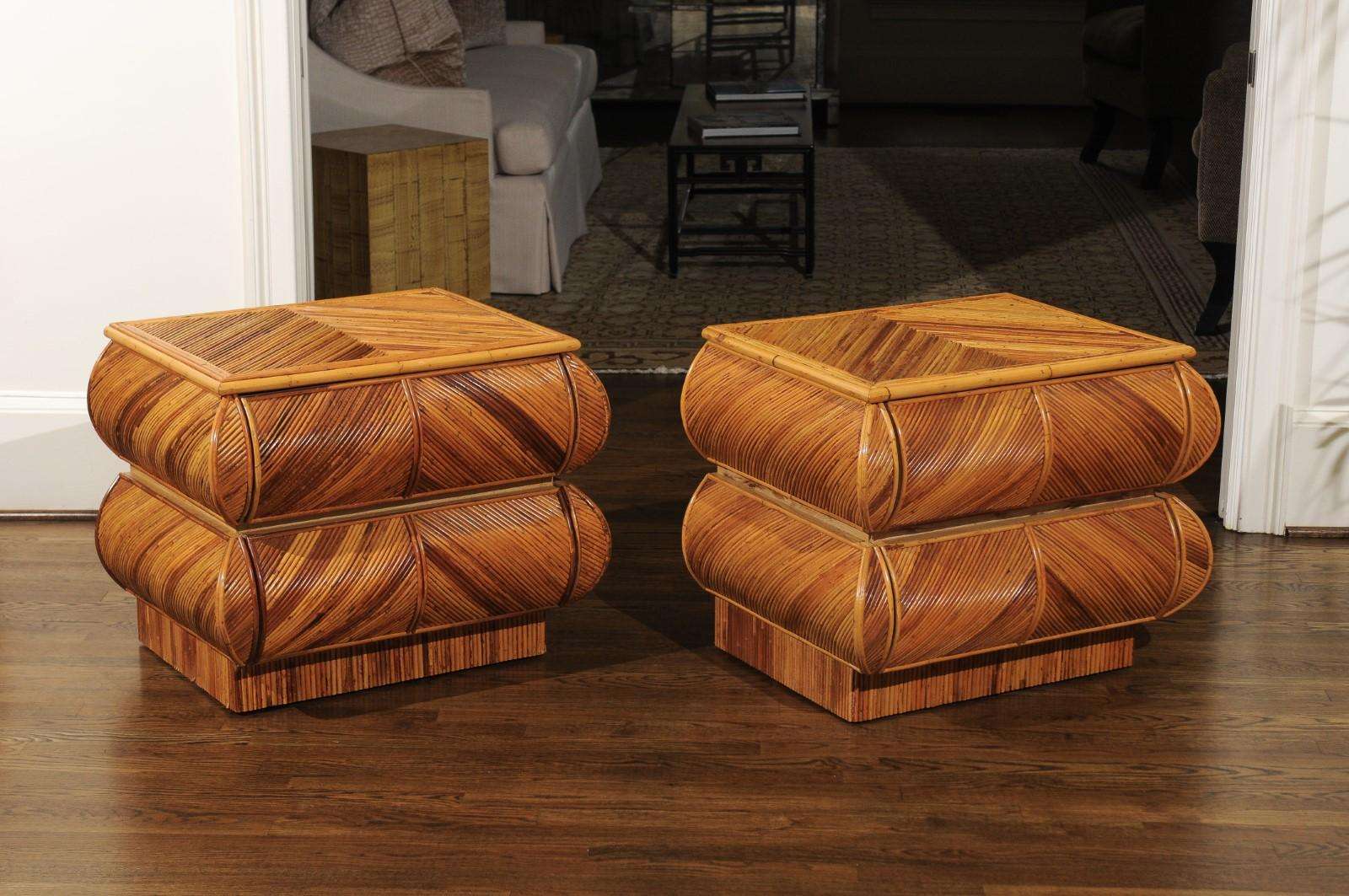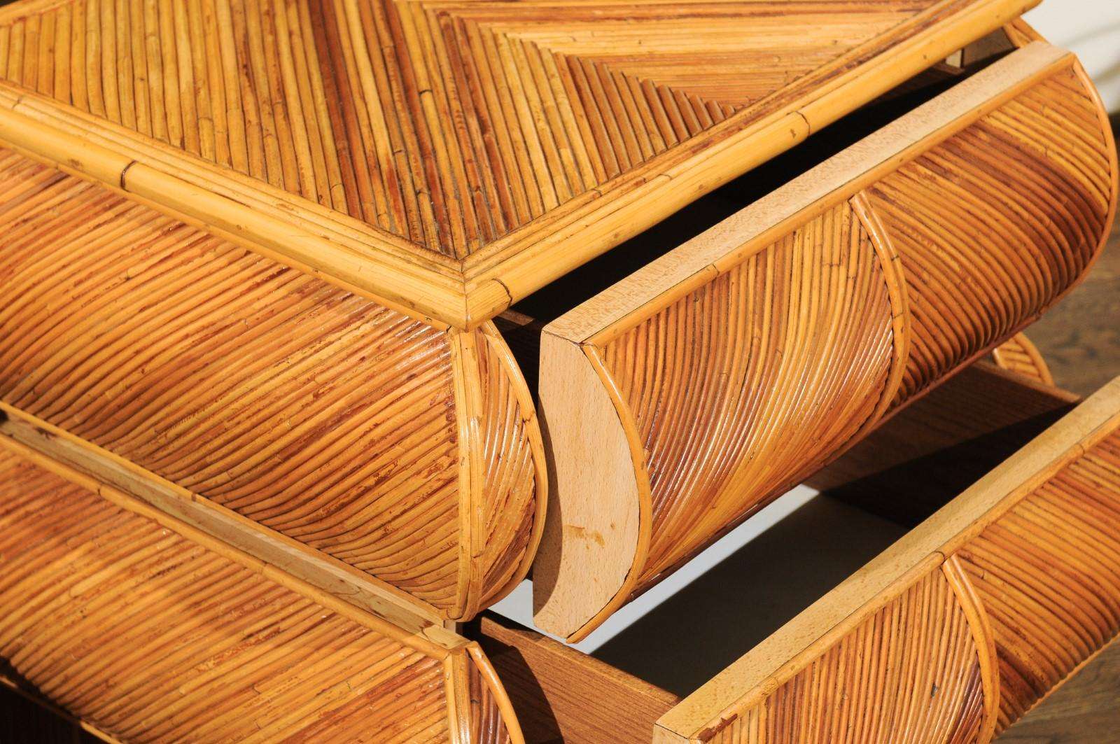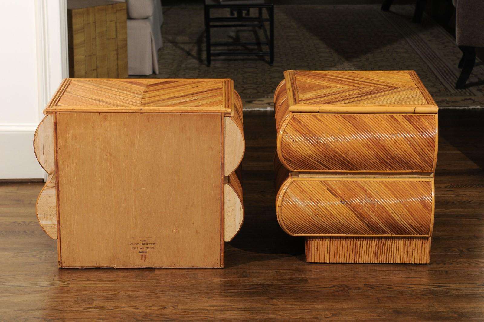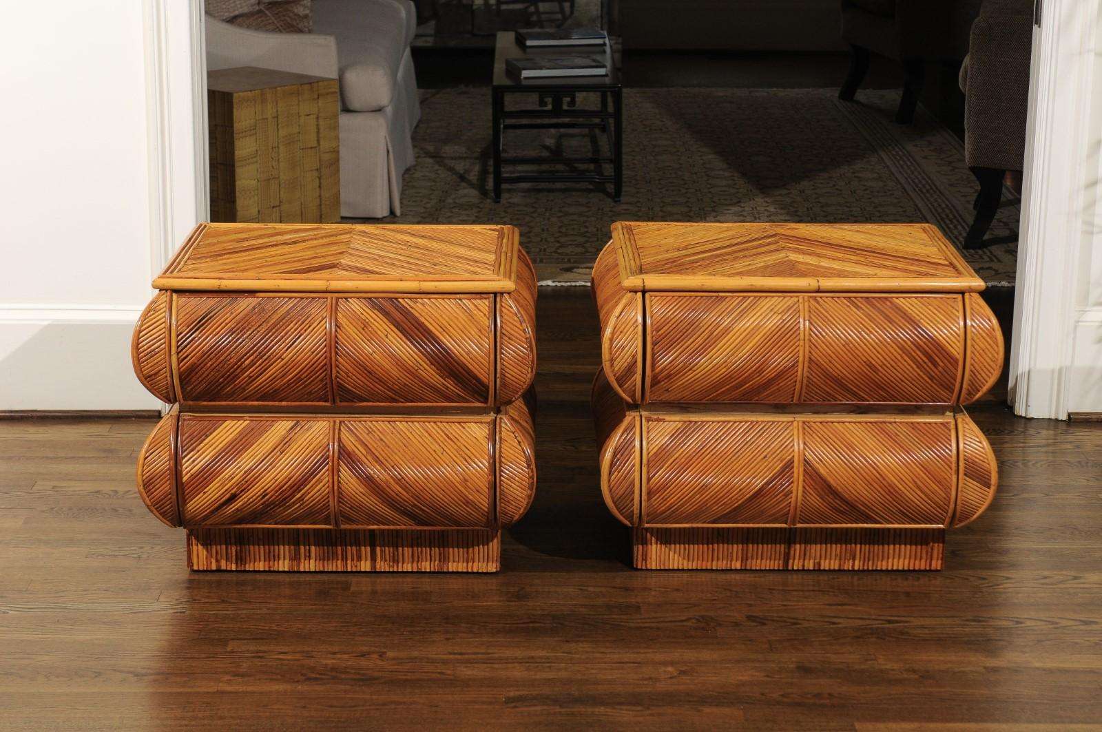 The Magnificent Pair of Bullnose Small Chests, custom-commissioned circa 1980, measures 69.85 cm wide, 53.34 cm deep, and 57.15 cm high each, with tops at 19.5 inches wide by 25 inches deep, embodying an organic modern design. Sold as a set of two, these chests feature stout hardwood construction veneered in diagonally applied reed bamboo, with exquisite bullnose detailing on drawer fronts and case sides, showcasing exceptional craftsmanship. The radiant texture and warmth of the bamboo, paired with a professionally re-lacquered finish, highlight a wonderful range of color and patina, making them ideal as nightstands or accent pieces in a bedroom or living space.