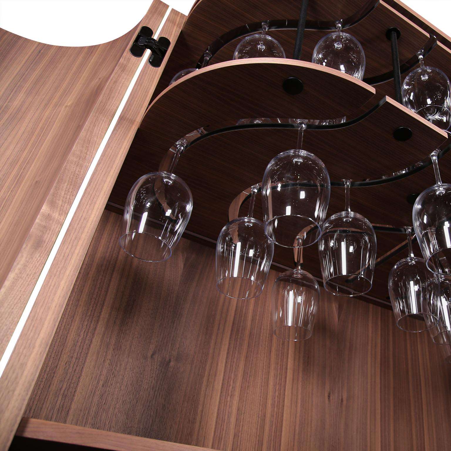 Built-in LED lighting casts a warm glow, enhancing the ambiance and highlighting your prized items, making this cabinet a true masterpiece. Handcrafted by skilled artisans, every detail reflects unparalleled craftsmanship, from the innovative storage solutions to the sumptuous materials. In pristine condition, this bar cabinet elevates any modern interior, offering a harmonious blend of artistry and practicality for an exceptional entertaining experience.