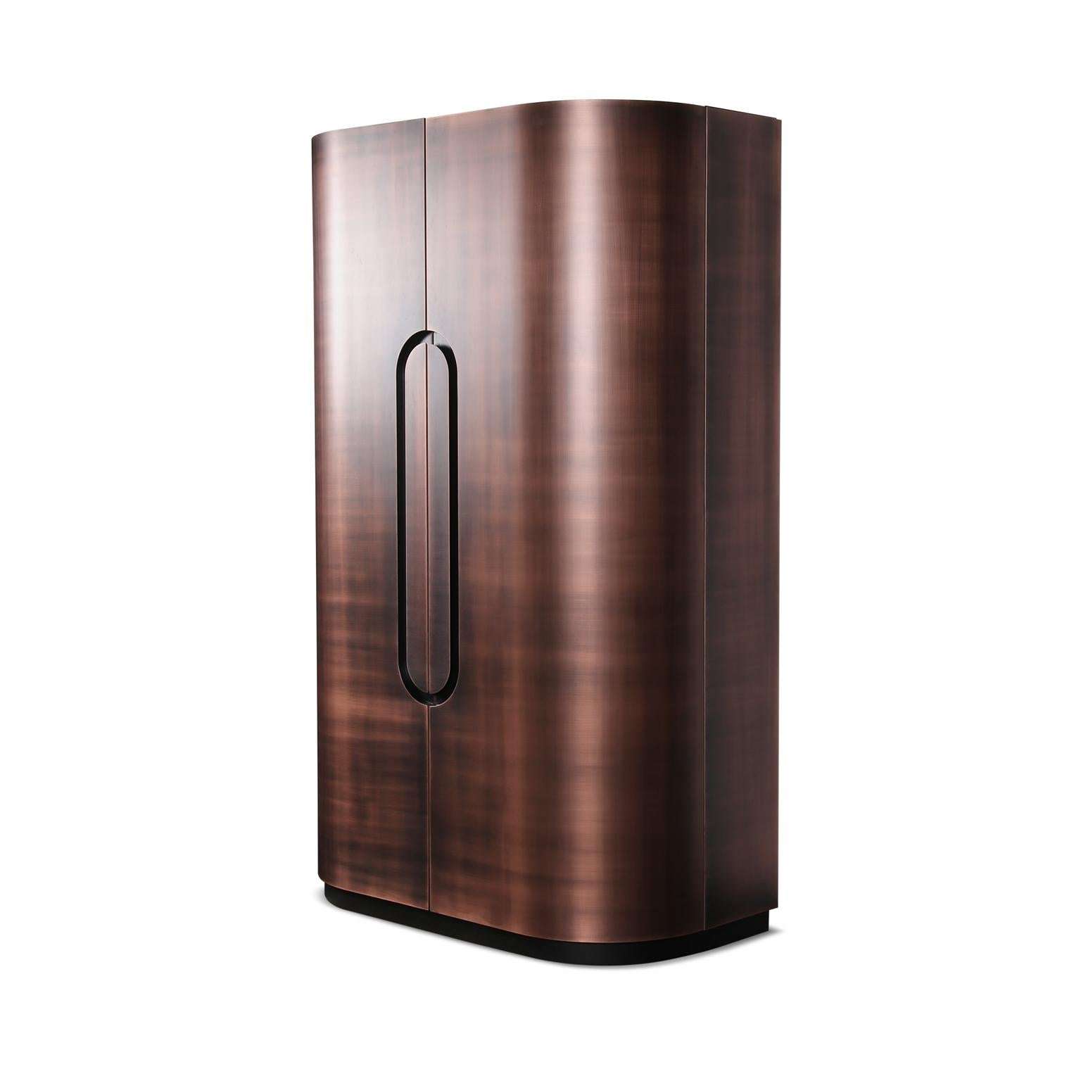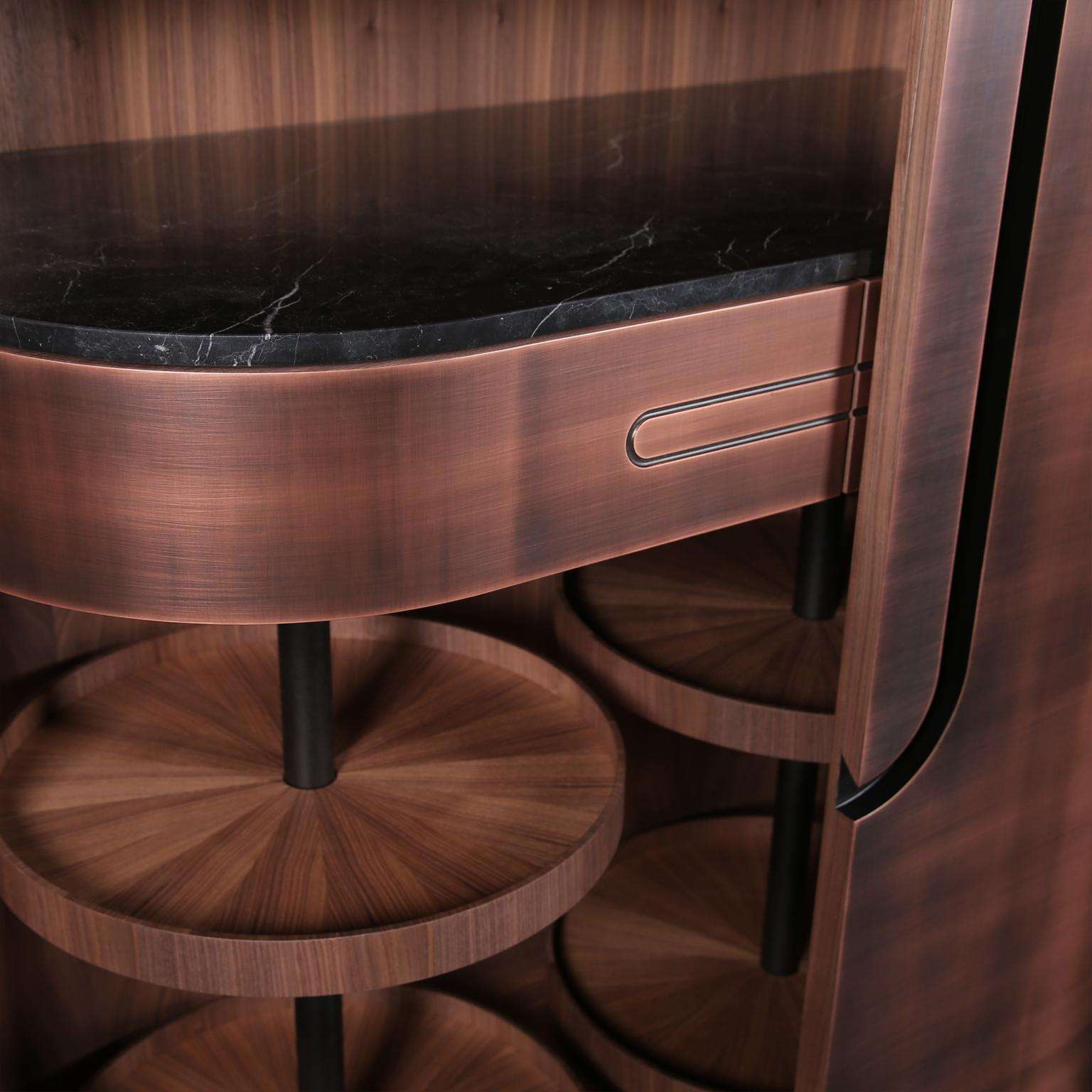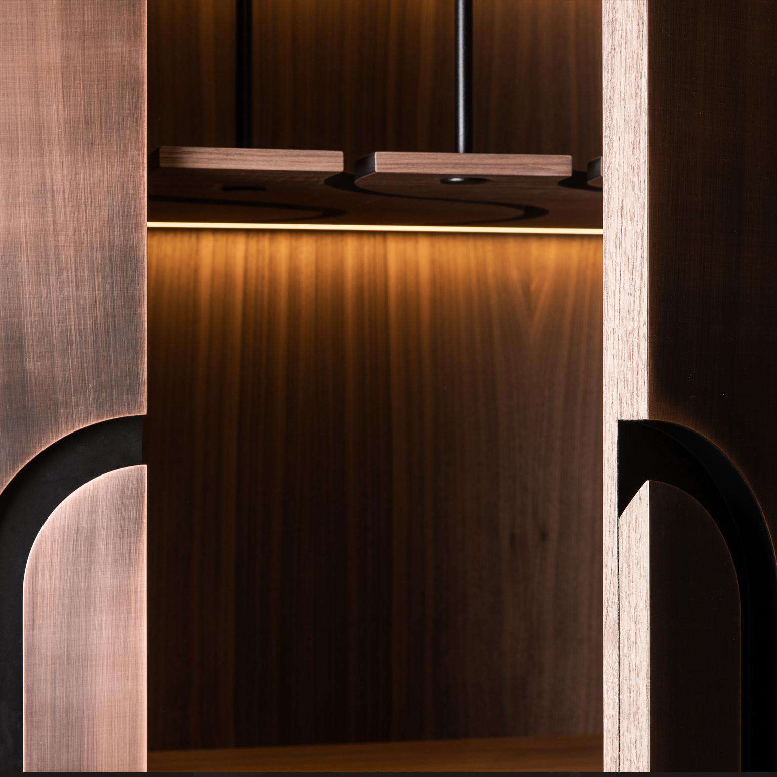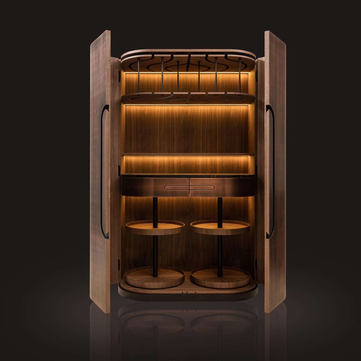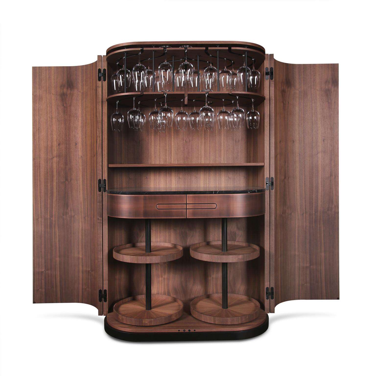 The Modern Home Wine Bar Cabinet by Renats Kotlevs, crafted in Europe in 2024, measures 120 cm wide, 60 cm deep, and 195 cm high, embodying a luxurious blend of sophistication and functionality. The exterior features a darkened bronze metal finish, accented with brass and copper details, creating an opulent aura, while the interior is lined with rich walnut veneer for warmth and elegance. A dark marble worktop offers a durable, stylish surface for mixology, complemented by two velvet-lined drawers for discreet storage, two round bottle carousels for showcasing spirits, and unique glass hanging holders that add avant-garde artistry to your collection.