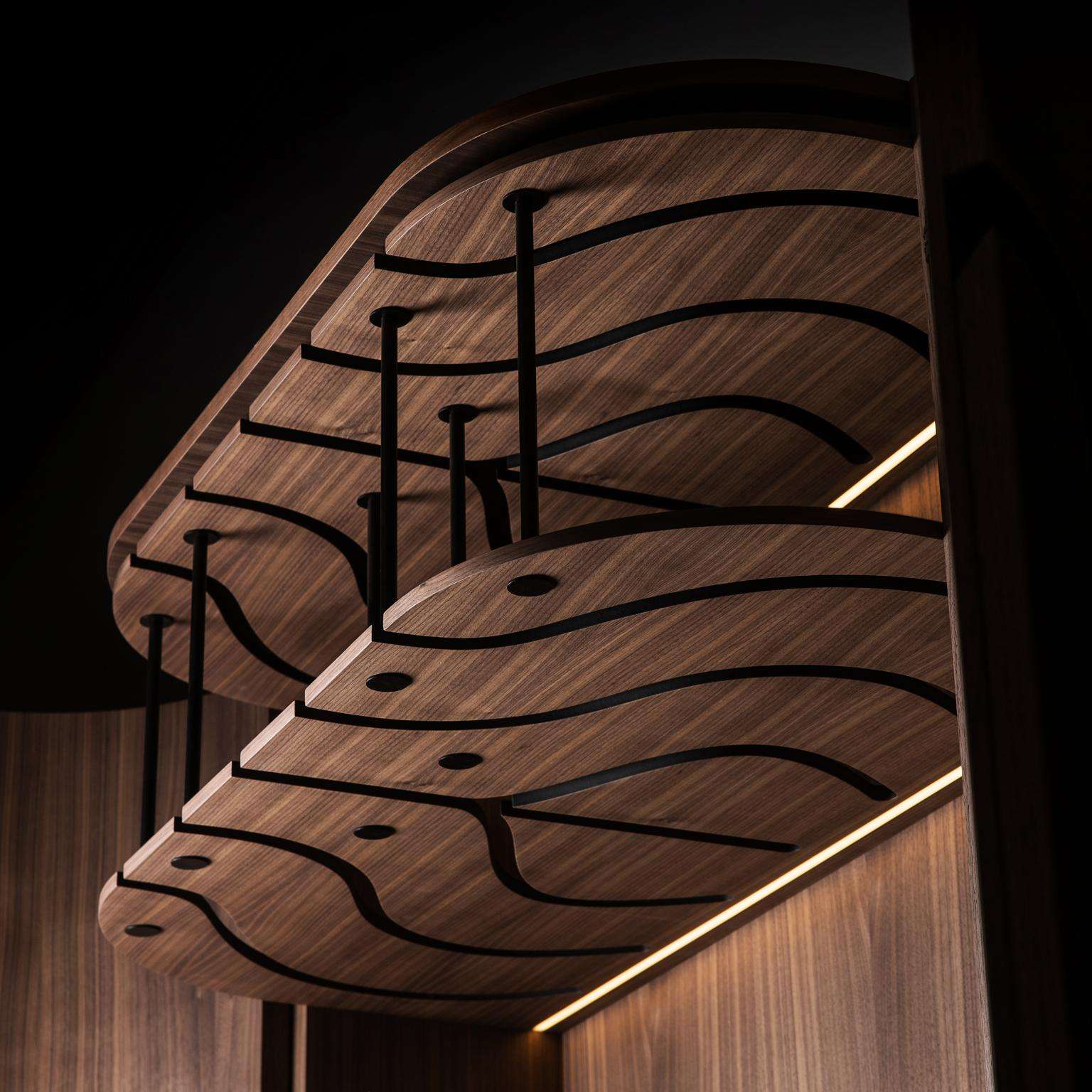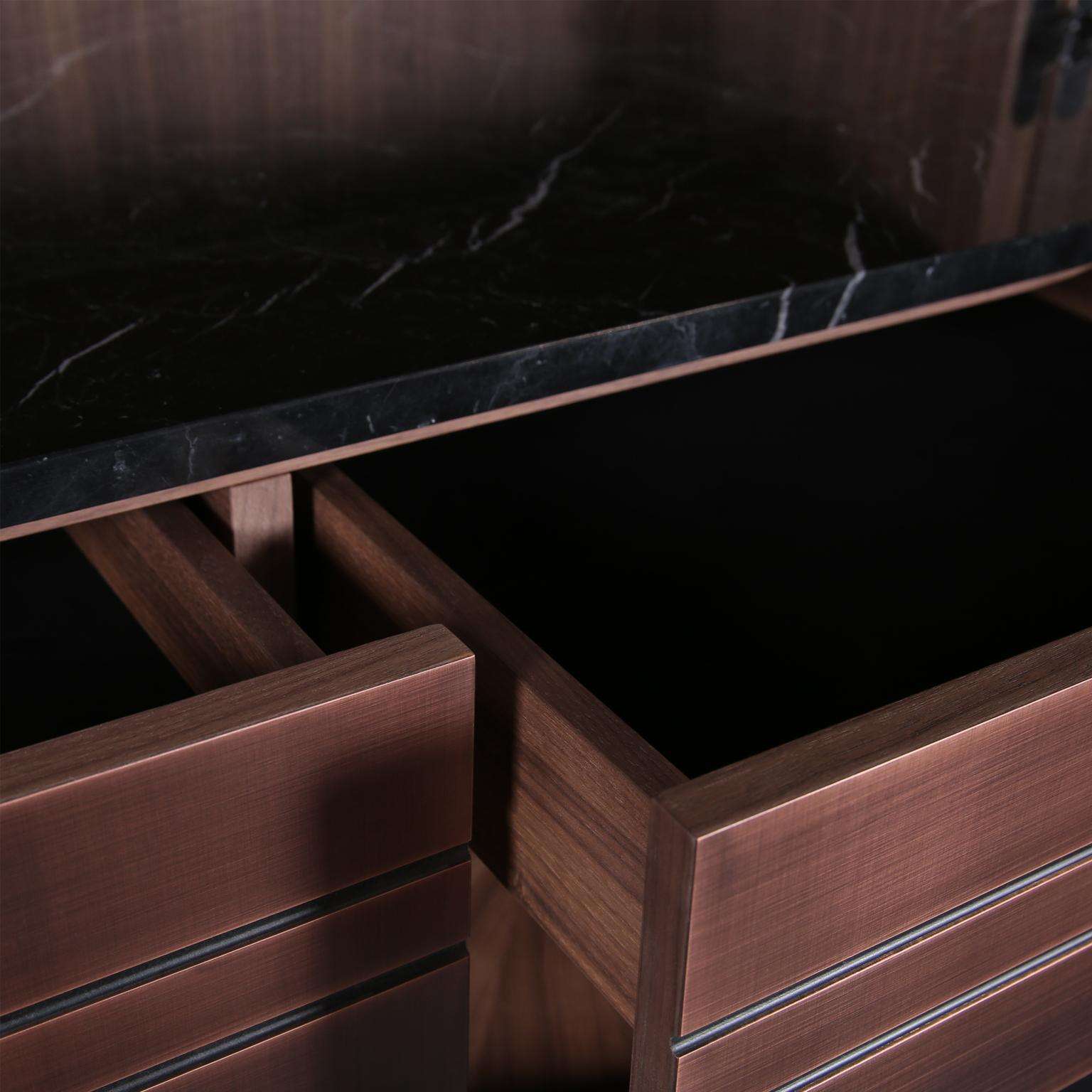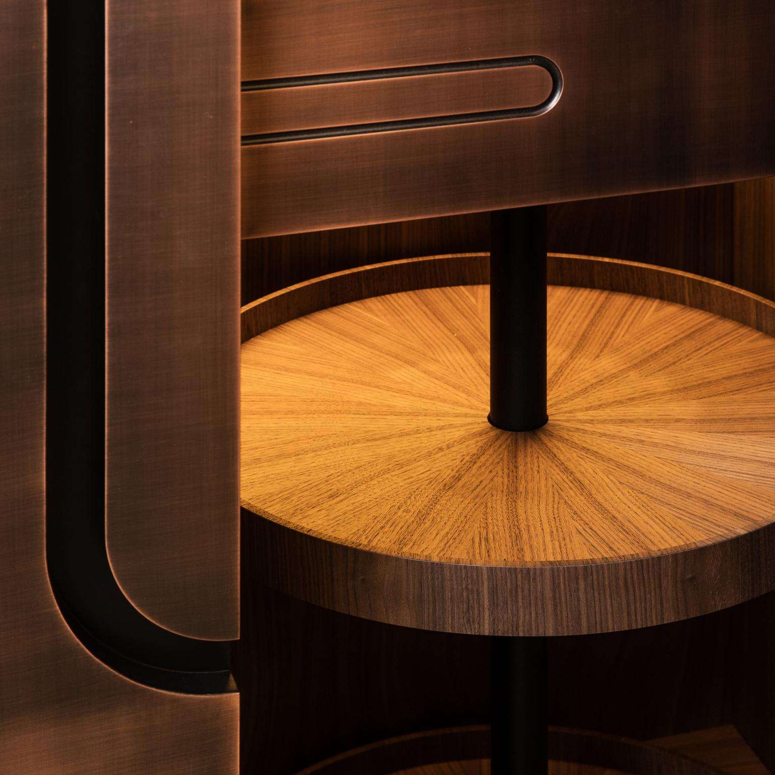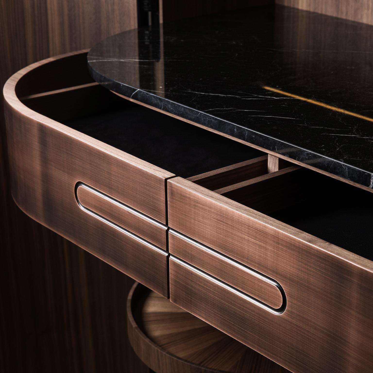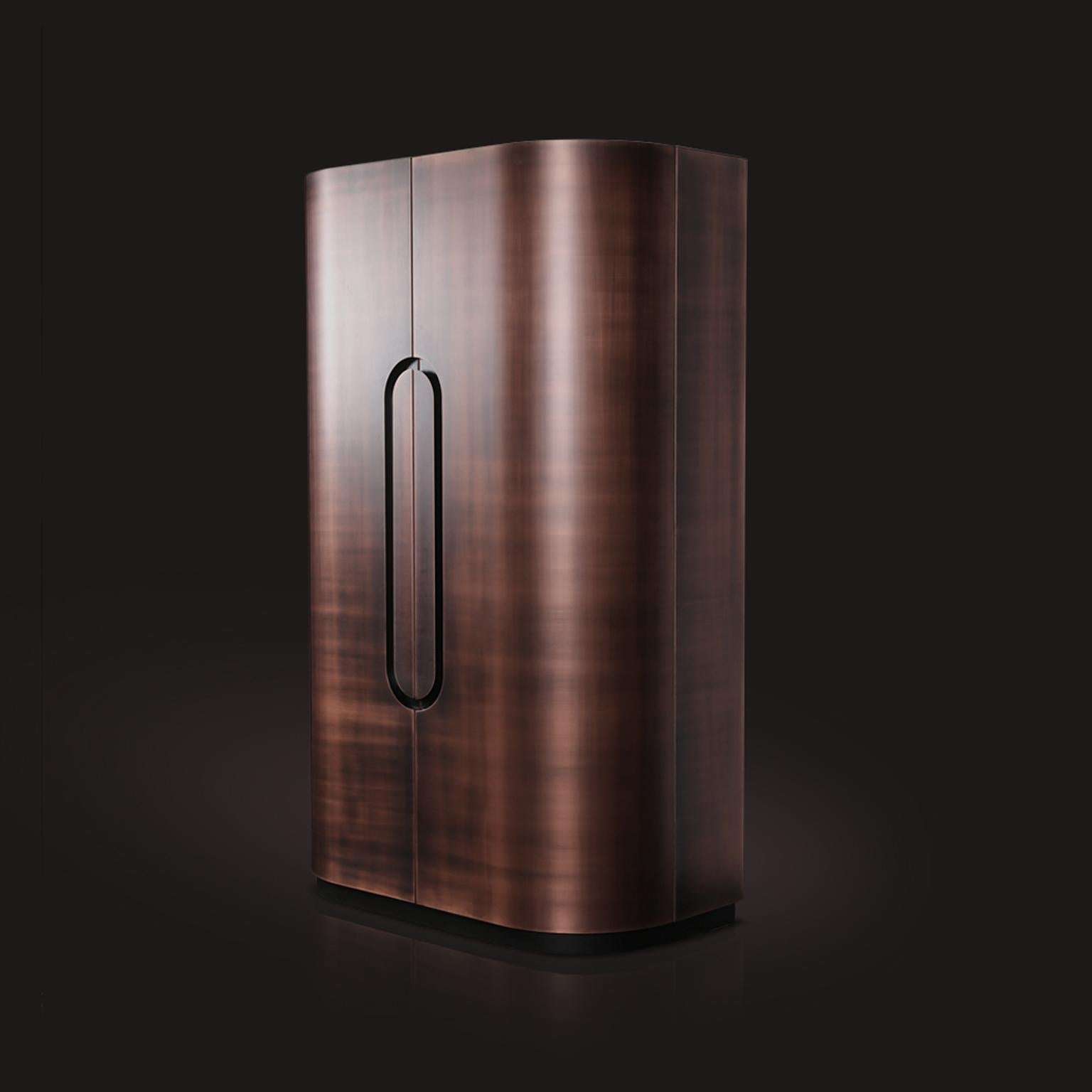 The Modern Home Wine Bar Cabinet by Renats Kotlevs, crafted in Europe in 2024, measures 120 cm wide, 60 cm deep, and 195 cm high, embodying a luxurious blend of sophistication and functionality. The exterior features a darkened bronze metal finish, accented with brass and copper details, creating an opulent aura, while the interior is lined with rich walnut veneer for warmth and elegance. A dark marble worktop offers a durable, stylish surface for mixology, complemented by two velvet-lined drawers for discreet storage, two round bottle carousels for showcasing spirits, and unique glass hanging holders that add avant-garde artistry to your collection.