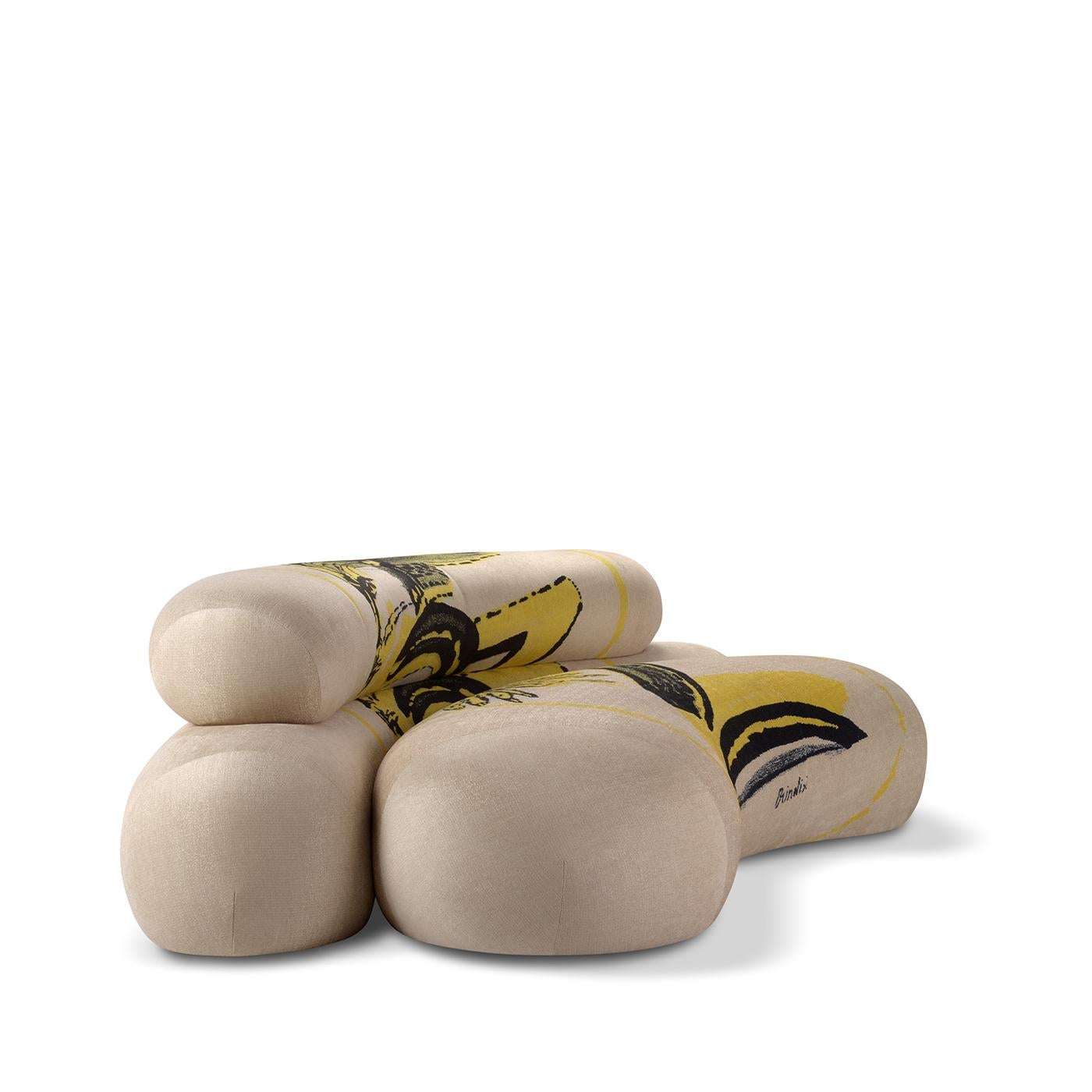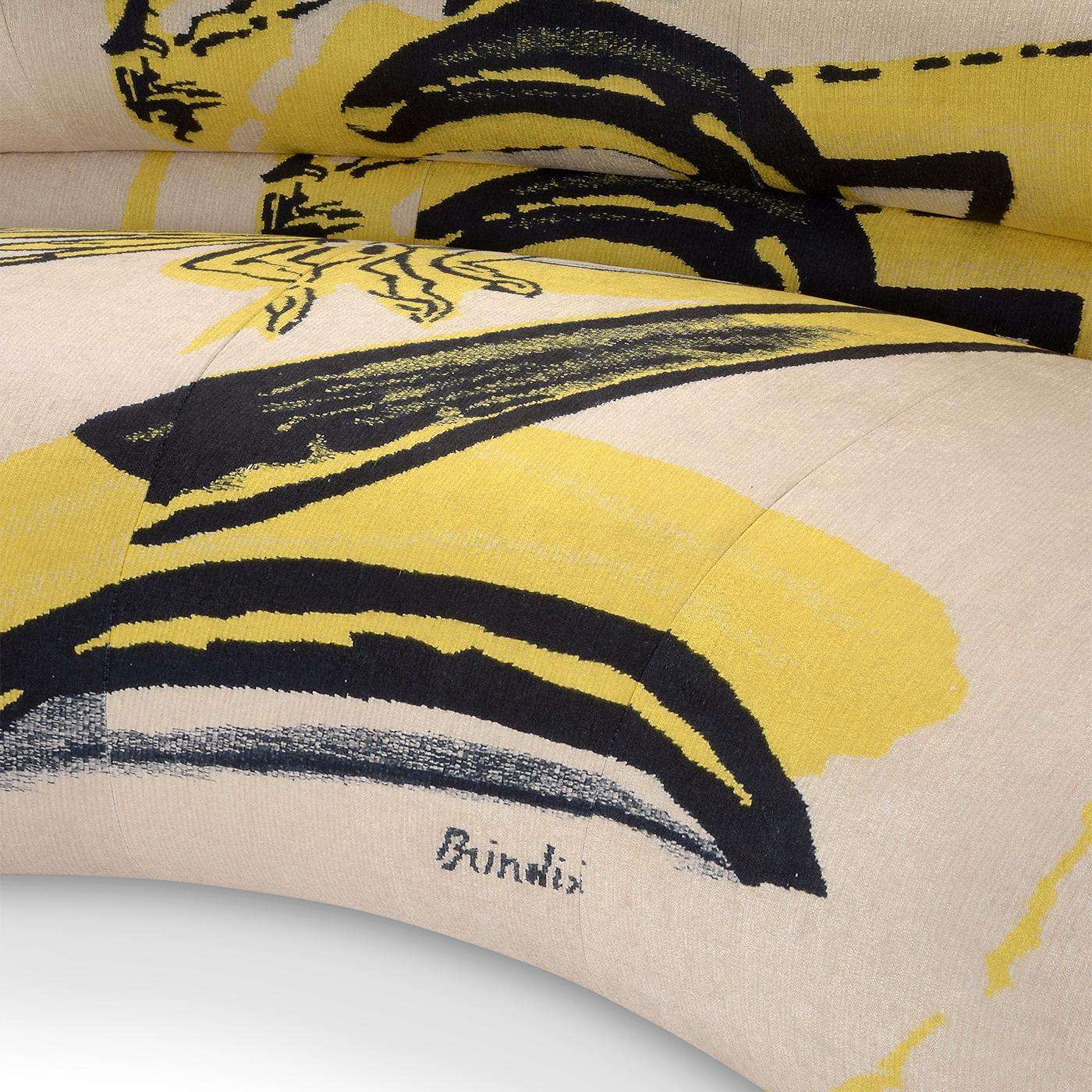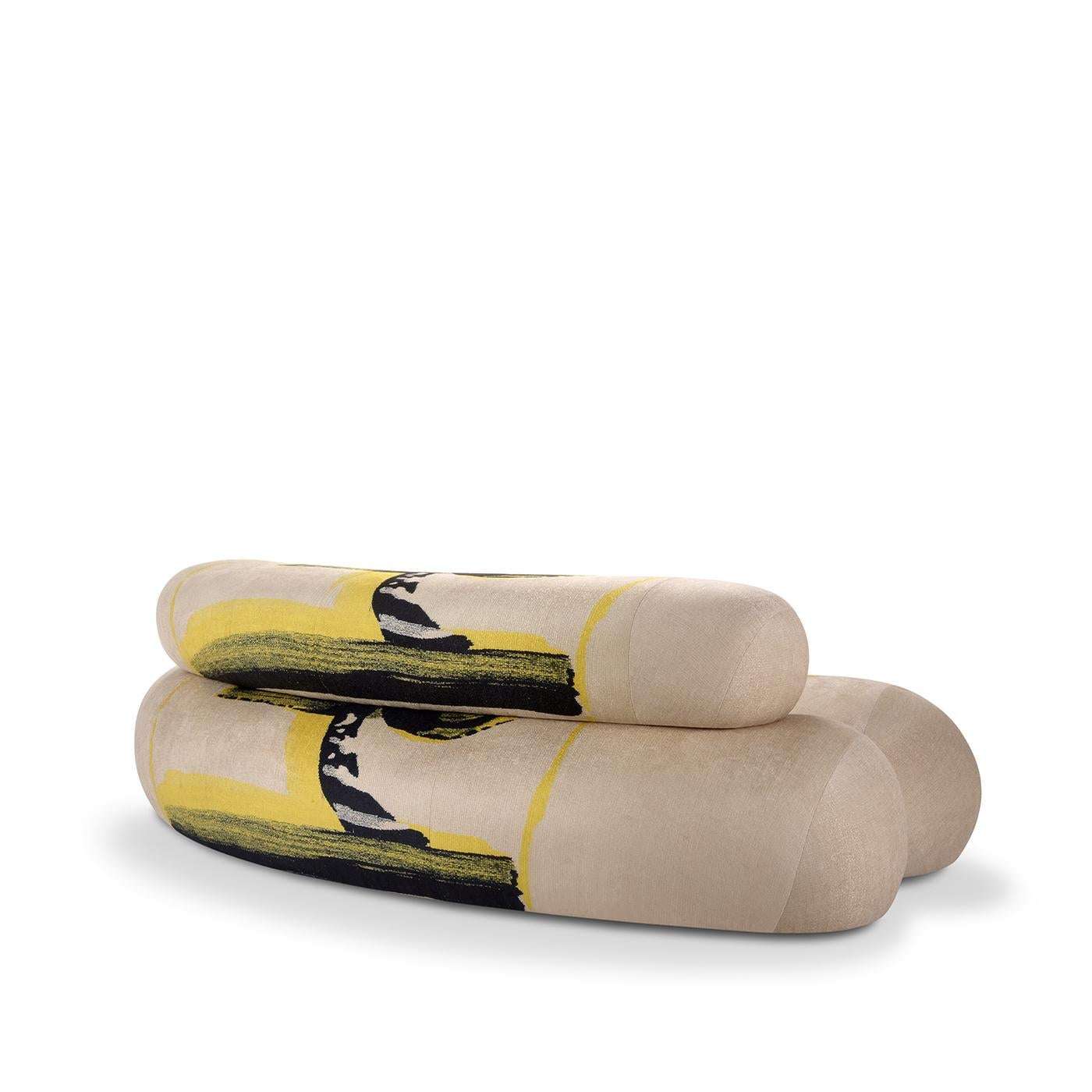 The Nefelibata Unique Piece Sofa by Stormo Studio, created exclusively for Edit Napoli 2024, measures 230 cm wide, 130 cm deep, and 64 cm high, offering a striking blend of artistry and modern design. This one-of-a-kind sofa is upholstered with a distinctive tapestry by master Remo Brindisi, showcasing unique signs and colors that transform it into a true work of art, perfect for adding a touch of individuality to any contemporary living space.