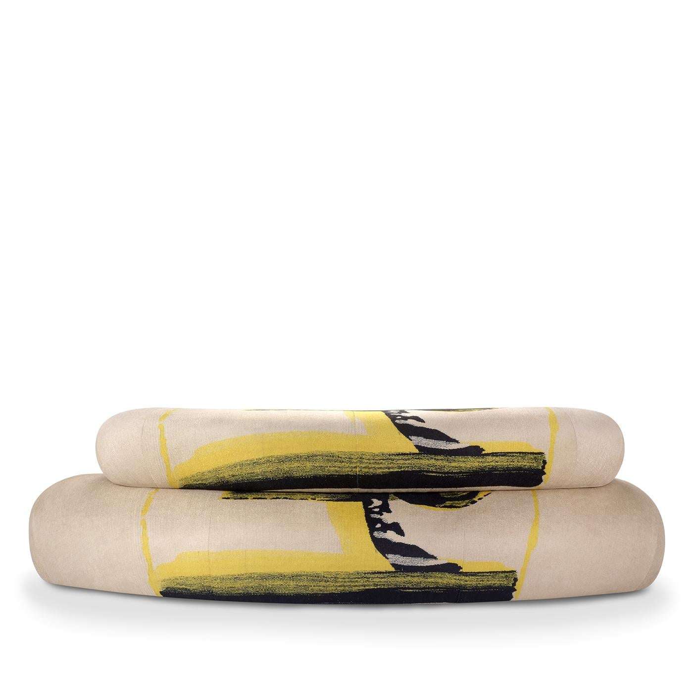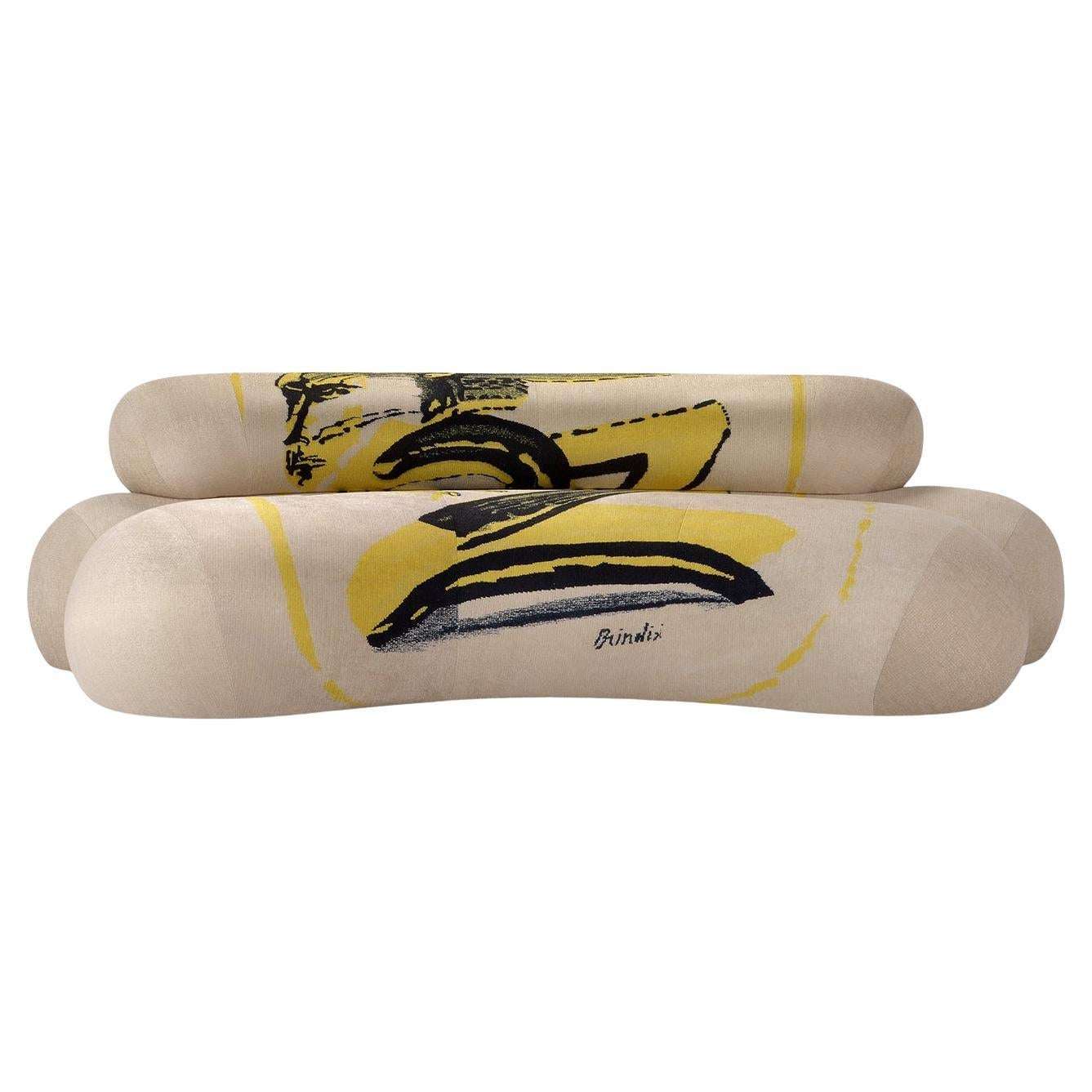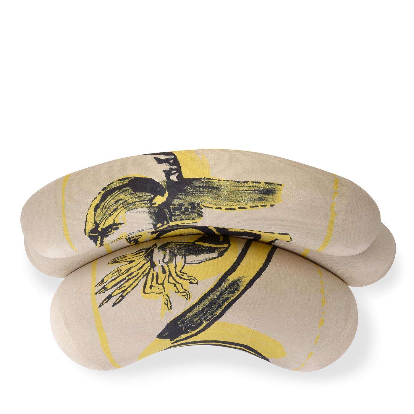 The Nefelibata Unique Piece Sofa by Stormo Studio, created exclusively for Edit Napoli 2024, measures 230 cm wide, 130 cm deep, and 64 cm high, offering a striking blend of artistry and modern design. This one-of-a-kind sofa is upholstered with a distinctive tapestry by master Remo Brindisi, showcasing unique signs and colors that transform it into a true work of art, perfect for adding a touch of individuality to any contemporary living space.