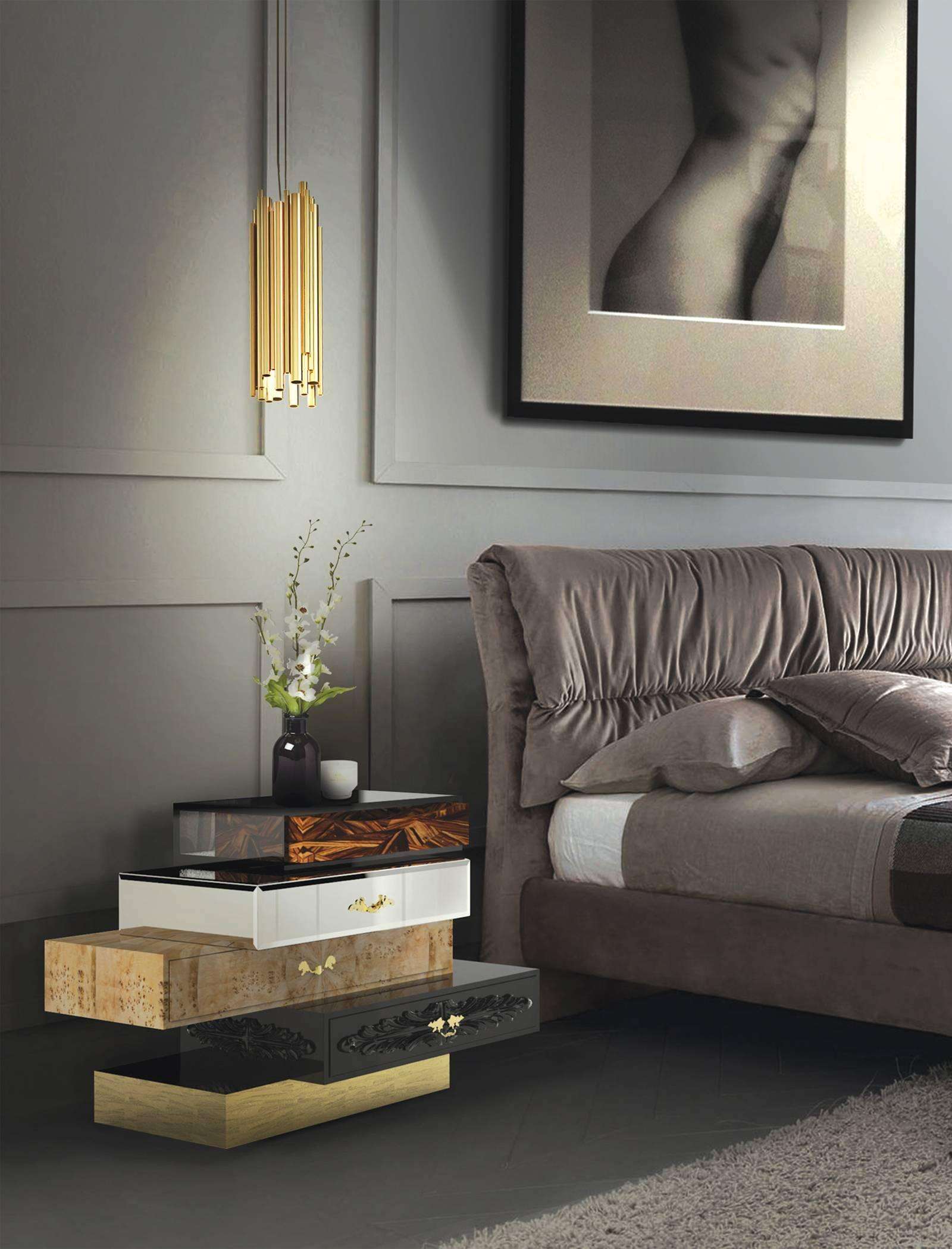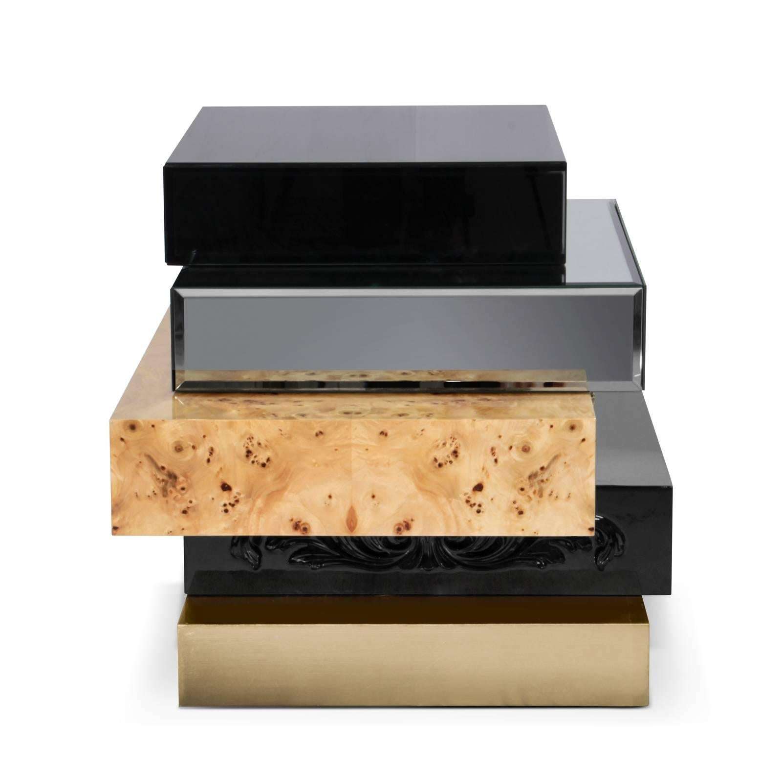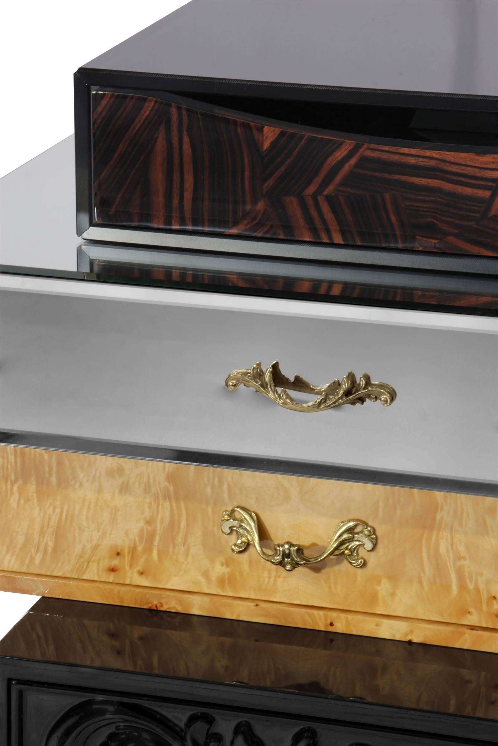 The Pair of Exceptional Drawers Nightstands, crafted in Portugal in 2025, measures 97 cm wide, 57 cm deep, and 50 cm high each, showcasing a modern design with luxurious detailing. Sold as a set of two, each nightstand features four unique drawers: the first with ebony mosaic veneer in matte varnish encased in smoked glass, the second with an antiqued beveled mirror over wood, the third with bird’s-eye maple veneer in high-gloss varnish, and the fourth with hand-carved wood coated in copper leaf with black high-gloss varnish. A gold leaf base, finished in high-gloss varnish, adds opulence, making these pieces ideal for a bedroom, blending functionality with artistic flair.