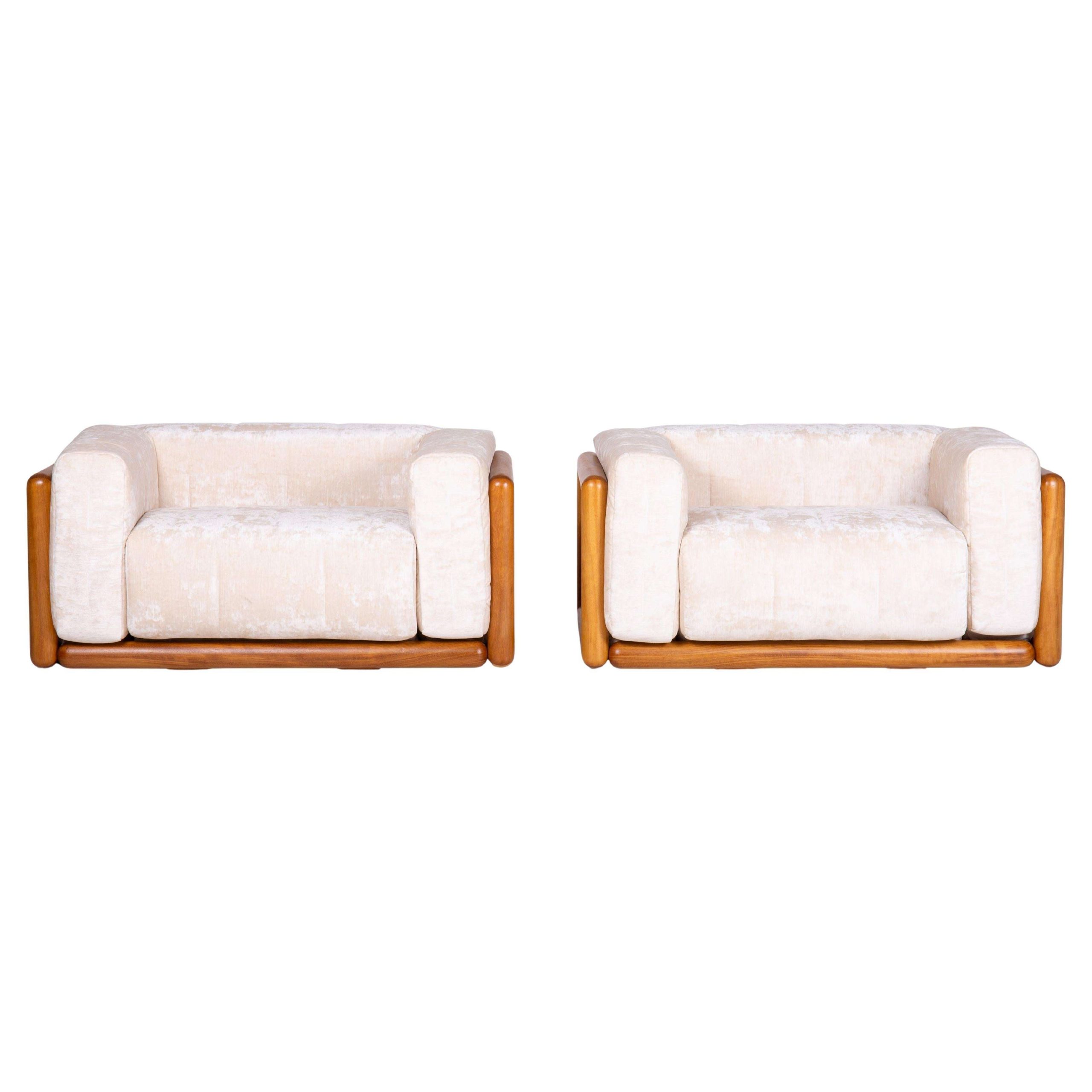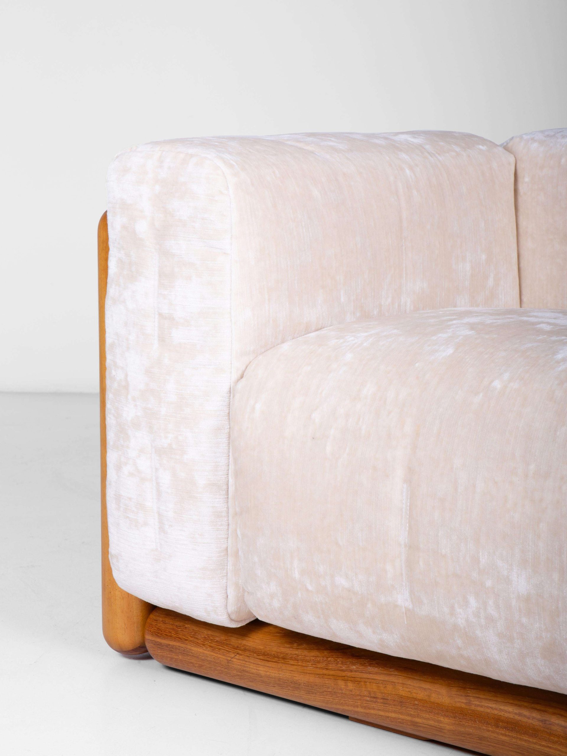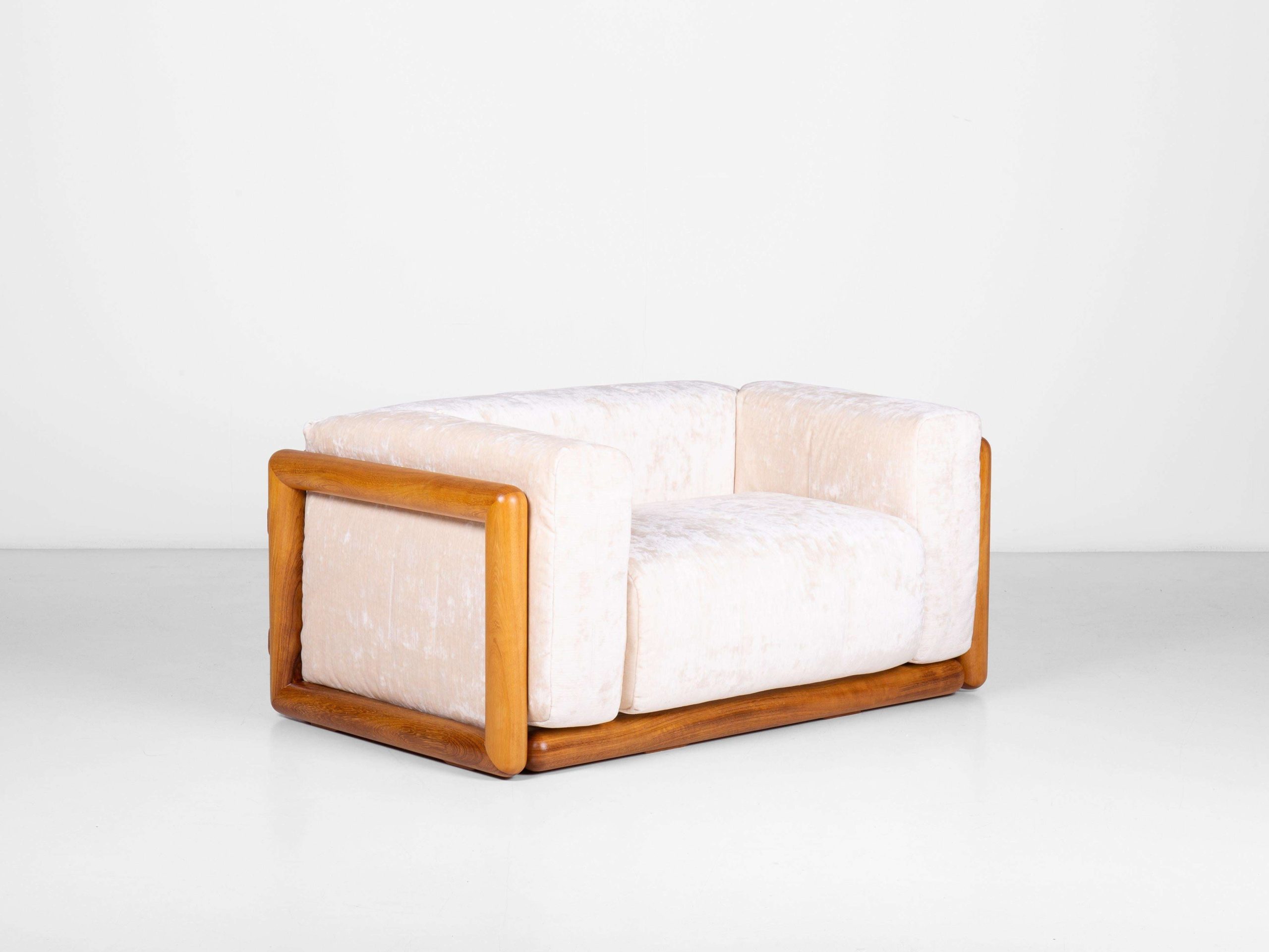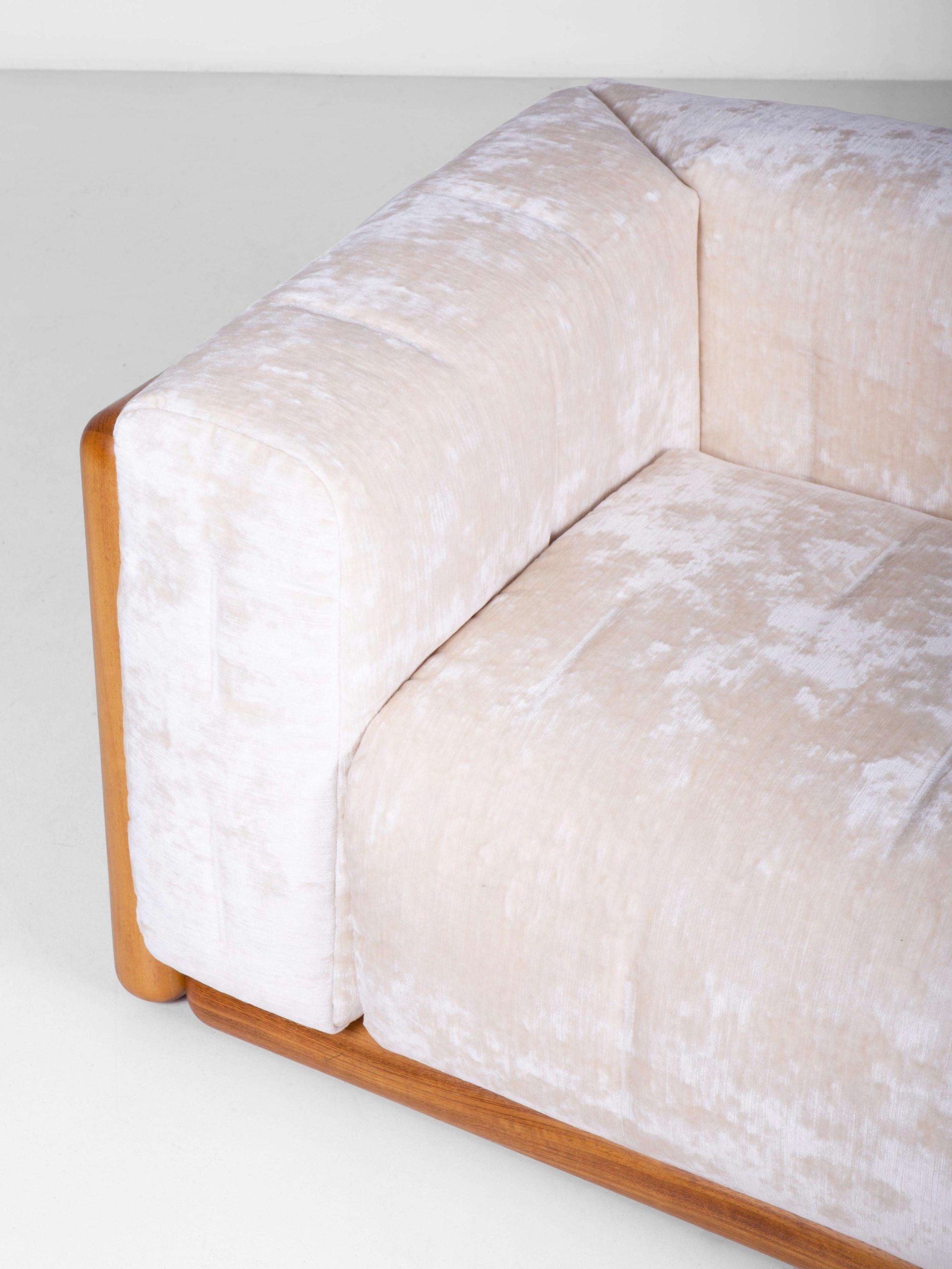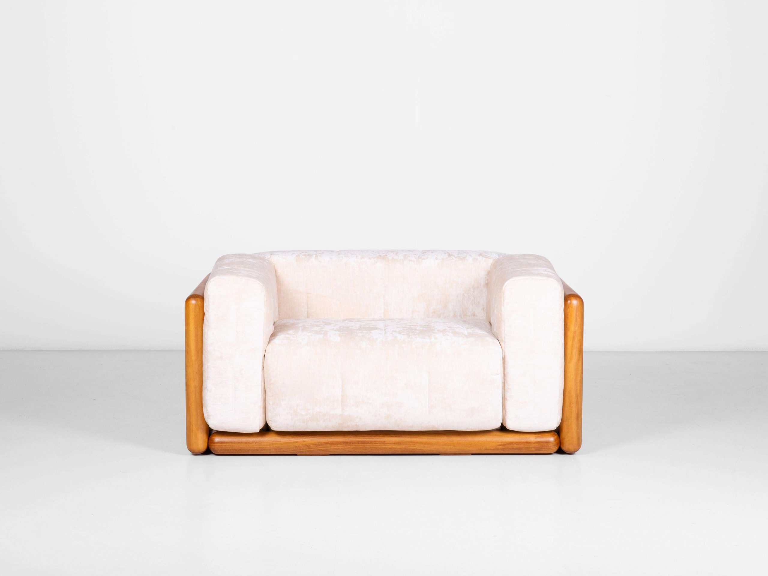 The pair of Cornaro 140 Armchairs, designed by Carlo Scarpa in 1974, measures 140 cm wide, 85 cm deep, and 65 cm high each. Crafted in Italy, these mid-century modern pieces feature a solid ash wood structure, embodying Scarpa’s Ultrarazionale style from the early 1970s with a powerful, robust presence. The original chenille velvet upholstery, complemented by polyurethane padding, provides comfort, while the one-unit side and back cushion, fastened to the frame corners, enhances the chair’s seamless design. The combination of materials and craftsmanship creates a refined silhouette that balances elegance with durability.