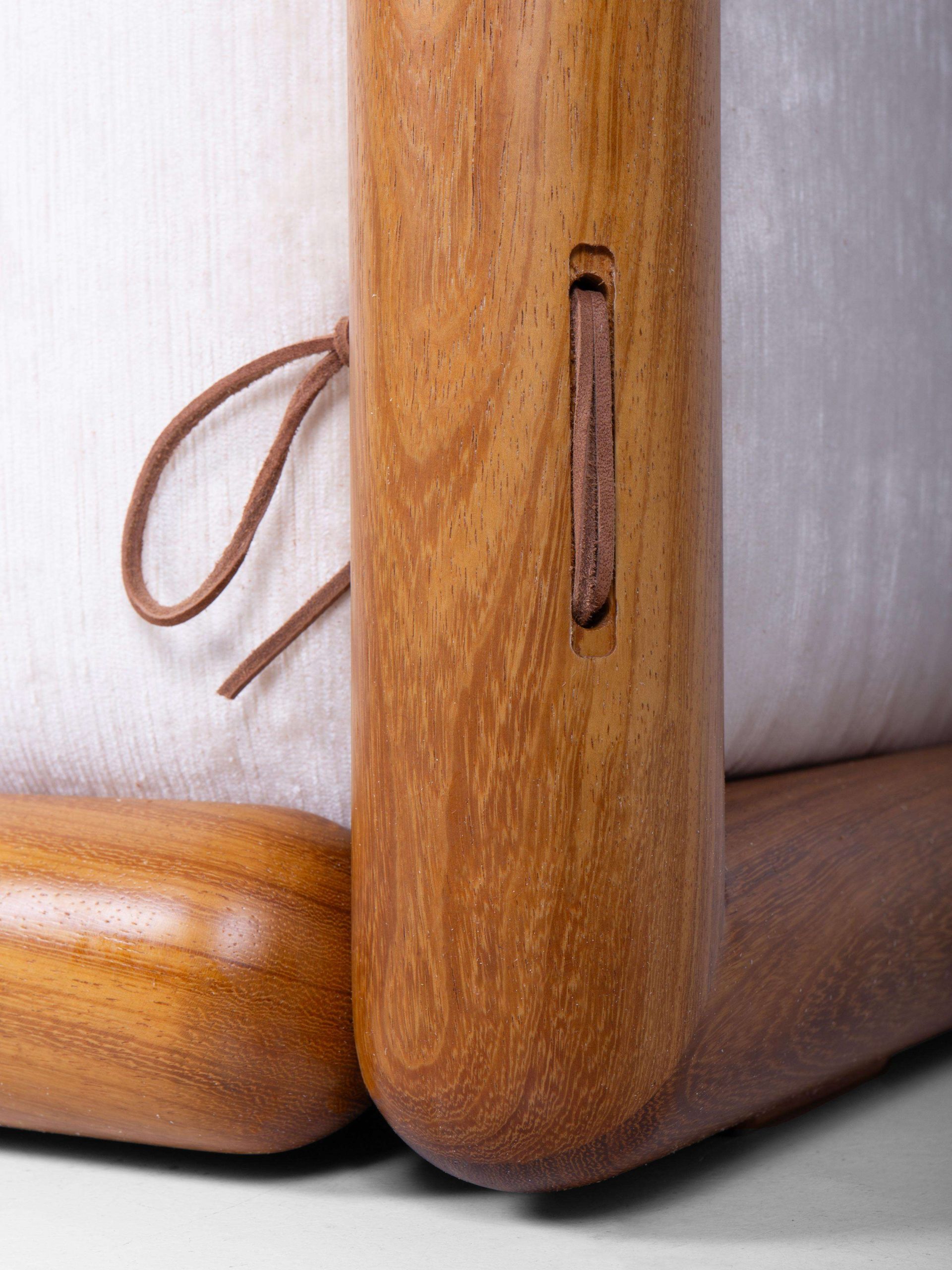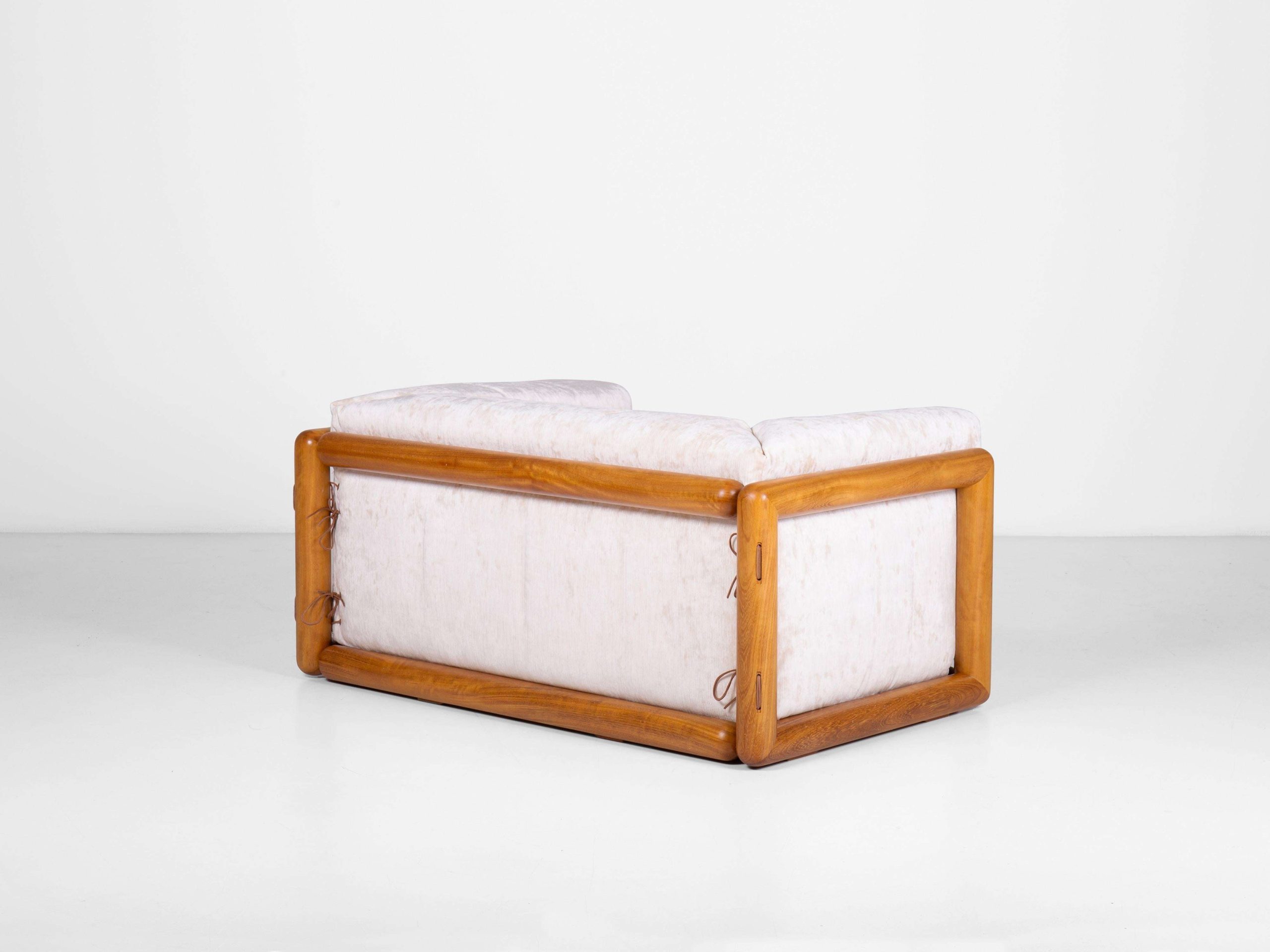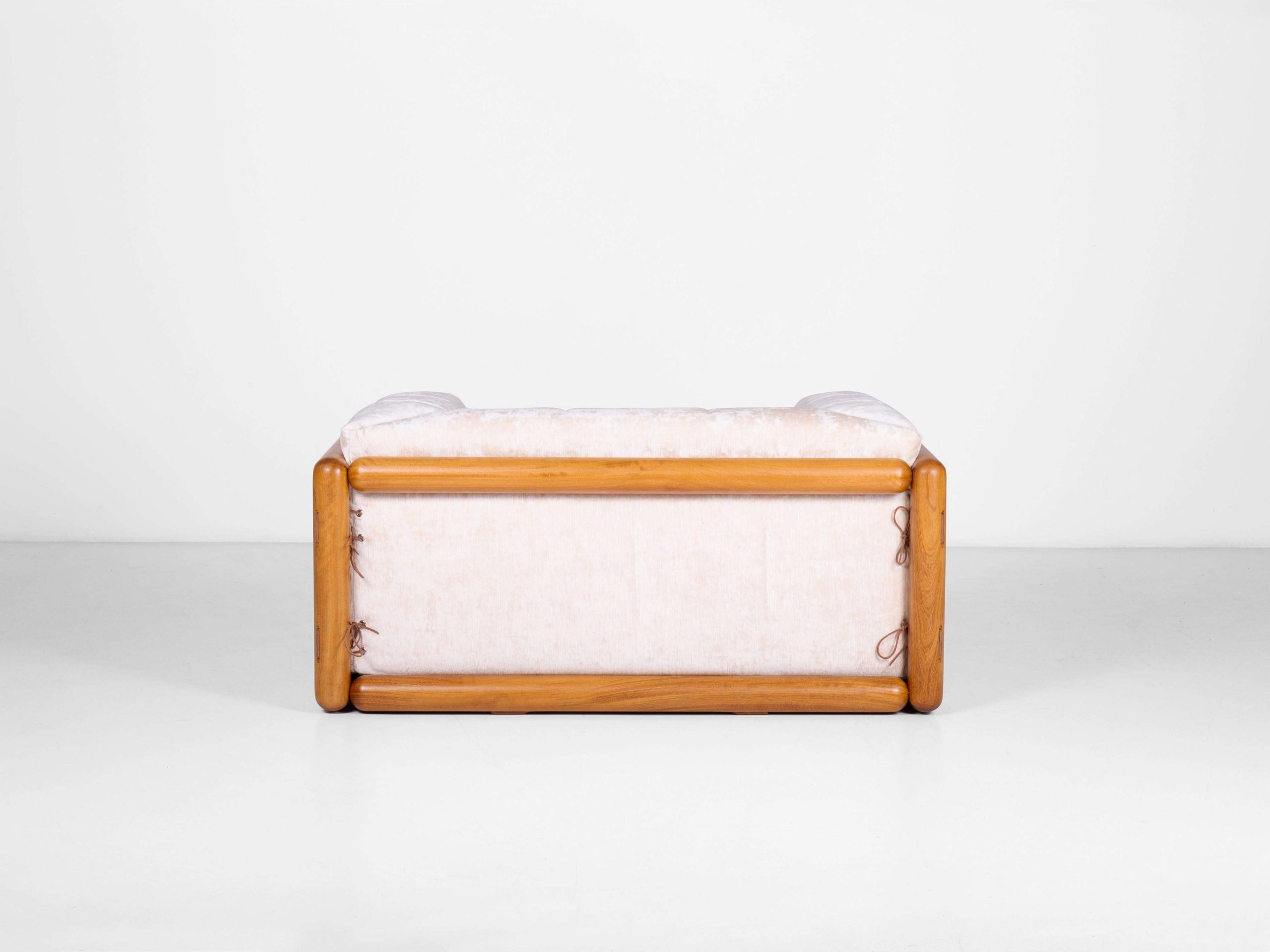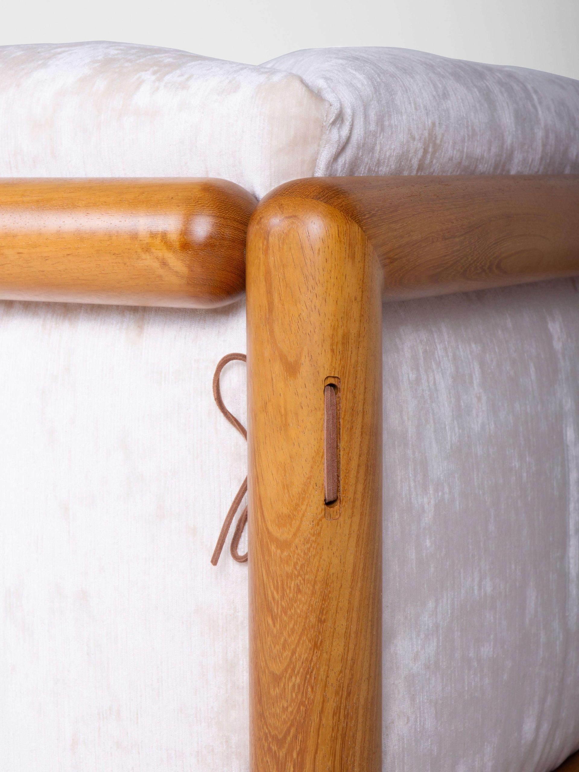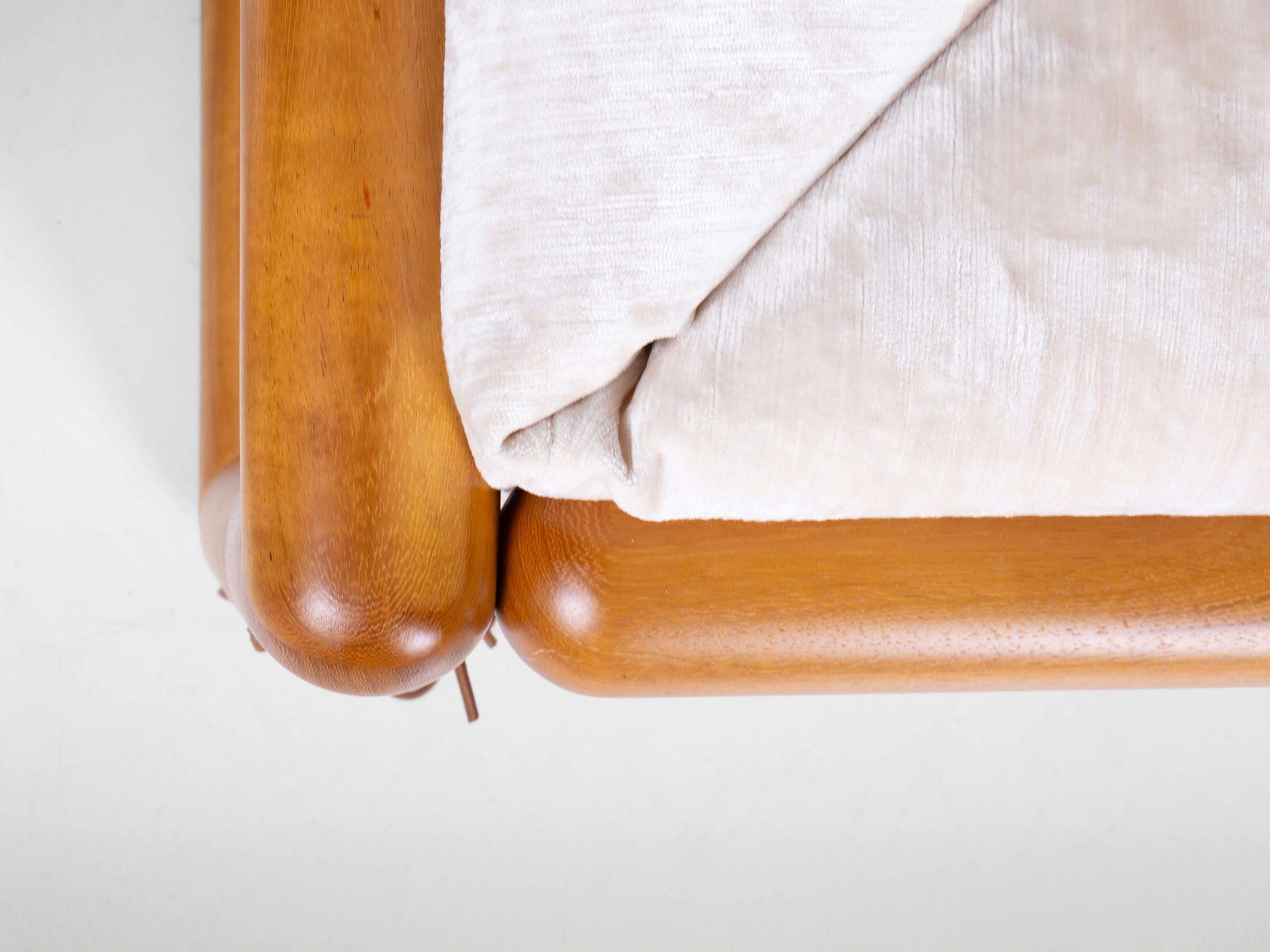 The pair of Cornaro 140 Armchairs, designed by Carlo Scarpa in 1974, measures 140 cm wide, 85 cm deep, and 65 cm high each. Crafted in Italy, these mid-century modern pieces feature a solid ash wood structure, embodying Scarpa’s Ultrarazionale style from the early 1970s with a powerful, robust presence. The original chenille velvet upholstery, complemented by polyurethane padding, provides comfort, while the one-unit side and back cushion, fastened to the frame corners, enhances the chair’s seamless design. The combination of materials and craftsmanship creates a refined silhouette that balances elegance with durability.