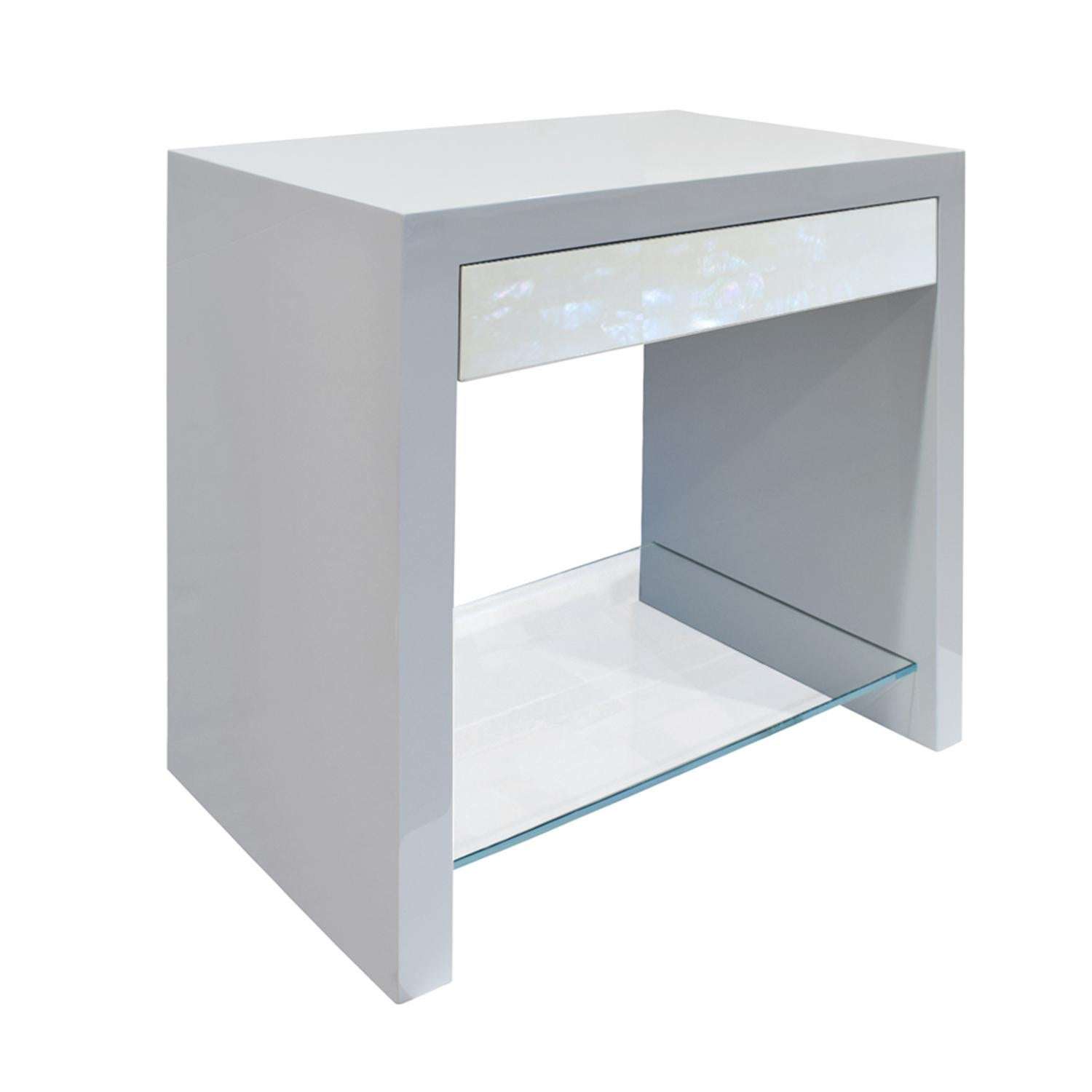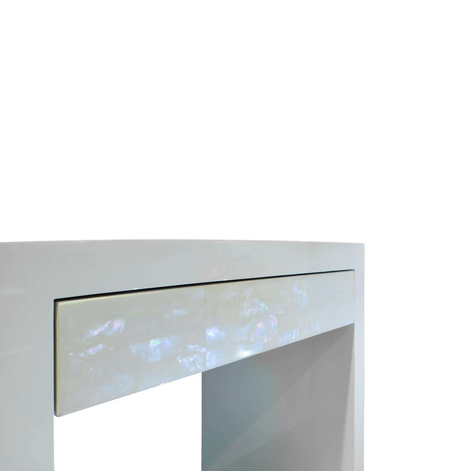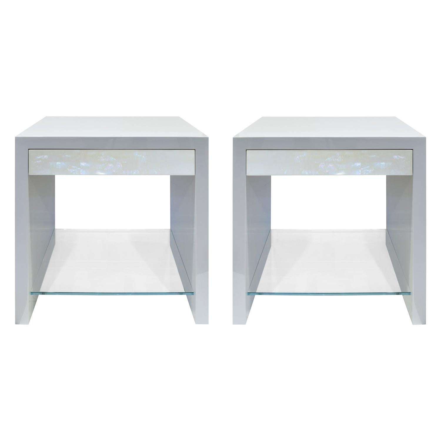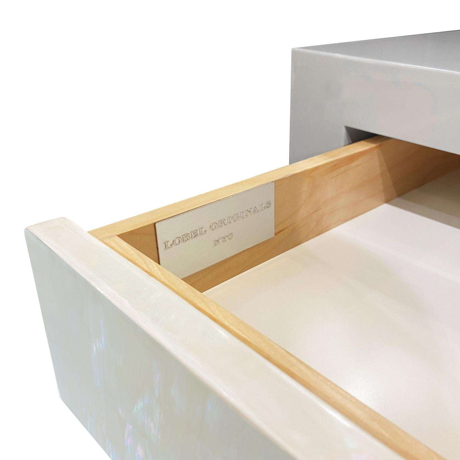 The Pair of Pearl Front Bedside Tables by Evan Lobel for Lobel Originals, crafted in the United States in 2023, measures 71.12 cm wide, 45.72 cm deep, and 76.2 cm high each, embodying a modern design with luxurious detailing. Sold as a set of two, these tables feature a mirror-lacquered finish in gray (customizable in any color), with self-closing drawers adorned in mother-of-pearl and a glass shelf, showcasing hand-crafted excellence. The combination of materials, including wood, lacquer, and glass, creates a sleek, elegant aesthetic, making them ideal for a bedroom as nightstands that blend functionality with sophisticated artistry.