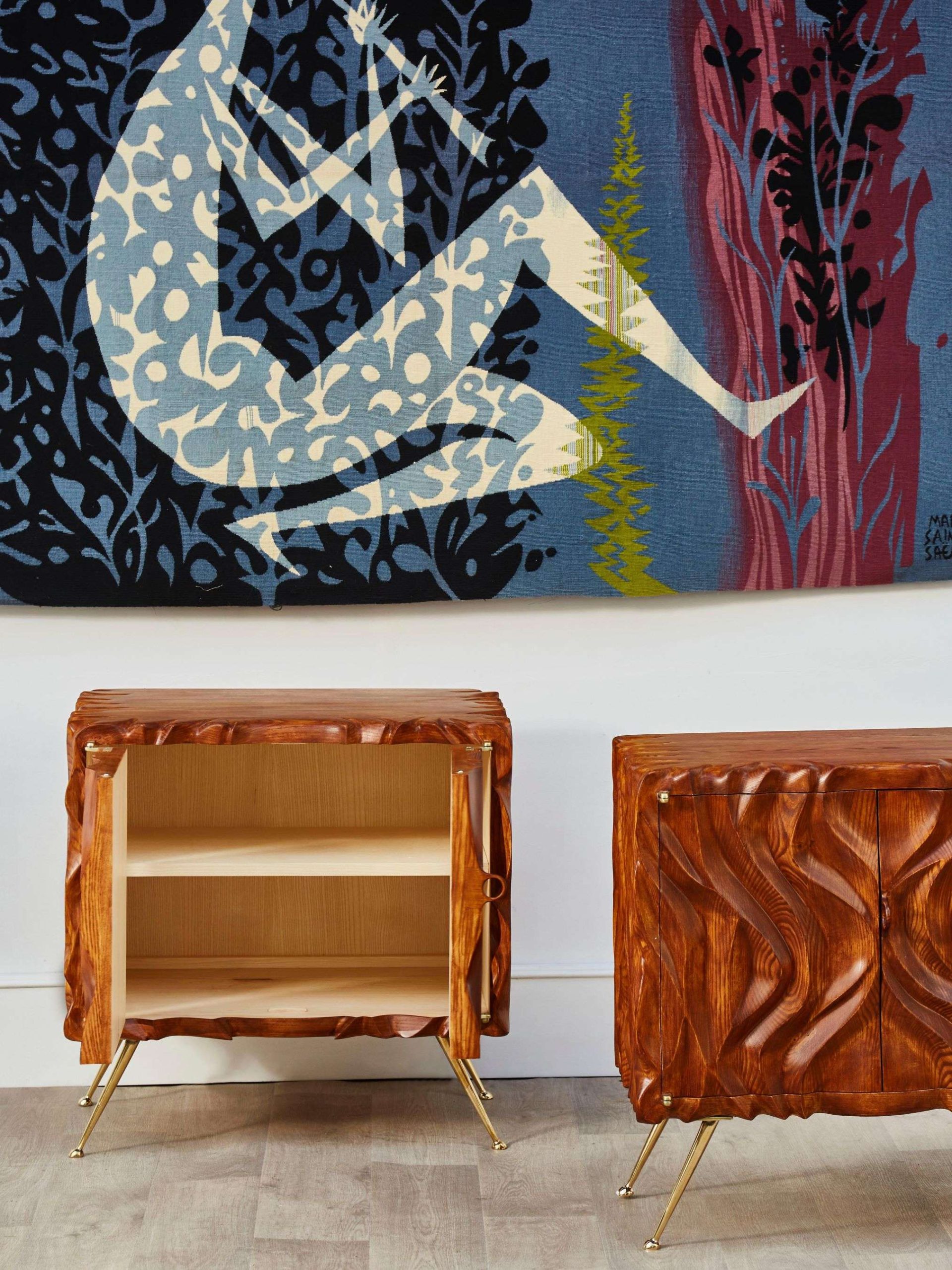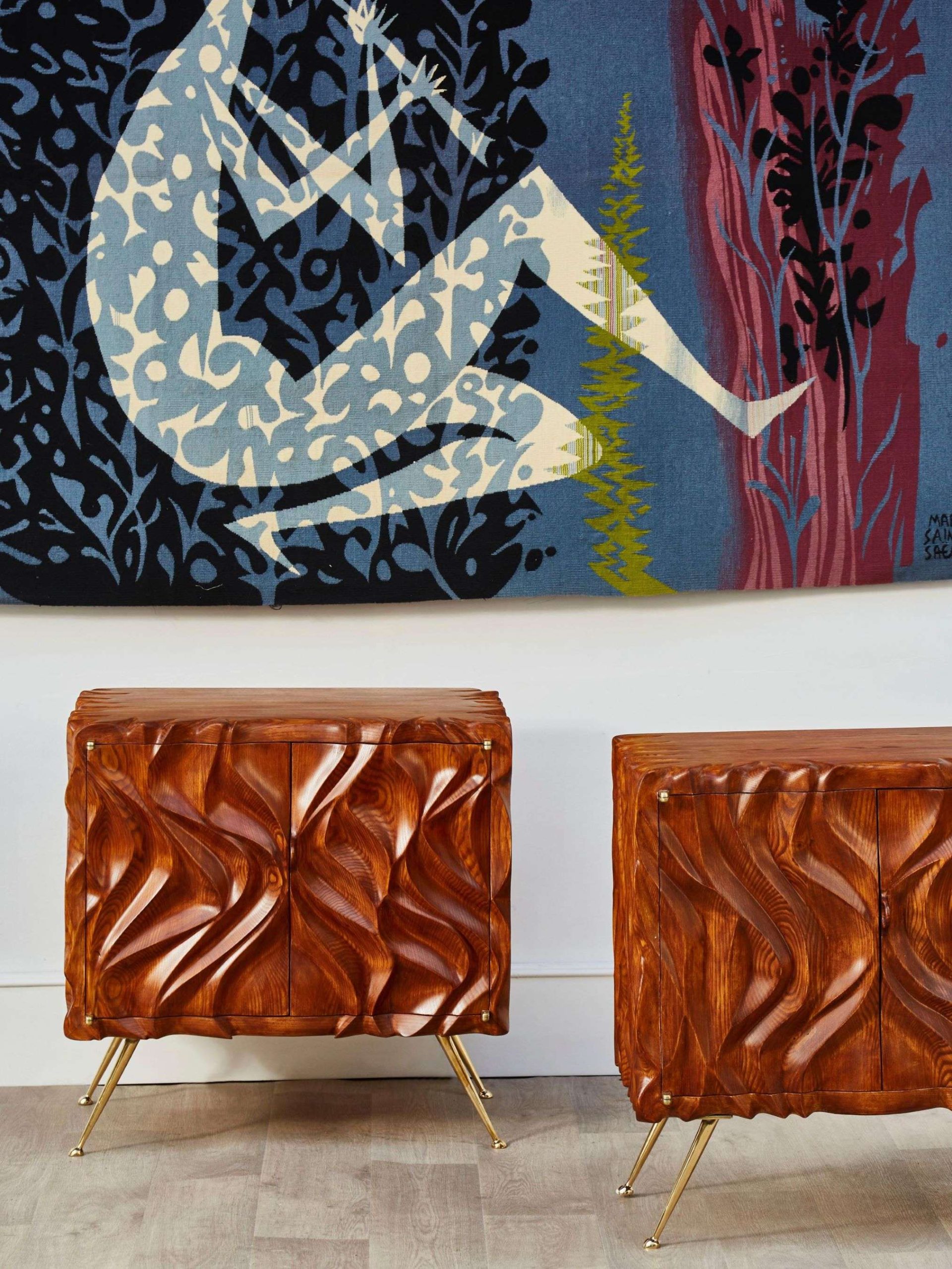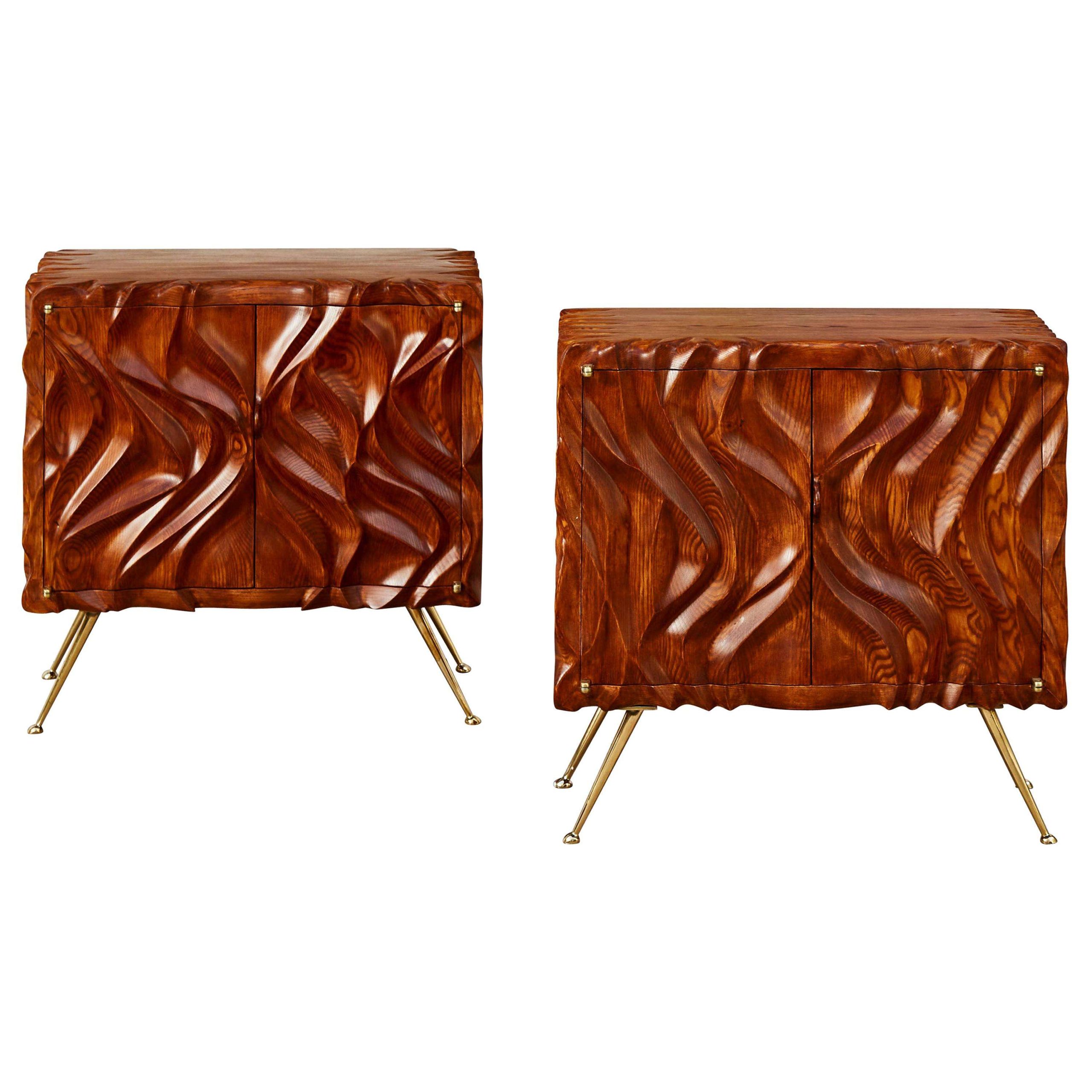 The Pair of Wooden Nightstands by G. Nicolet, crafted in France in 2021, measures 70 cm wide, 47 cm deep, and 70 cm high each, showcasing a modern design with artistic flair. Sold as a set of two, these limited and signed pieces by French artist Geoffroy Nicolet feature sculpted wood with two doors per nightstand, offering practical storage, and are elevated on four brass feet, adding a touch of elegance. The combination of materials and meticulous craftsmanship makes these nightstands a perfect addition to a bedroom, blending functionality with contemporary sculptural aesthetics.