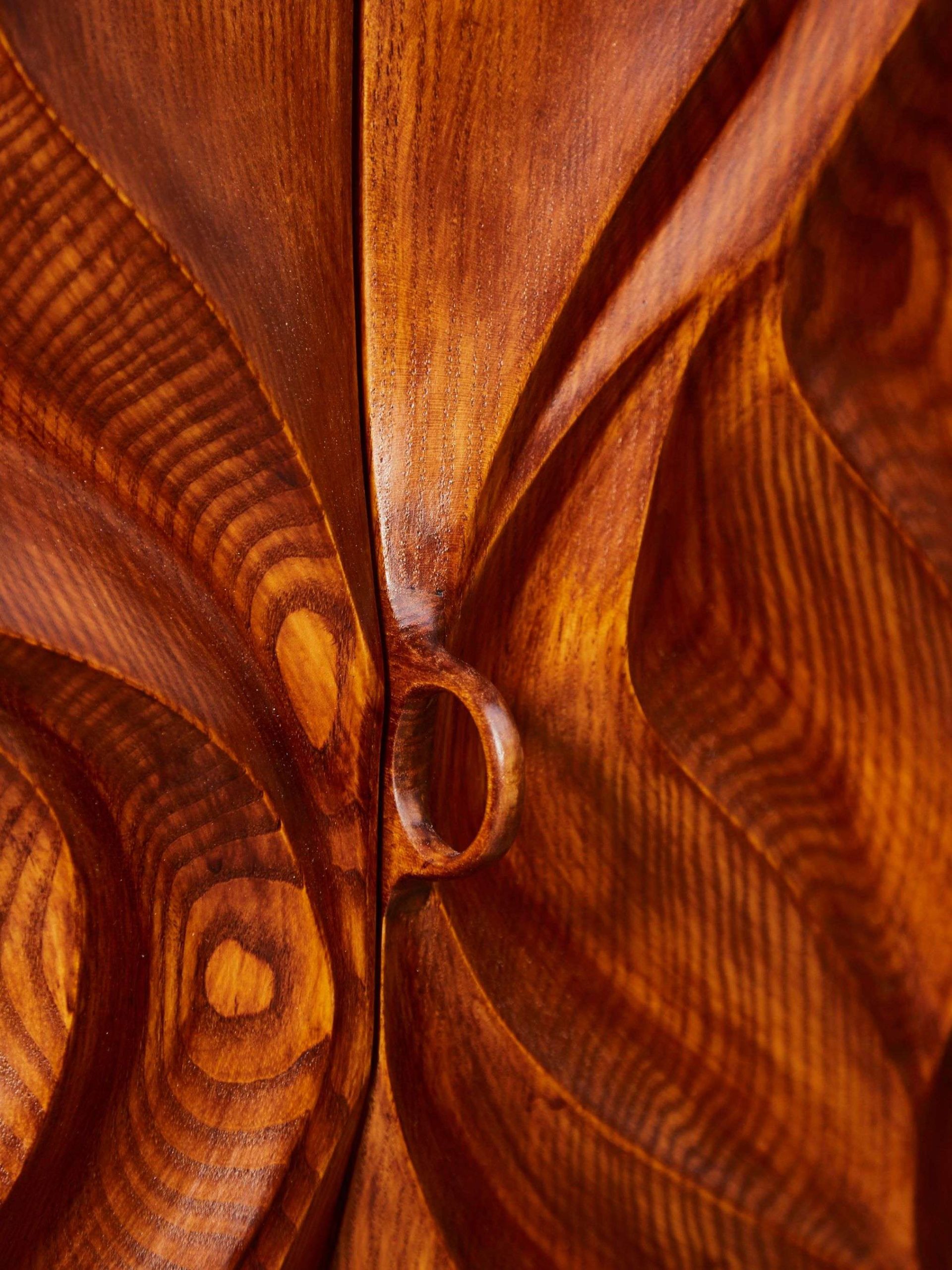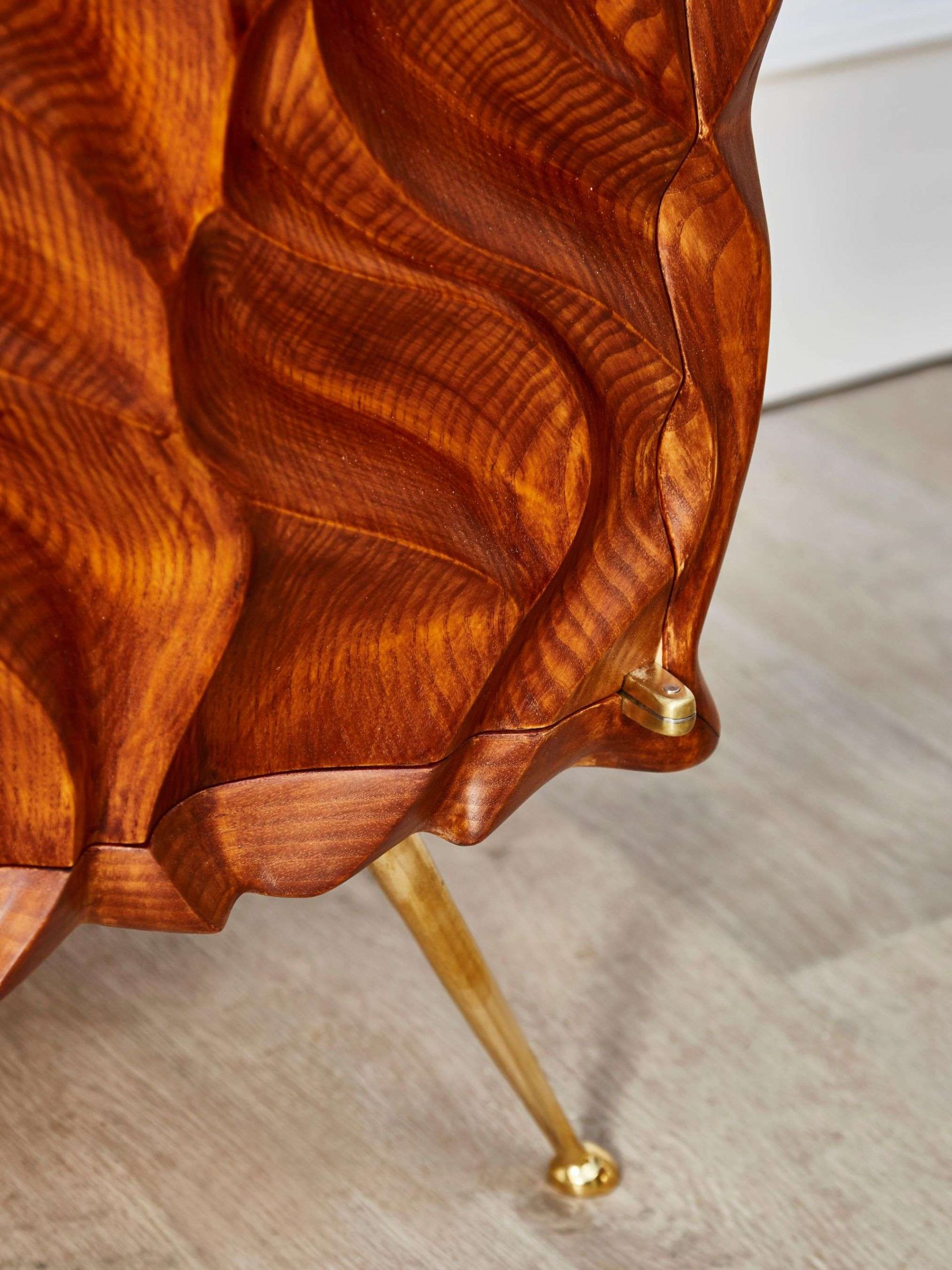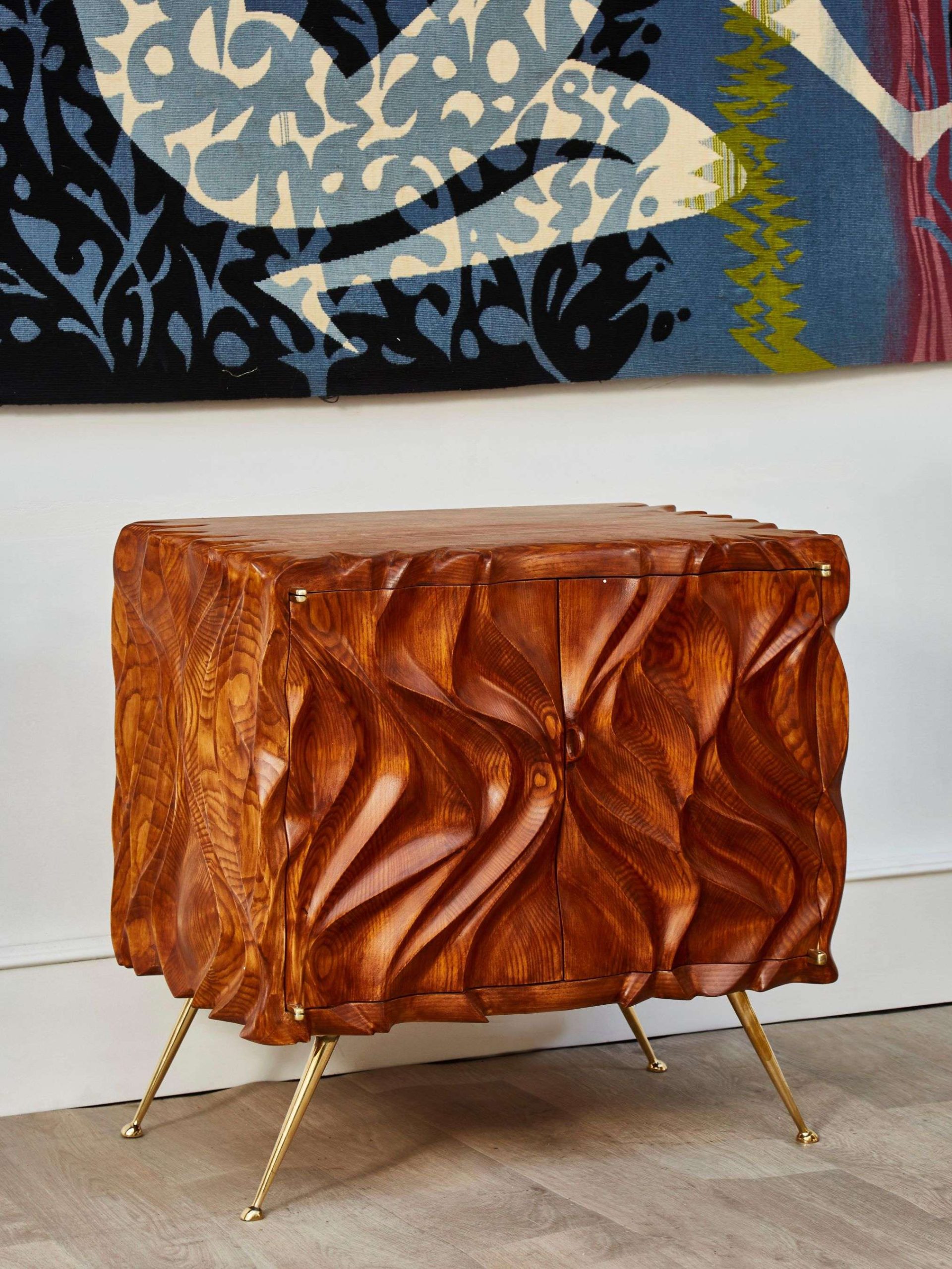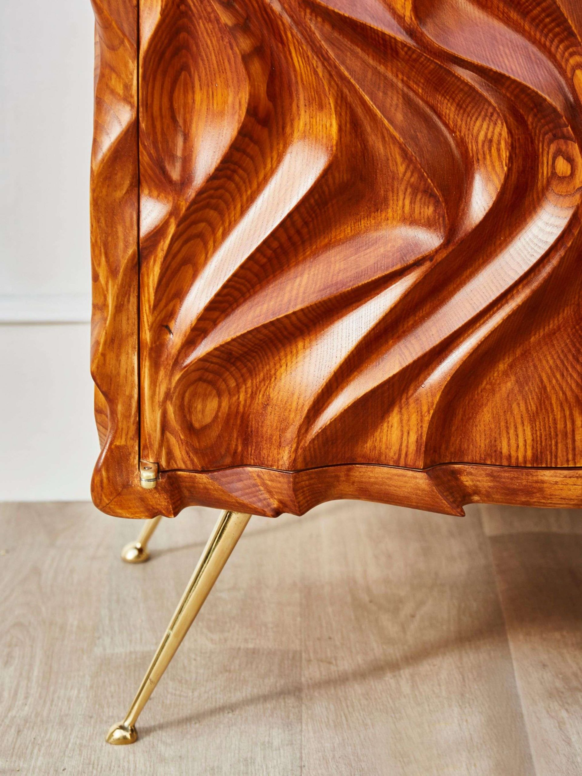 The Pair of Wooden Nightstands by G. Nicolet, crafted in France in 2021, measures 70 cm wide, 47 cm deep, and 70 cm high each, showcasing a modern design with artistic flair. Sold as a set of two, these limited and signed pieces by French artist Geoffroy Nicolet feature sculpted wood with two doors per nightstand, offering practical storage, and are elevated on four brass feet, adding a touch of elegance. The combination of materials and meticulous craftsmanship makes these nightstands a perfect addition to a bedroom, blending functionality with contemporary sculptural aesthetics.