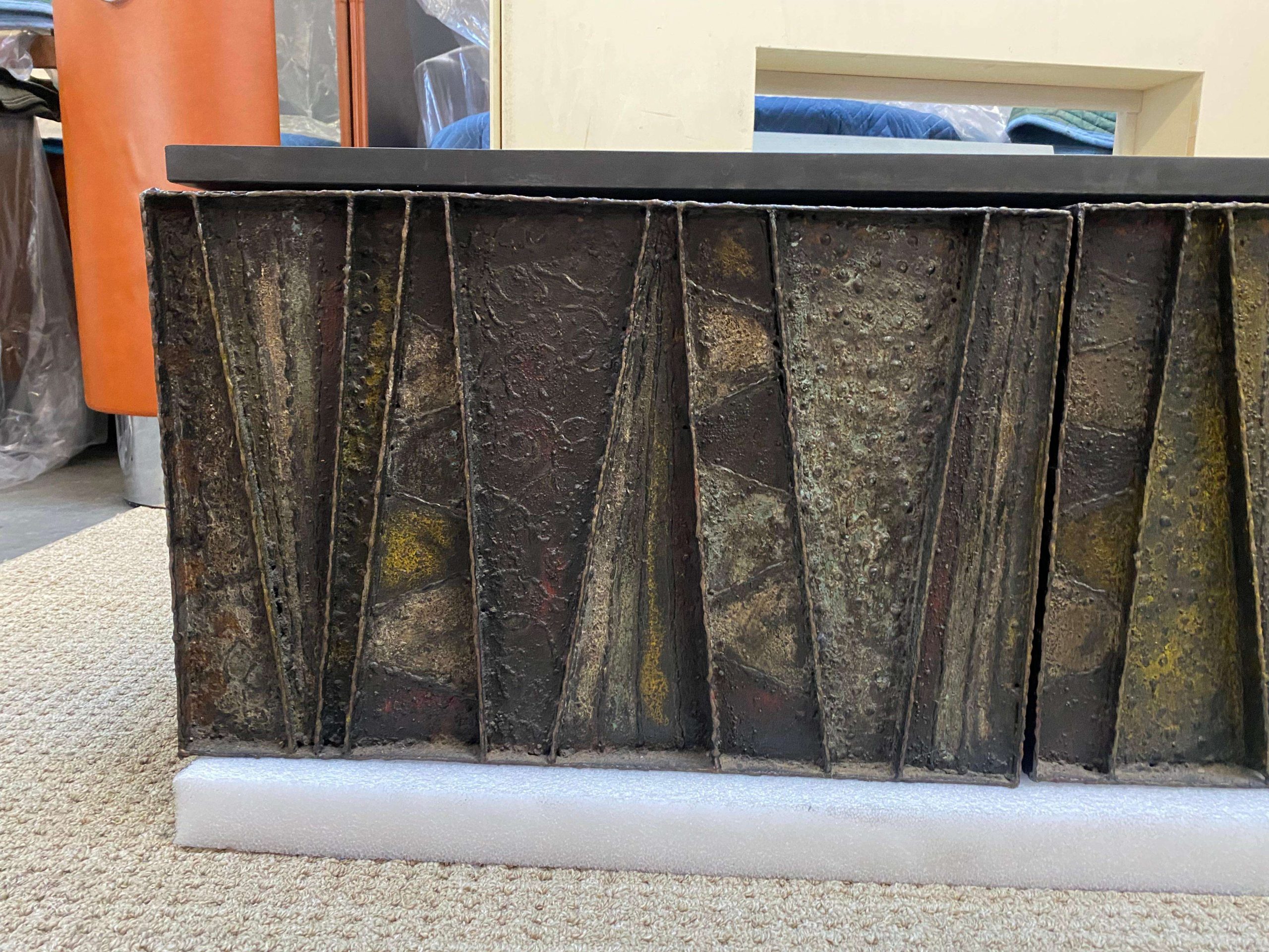 Paul Evans, a key figure in the American Studio Craft Movement, joined Directional in 1964, redefining furniture with bold textures, as seen in this cabinet. In good vintage condition with minor wear, including small flakes on the slate top and light scratches on the steel patina, this piece reflects Evans’ legacy of innovative craftsmanship, making it a coveted addition for design connoisseurs seeking a statement piece with historical significance.
