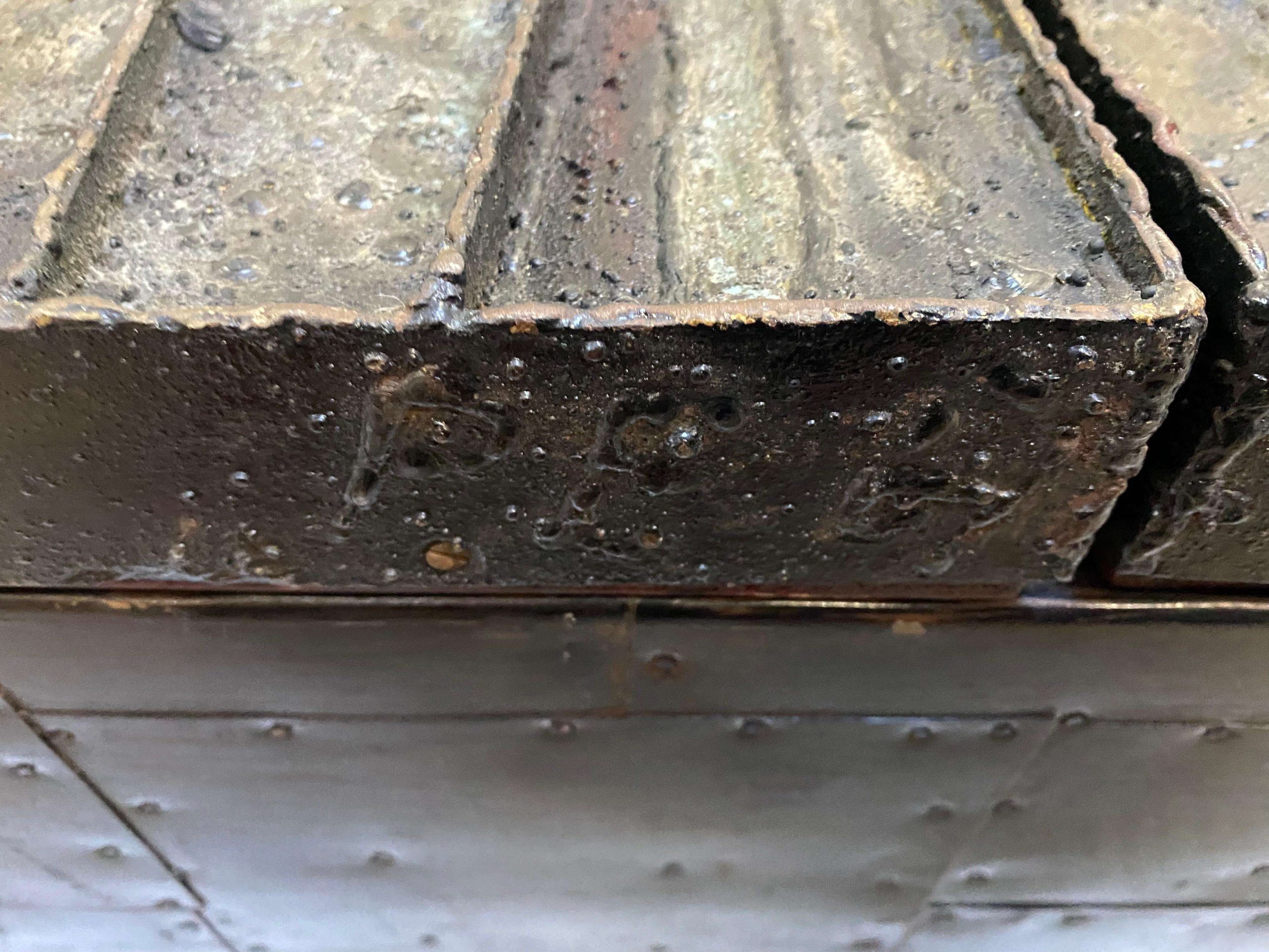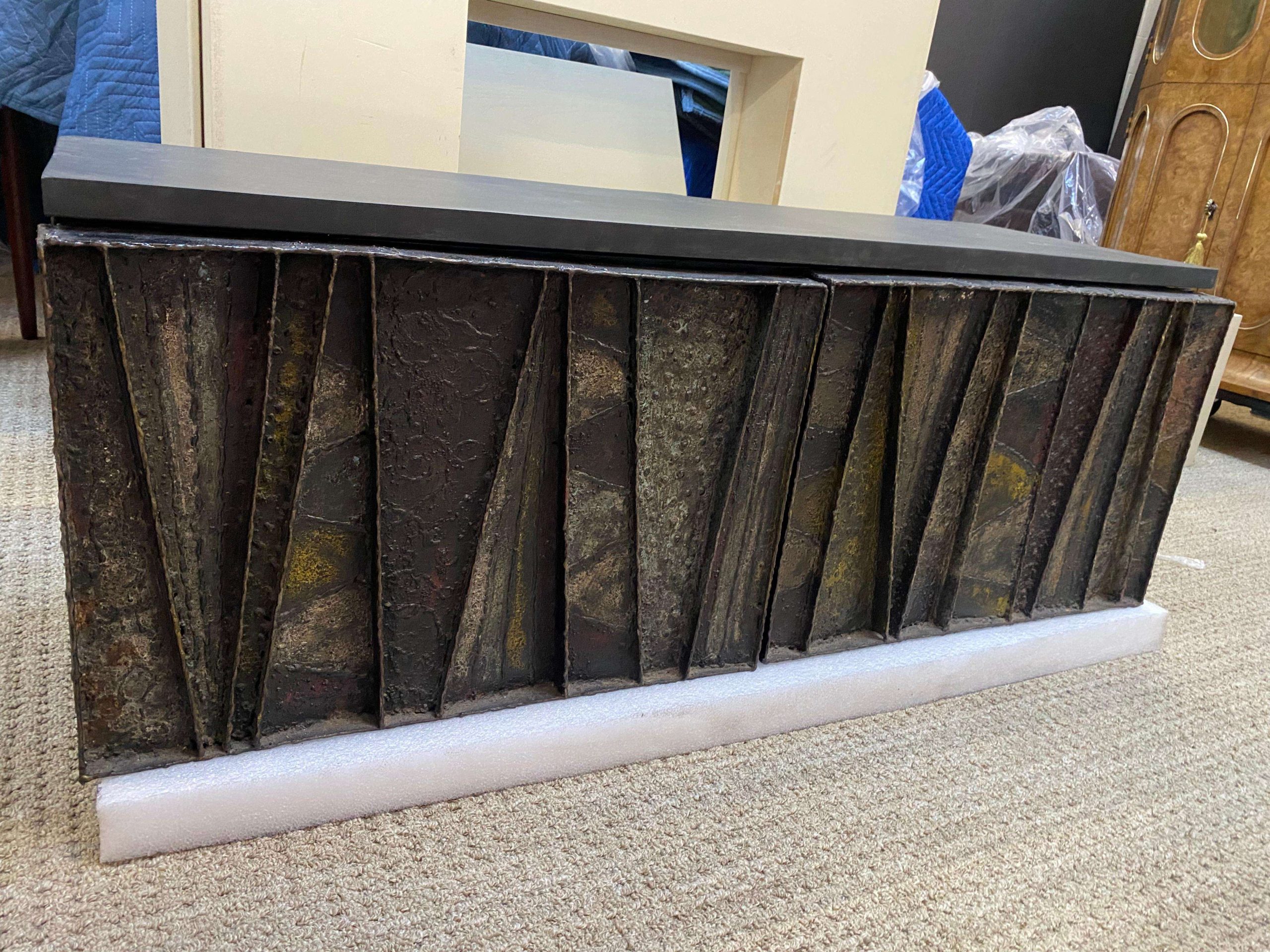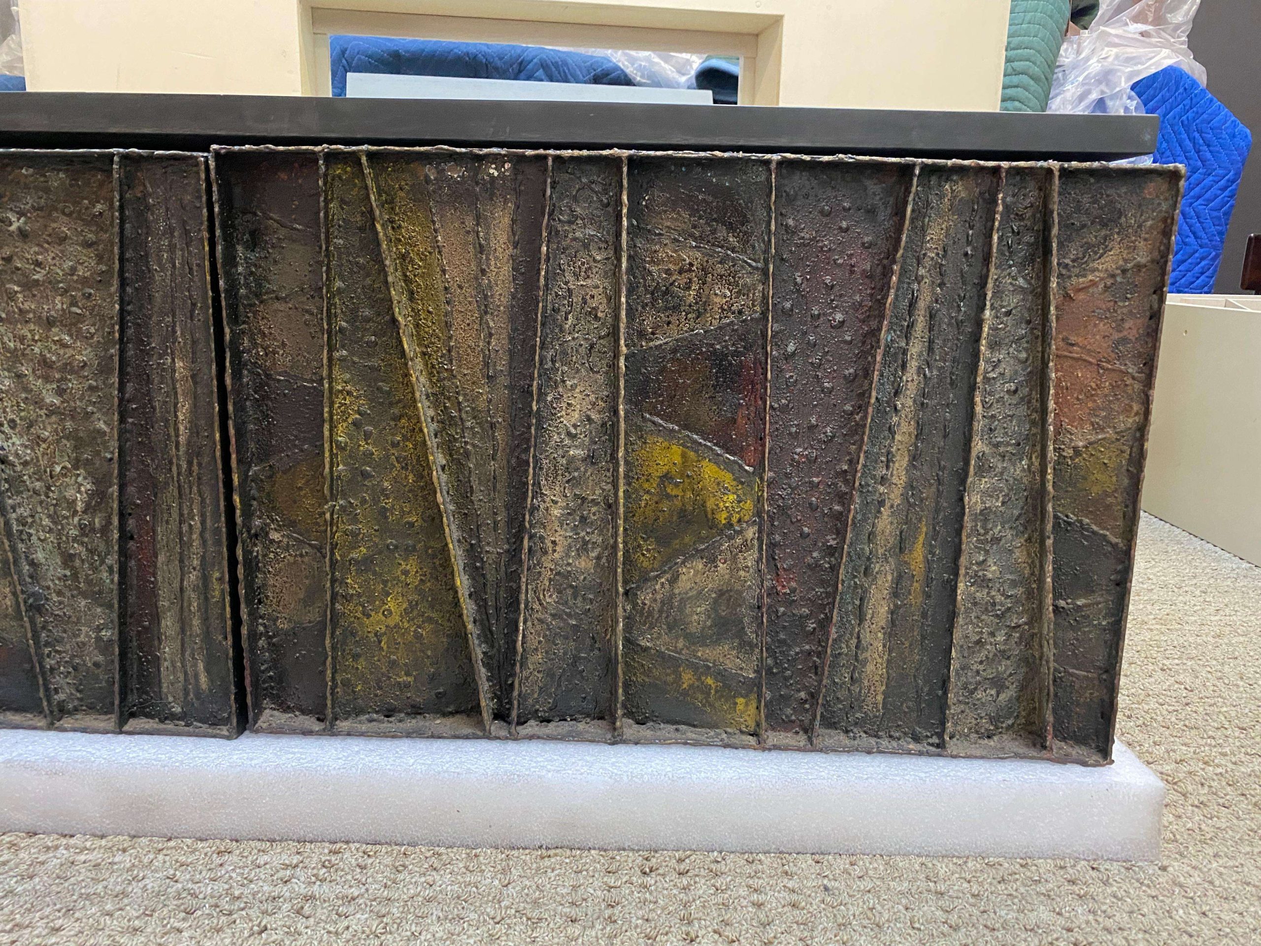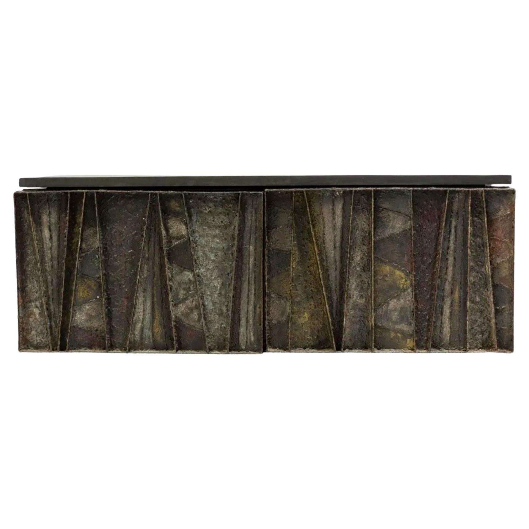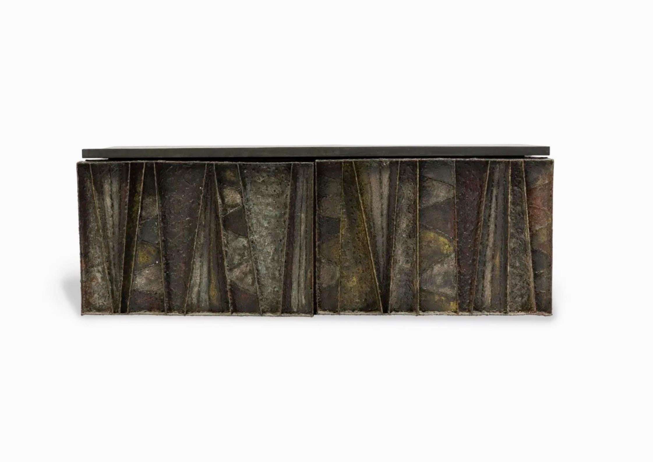 The Paul Evans ‘PE-19’ Deep Relief Floating Wall Cabinet, crafted for Directional in 1964 and signed ‘PE 64’, measures 123.19 cm wide, 41.91 cm deep, and 43.82 cm high, embodying a brutalist design that blends art and function. This collector’s piece features patinated, enameled steel segments with welded textures and patterns, a slate top, and two cabinet doors revealing a stained red wood interior with an adjustable shelf. The fusion of materials creates a dynamic, exemplary piece, ideal as a dry bar, small credenza, or functional fine art, fitting seamlessly into brutalist, mid-century modern, Scandinavian, or contemporary interiors, from a penthouse apartment to a hotel lobby lounge.