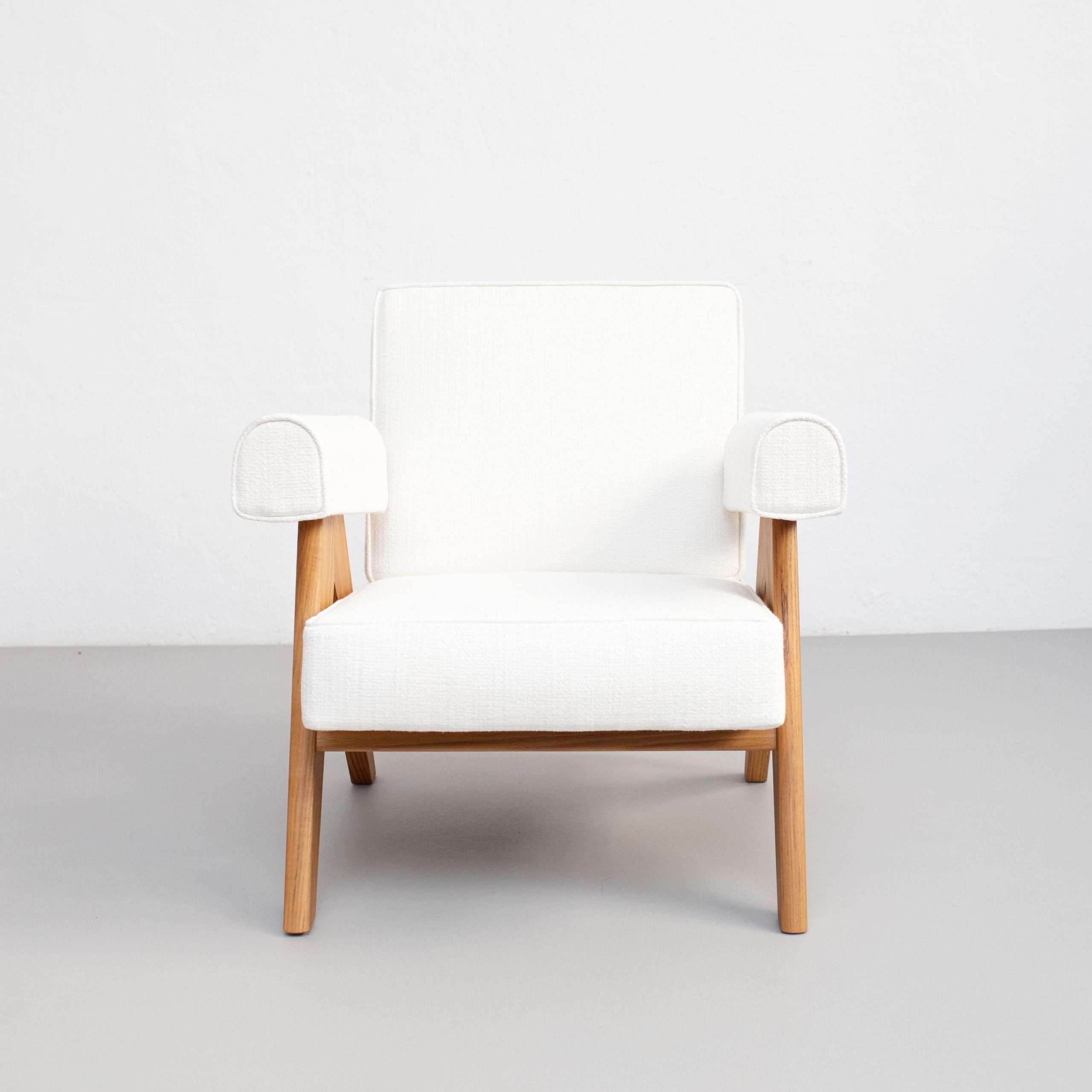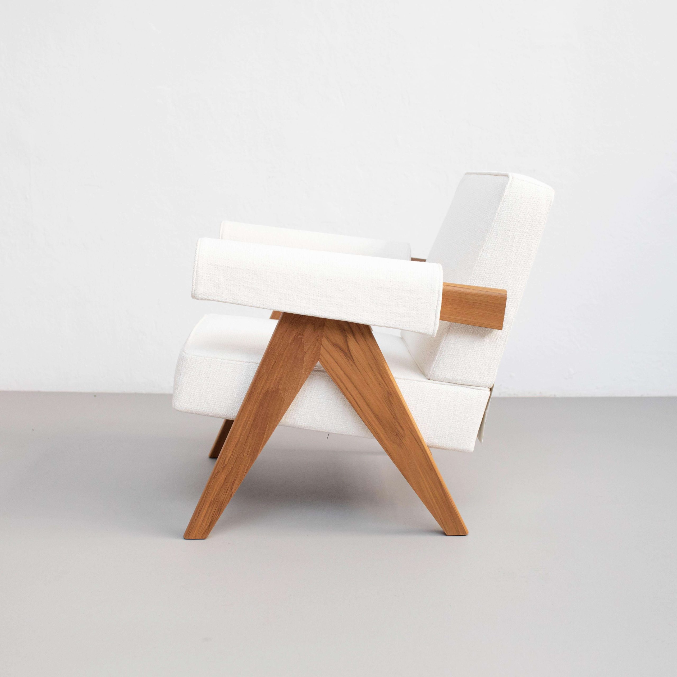 Creator: Pierre Jeanneret (Designer), Cassina (Manufacturer) Dimensions: Height: 29.14 in (74 cm) Width: 27.17 in (69 cm) Depth: 29.93 in (76 cm) Seat Height: 14.57 in (37 cm) Style: Mid-Century Modern (In the Style Of) Materials and Techniques: Fabric, Wood Place of Origin: Italy Period: 2010- Date of Manufacture: 2024 Condition: New – Brand-new, unused item, not previously owned. Shows absolutely no signs of wear.