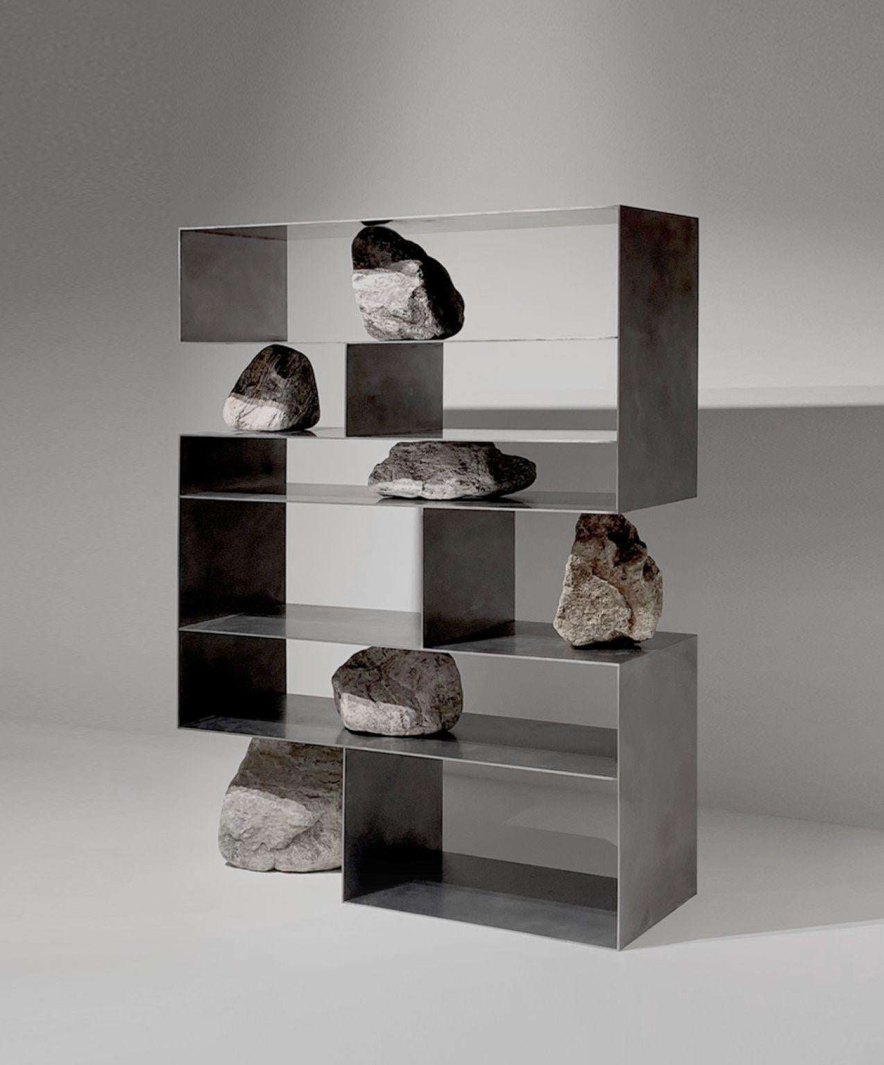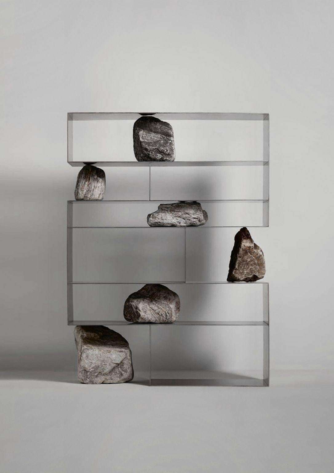 The Proportions of Stone Shelf 01 by Lee Sisan, crafted in South Korea in 2023, measures 110 cm wide, 35 cm deep, and 150 cm high, embodying a modern design that explores the balance between nature and artifact. Part of the “Proportions of Stone” series, this shelf uses natural stones, their dimensions dictating the piece’s proportions, mounted on manufactured stainless steel plates. The stones serve both structural and aesthetic roles, juxtaposing the organic with the industrial in a harmonious balance, fulfilling Sisan’s vision of coexisting man-made and natural elements, creating a functional yet artistic piece for displaying books or objects.