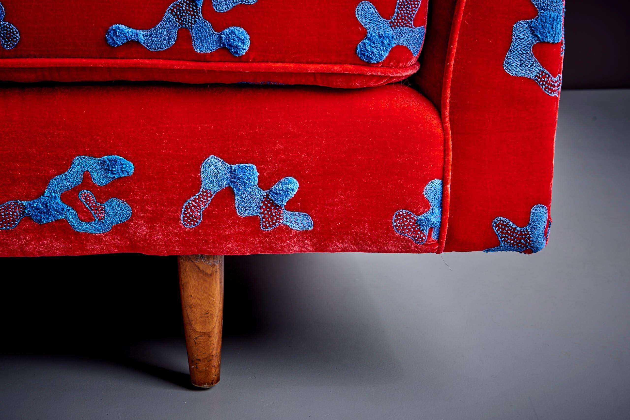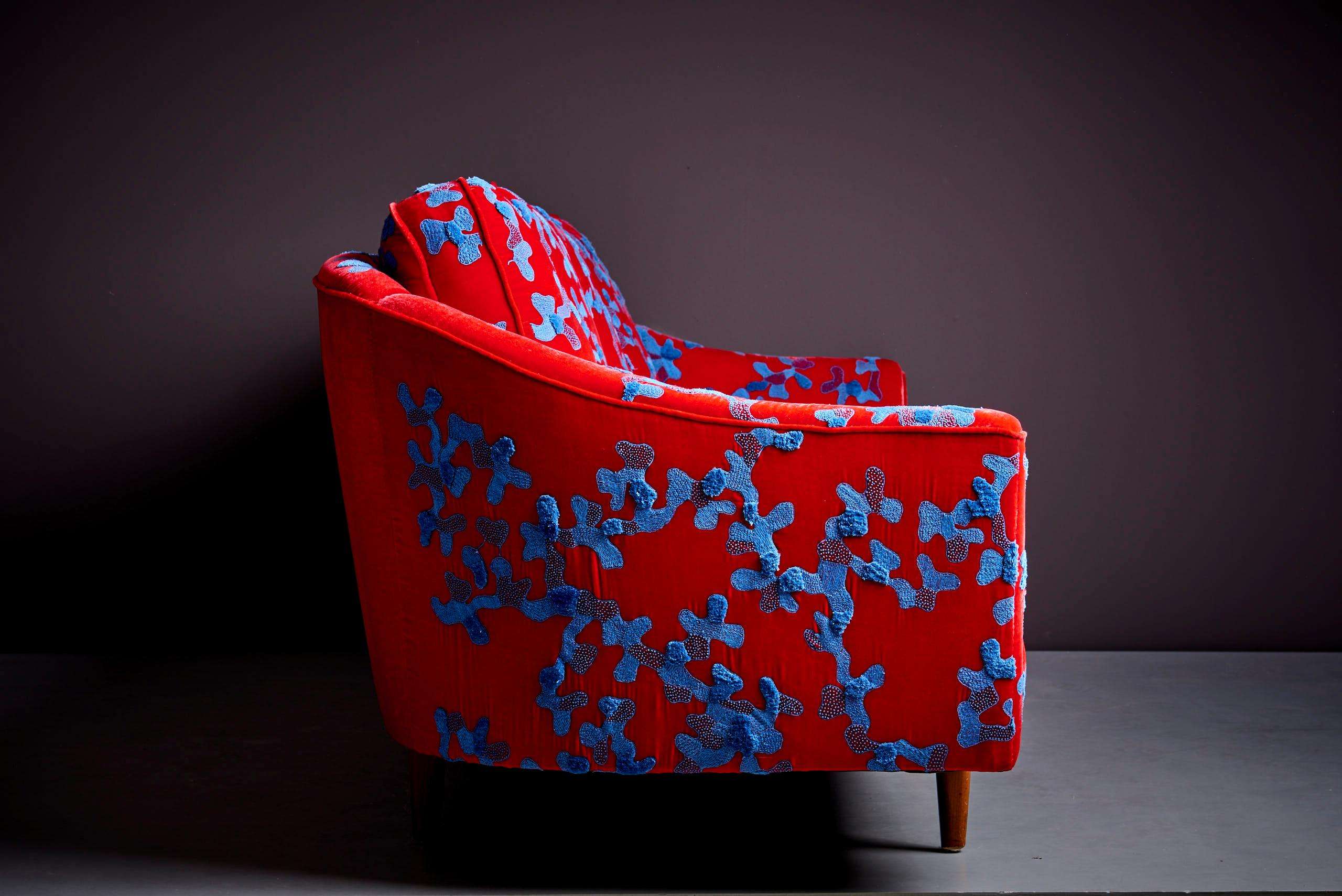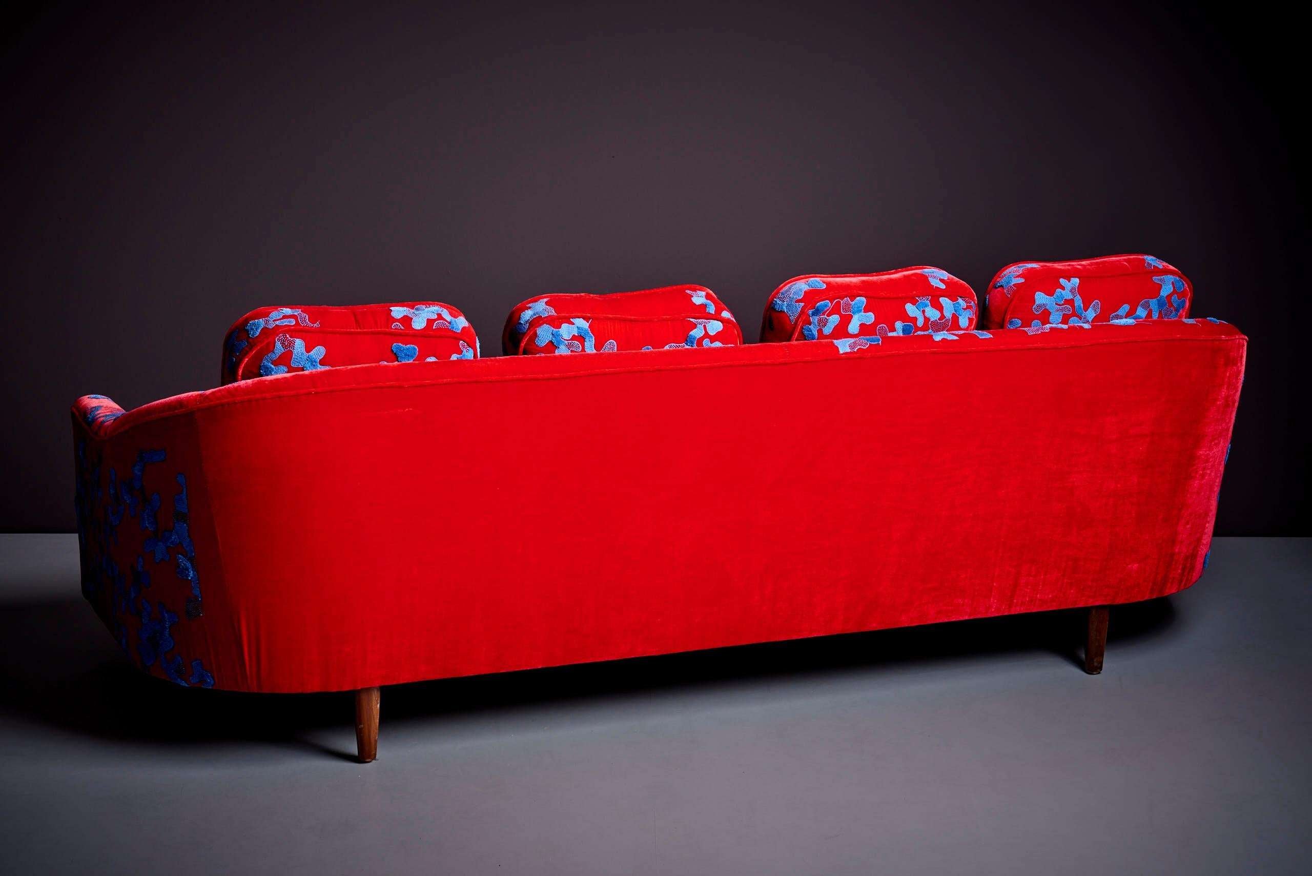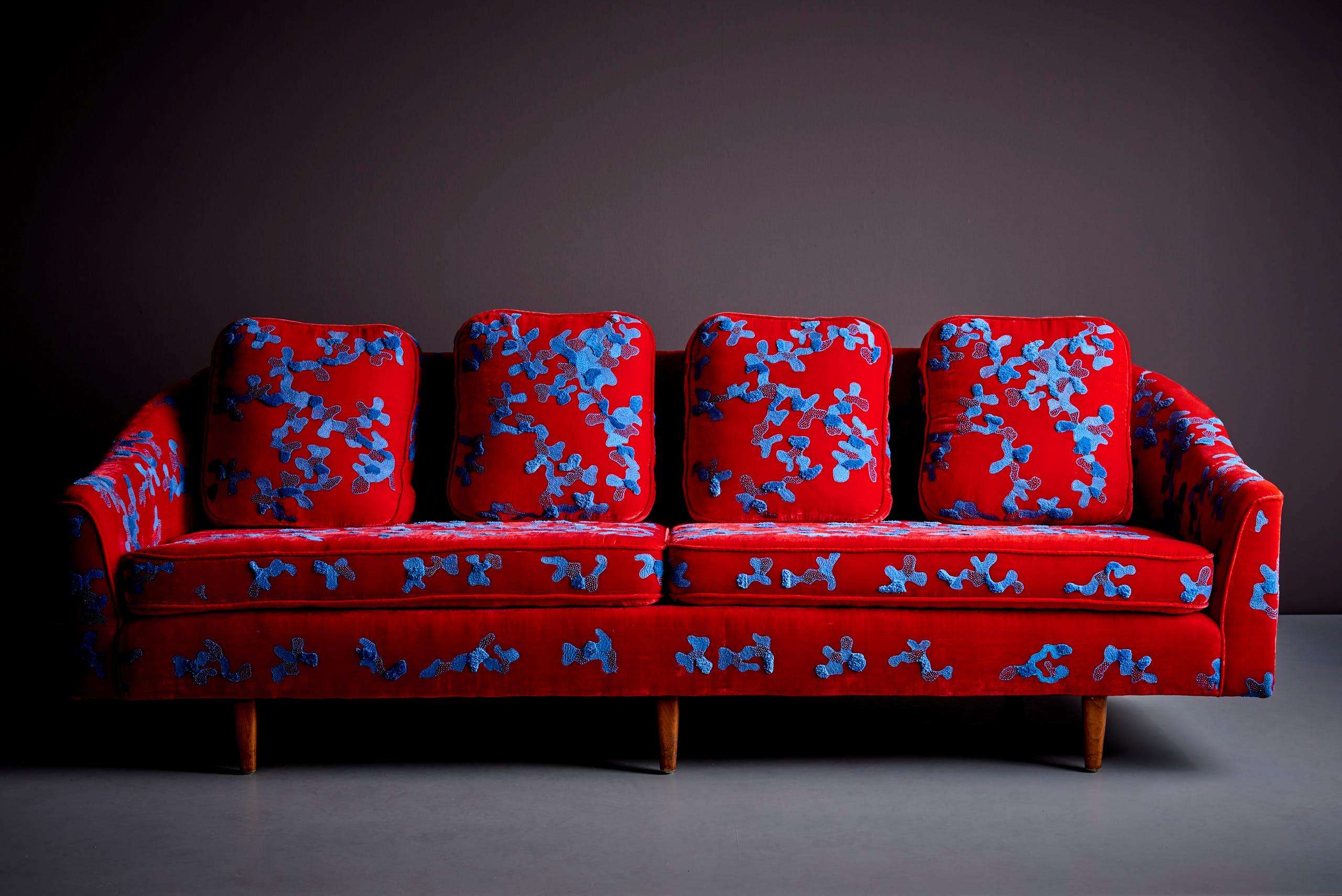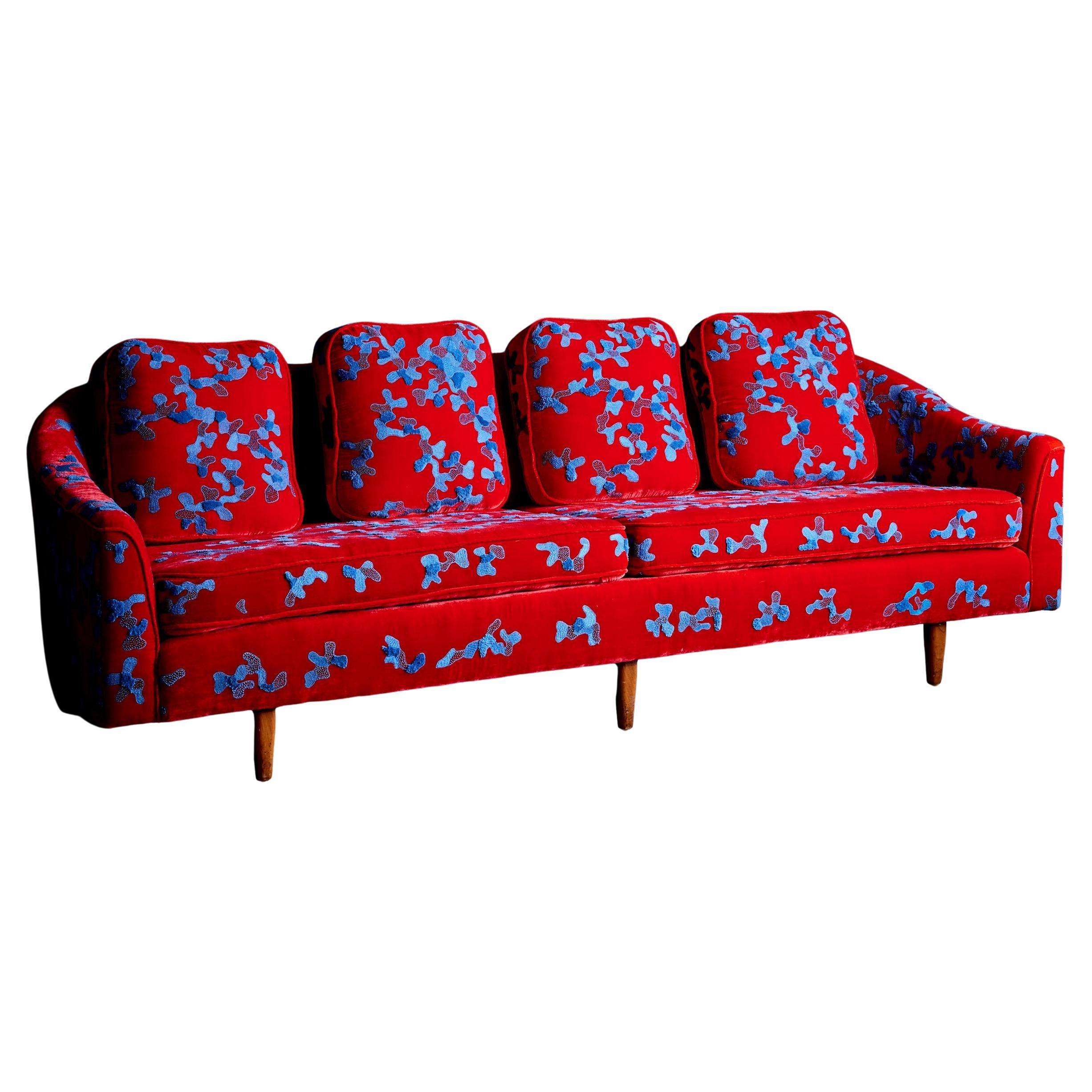 The Red and Blue Harvey Probber Sofa, a vintage piece from the 1960s, measures 215 cm wide, 80 cm deep, and 70 cm high with a seat height of 44 cm. This eye-catching sofa features a deep red silk velvet base fabric, adorned with sky blue cotton thread hand-embroidered by master artisans in India, creating a stunning color contrast that highlights its mid-century modern design.