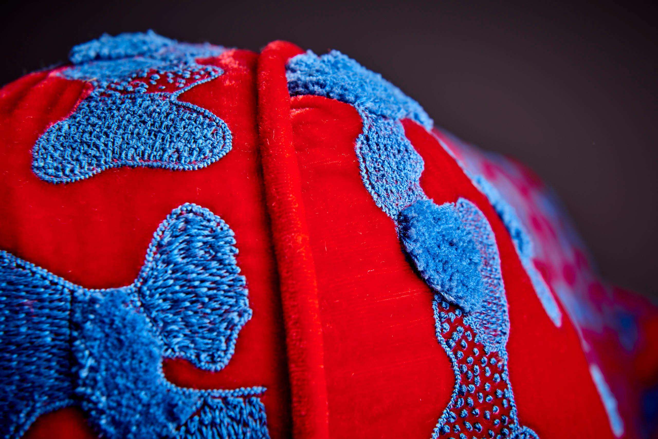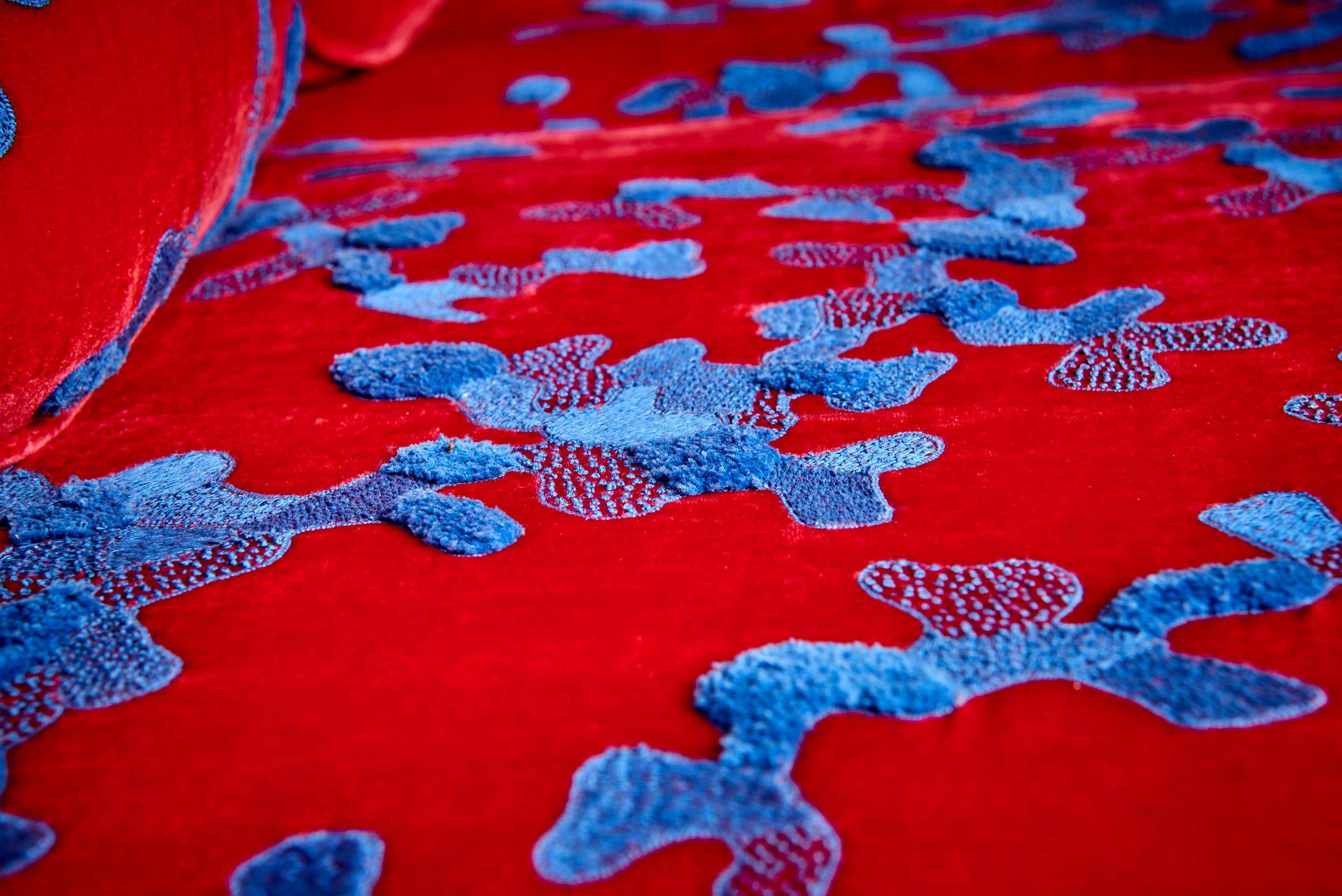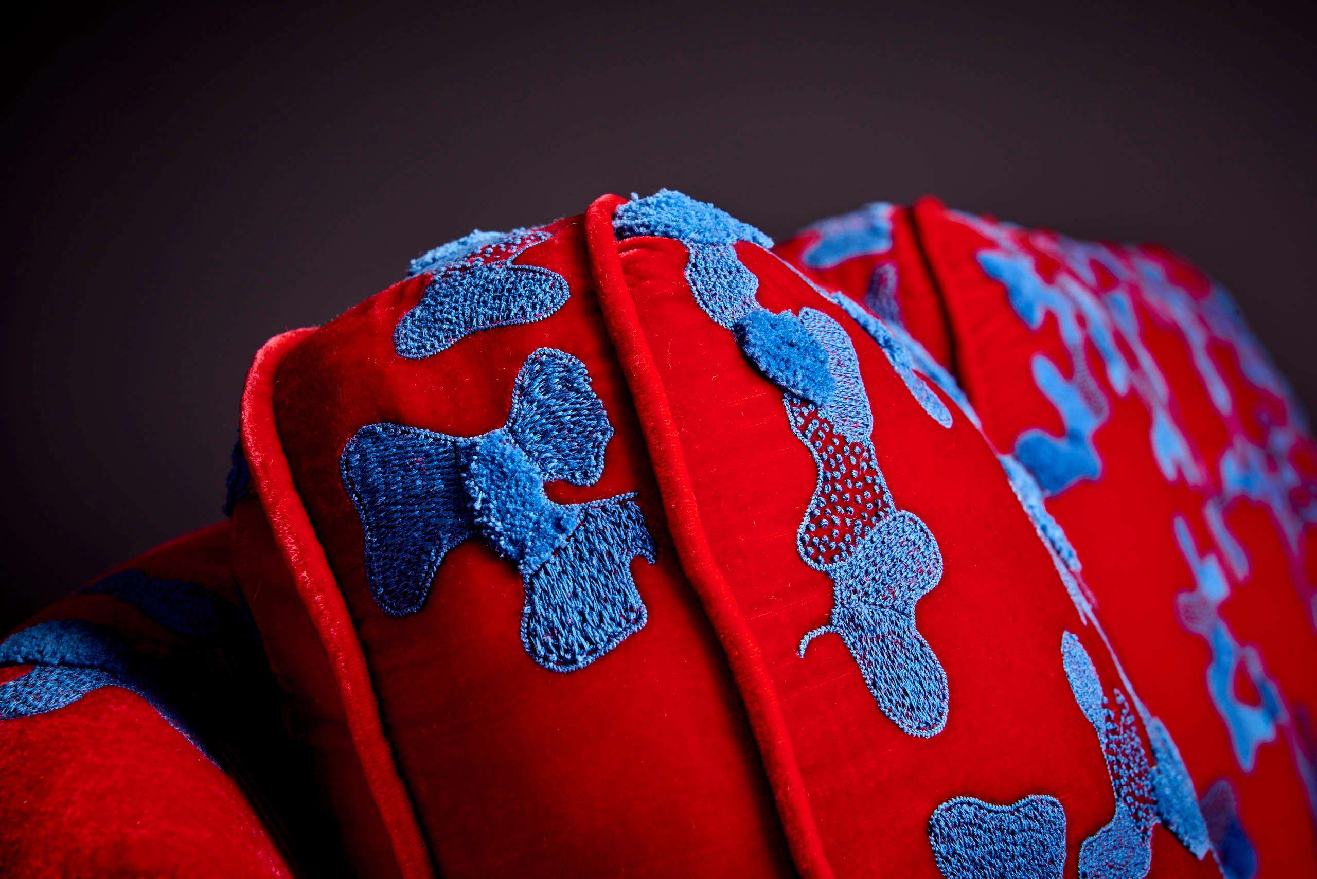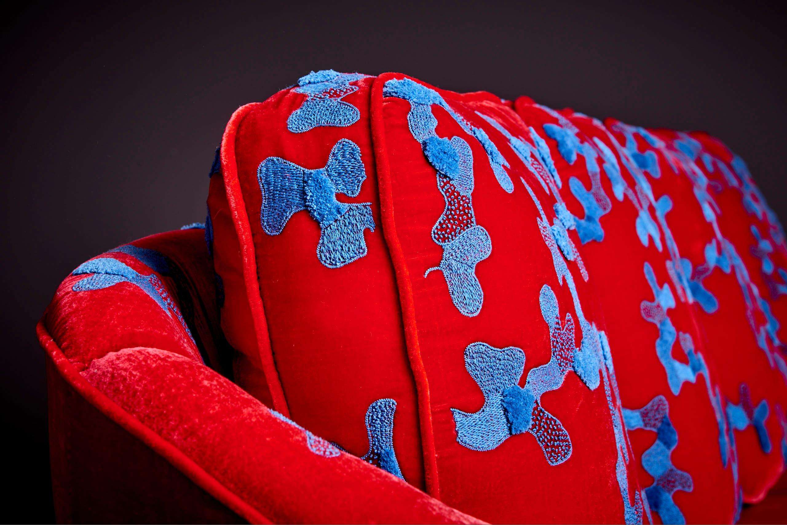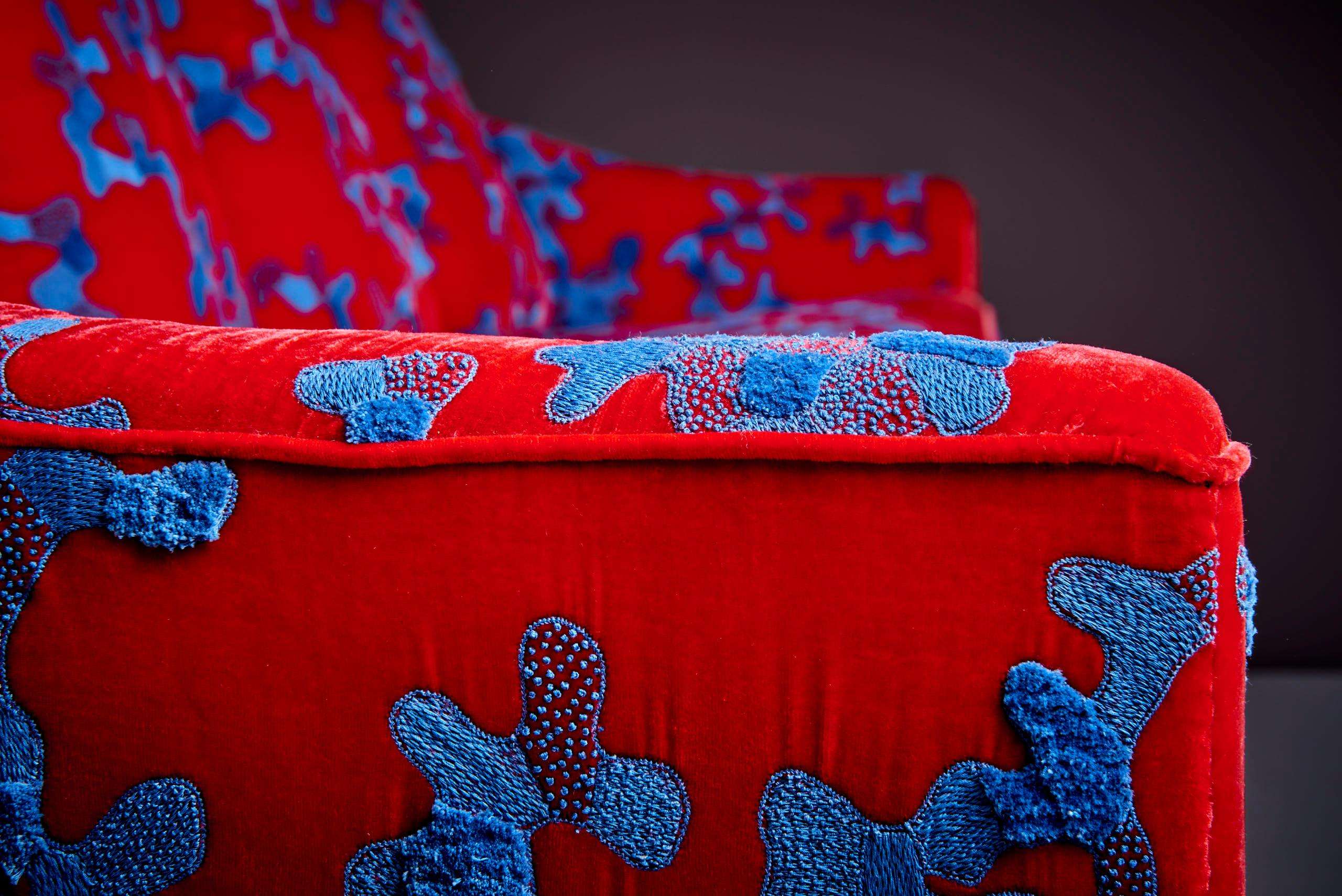 The Red and Blue Harvey Probber Sofa, a vintage piece from the 1960s, measures 215 cm wide, 80 cm deep, and 70 cm high with a seat height of 44 cm. This eye-catching sofa features a deep red silk velvet base fabric, adorned with sky blue cotton thread hand-embroidered by master artisans in India, creating a stunning color contrast that highlights its mid-century modern design.