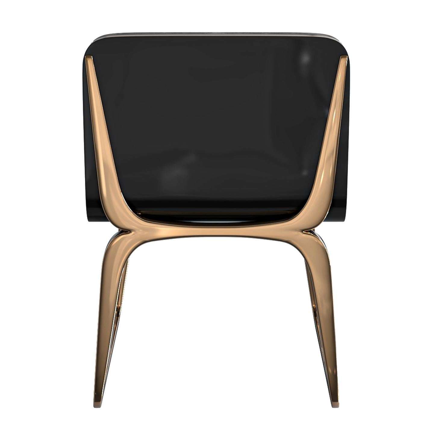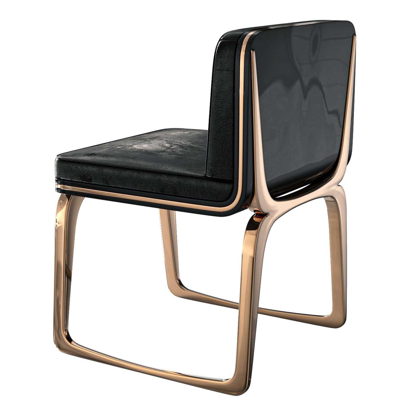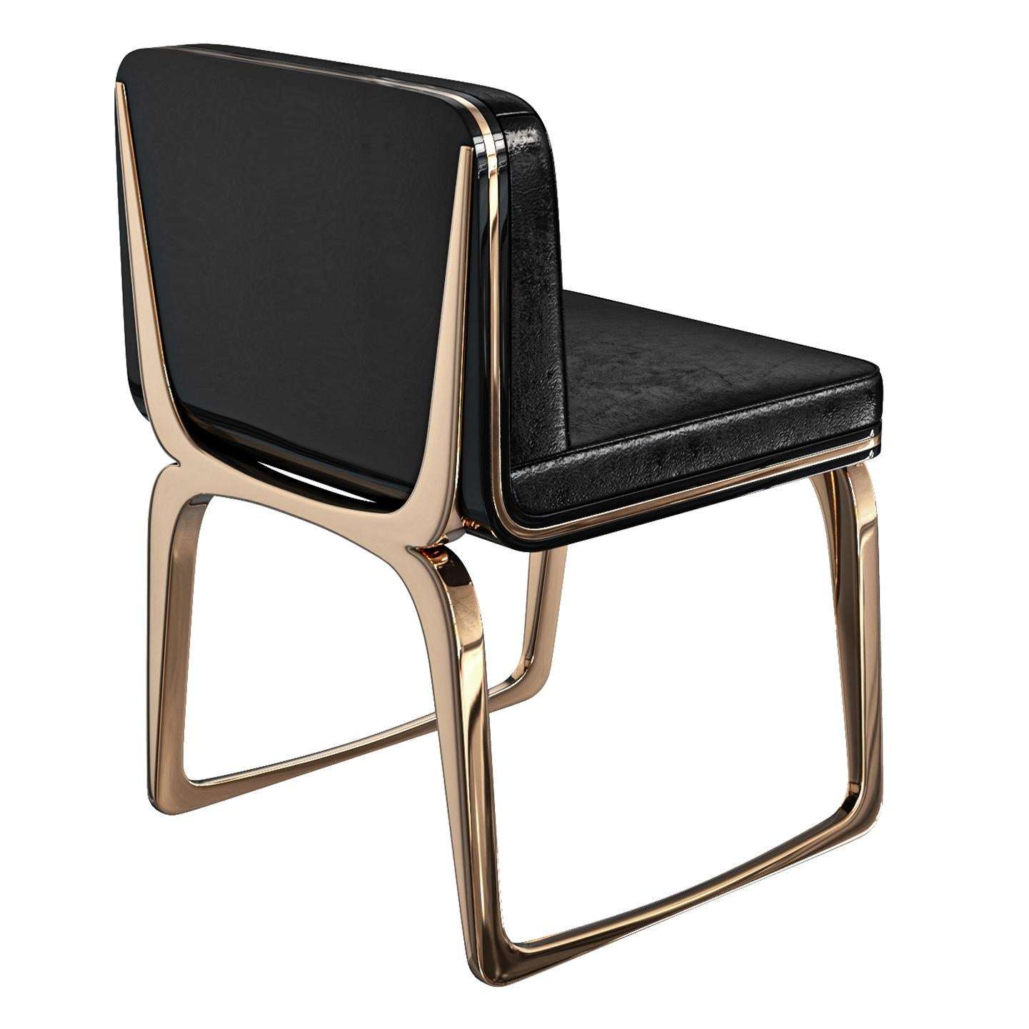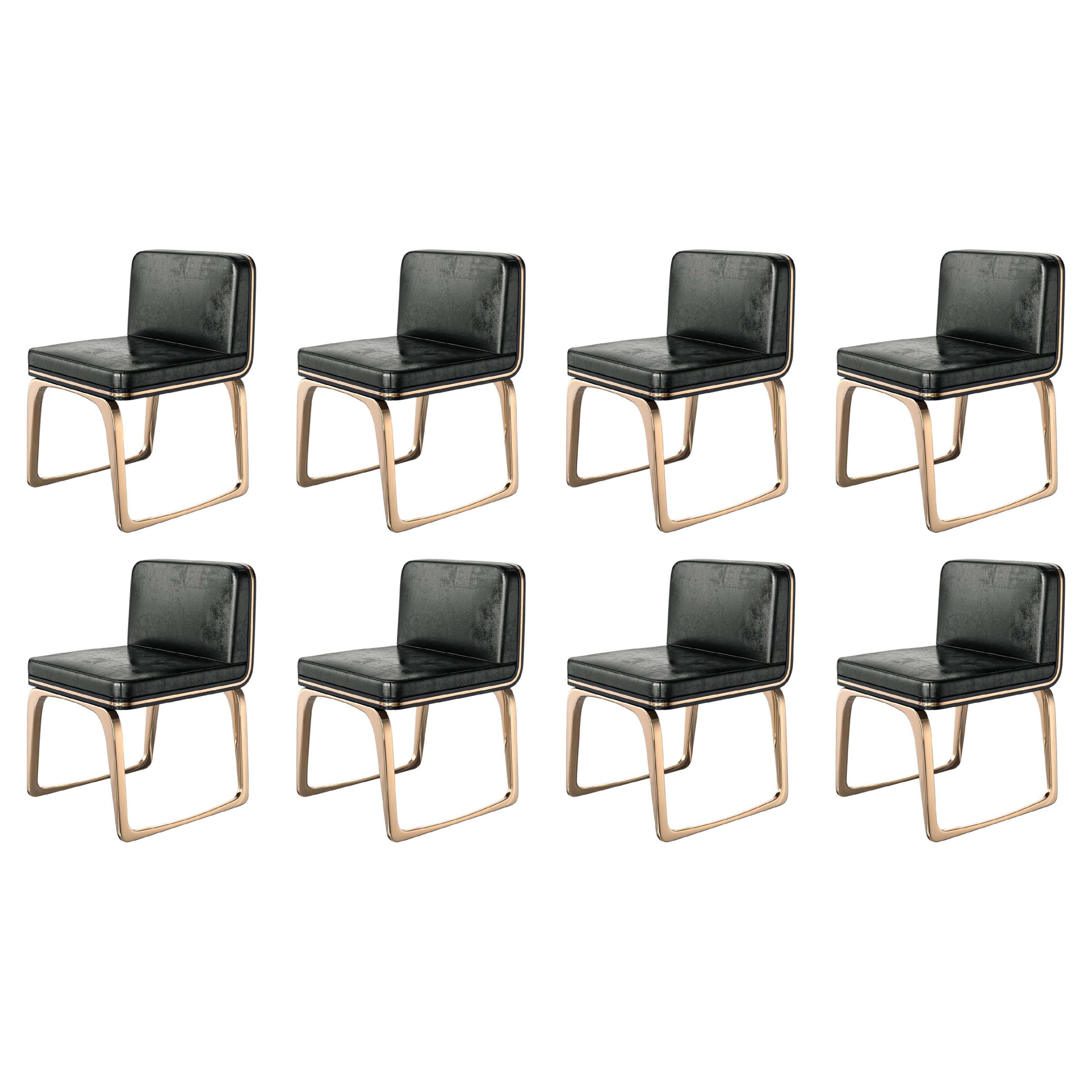The set of eight “Safari XLIX” Chairs by Bizimyer Furniture, designed by Hasan Samet Bizimyer, measures 48.77 cm wide, 51.31 cm deep, and 73.66 cm high with a seat height of 45.72 cm each. Crafted in Istanbul, Turkey, in 2024, these contemporary pieces feature a polished bronze and stainless steel frame, paired with tailor-made A-grade leather upholstery, showcasing unparalleled elegance and presence. The hand-crafted wood veneers and impeccable workmanship reflect the finest materials, creating a luxurious retreat for distinguished individuals seeking exceptional design.