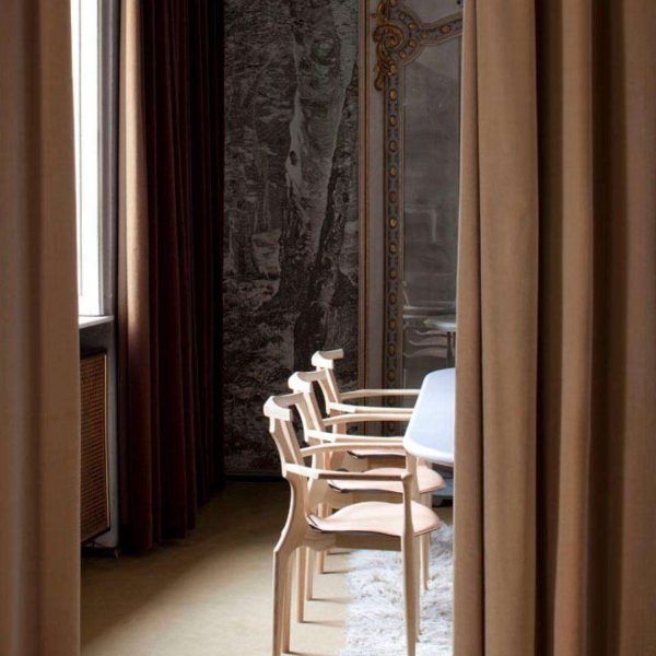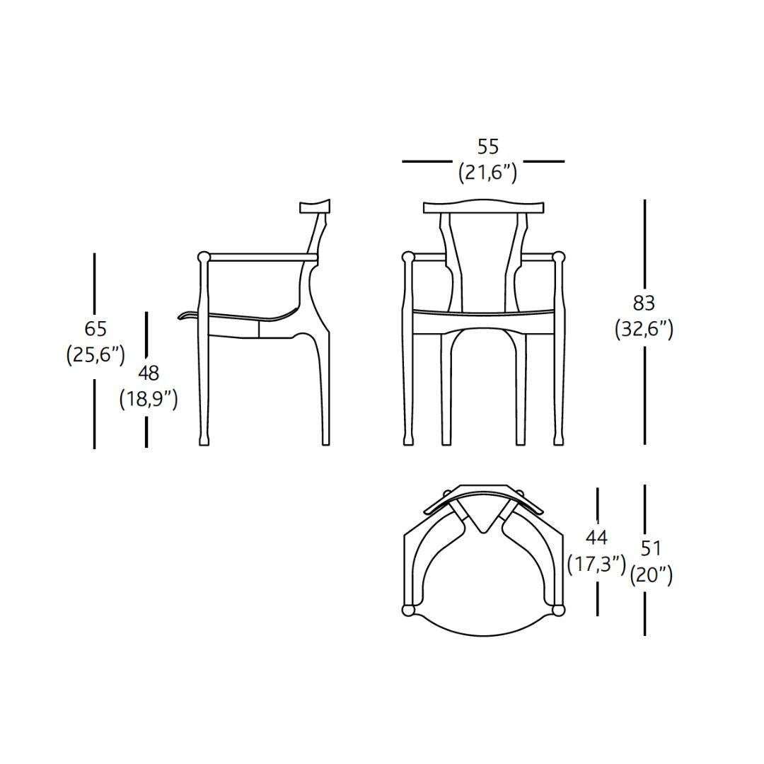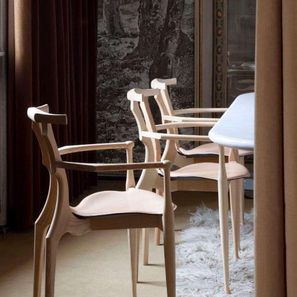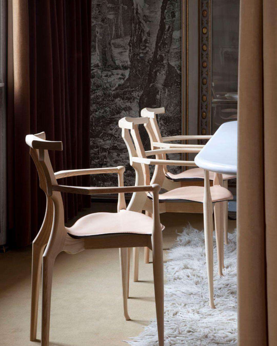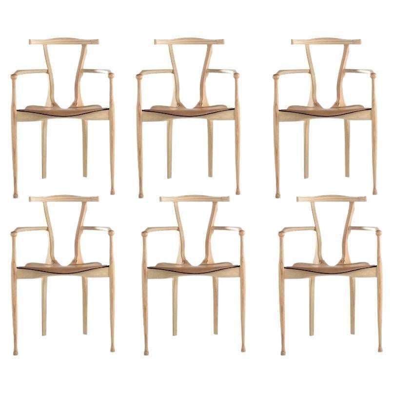 The set of six Gaulino Dining Chairs by Oscar Tusquets, a re-edition of the iconic 1987 design, measures 55 cm wide, 45 cm deep, and 84 cm high each. Crafted in Spain in 2023, these modern pieces feature a frame of natural varnished solid ash wood (RAL 3016) with seats upholstered in natural hide leather, reflecting a timeless blend of functionality and elegance. Named after influences from Antoni Gaudí and Carlo Mollino, the Gaulino Chair has become a hallmark of 20th-century Spanish design, earning accolades such as the 1989 Adi-Fad Industrial Design Prize and the 1990 Iberdiseño award, and is featured in retrospective exhibitions and publications worldwide.
