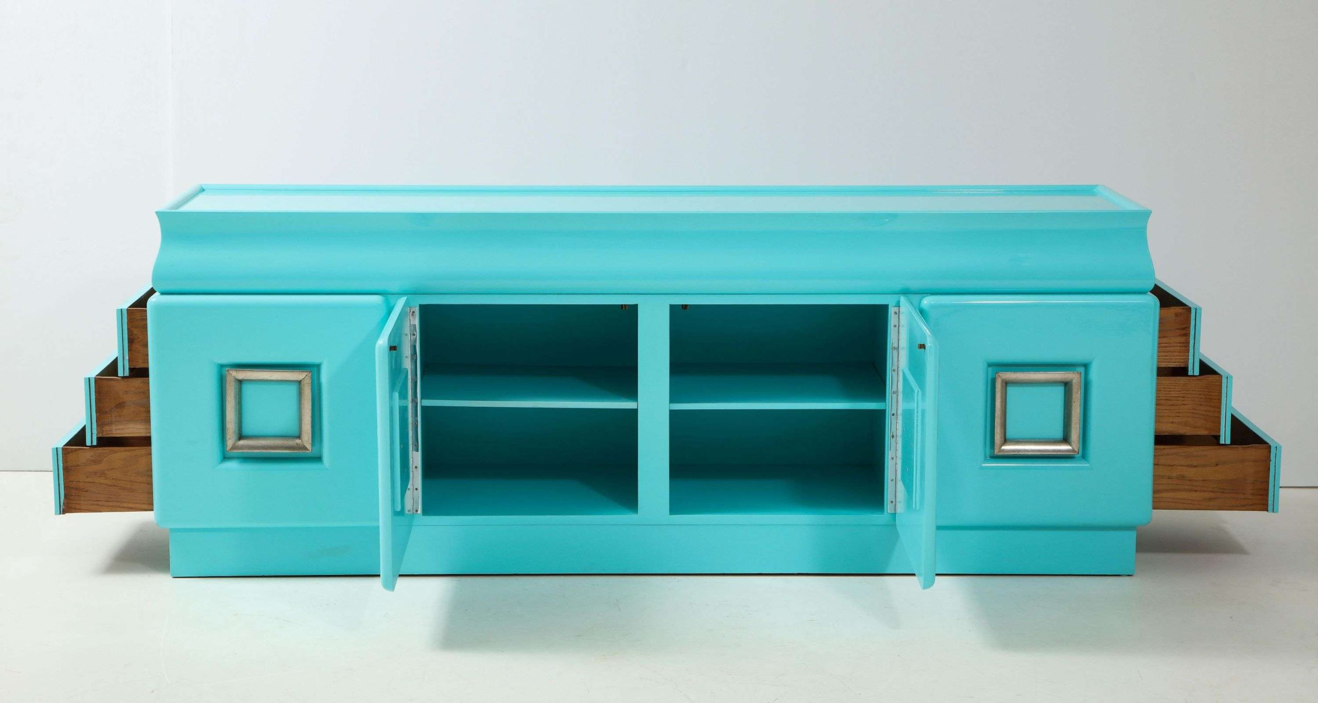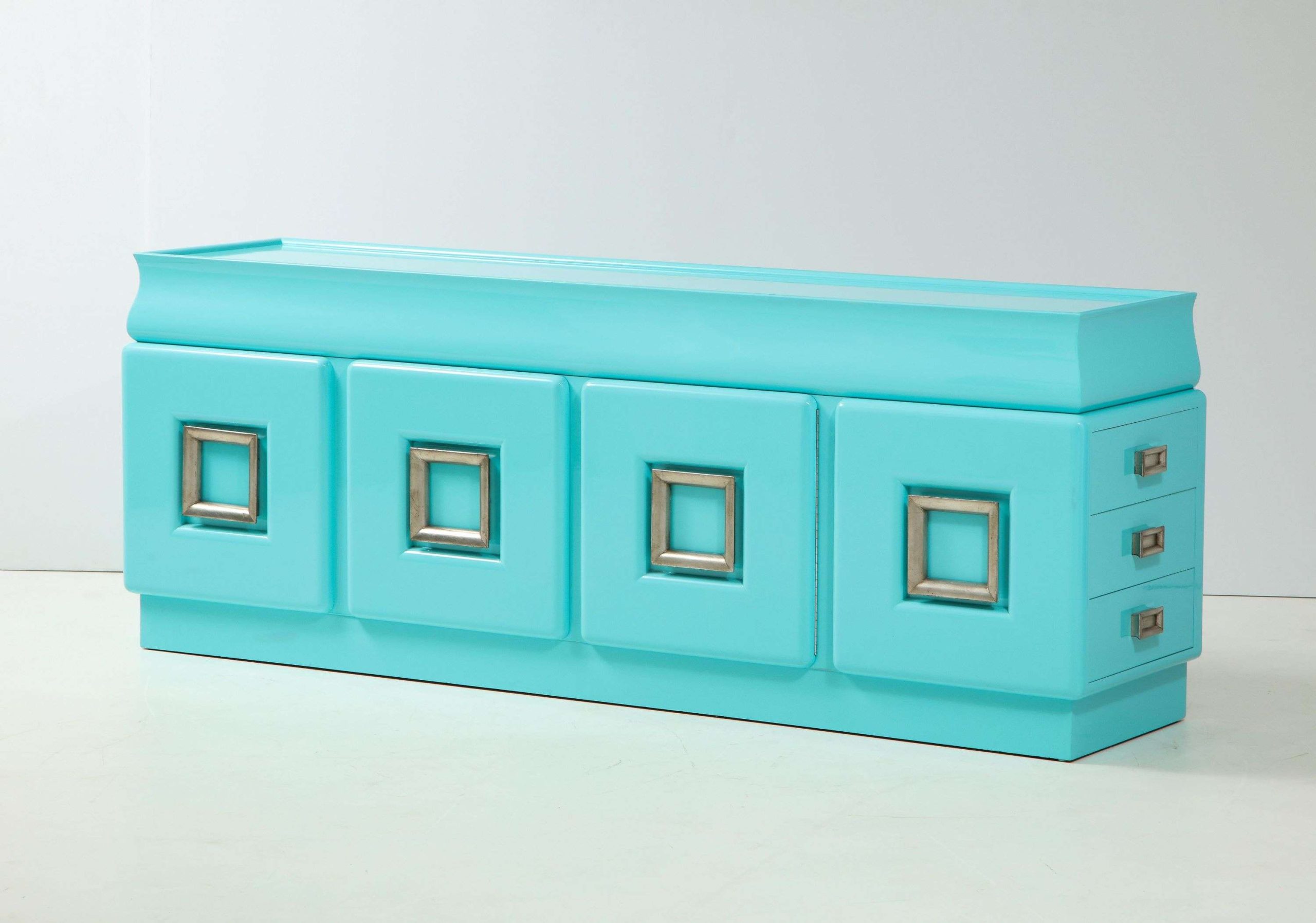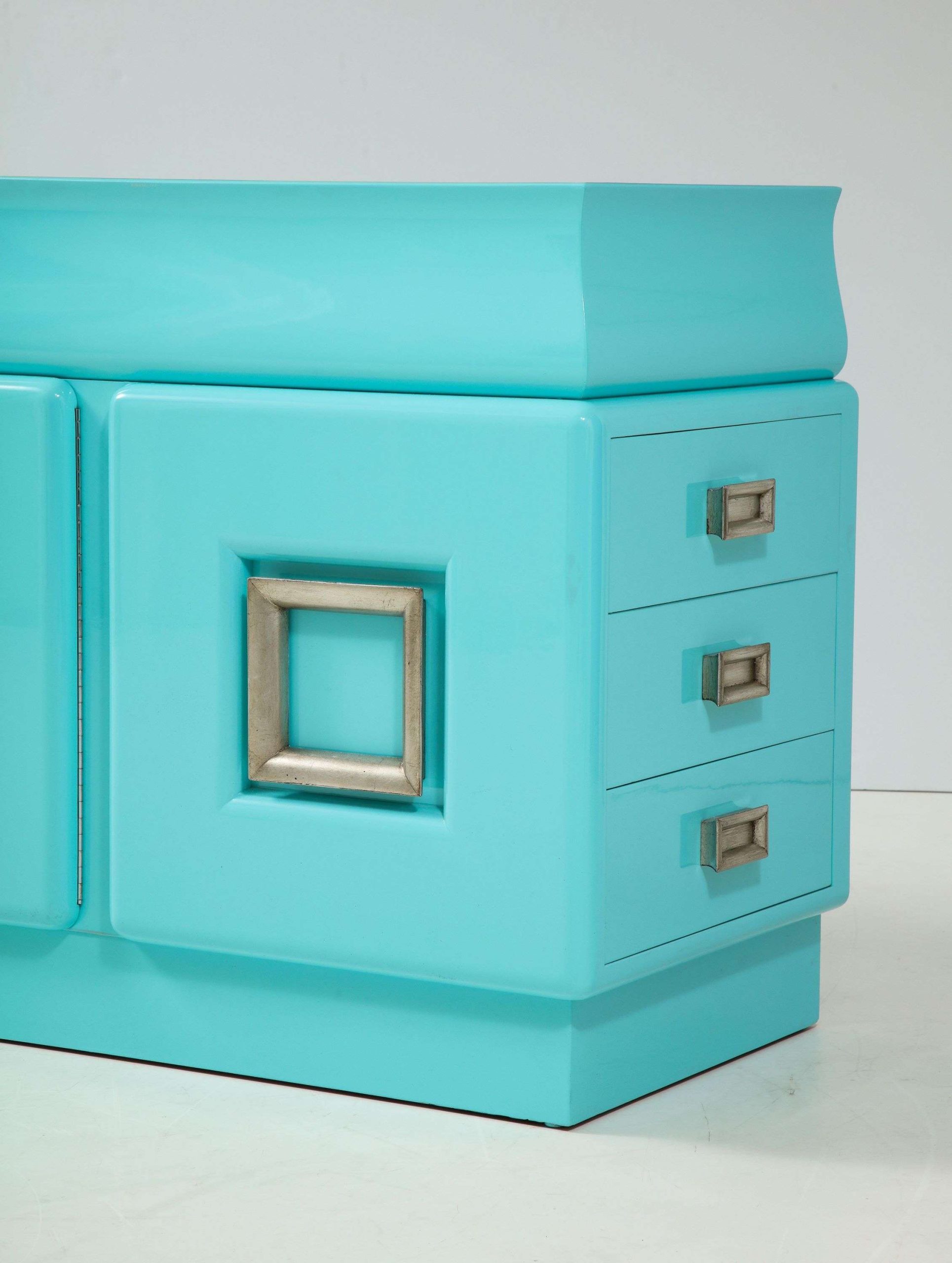 The Spectacular James Mont Cabinet, crafted in the United States during the 1950s, measures 223.52 cm wide, 53.34 cm deep, and 83.82 cm high, exemplifying mid-century modern design. This signed piece, newly restored with a stunning high-gloss lacquered finish, features two center doors with adjustable interior shelves and six side drawers, offering ample storage for a living room, dining area, or bedroom. The glazed silver-leafed pulls provide a striking contrast to the glossy softwood finish, enhancing its elegant aesthetic and making it a versatile addition to various interior styles.